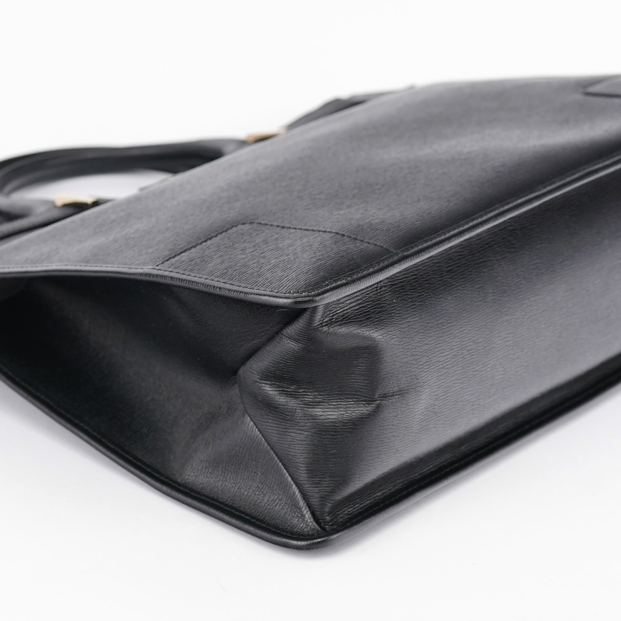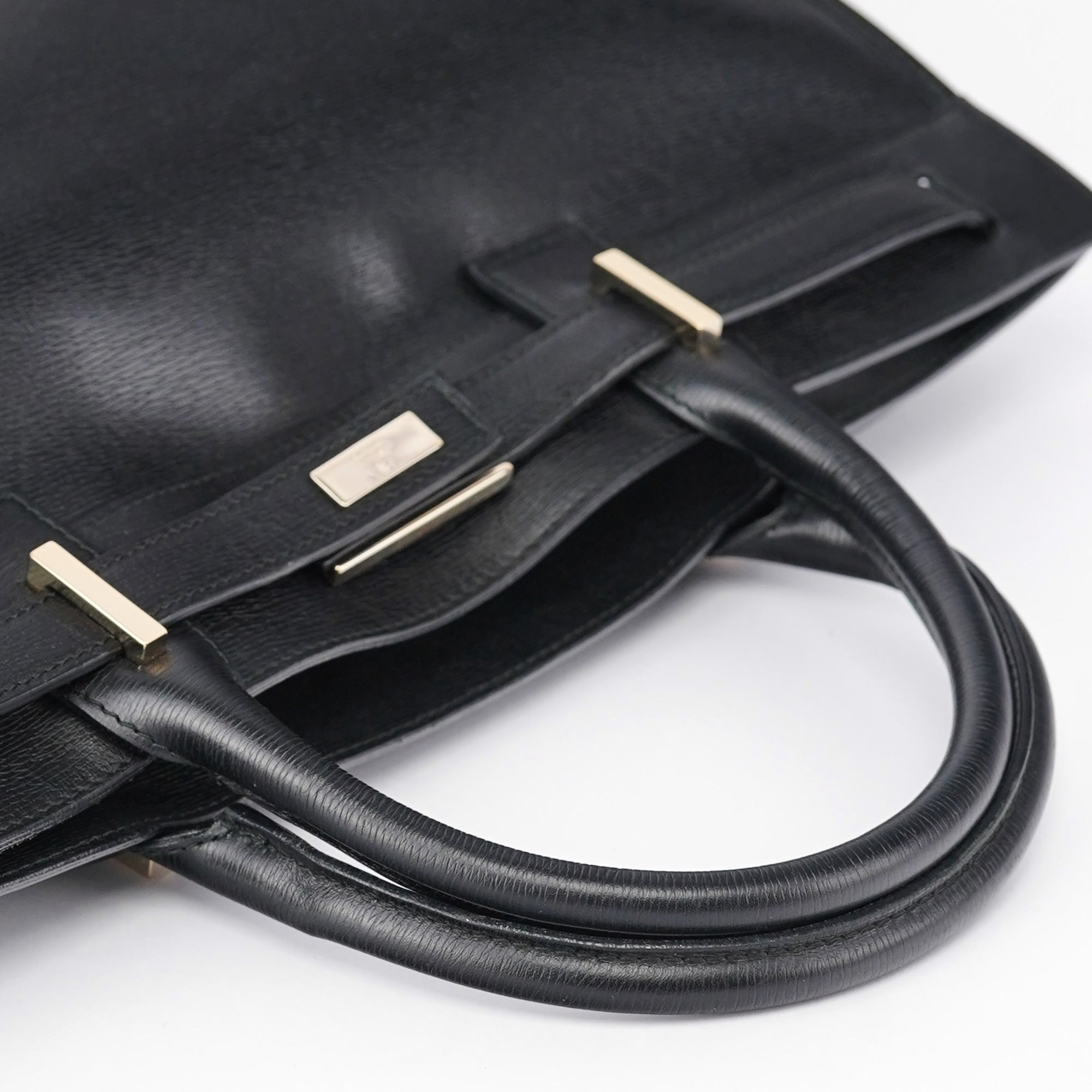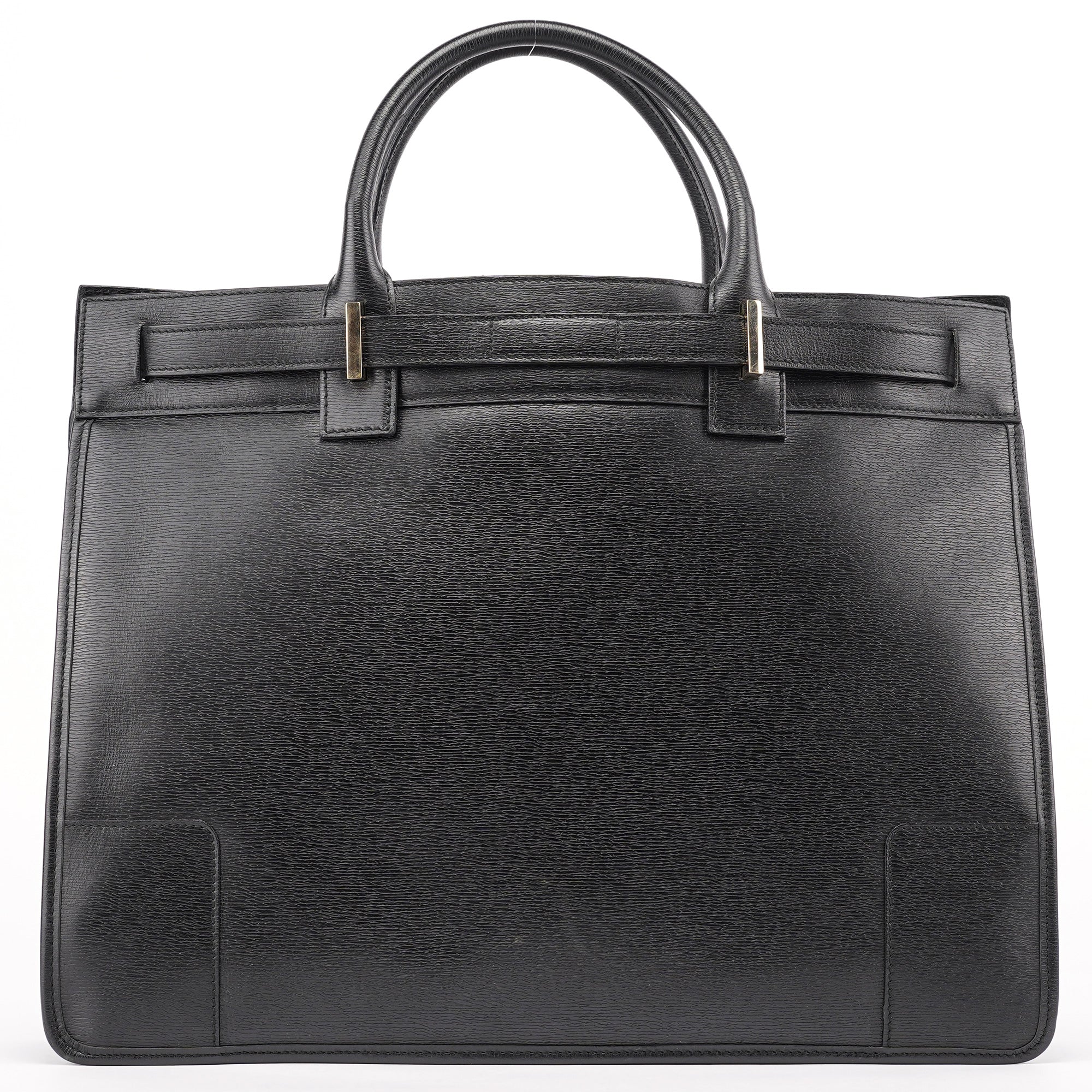 Designed in the late 1990s by Tom Ford, this structured Gucci tote is crafted in sleek black leather with a firm silhouette and gold-tone hardware detailing the front buckle tab. The top handles are gently rounded for hand or elbow carry, and the spacious interior is lined in leather with slip and zip compartments for everyday essentials.