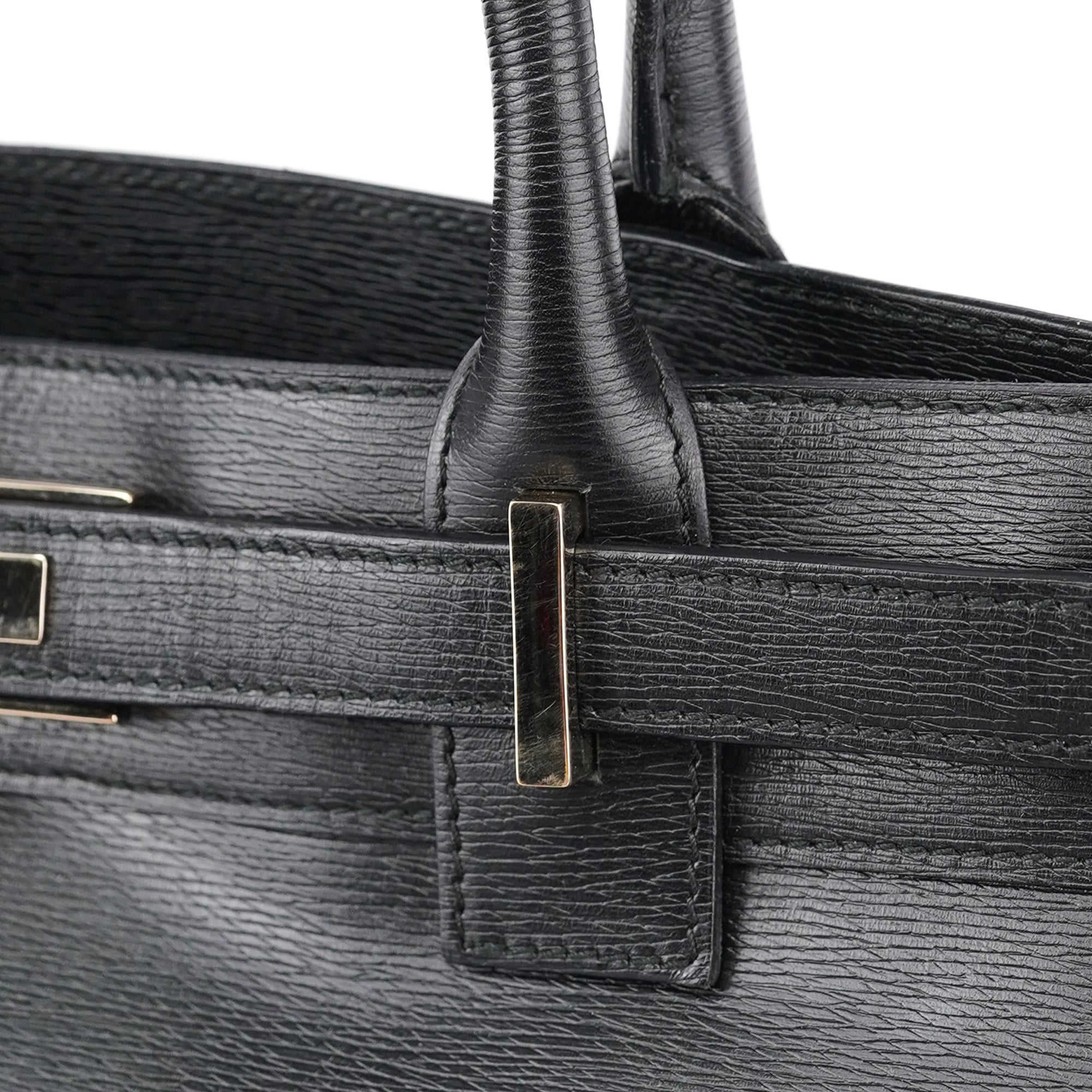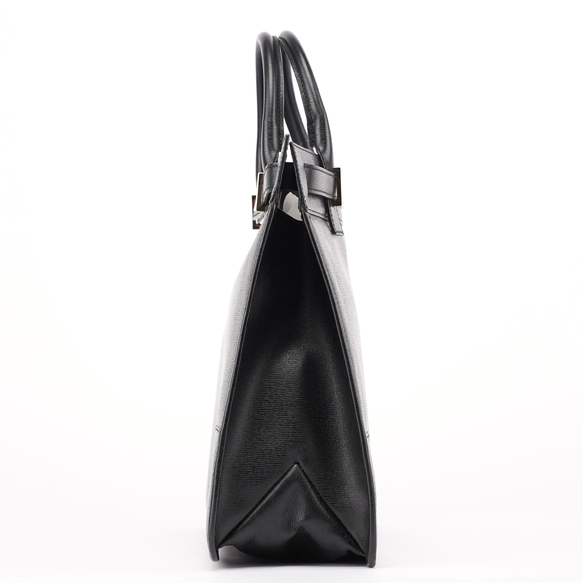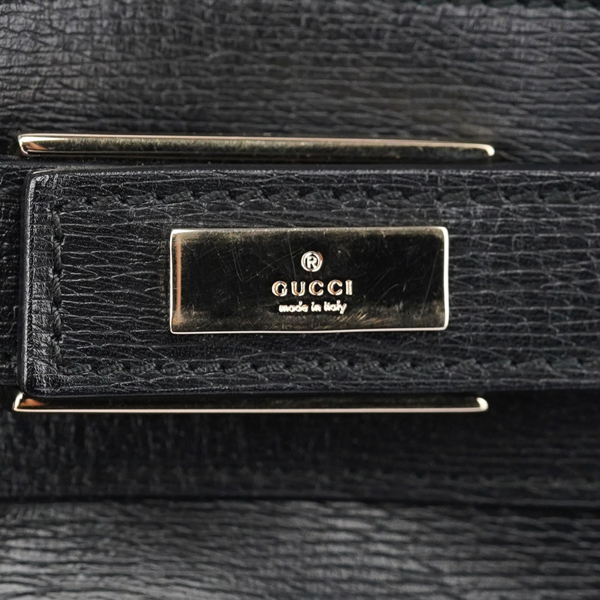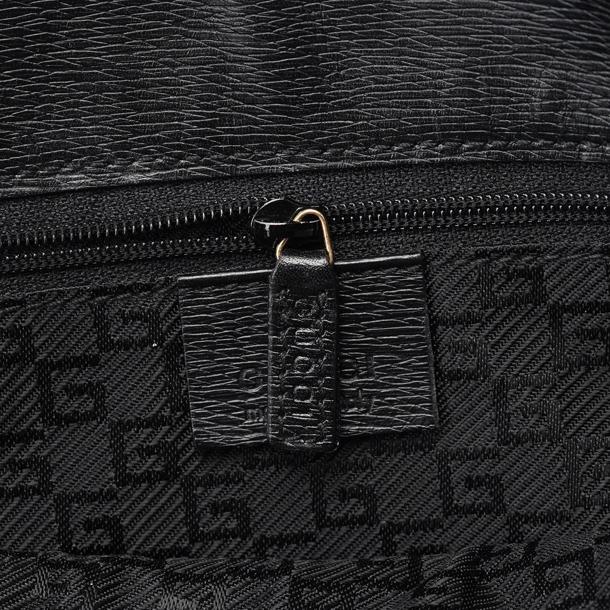 Designed in the late 1990s by Tom Ford, this structured Gucci tote is crafted in sleek black leather with a firm silhouette and gold-tone hardware detailing the front buckle tab. The top handles are gently rounded for hand or elbow carry, and the spacious interior is lined in leather with slip and zip compartments for everyday essentials.