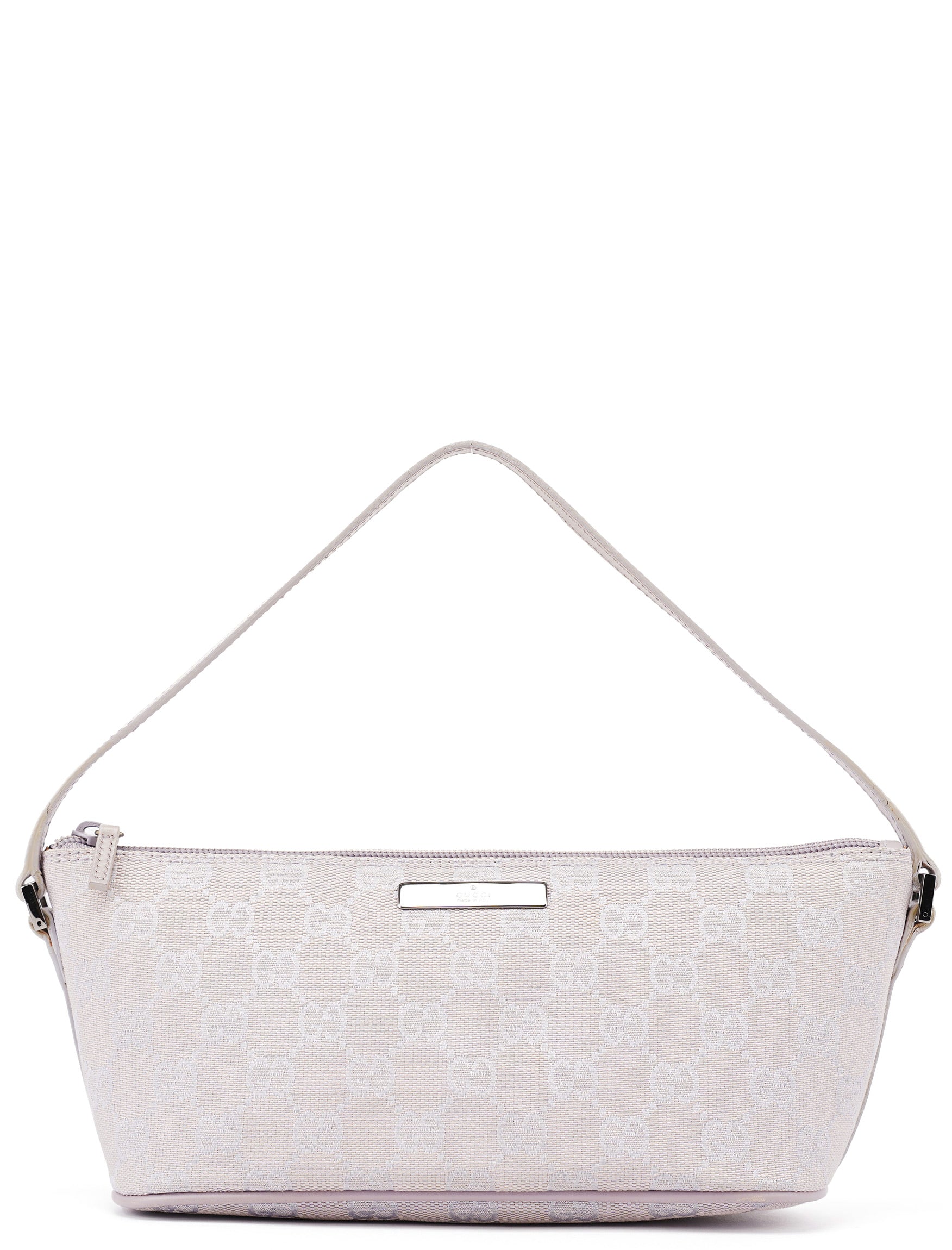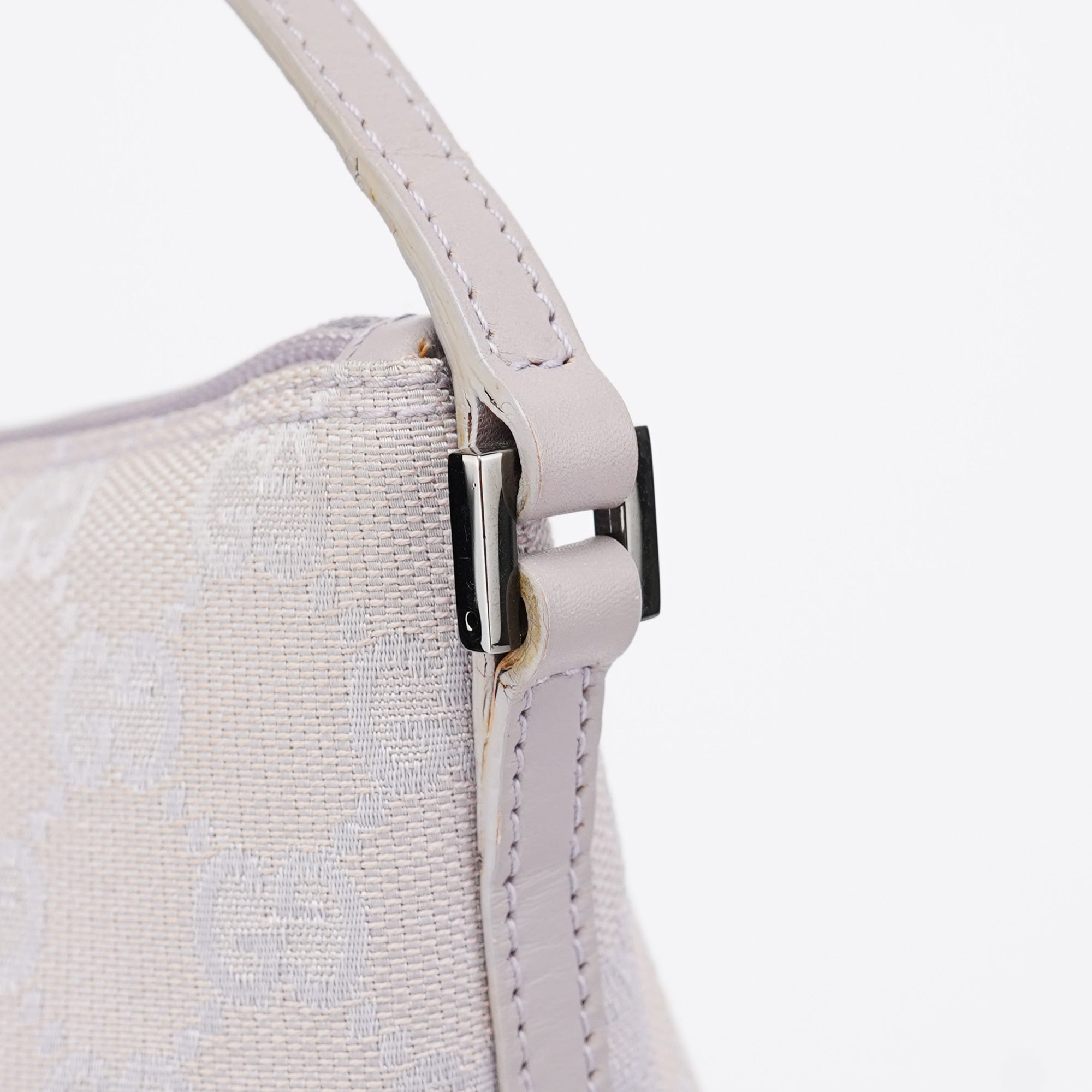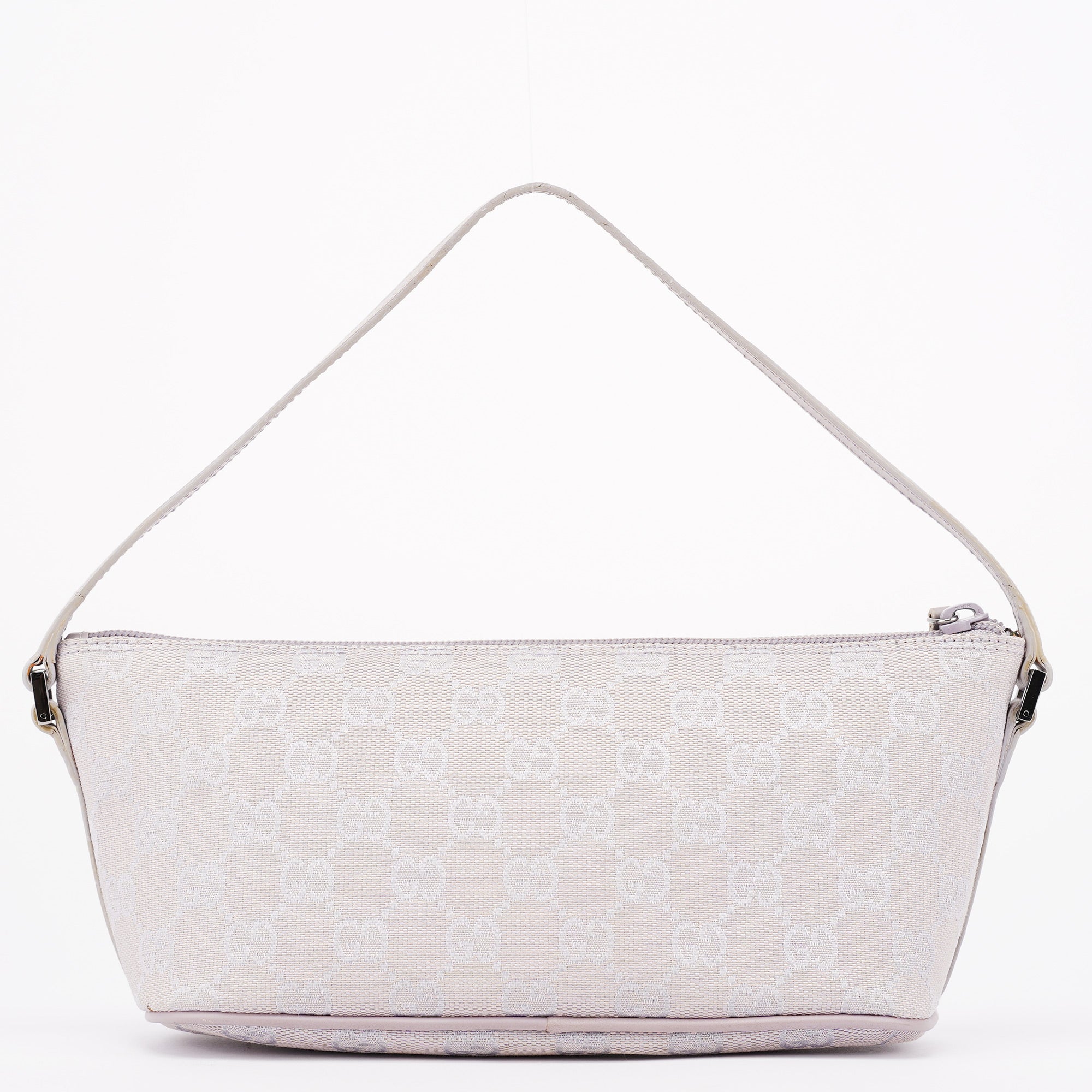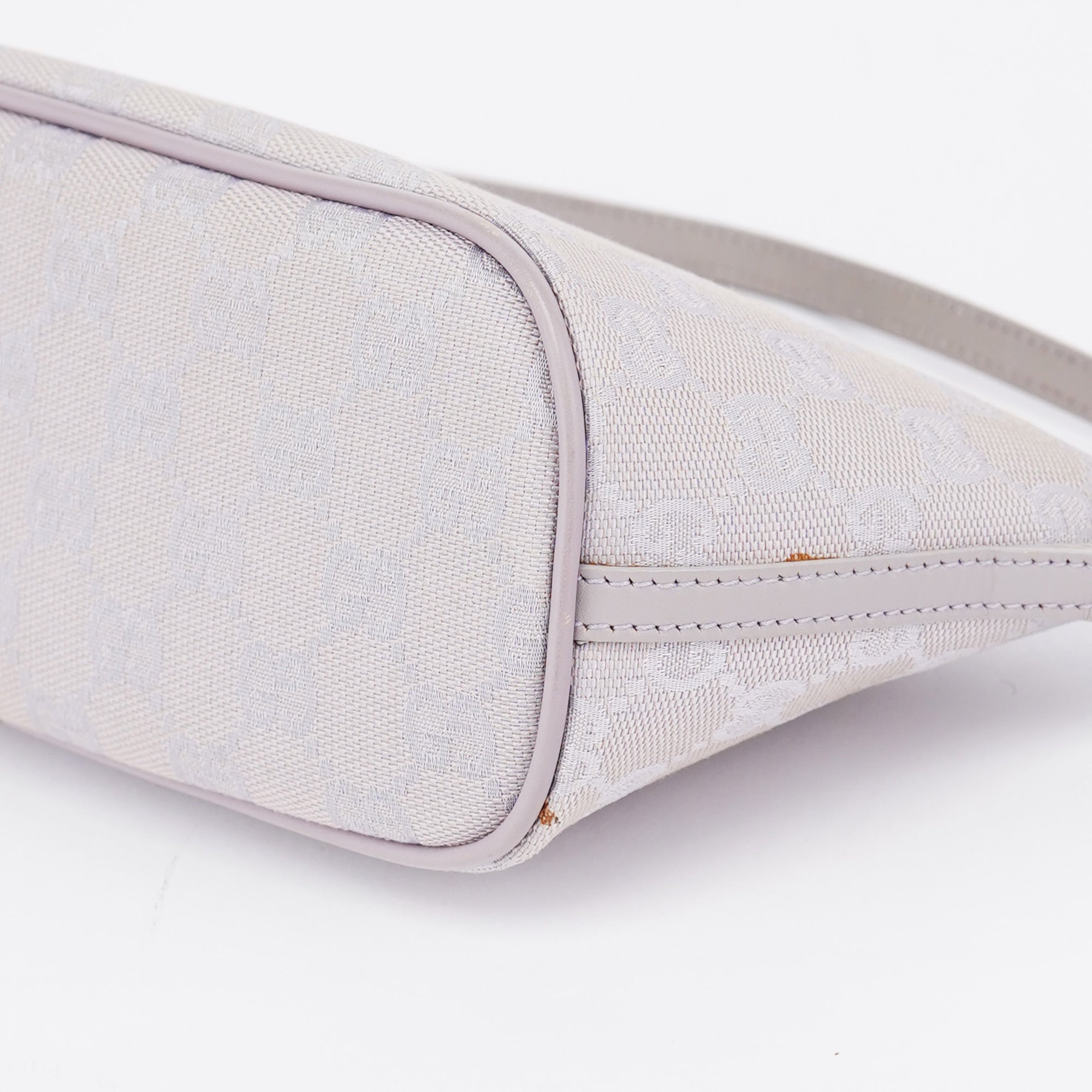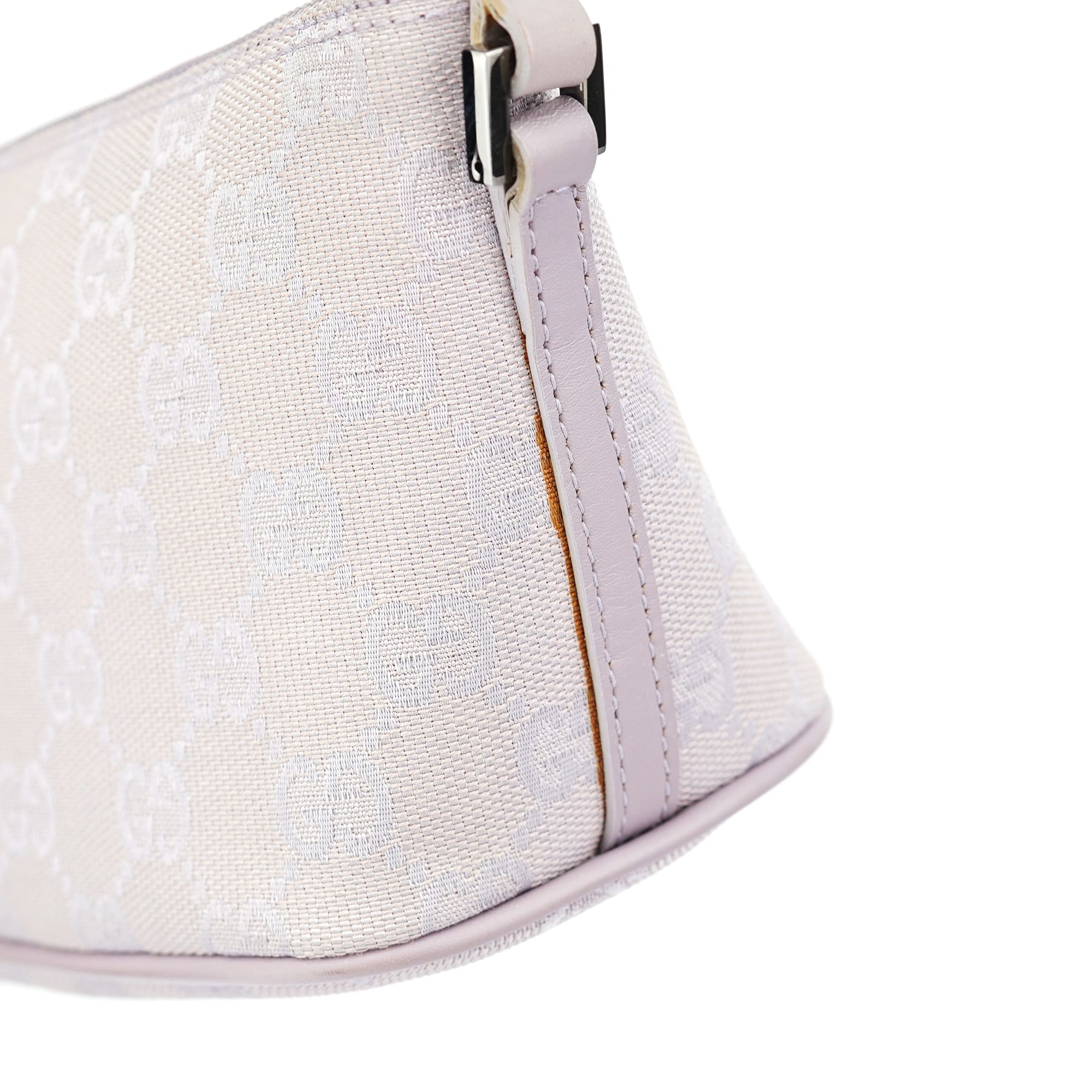Designed in the late 1990s by Tom Ford, this Gucci GG Boat Pochette is crafted in lavender monogram canvas with tonal leather trim and silver-tone hardware. The elongated silhouette features a curved base and a flat leather shoulder strap, accented by a metal logo plaque on the front. The top zip closure opens to a fabric-lined interior with a single slip pocket.
