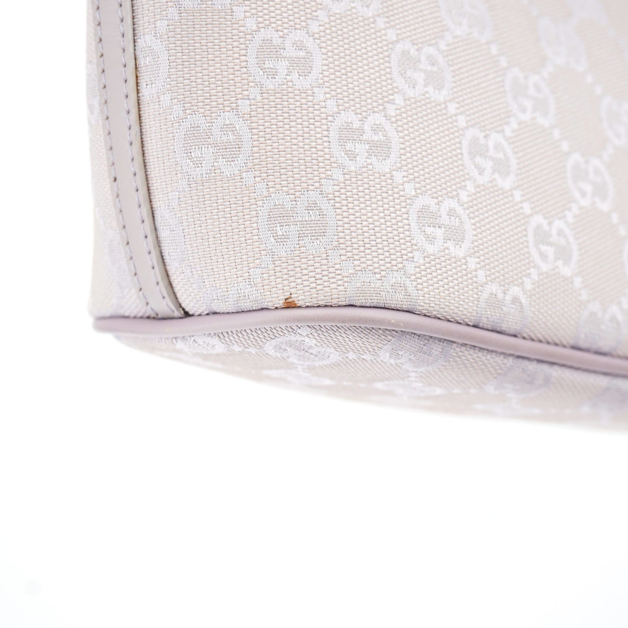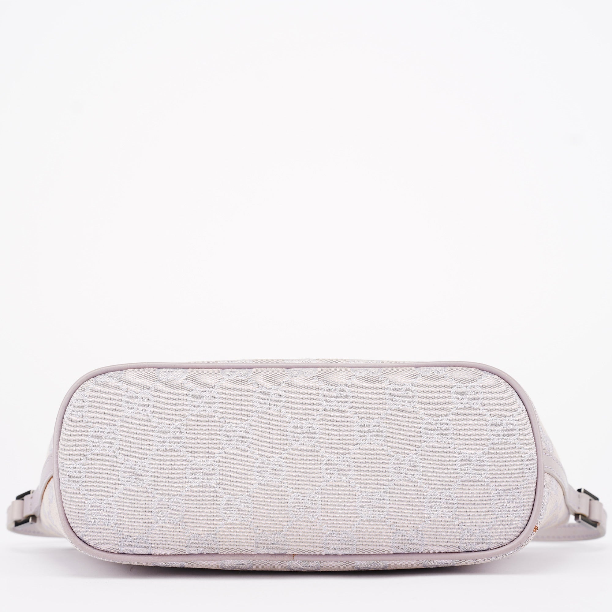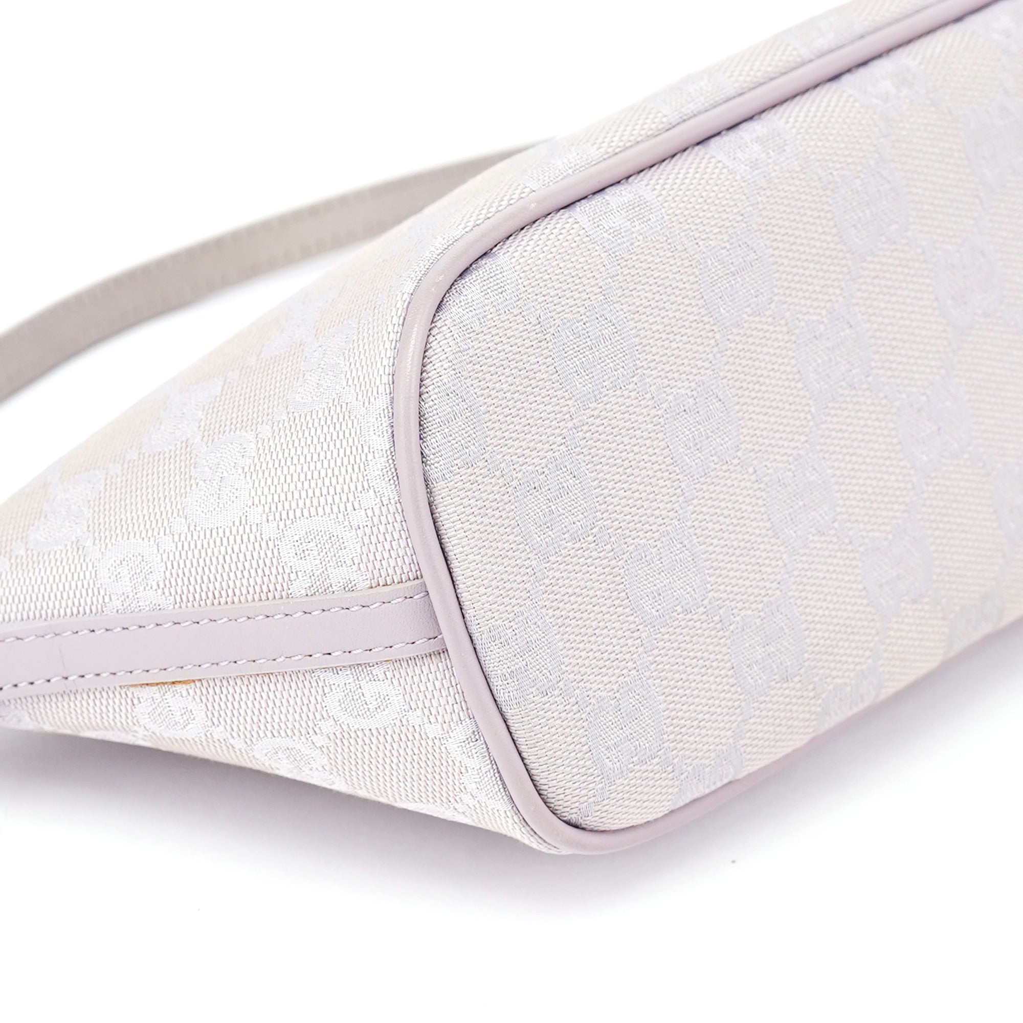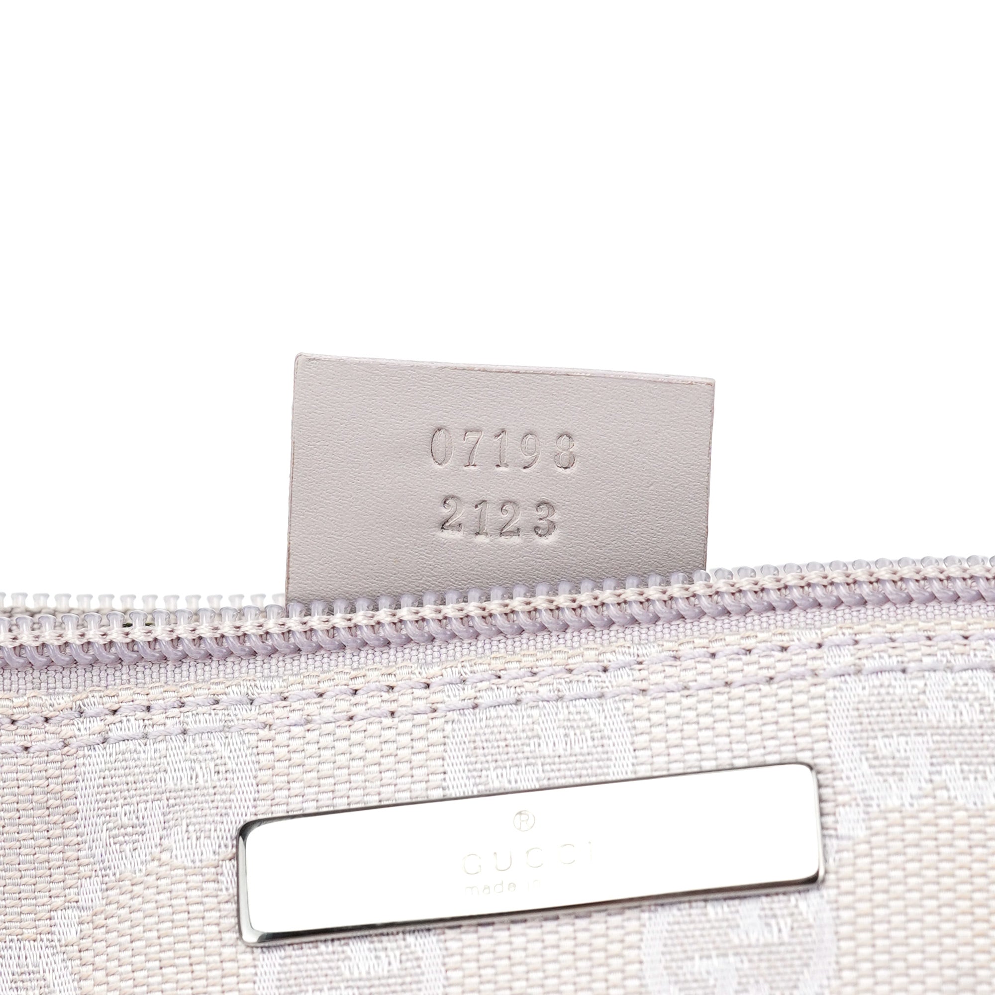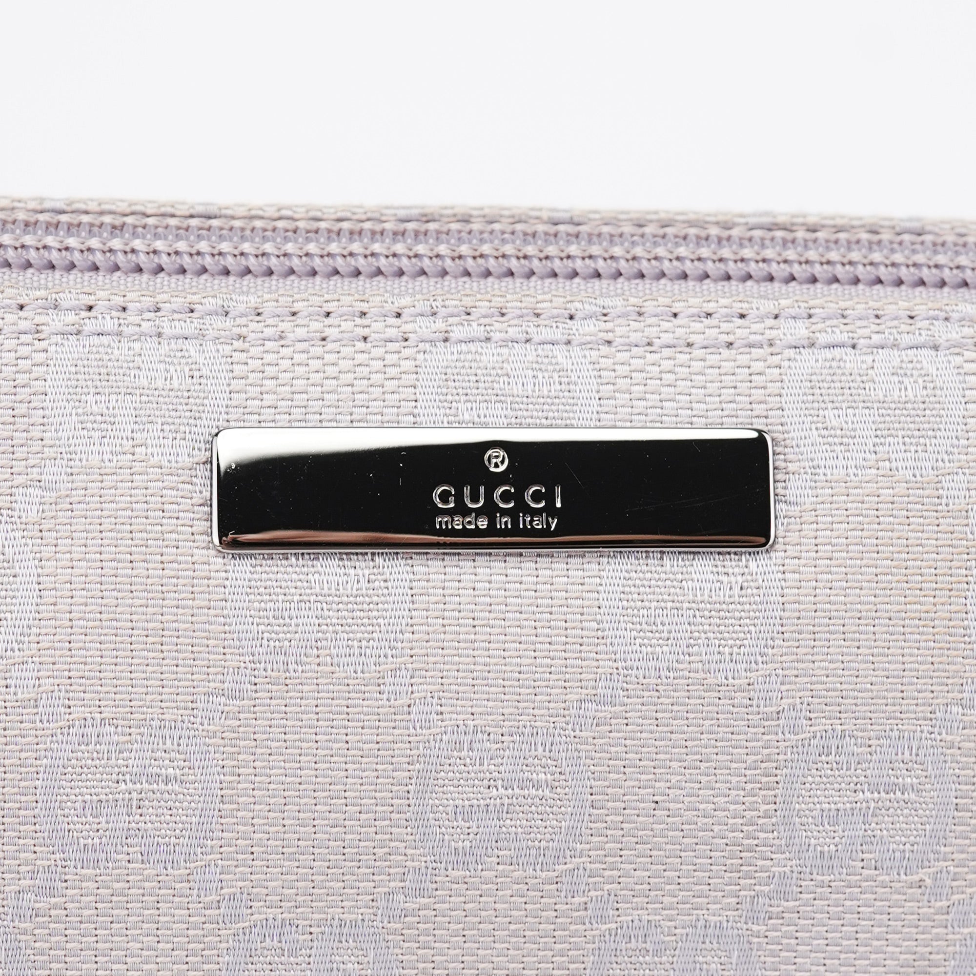 Designed in the late 1990s by Tom Ford, this Gucci GG Boat Pochette is crafted in lavender monogram canvas with tonal leather trim and silver-tone hardware. The elongated silhouette features a curved base and a flat leather shoulder strap, accented by a metal logo plaque on the front. The top zip closure opens to a fabric-lined interior with a single slip pocket.
