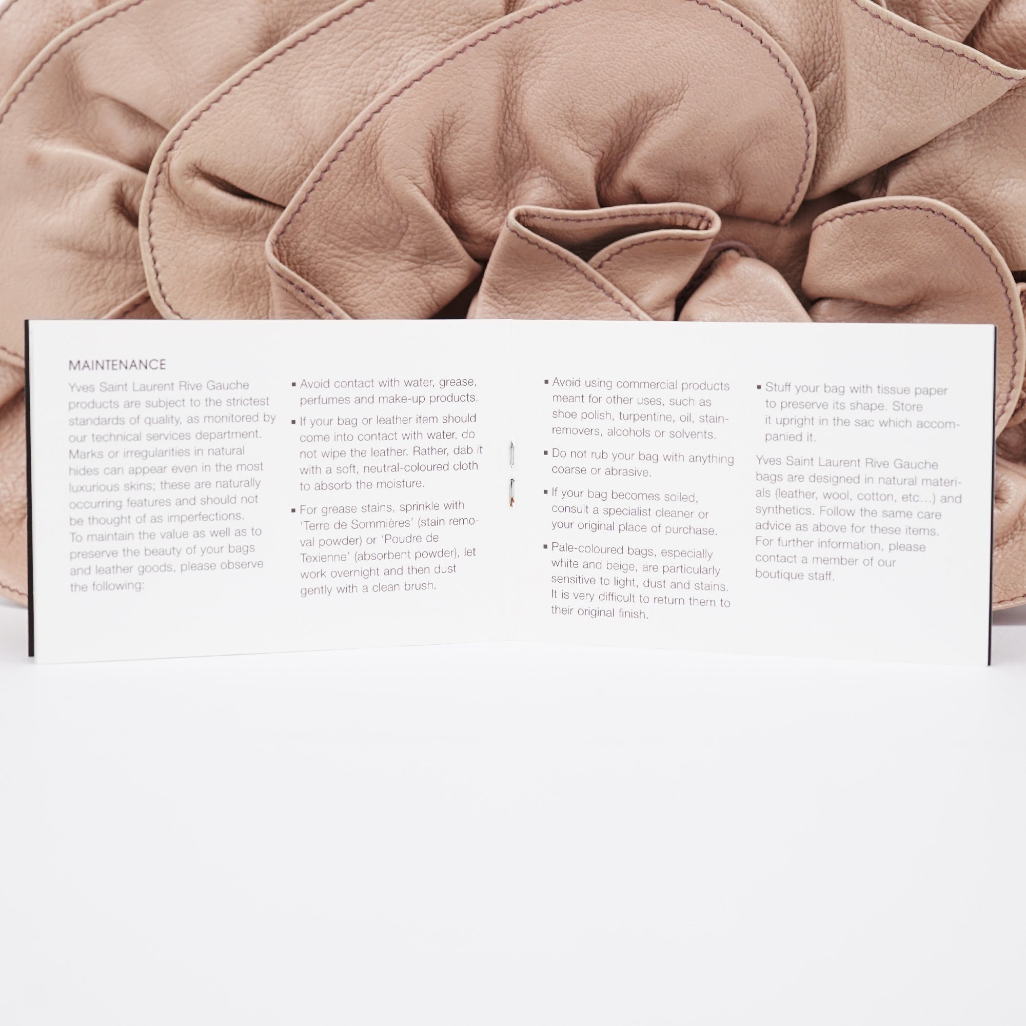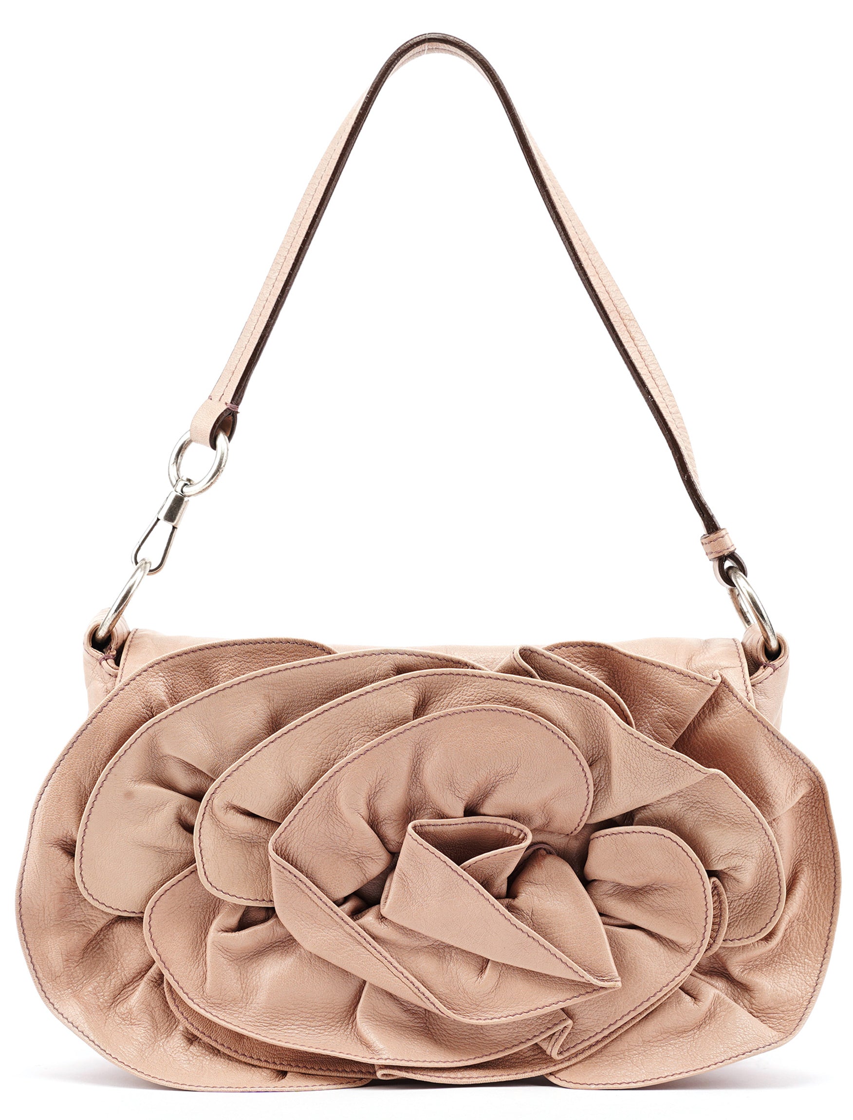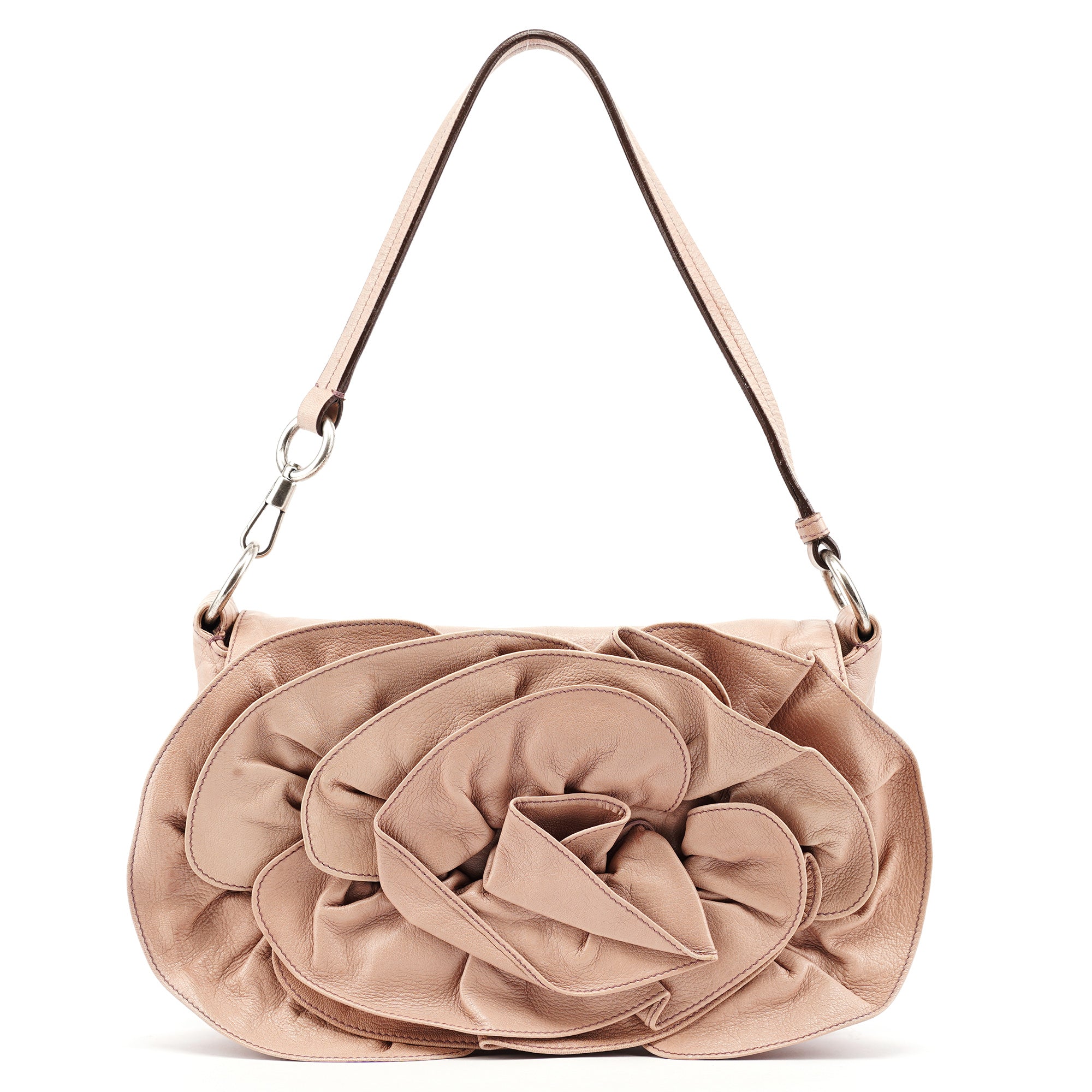 Designed in 2003 by Tom Ford during his tenure at Yves Saint Laurent, this Nadja shoulder bag is crafted in soft pink calfskin leather with tonal trim and silver-tone hardware. The sculptural silhouette features a statement camellia-shaped flap and sleek magnetic closure, and opens to a plush suede-lined interior with a zip pocket.