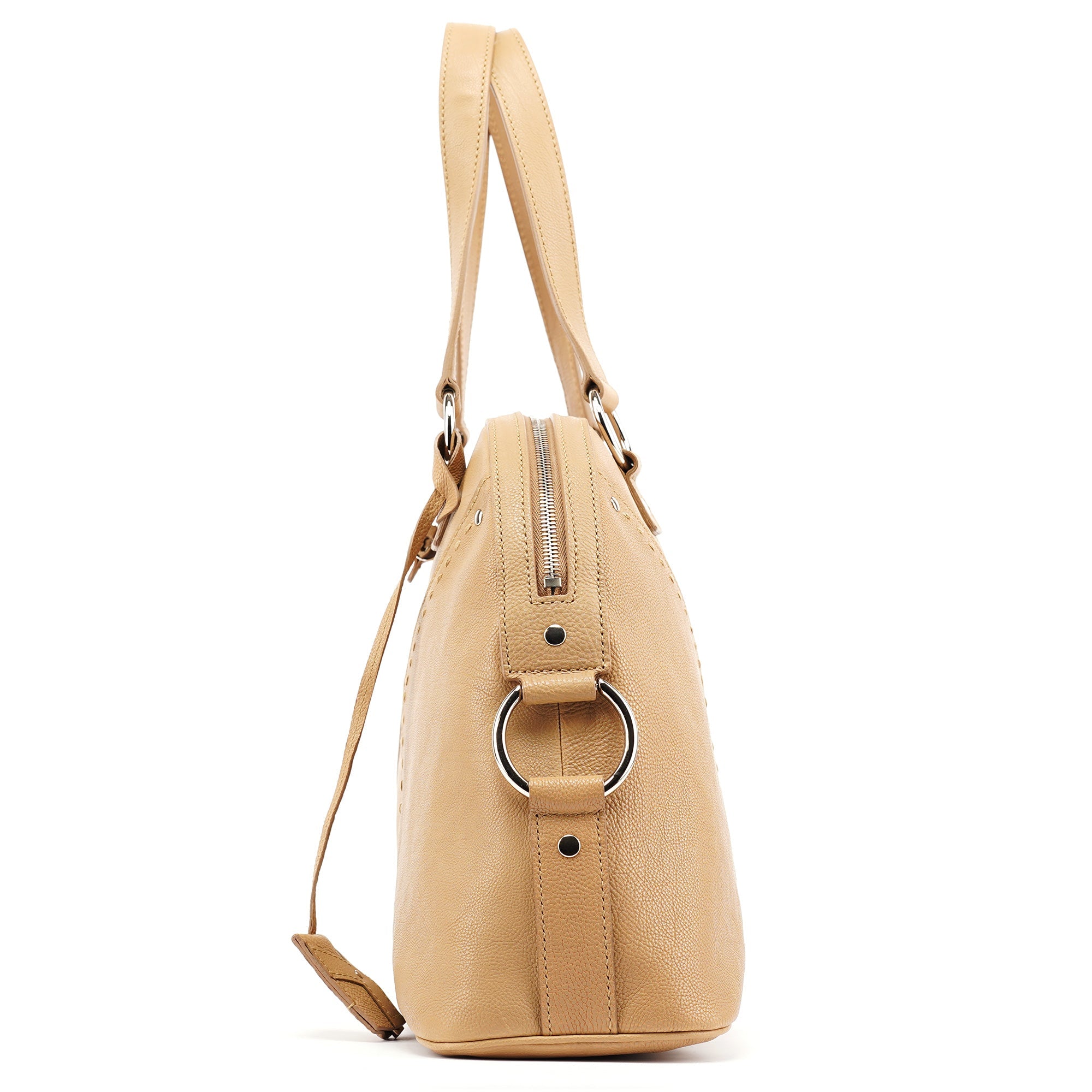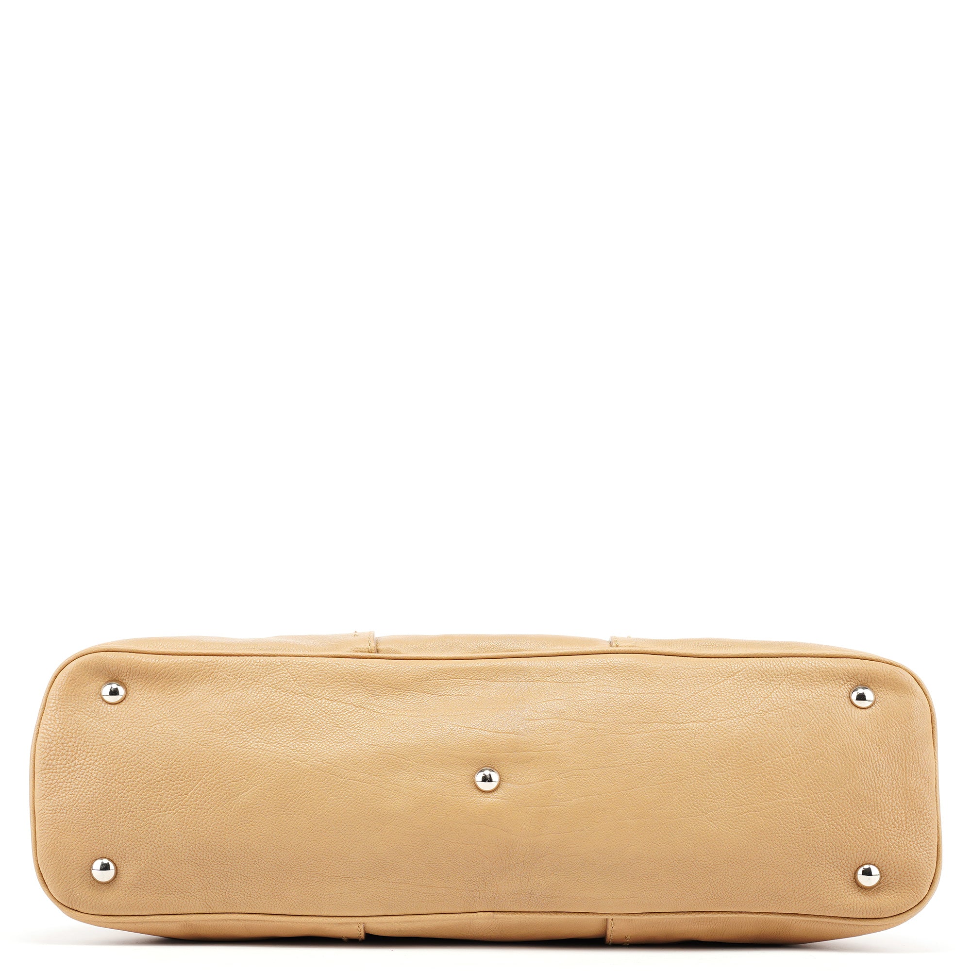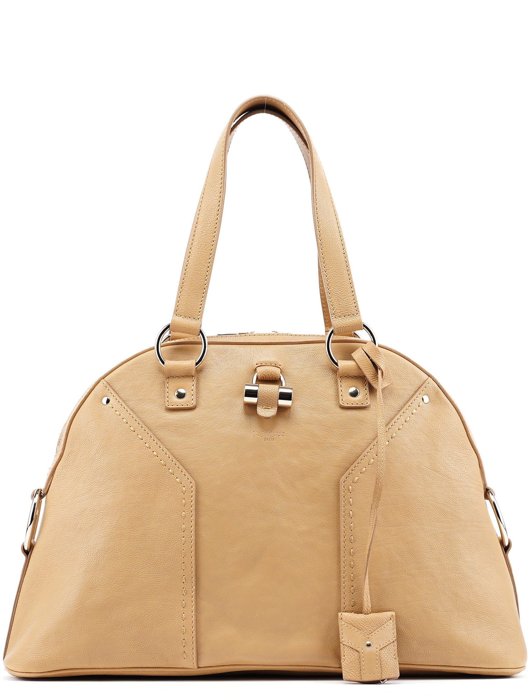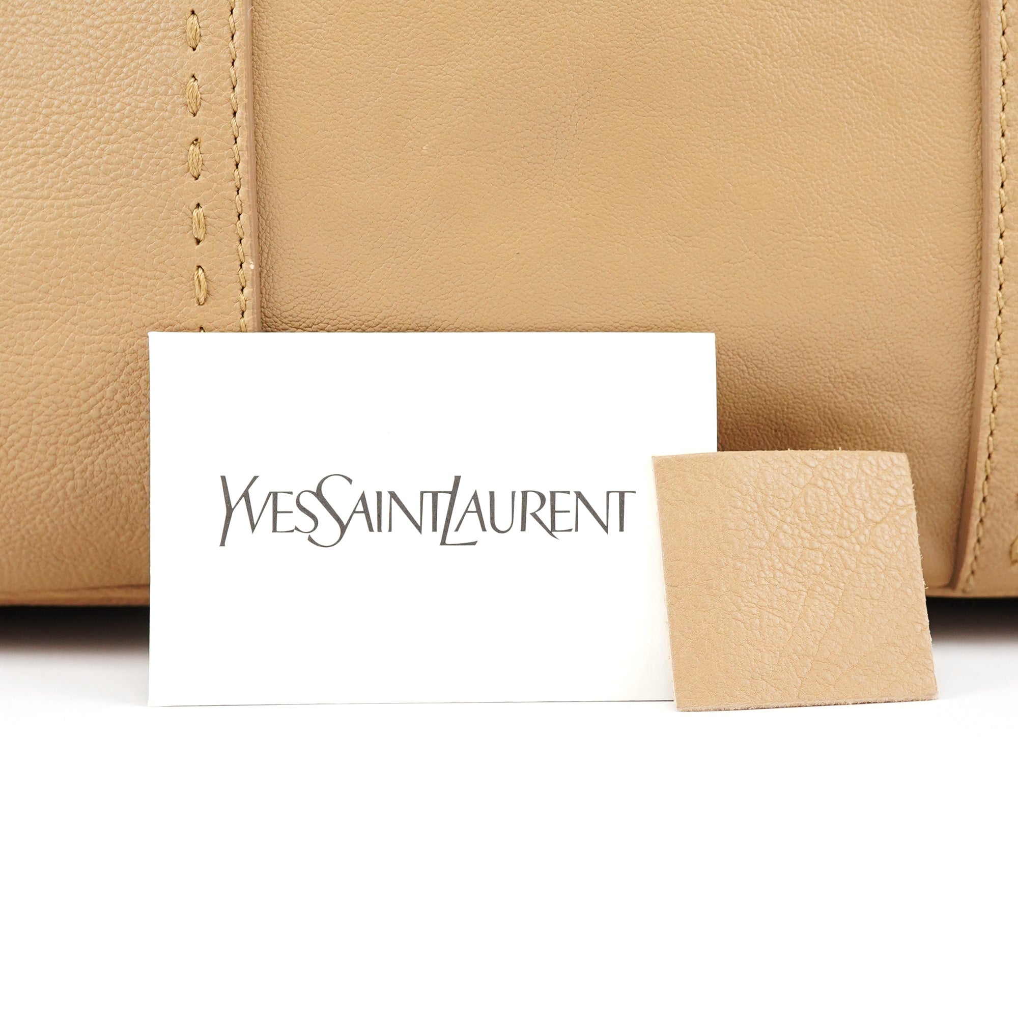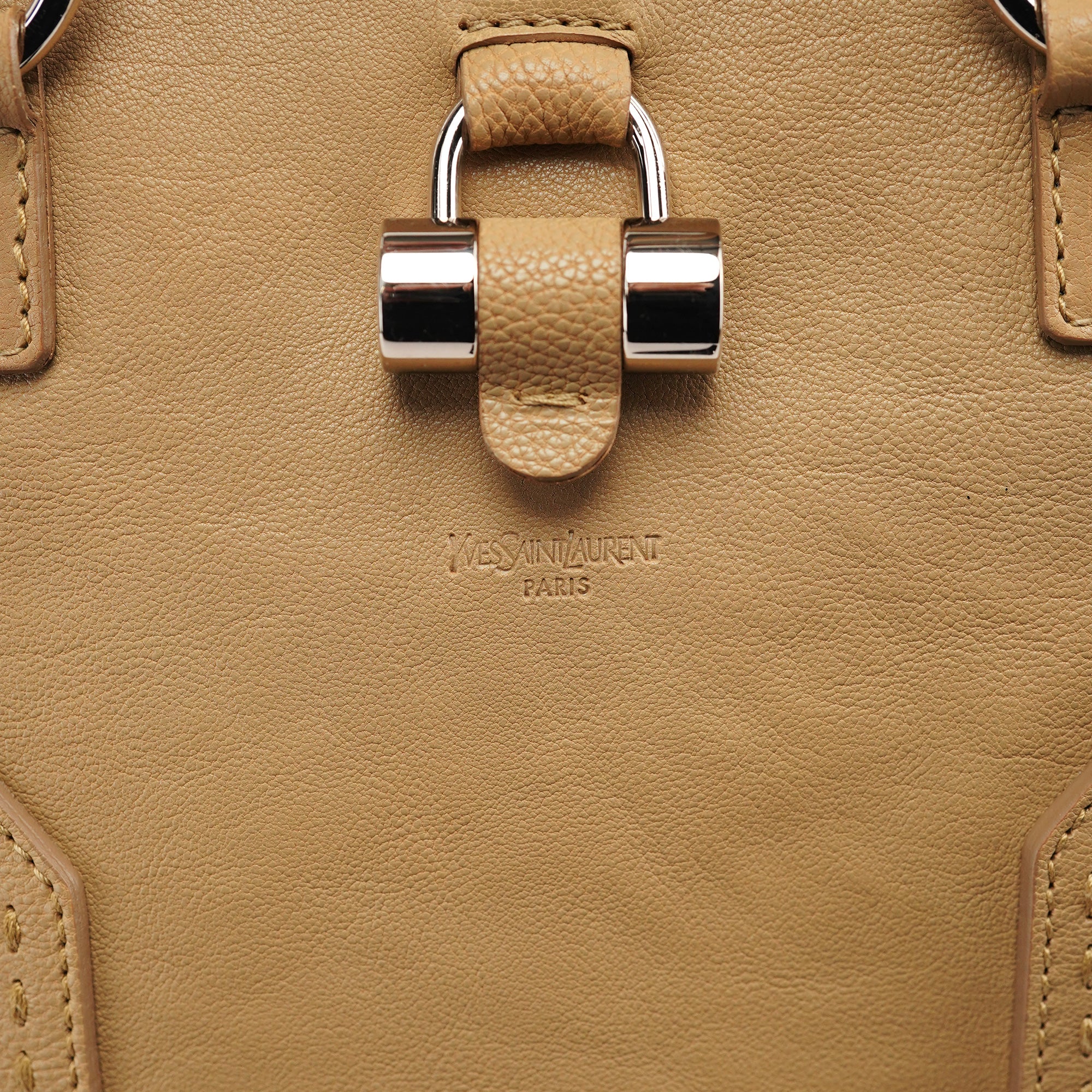 Designed in the late 2000s, this vintage Yves Saint Laurent Muse showcases the iconic dome-shaped silhouette that became a modern classic. Crafted in soft beige pebbled leather, the bag features the signature architectural Y-shaped leather accent at center front, polished silver-tone hardware including ring attachments, and dual top handles. The structured design includes protective metal feet and a spacious interior with zip pocket.