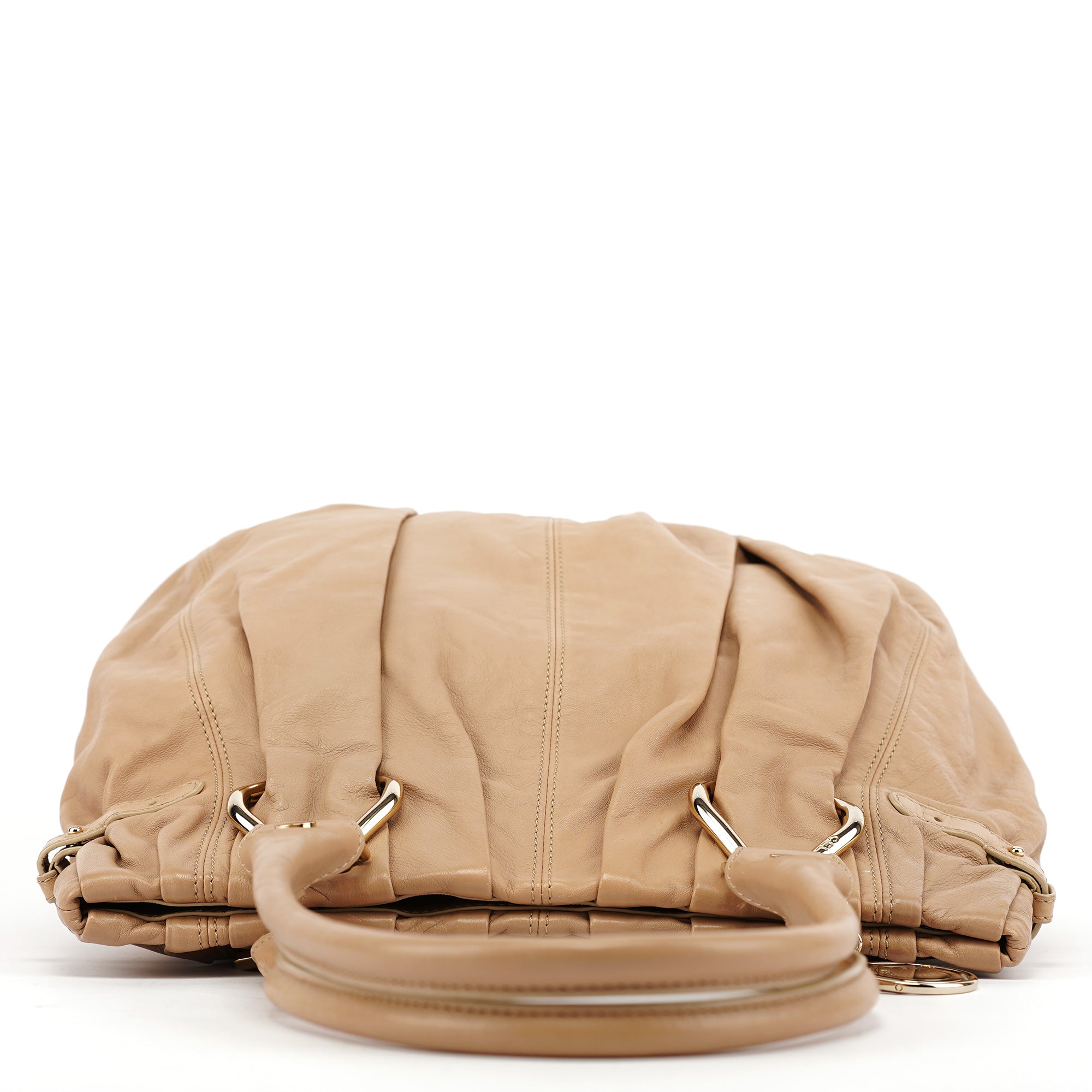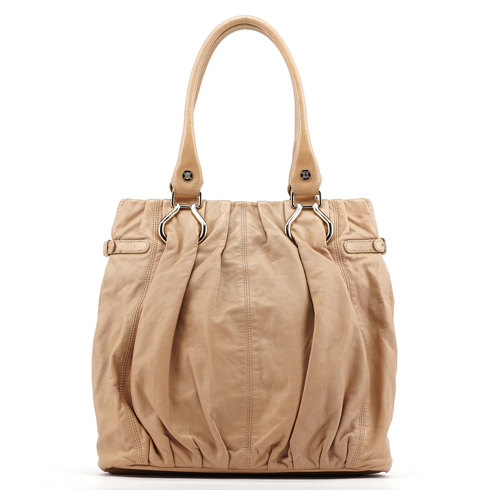 Designed in the early 2000s, this vintage Céline Pillow tote bag is crafted from beige leather with dual top handles and gathered detailing throughout. The soft, slouchy silhouette features hardware accents and a top zip closure. The interior is lined in fabric with a zippered pocket.