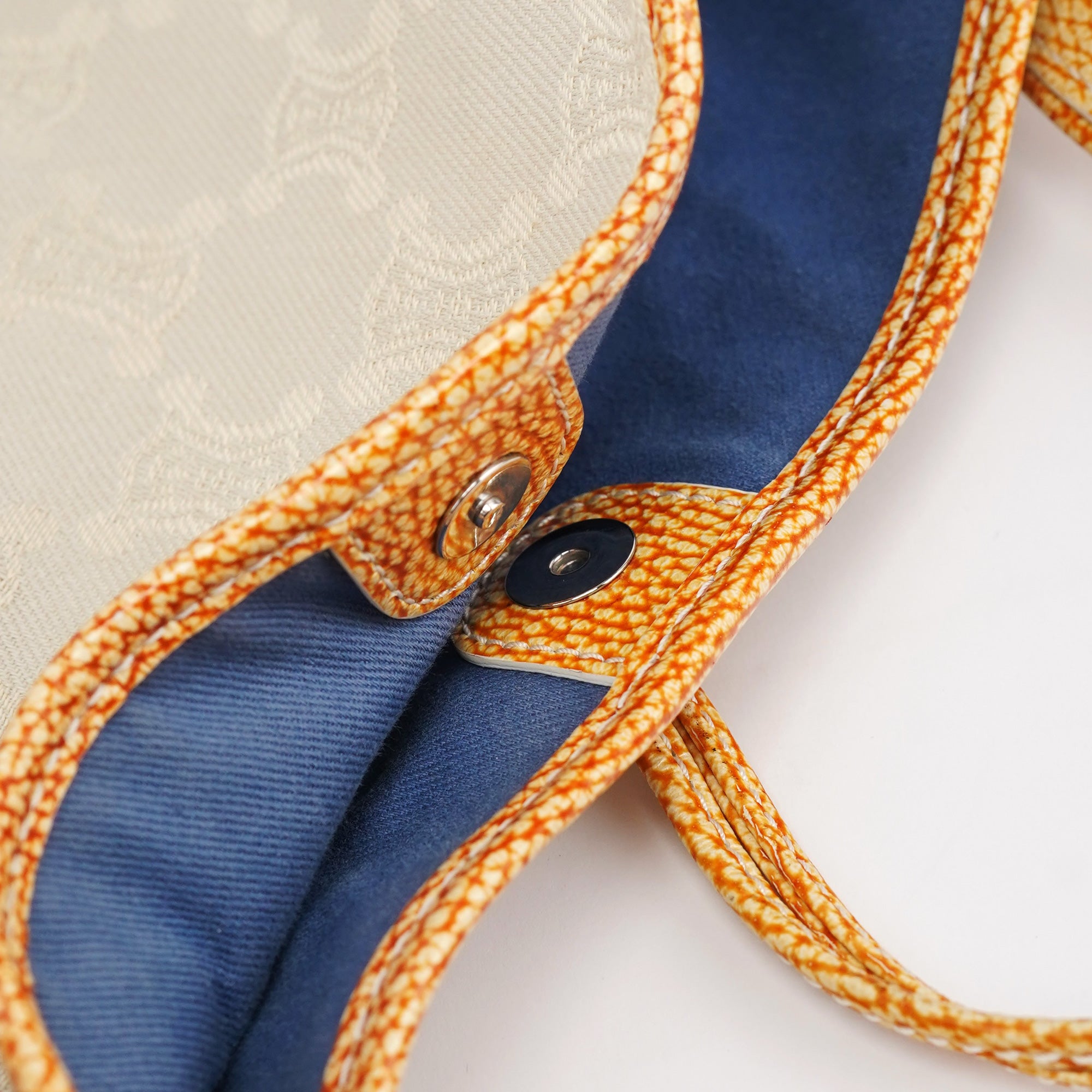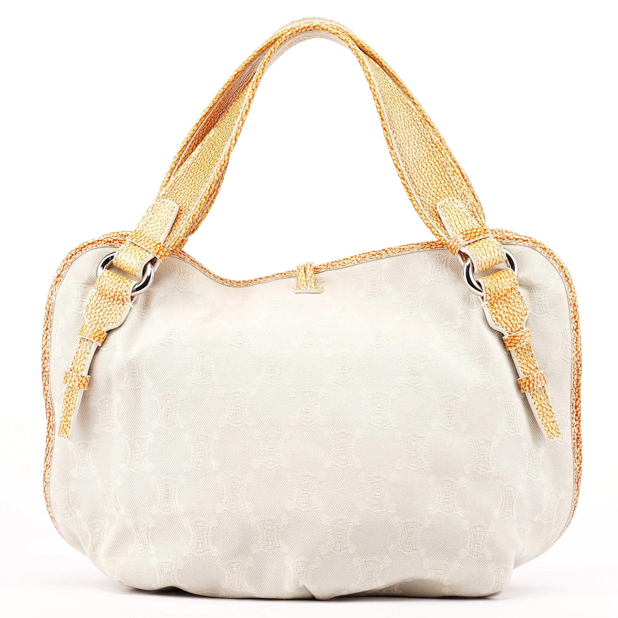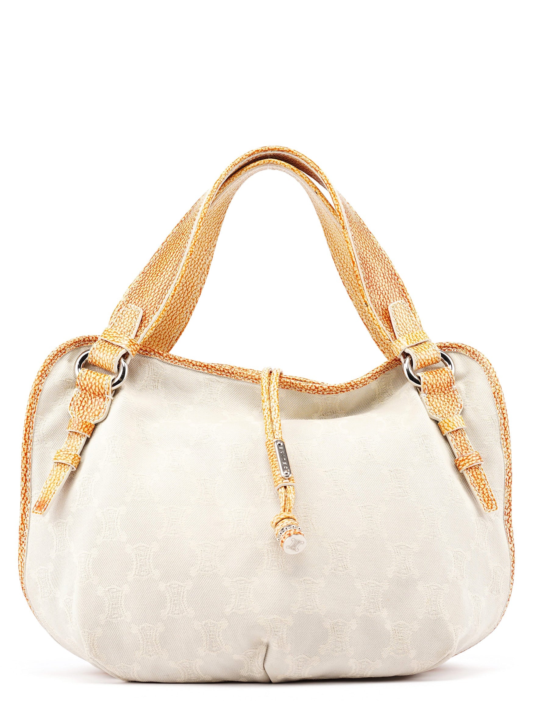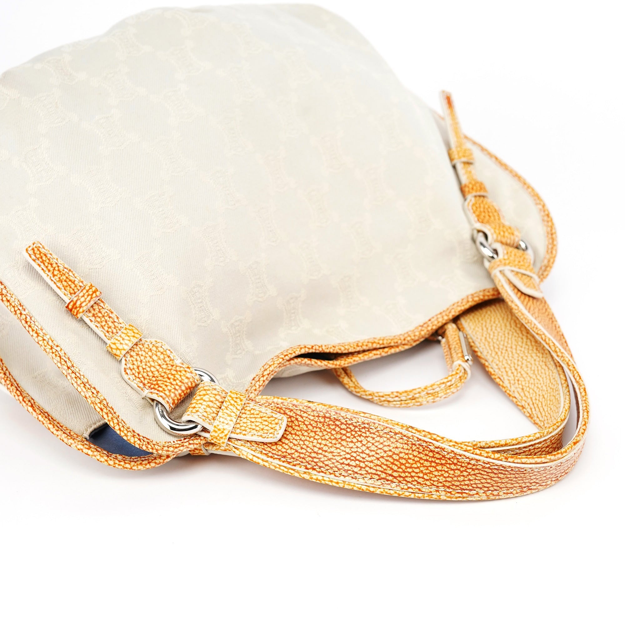 Designed in the early 2000s, this Celine Bittersweet bag features beige Triomphe canvas with contrasting tan leather handles and trim. The softly structured silhouette includes a top drawstring detail, silver-tone hardware, and dual rolled handles. The interior is lined in navy fabric with one zip pocket and multiple slip compartments.