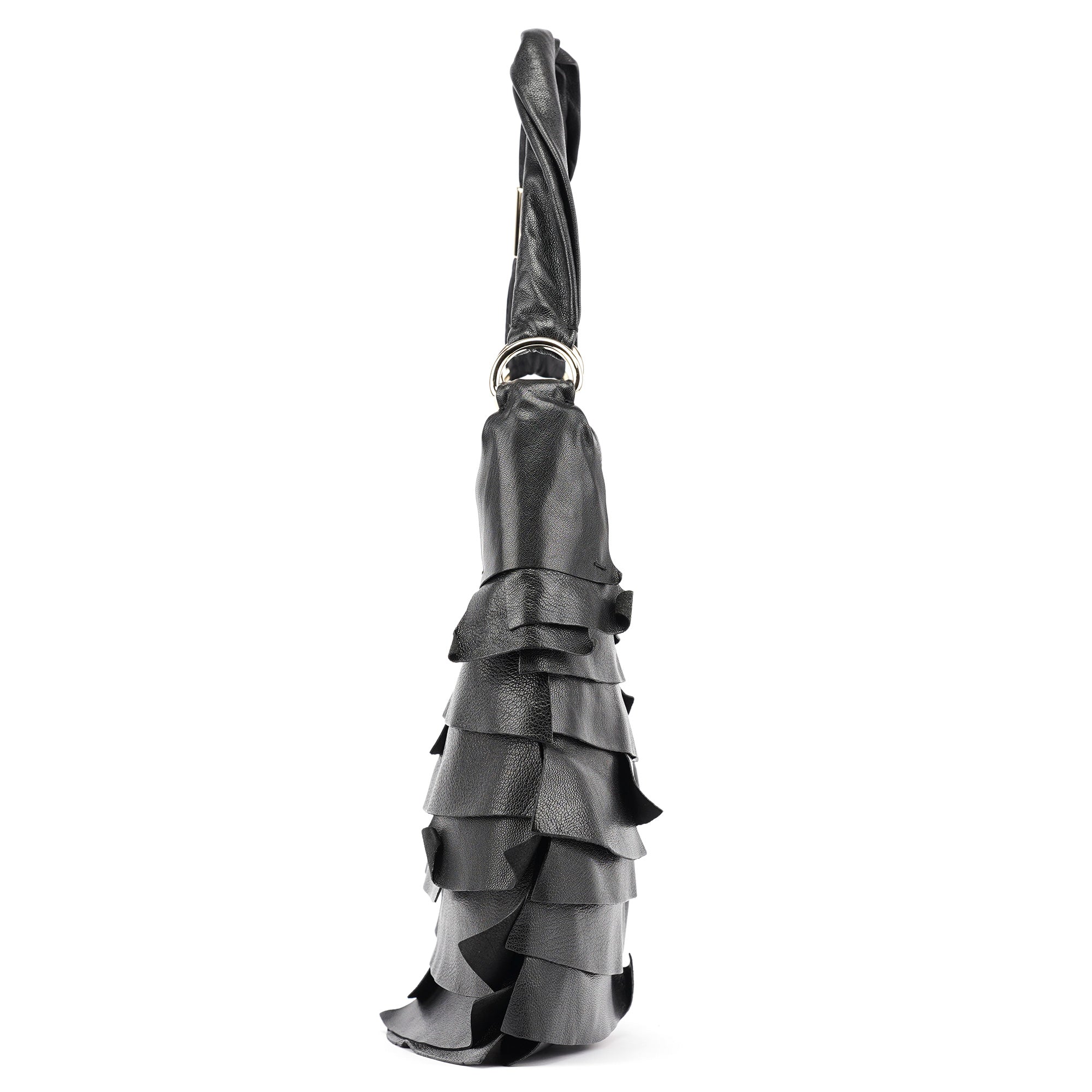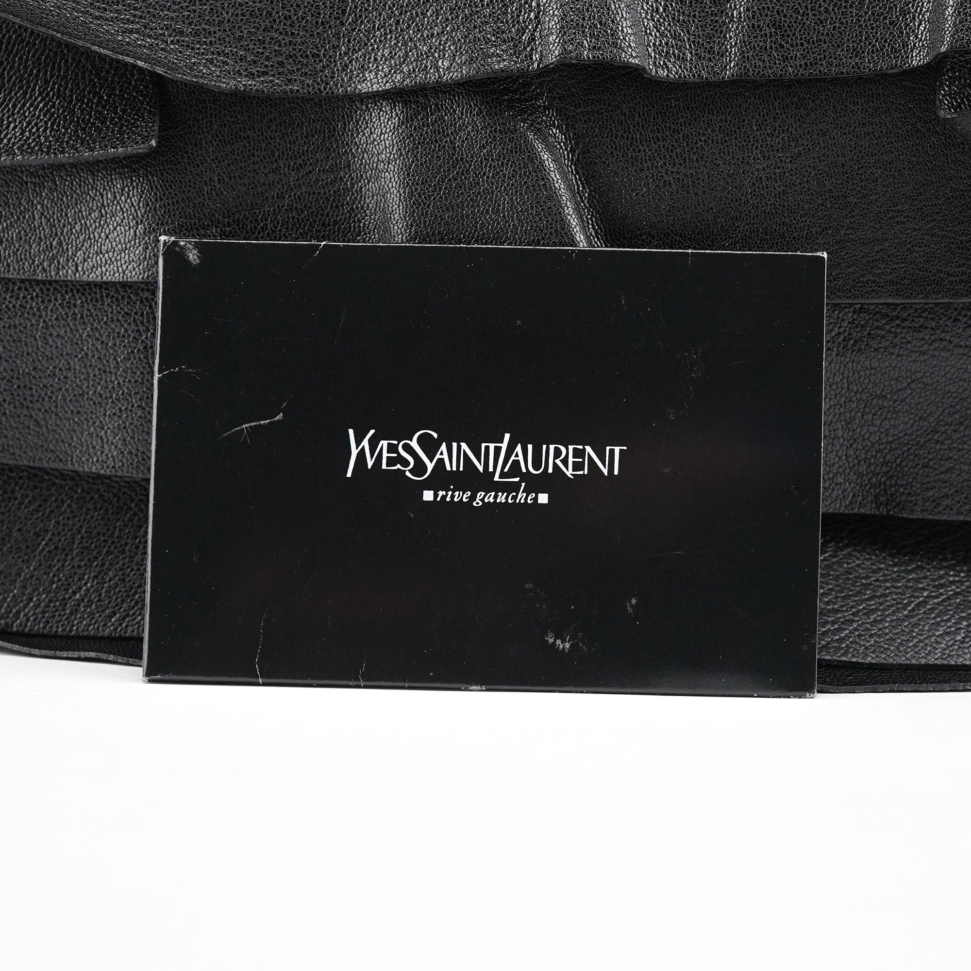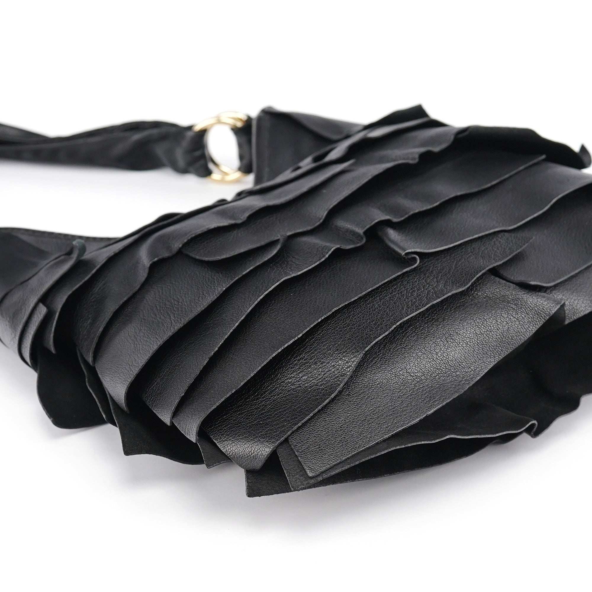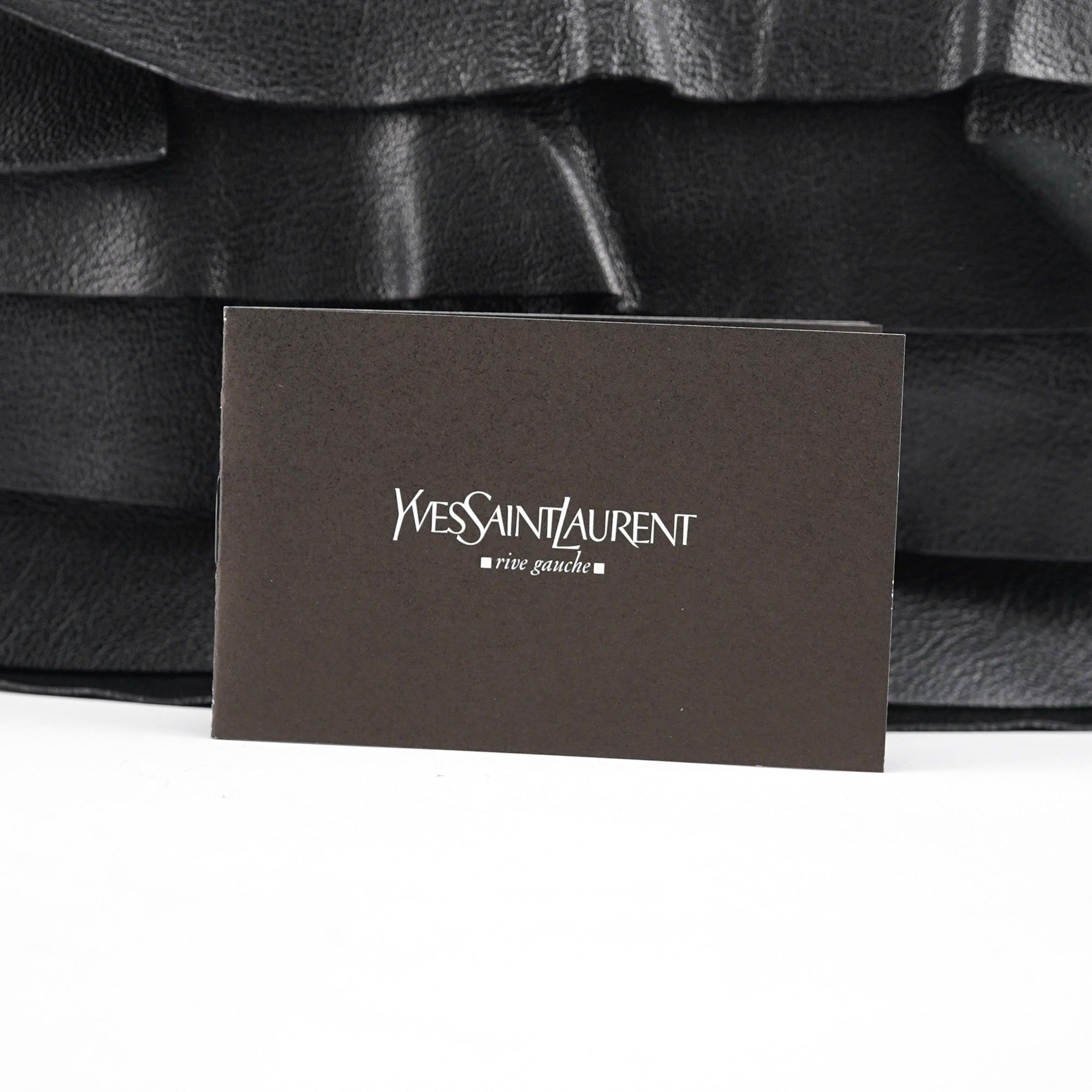 Designed in the early 2000s by Tom Ford, this YSL Saint Tropez shoulder bag is crafted in supple black leather with a ruffled layered design that captures a playful yet sophisticated spirit. The bag features a wide single strap gathered into a polished silver plaque engraved with the Saint Laurent logo, while the interior is lined in fabric with a secure snap closure for everyday practicality.