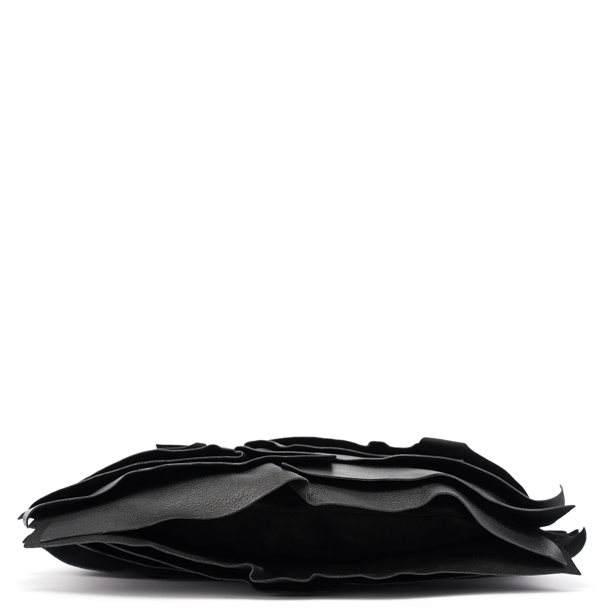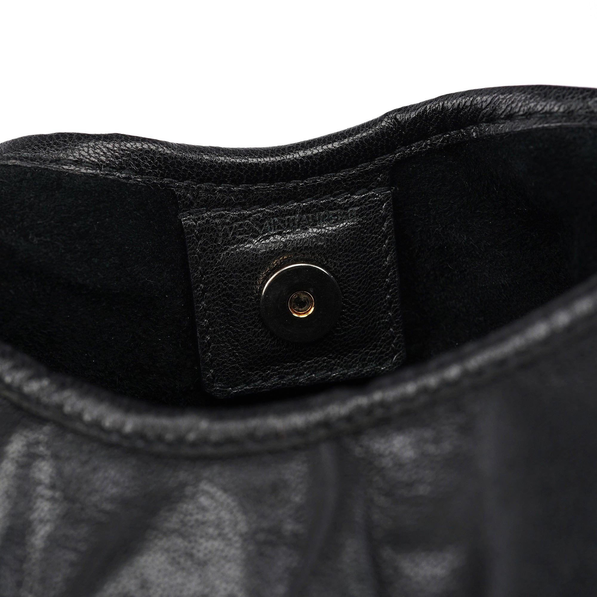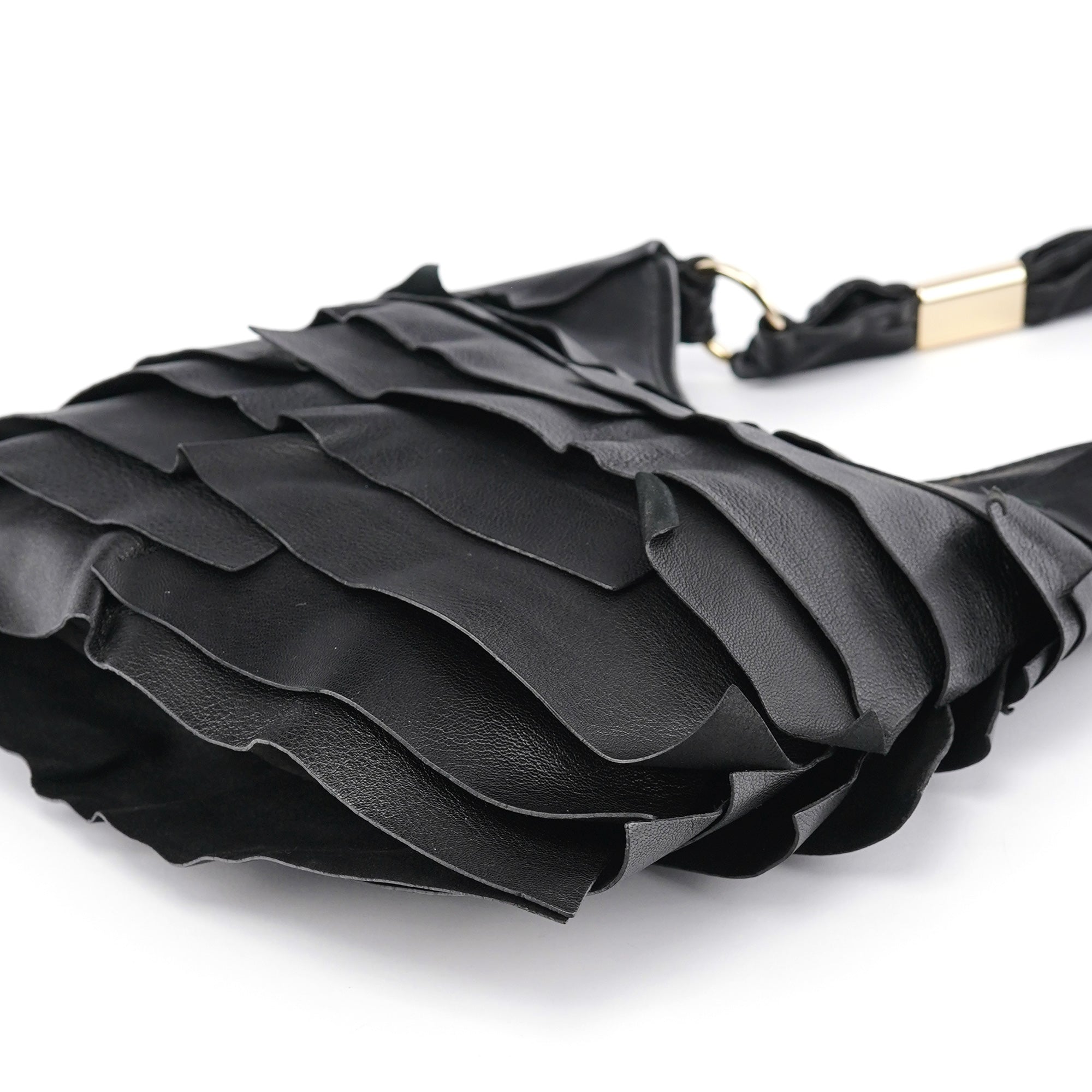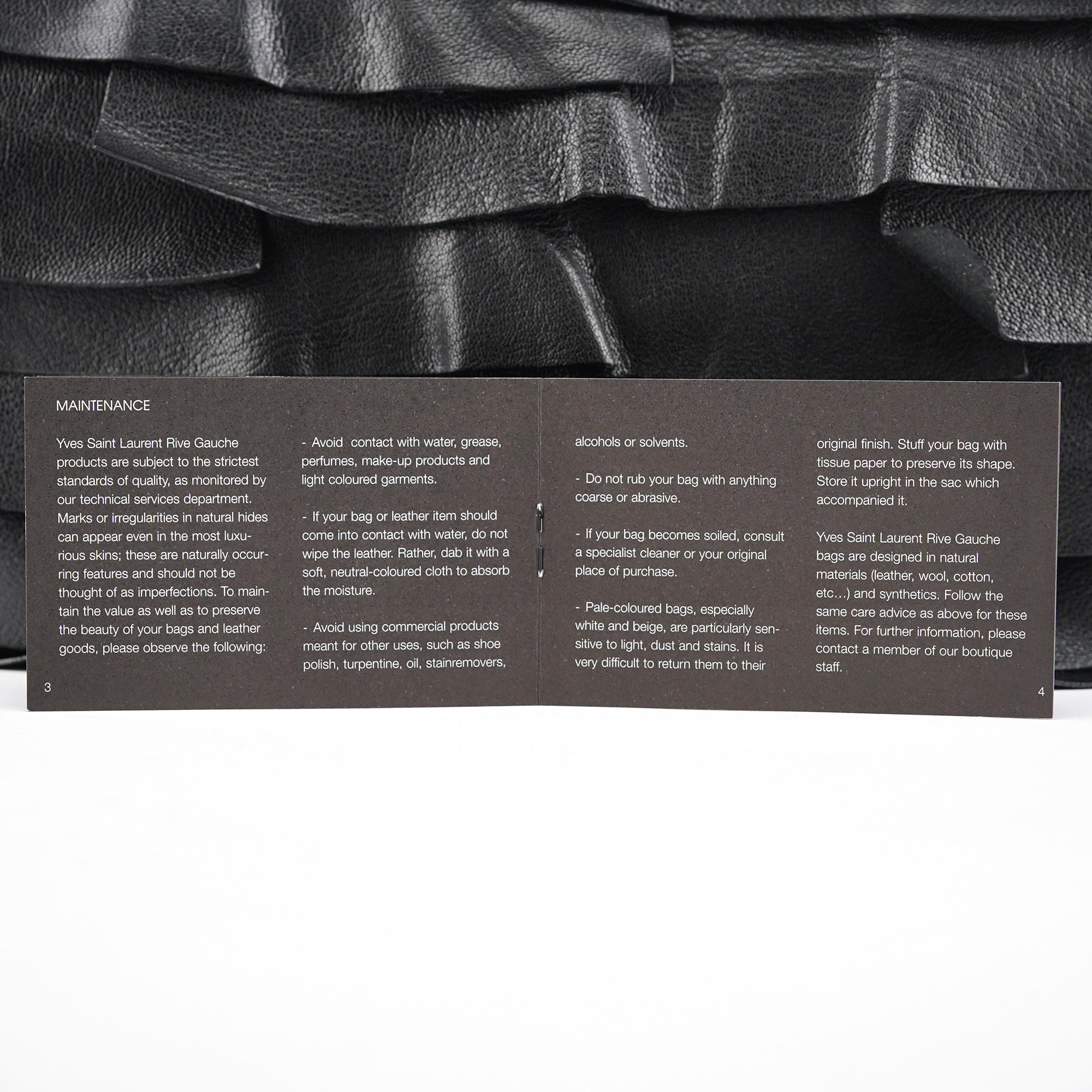 Designed in the early 2000s by Tom Ford, this YSL Saint Tropez shoulder bag is crafted in supple black leather with a ruffled layered design that captures a playful yet sophisticated spirit. The bag features a wide single strap gathered into a polished silver plaque engraved with the Saint Laurent logo, while the interior is lined in fabric with a secure snap closure for everyday practicality.
