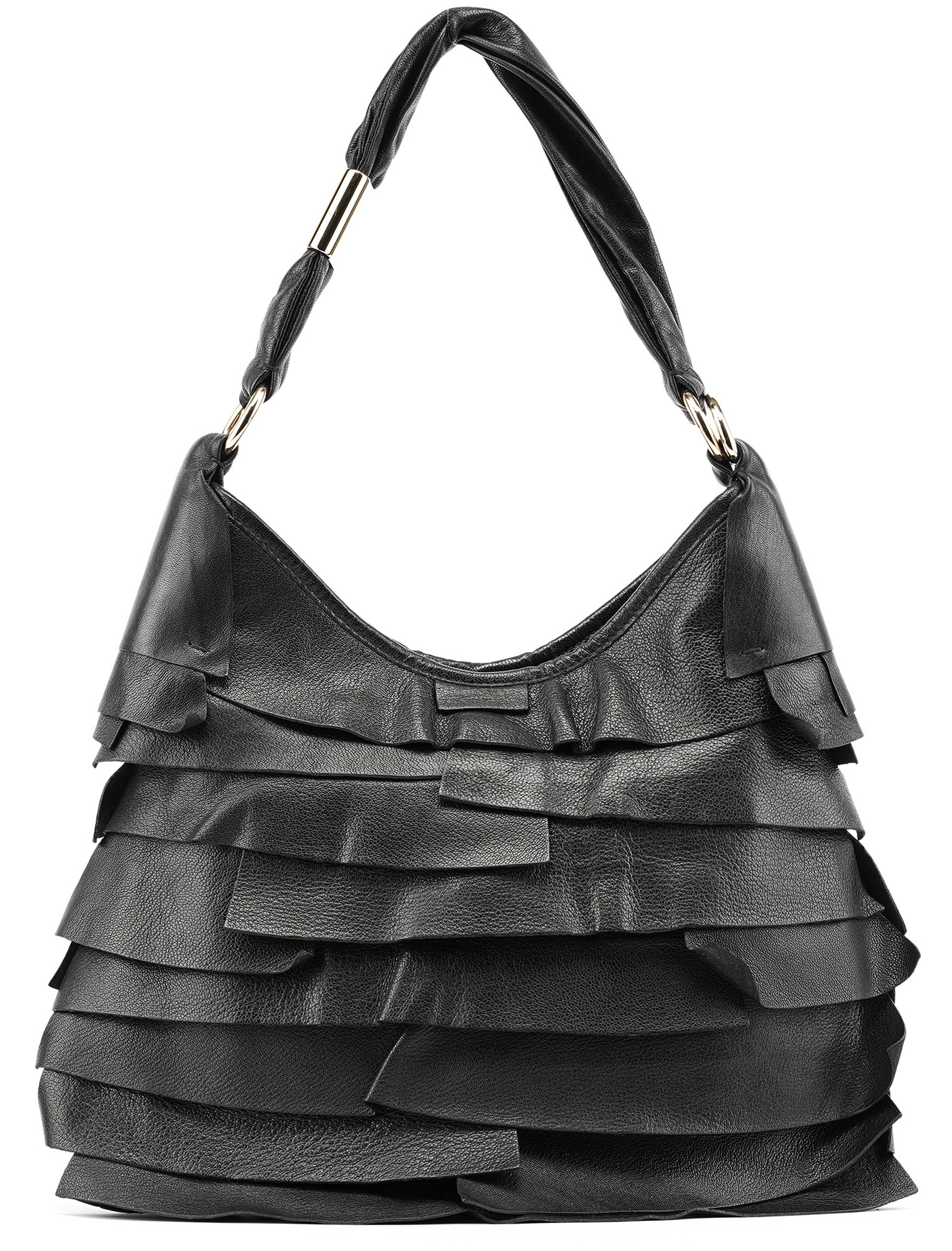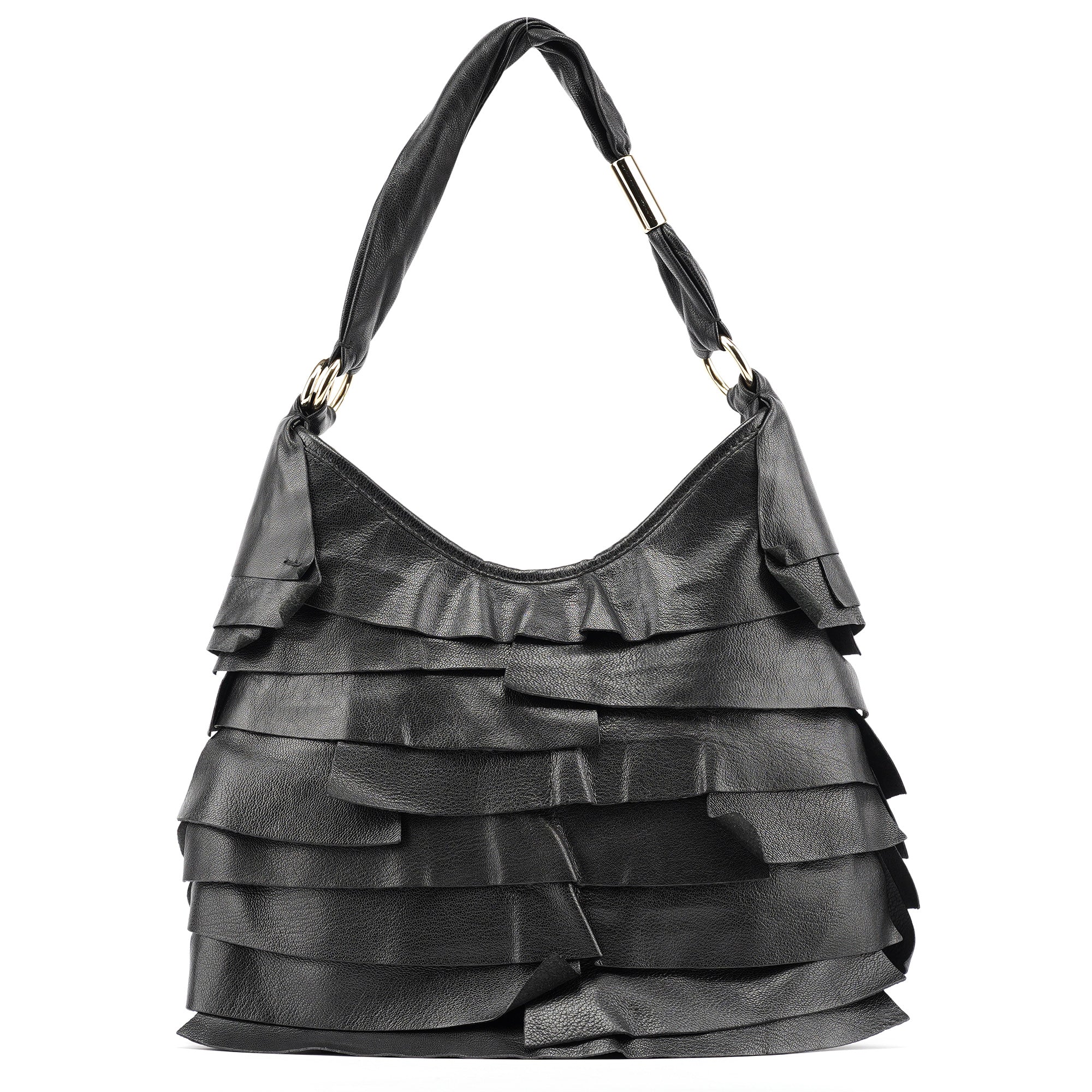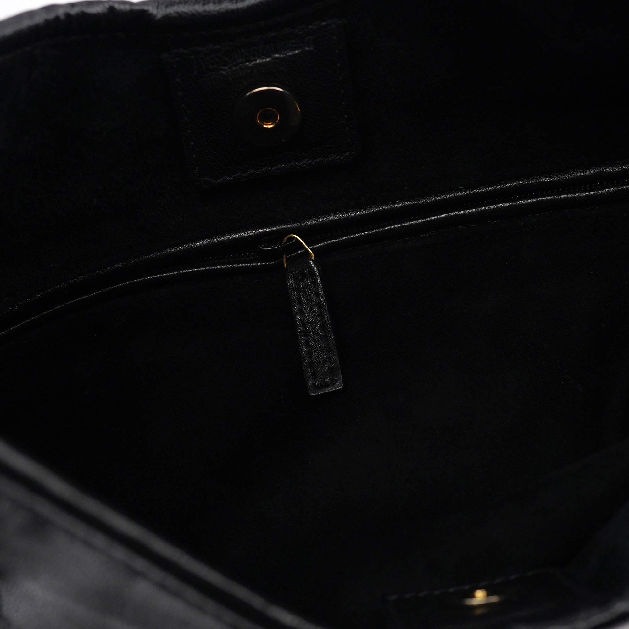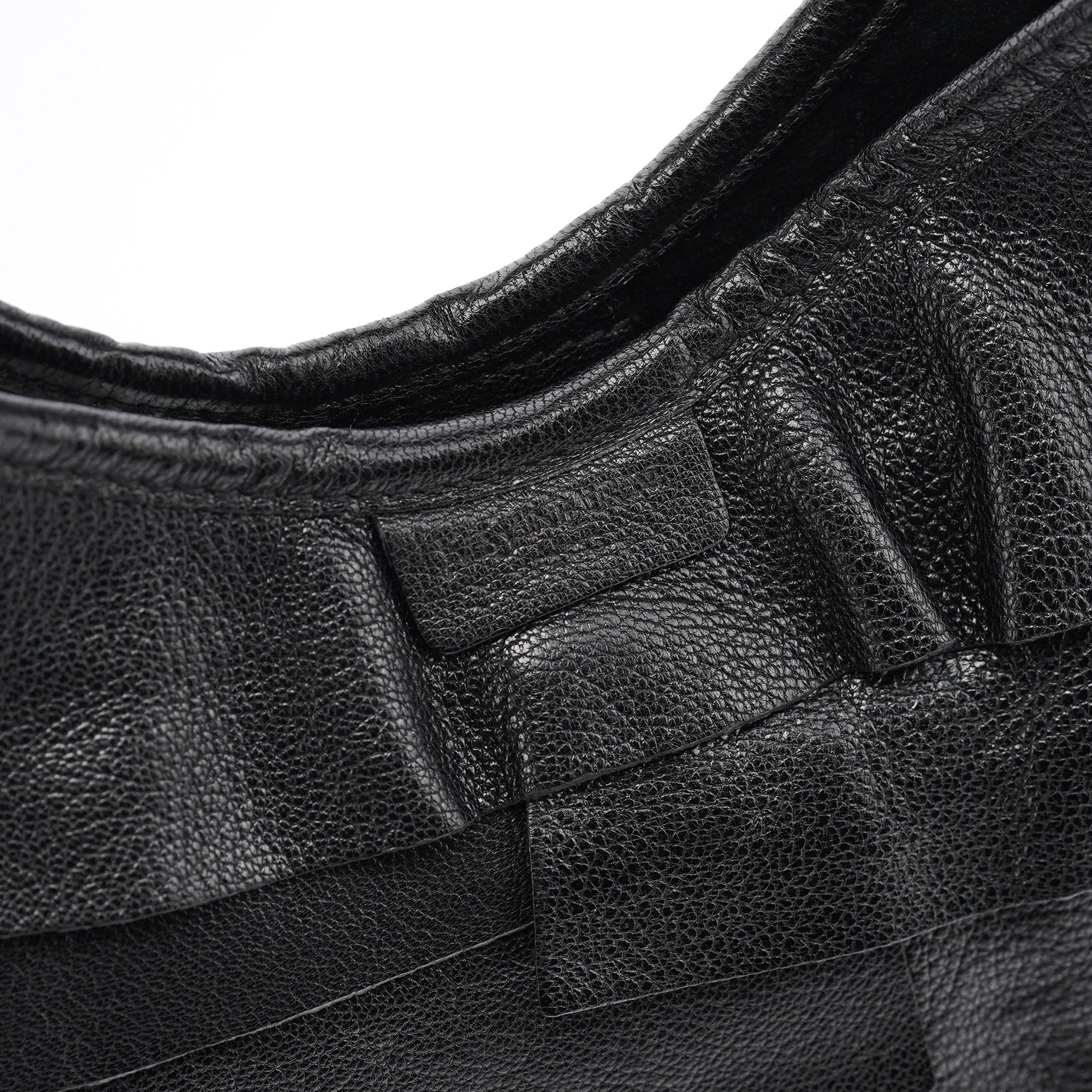 Designed in the early 2000s by Tom Ford, this YSL Saint Tropez shoulder bag is crafted in supple black leather with a ruffled layered design that captures a playful yet sophisticated spirit. The bag features a wide single strap gathered into a polished silver plaque engraved with the Saint Laurent logo, while the interior is lined in fabric with a secure snap closure for everyday practicality.