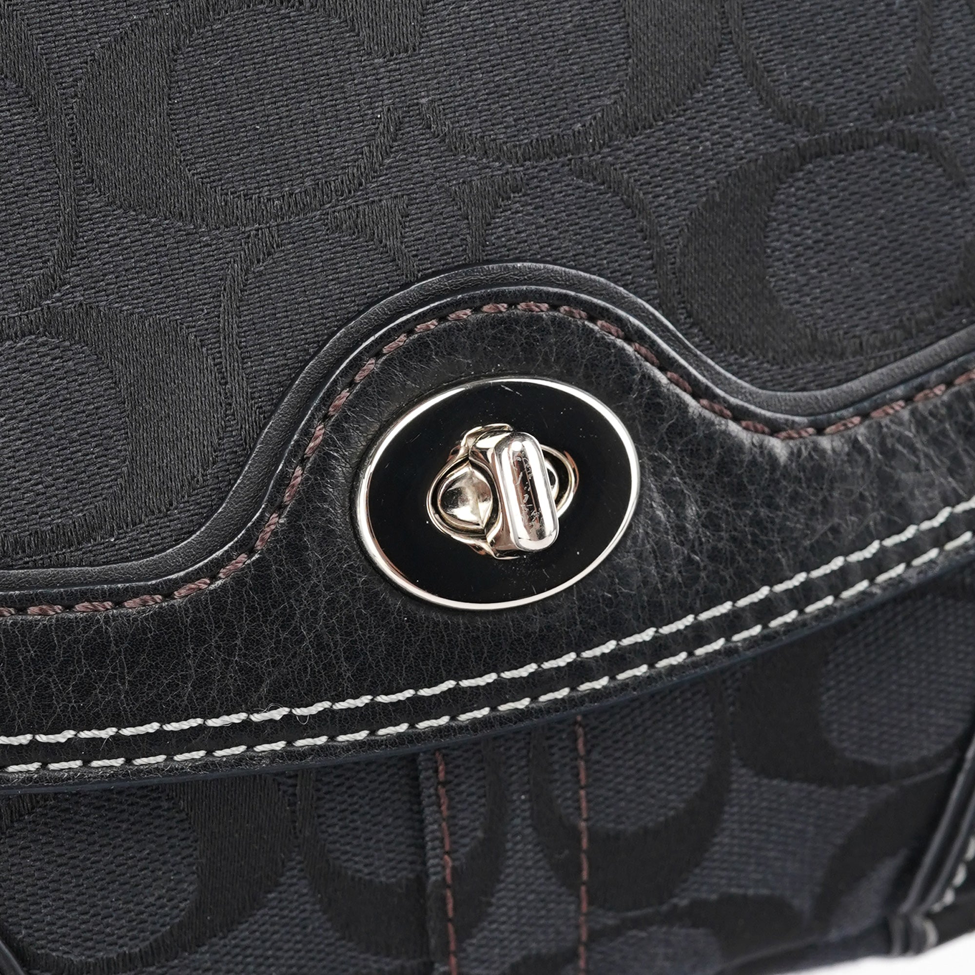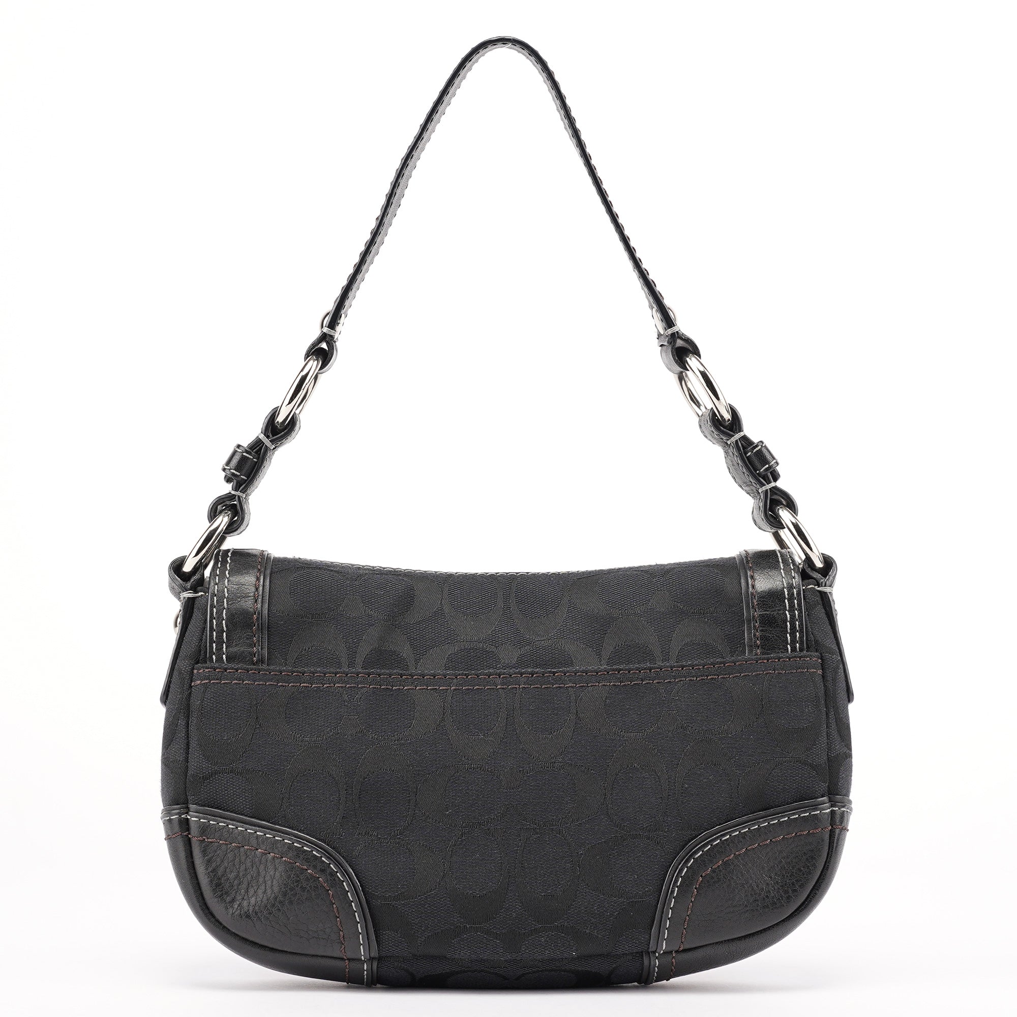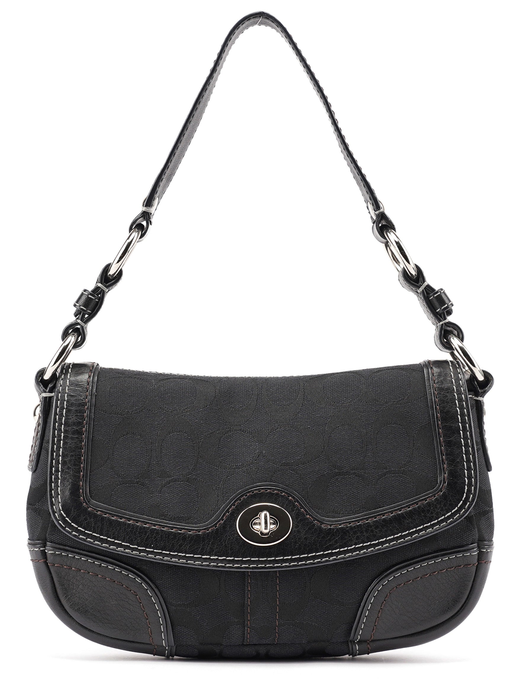 Designed in the early 2000s, this Coach shoulder bag is crafted from signature black jacquard canvas with tonal leather trim and contrast stitching. The softly rounded silhouette is accented with silver-tone hardware, including a turn-lock closure and chain-link shoulder strap. The flap opens to a lined interior with a zip pocket for essentials.