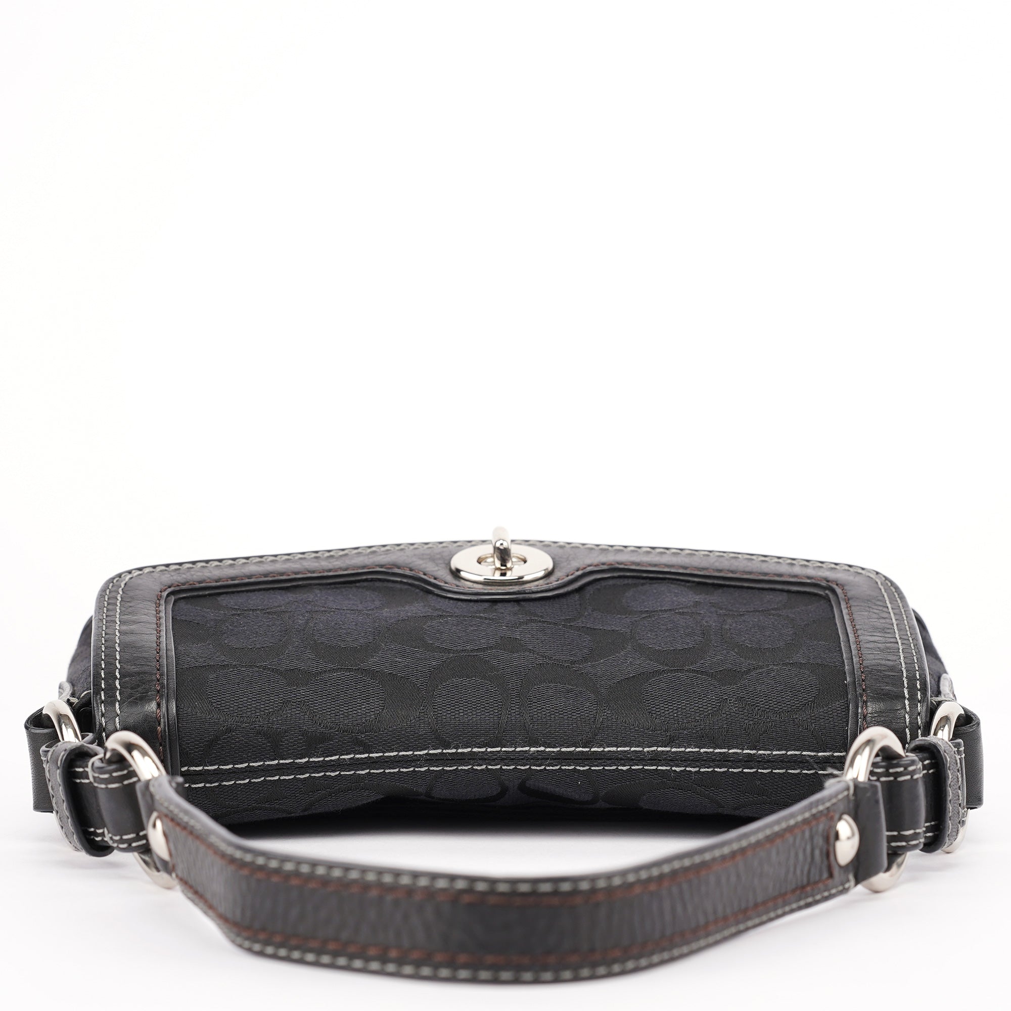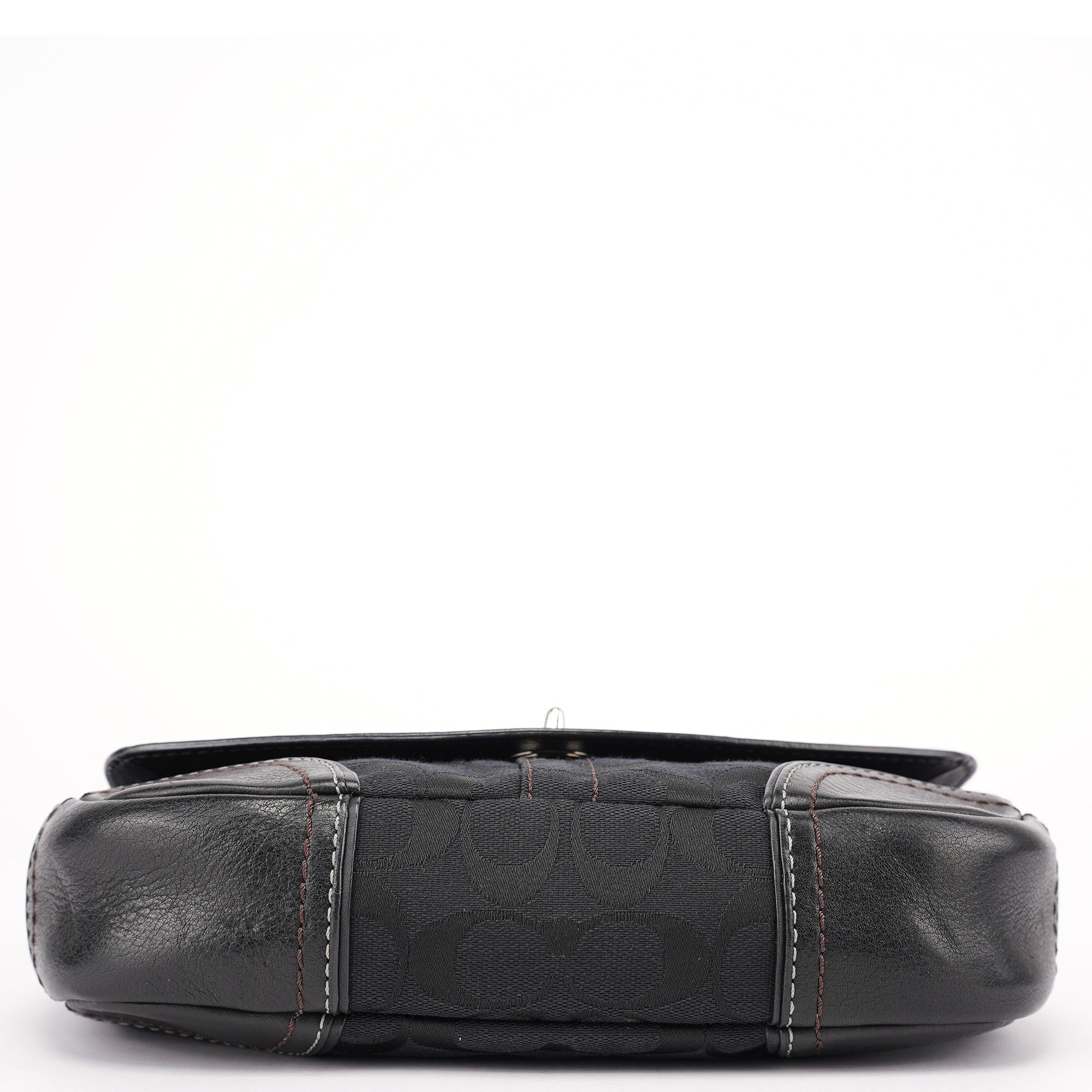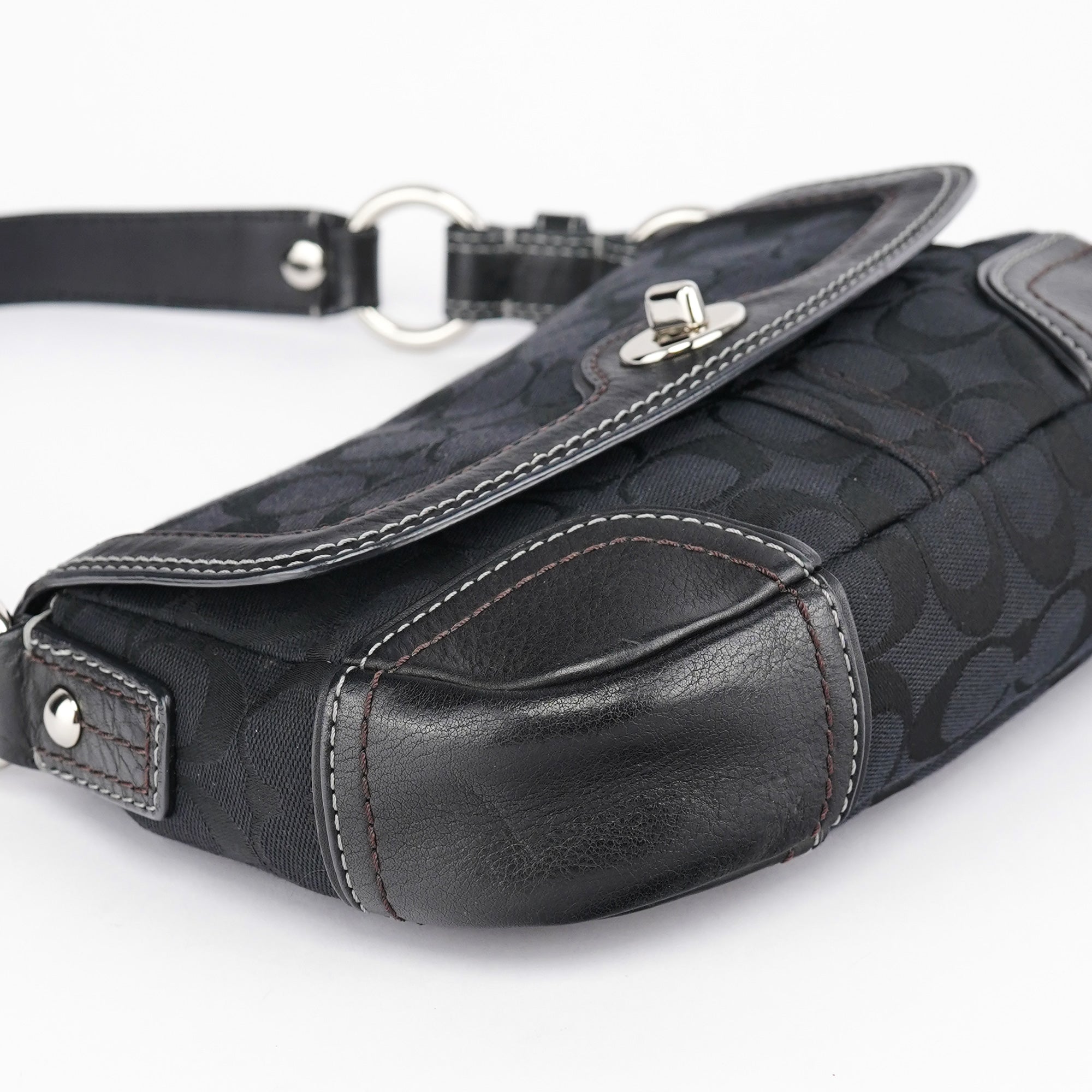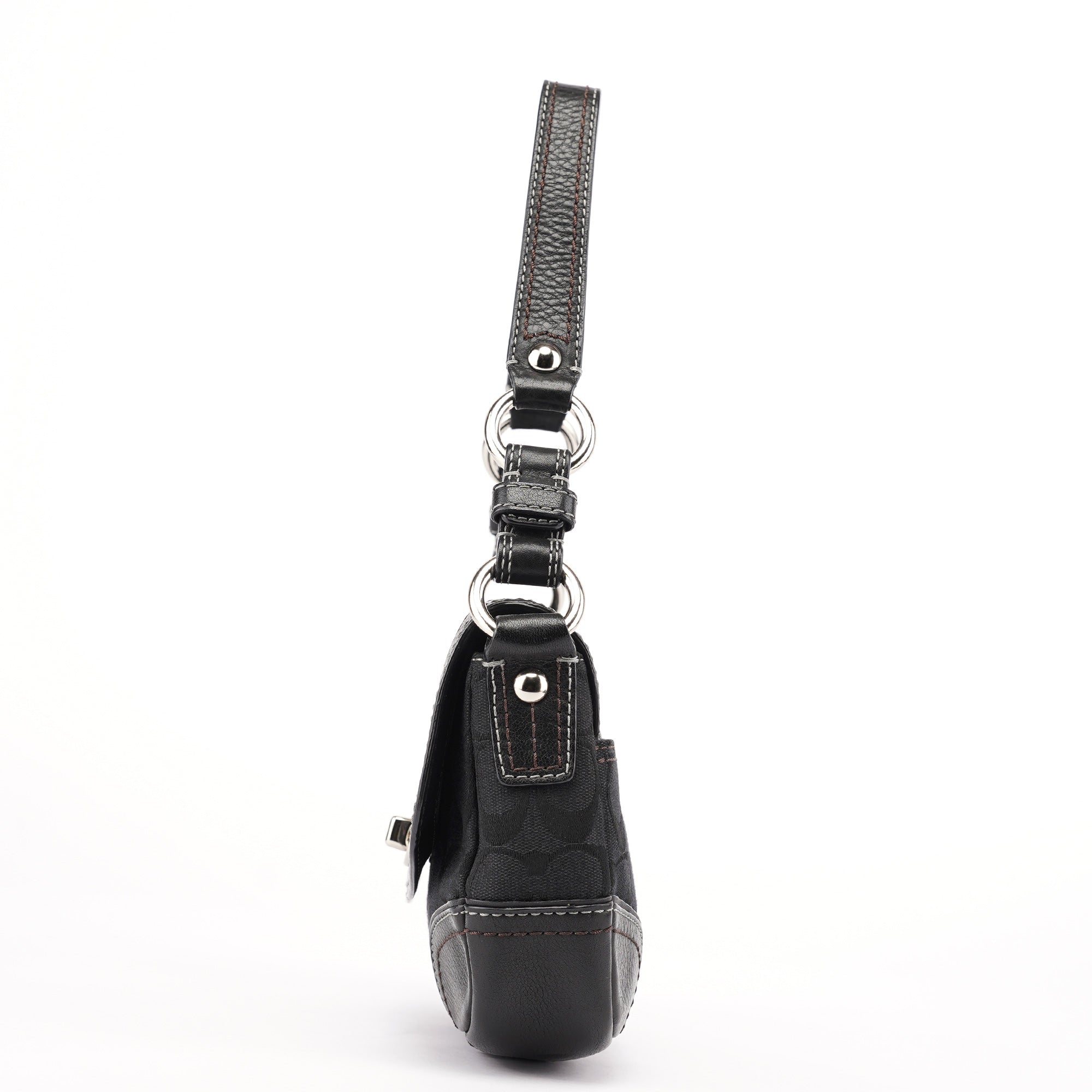 Designed in the early 2000s, this Coach shoulder bag is crafted from signature black jacquard canvas with tonal leather trim and contrast stitching. The softly rounded silhouette is accented with silver-tone hardware, including a turn-lock closure and chain-link shoulder strap. The flap opens to a lined interior with a zip pocket for essentials.