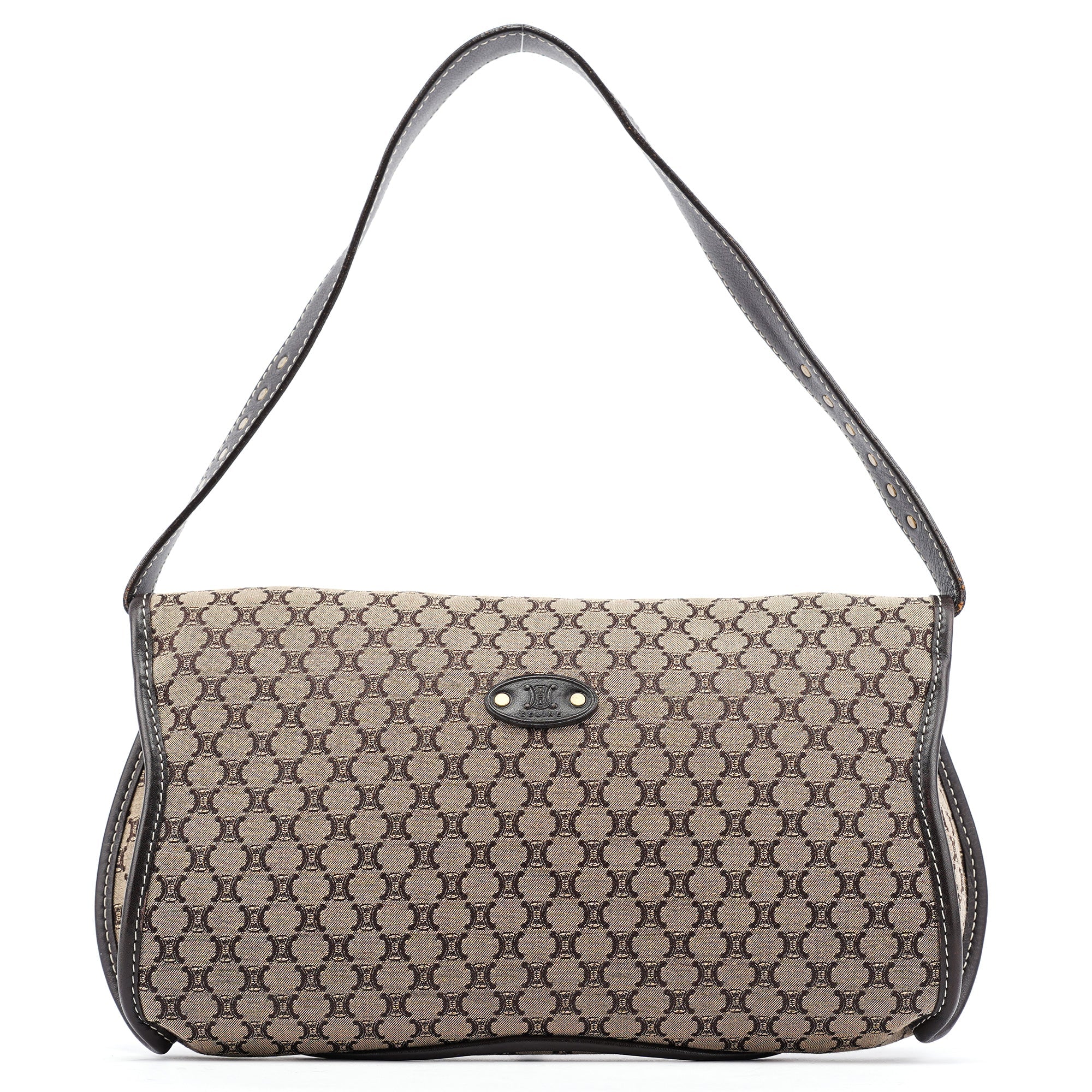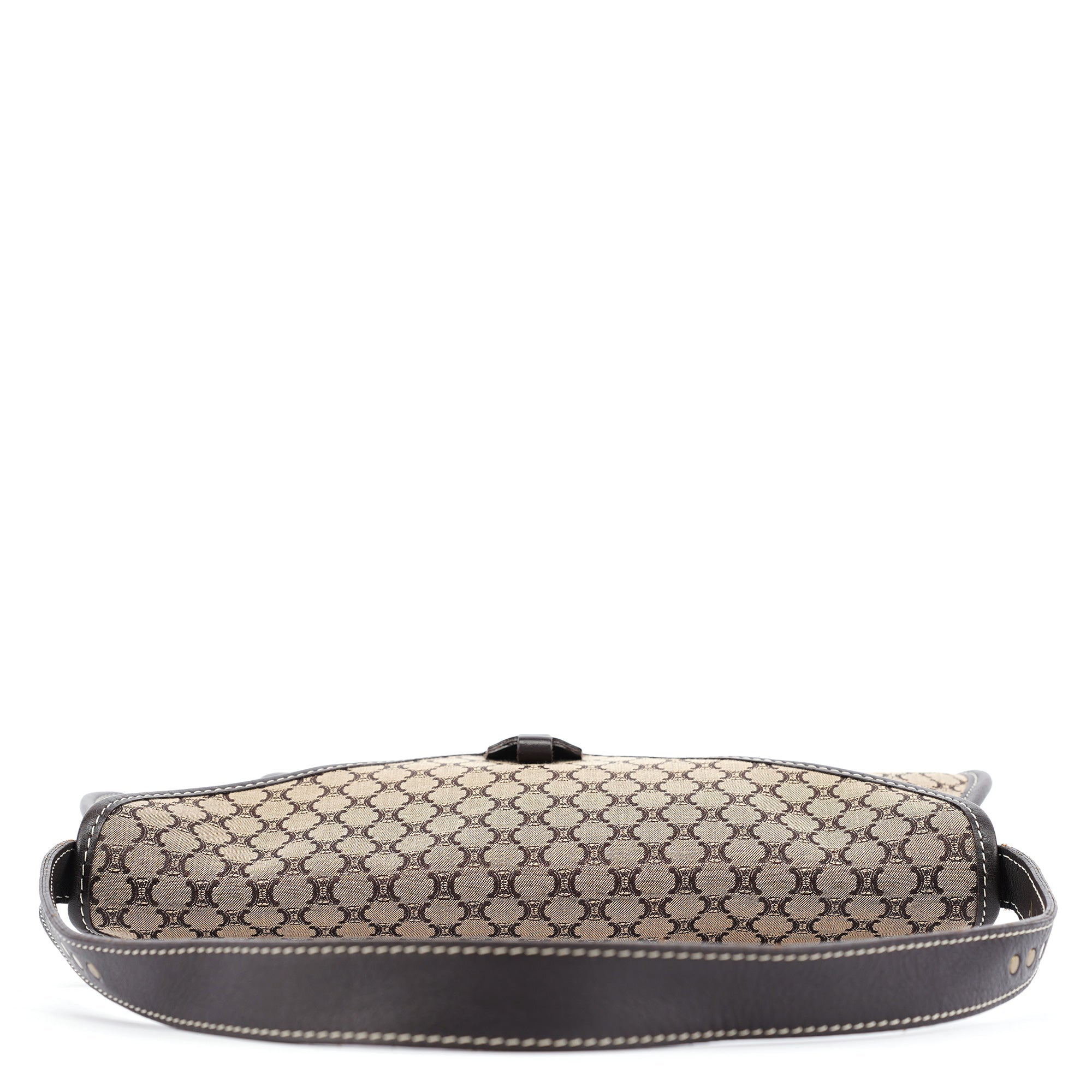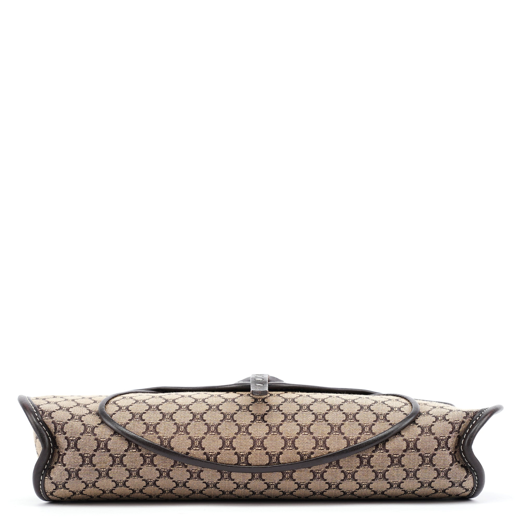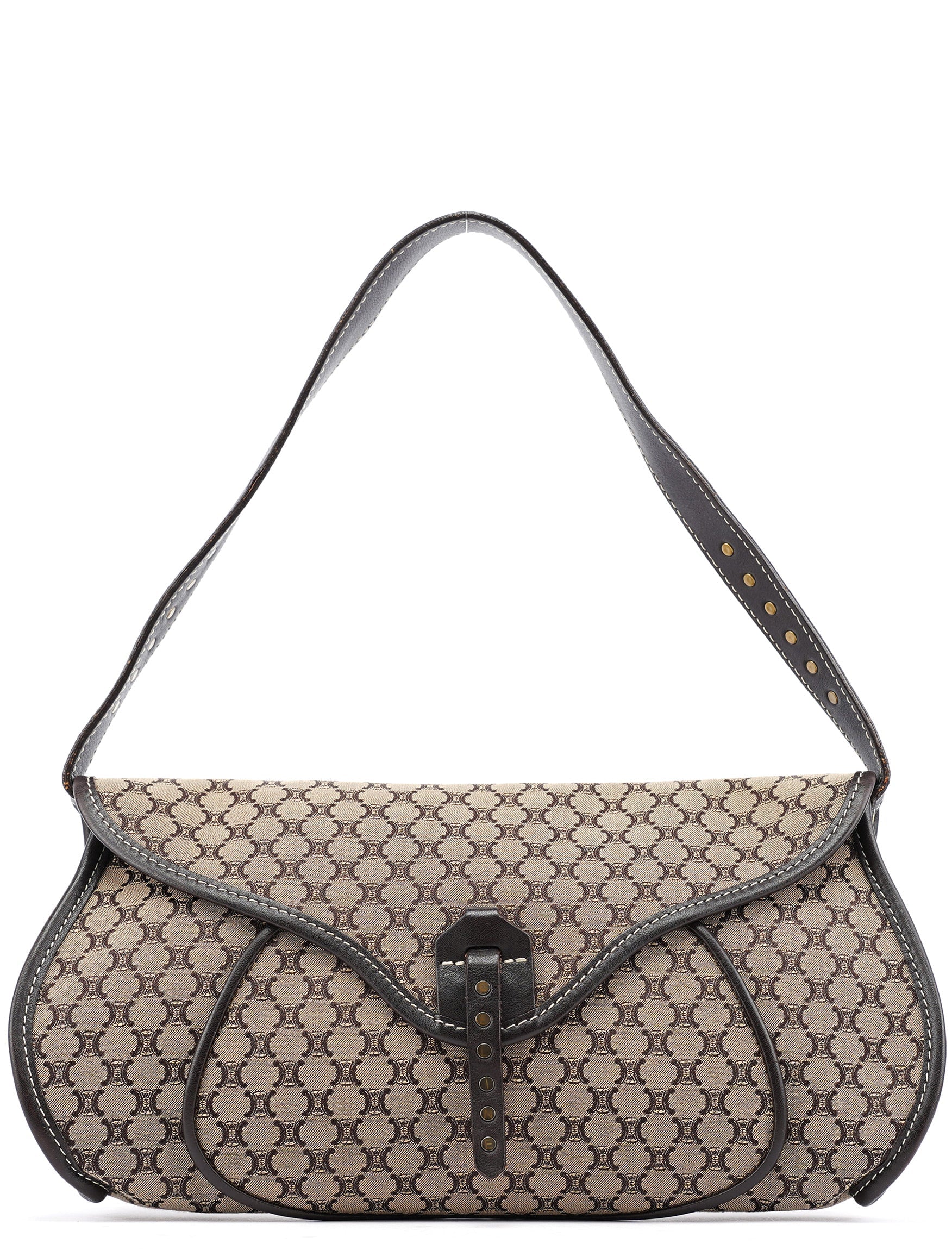 Designed in the early 2000's, this vintage Celine shoulder bag was crafted from beige and brown Triomphe canvas with leather trim. The curved envelope silhouette features a single adjustable shoulder strap with Triomphe canvas and leather detailing, a front flap closure with logo plaque and snap hardware, and a fabric-lined interior. The signature interlocking C pattern creates a distinctive look across the structured body.