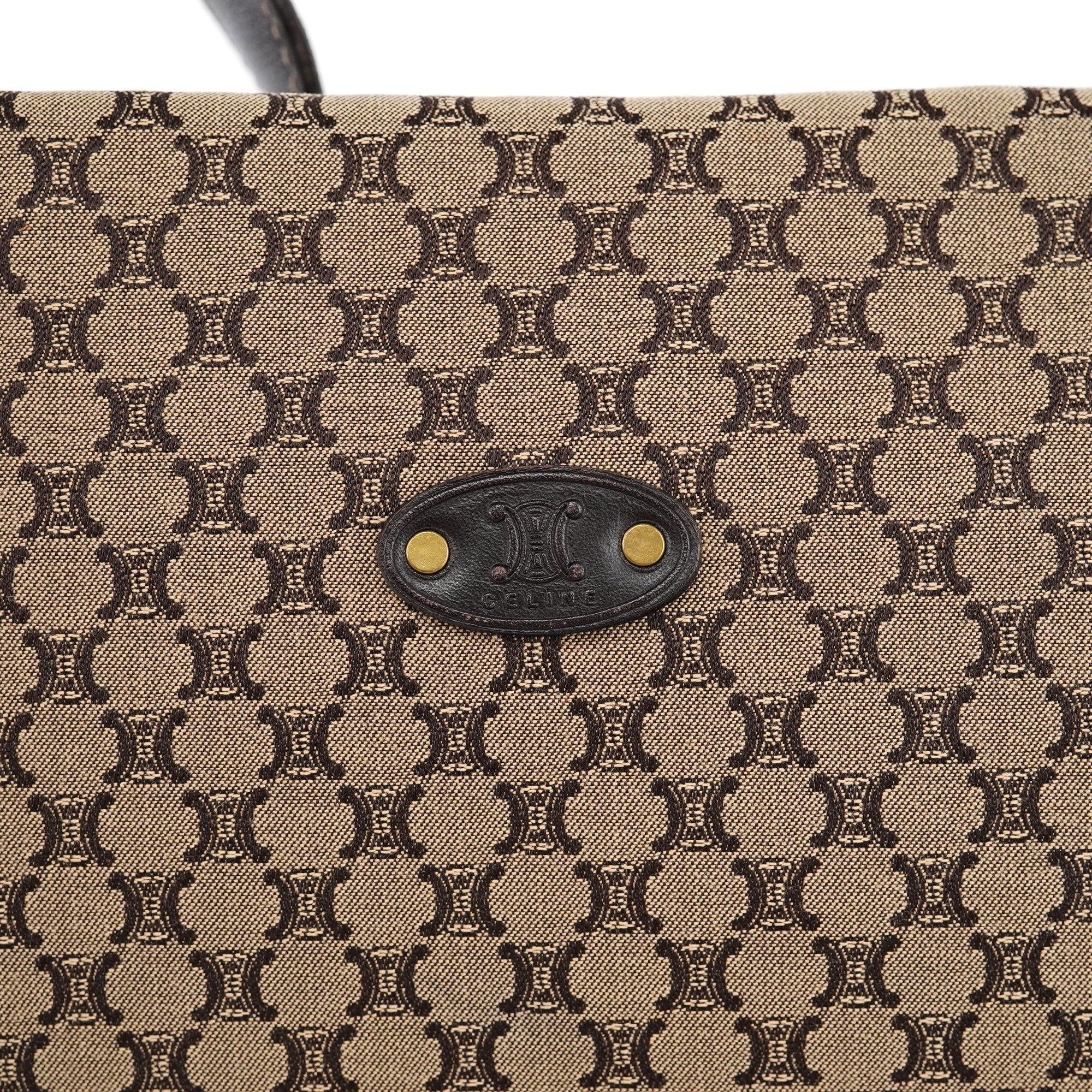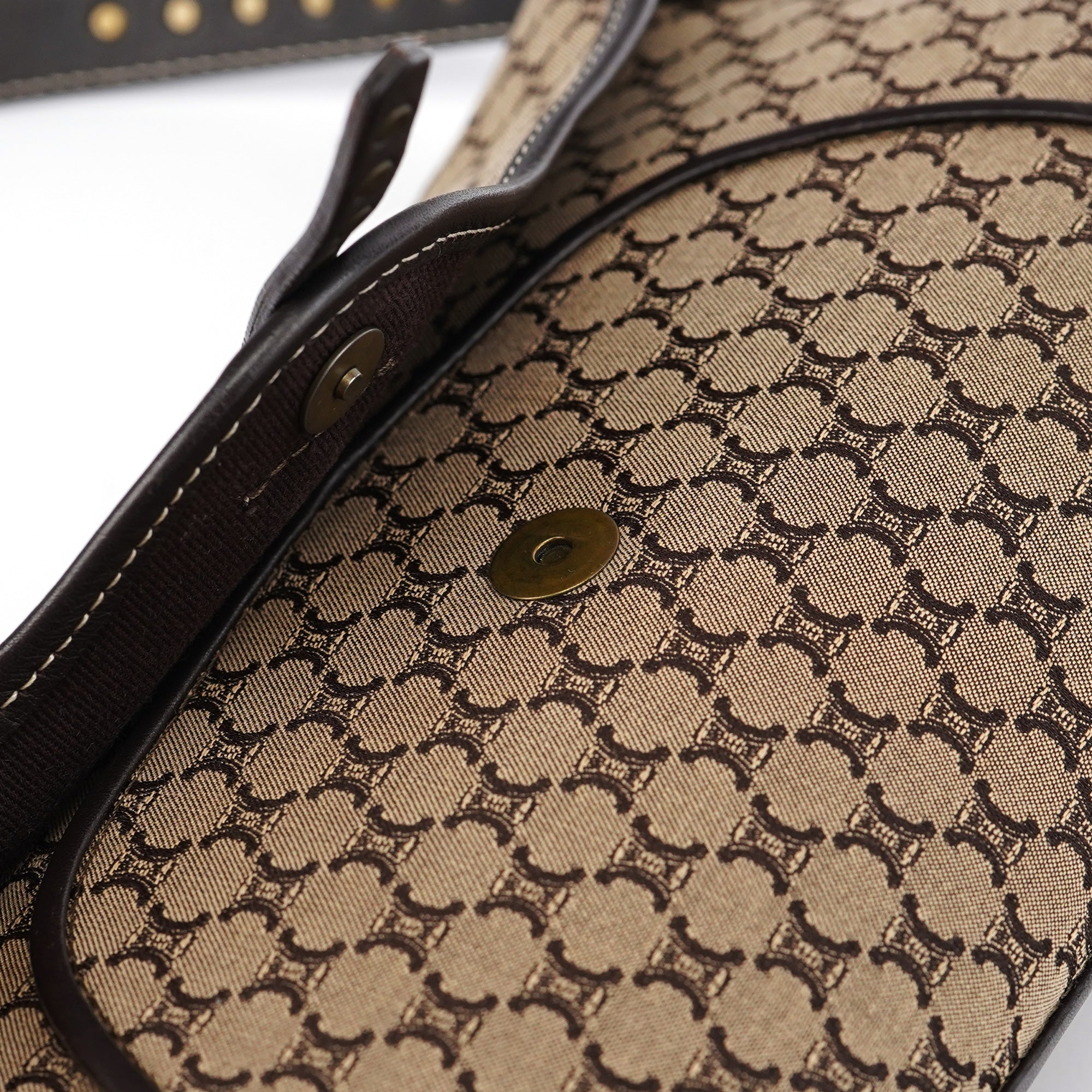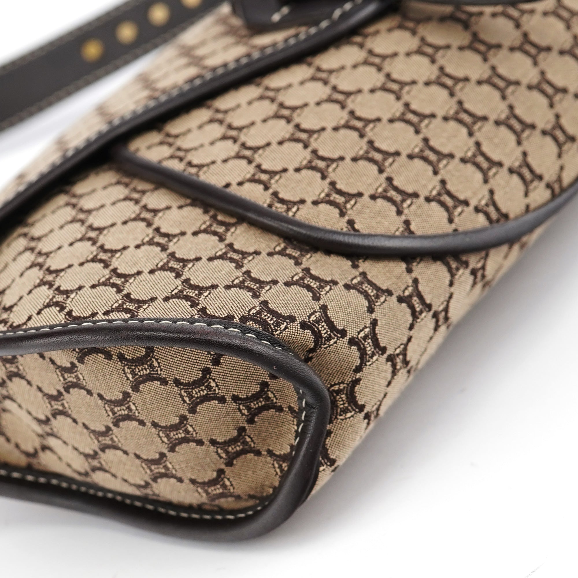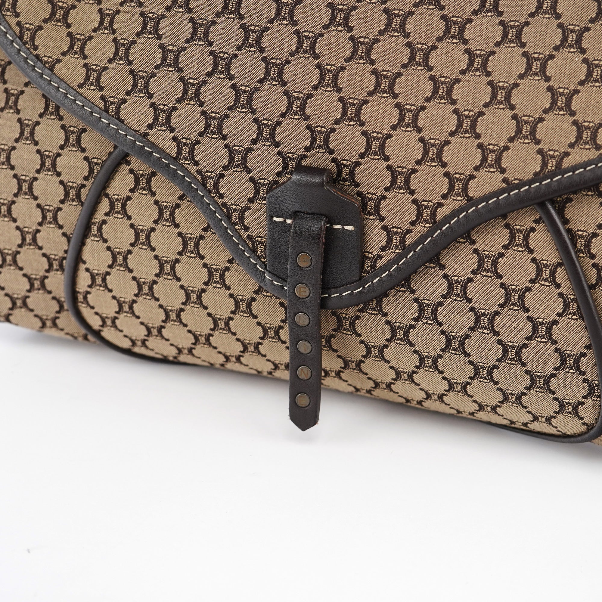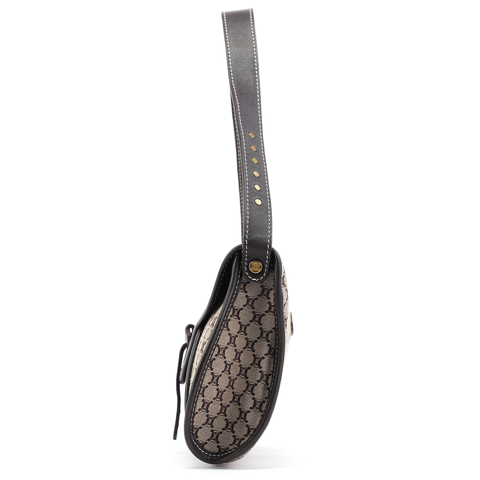 Designed in the early 2000's, this vintage Celine shoulder bag was crafted from beige and brown Triomphe canvas with leather trim. The curved envelope silhouette features a single adjustable shoulder strap with Triomphe canvas and leather detailing, a front flap closure with logo plaque and snap hardware, and a fabric-lined interior. The signature interlocking C pattern creates a distinctive look across the structured body.