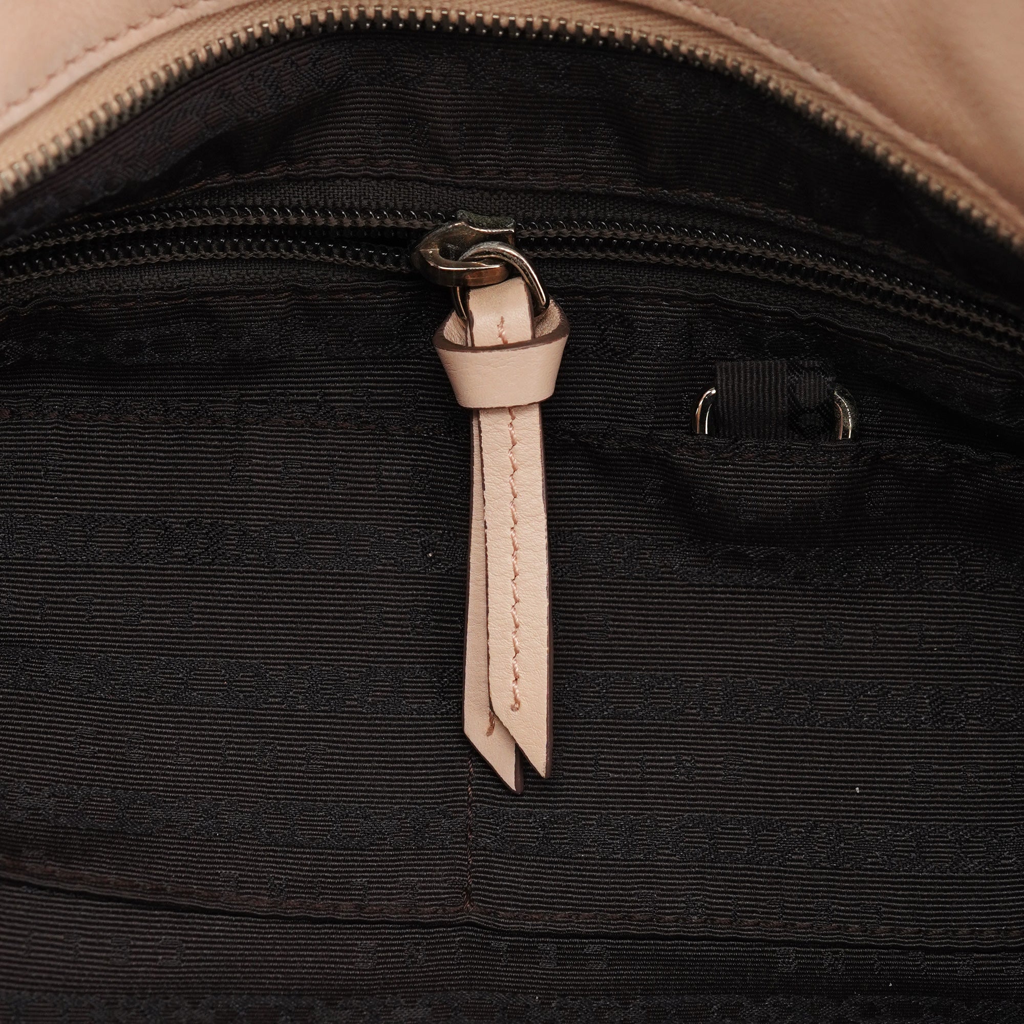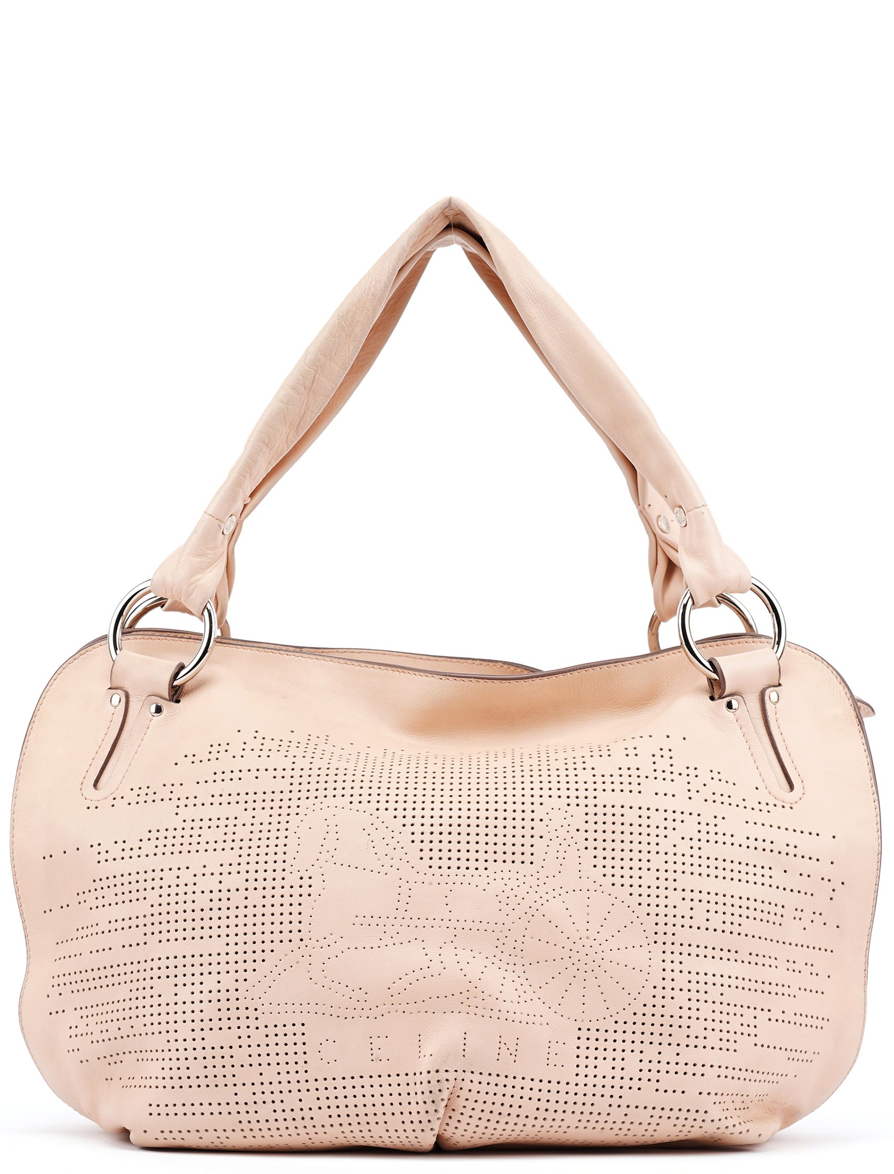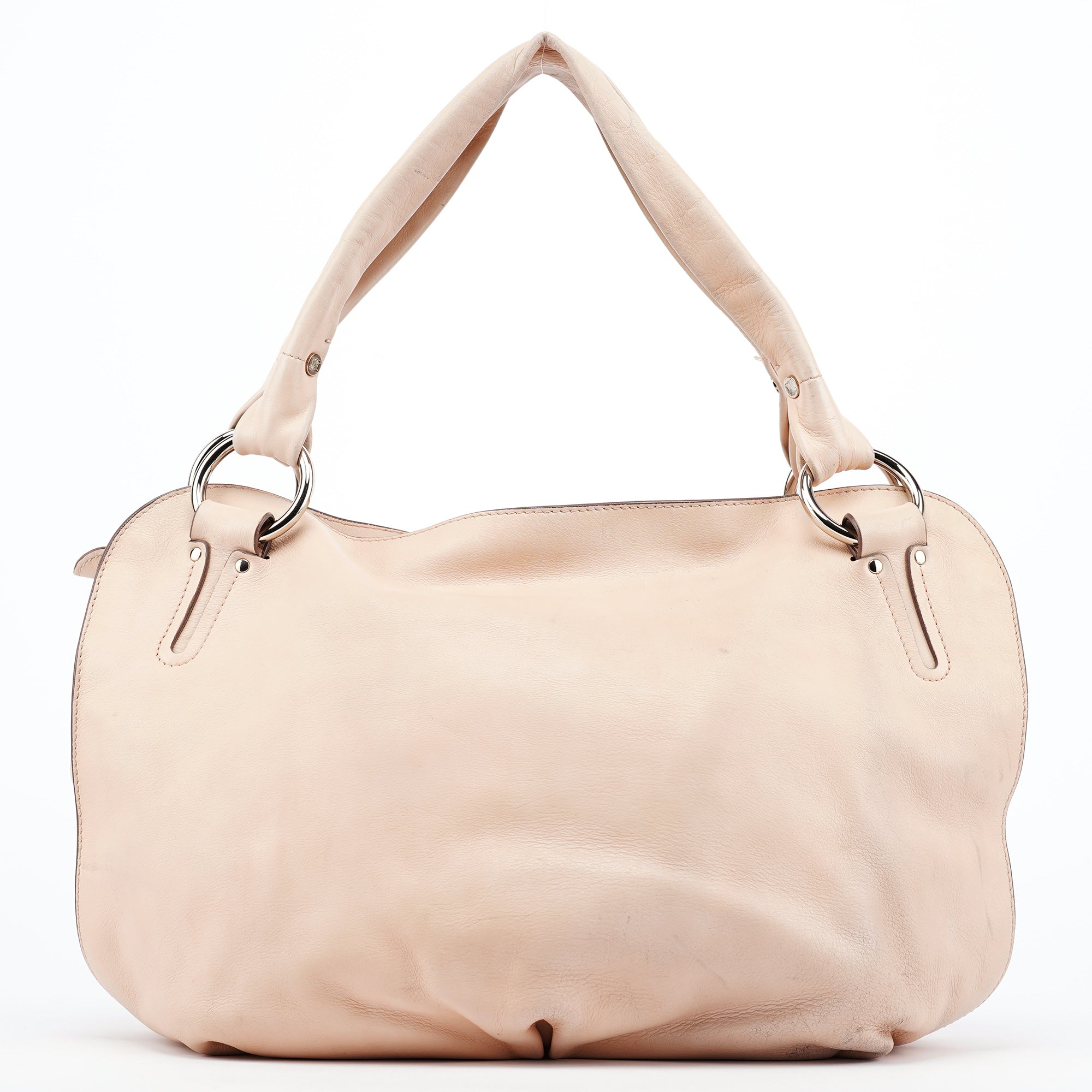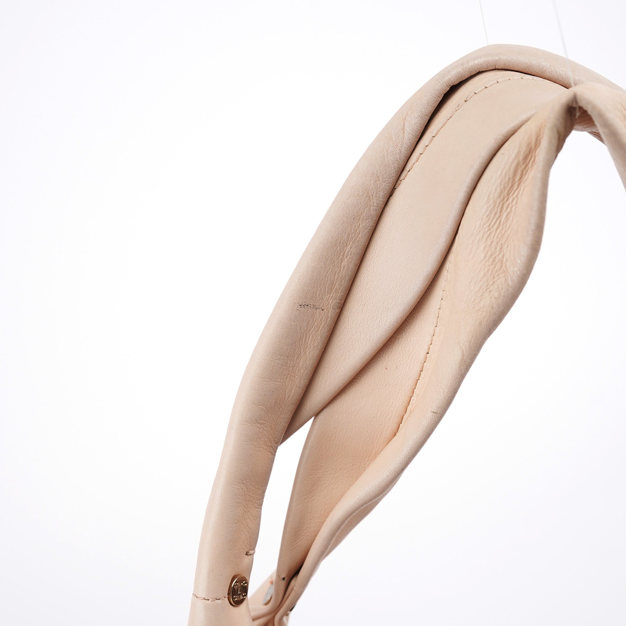 Designed in the early 2000s, this Céline Bittersweet shoulder bag features soft light cream leather with the distinctive gathered silhouette that gave the style its name. The hobo design includes a unique knotted leather handle, silver-tone ring hardware, and a zip closure. The interior is lined in fabric with compartments for organization. The Triomphe logo is perforated on the front.