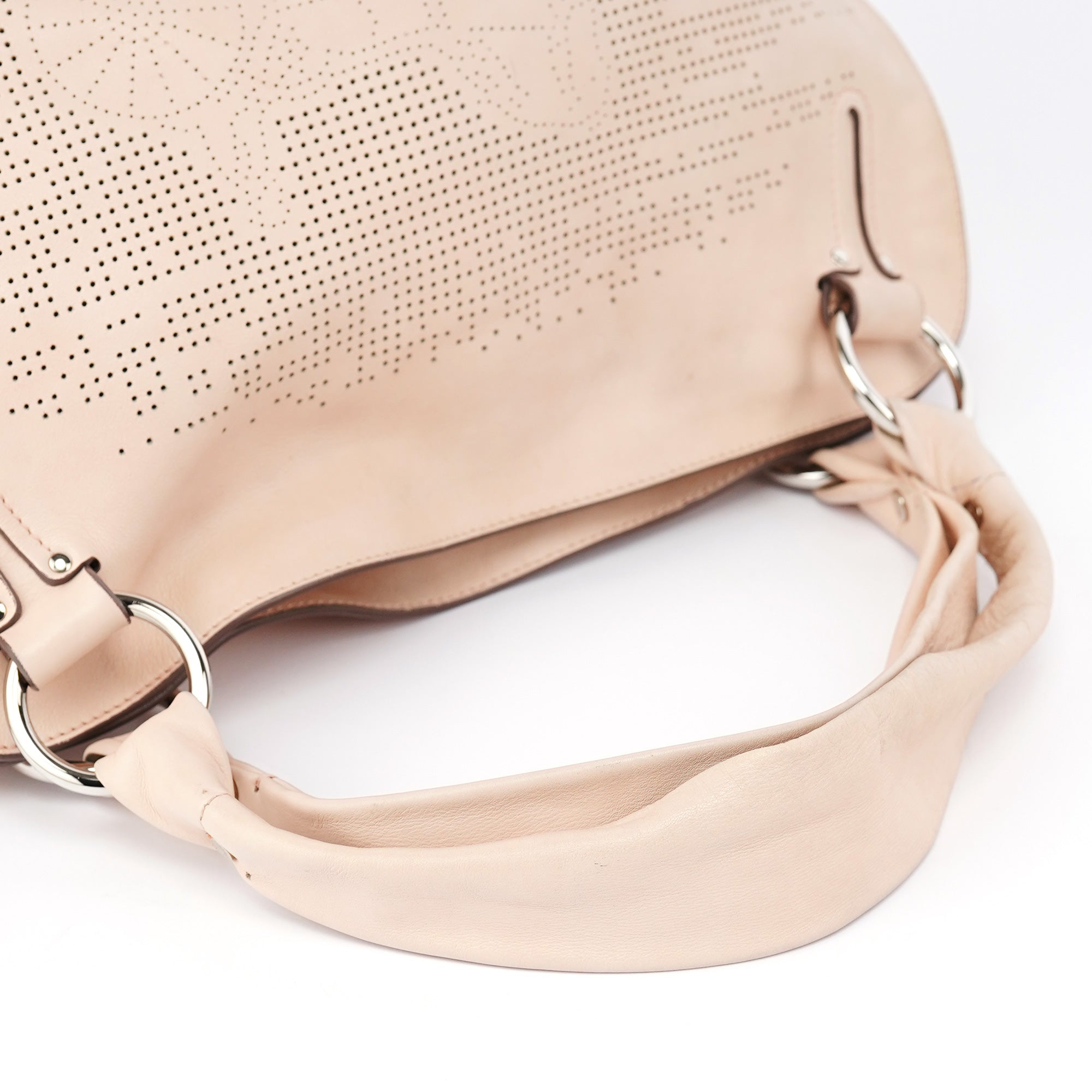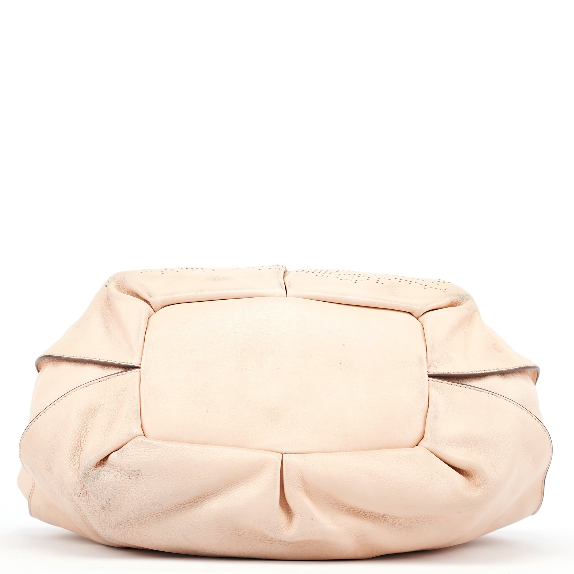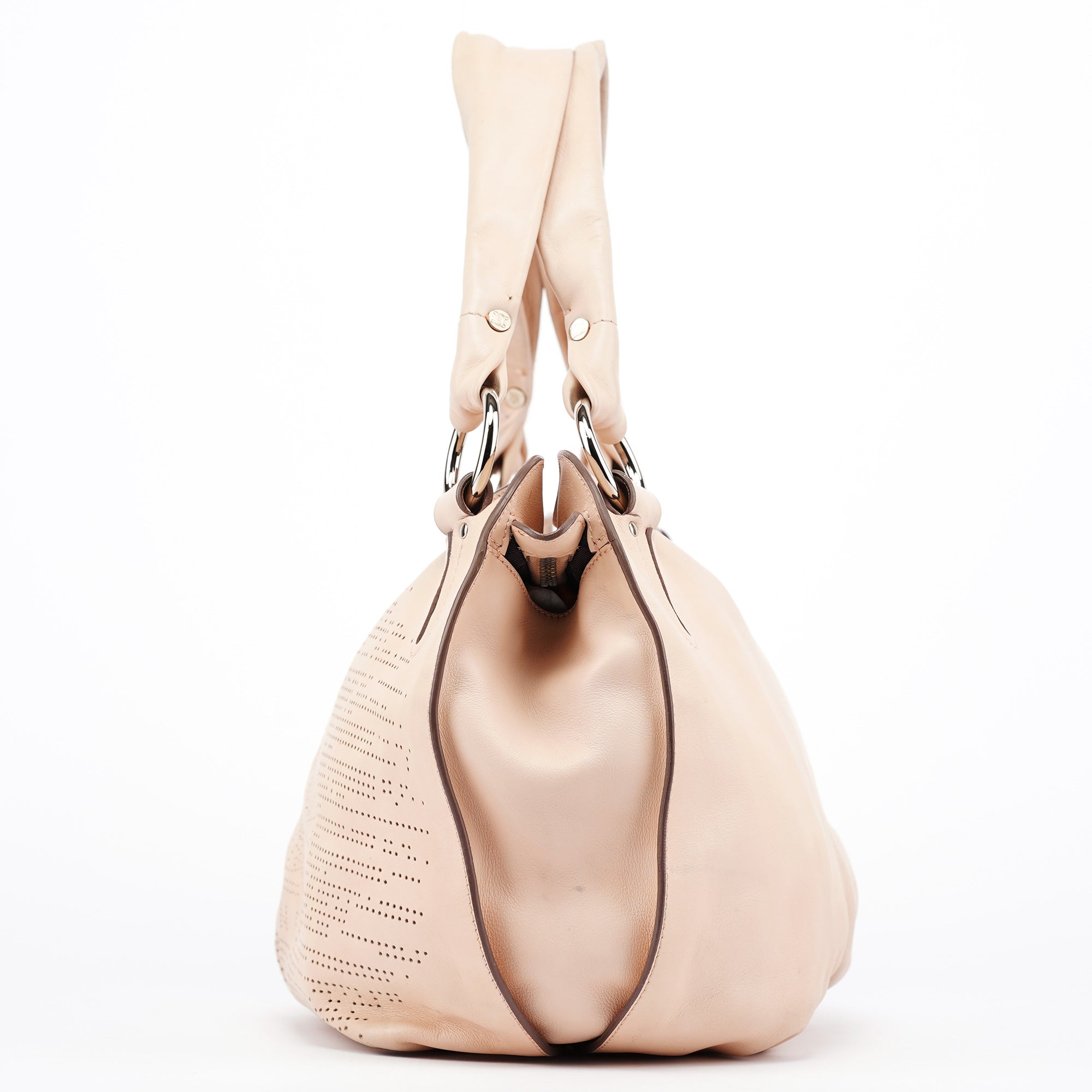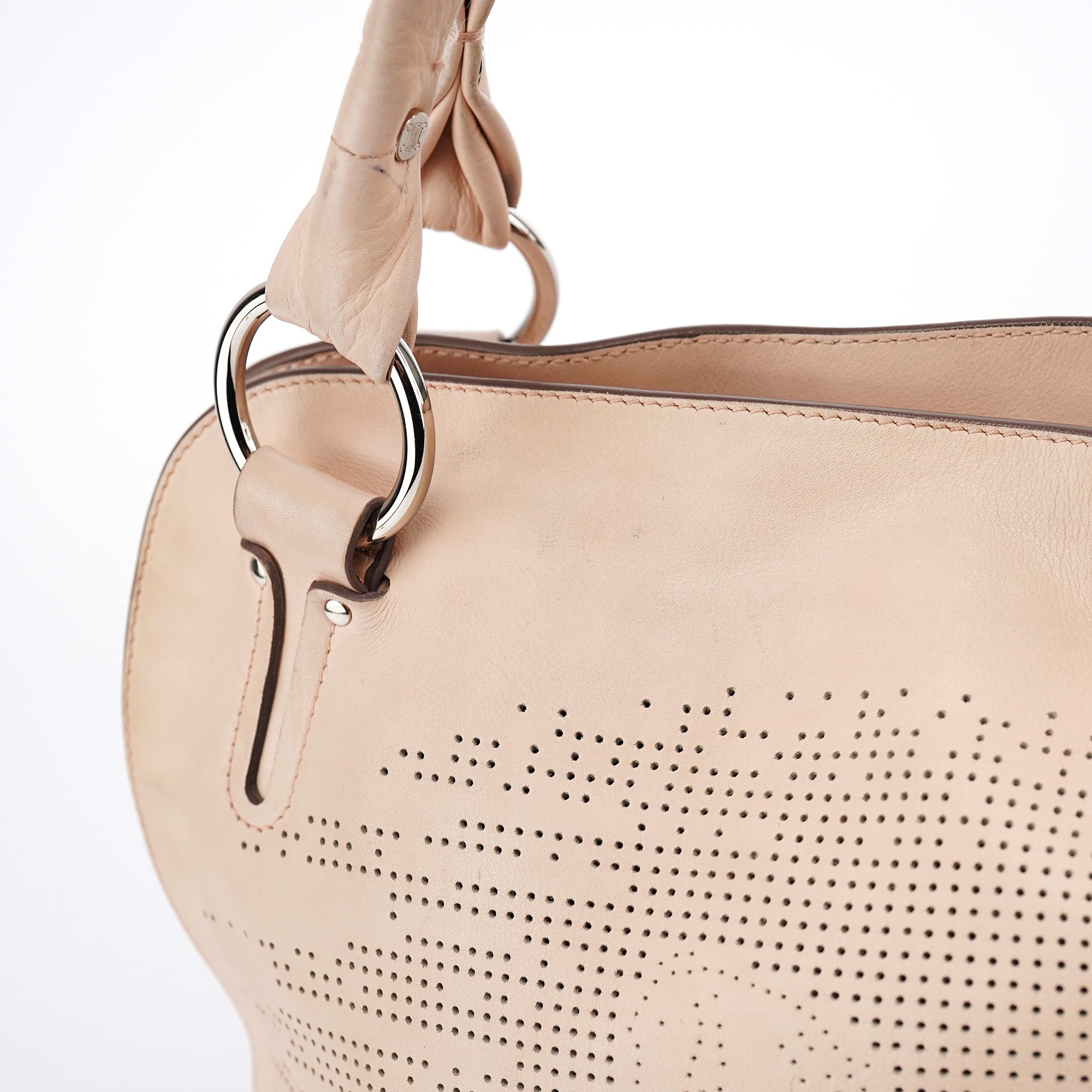 Designed in the early 2000s, this Céline Bittersweet shoulder bag features soft light cream leather with the distinctive gathered silhouette that gave the style its name. The hobo design includes a unique knotted leather handle, silver-tone ring hardware, and a zip closure. The interior is lined in fabric with compartments for organization. The Triomphe logo is perforated on the front.