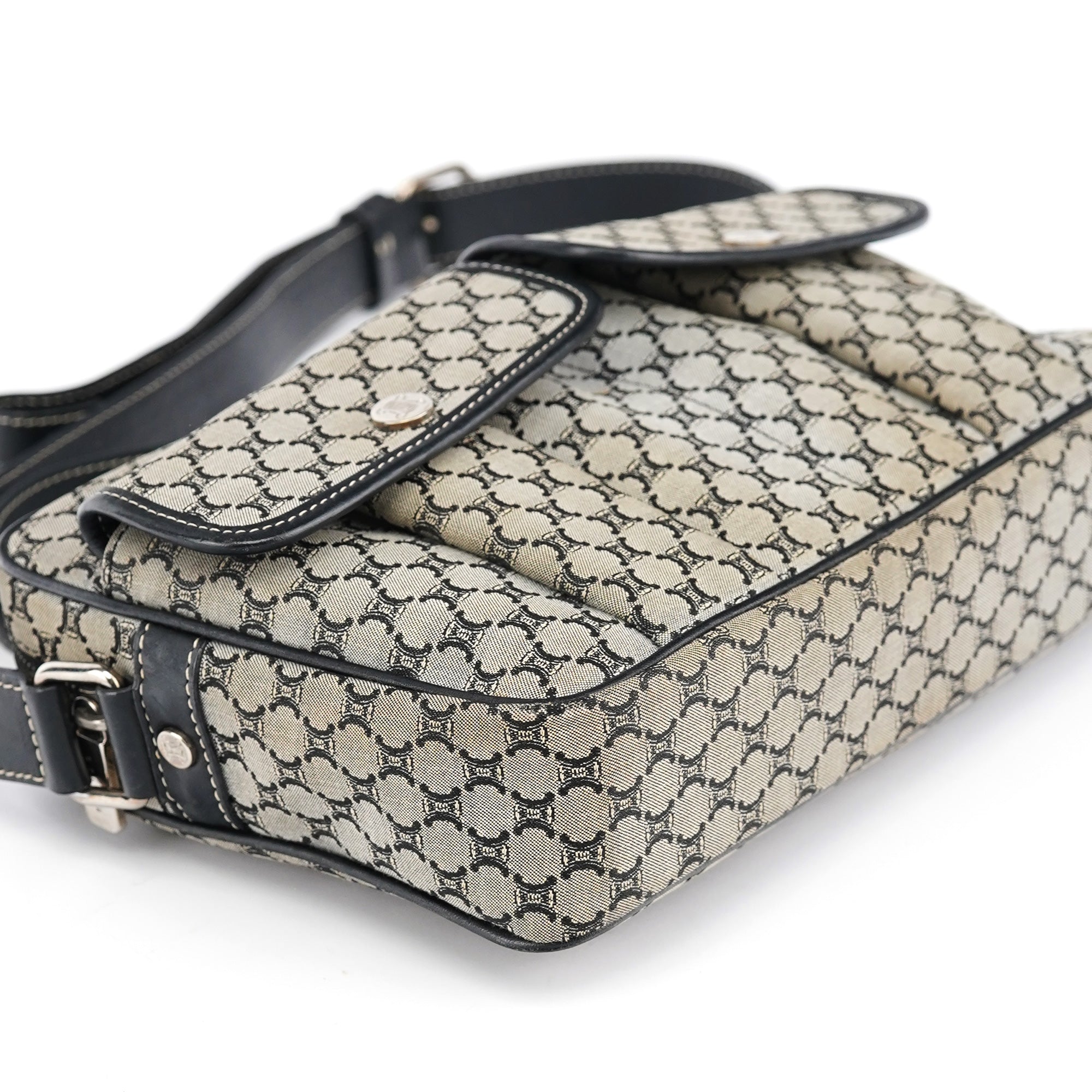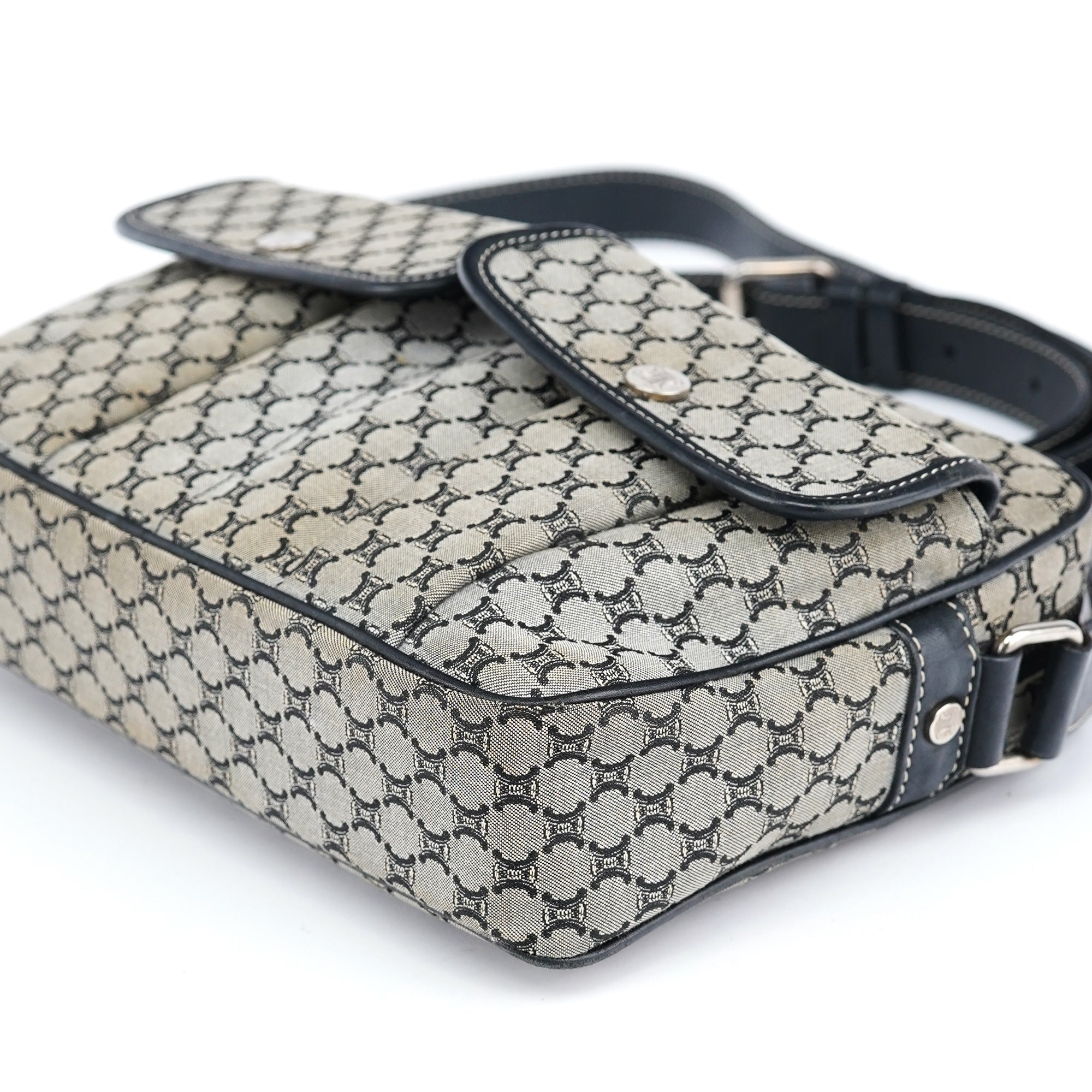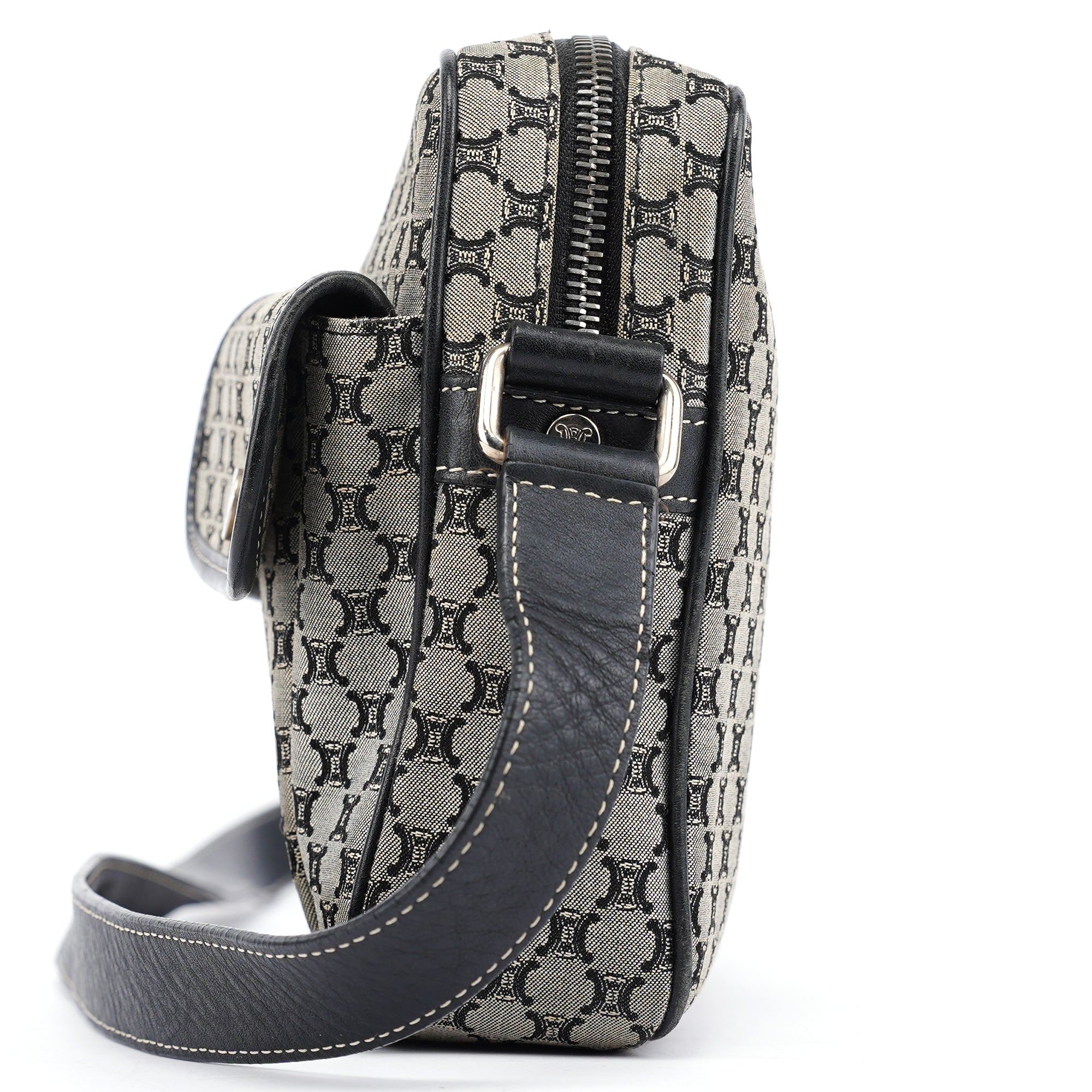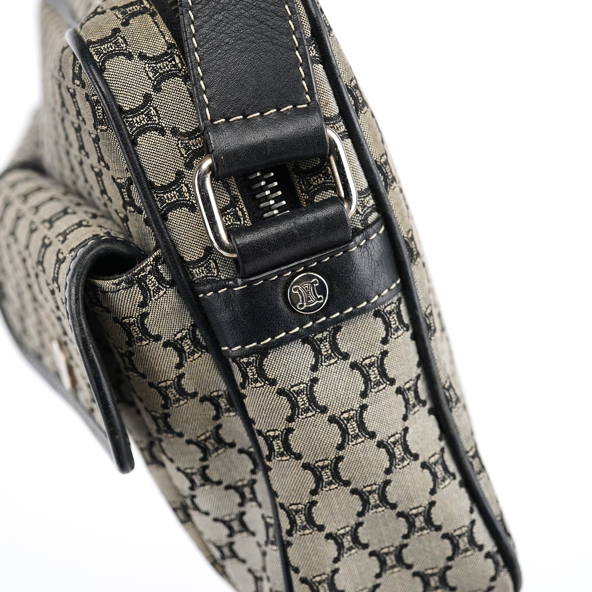 Designed in the early 2000's, this vintage Celine Macadam crossbody bag features grey Macadam monogram canvas with black leather trim. The compact rectangular silhouette includes dual front pockets with snap closures and an adjustable leather shoulder strap. The top zip closure opens to a fabric-lined interior for practical storage.