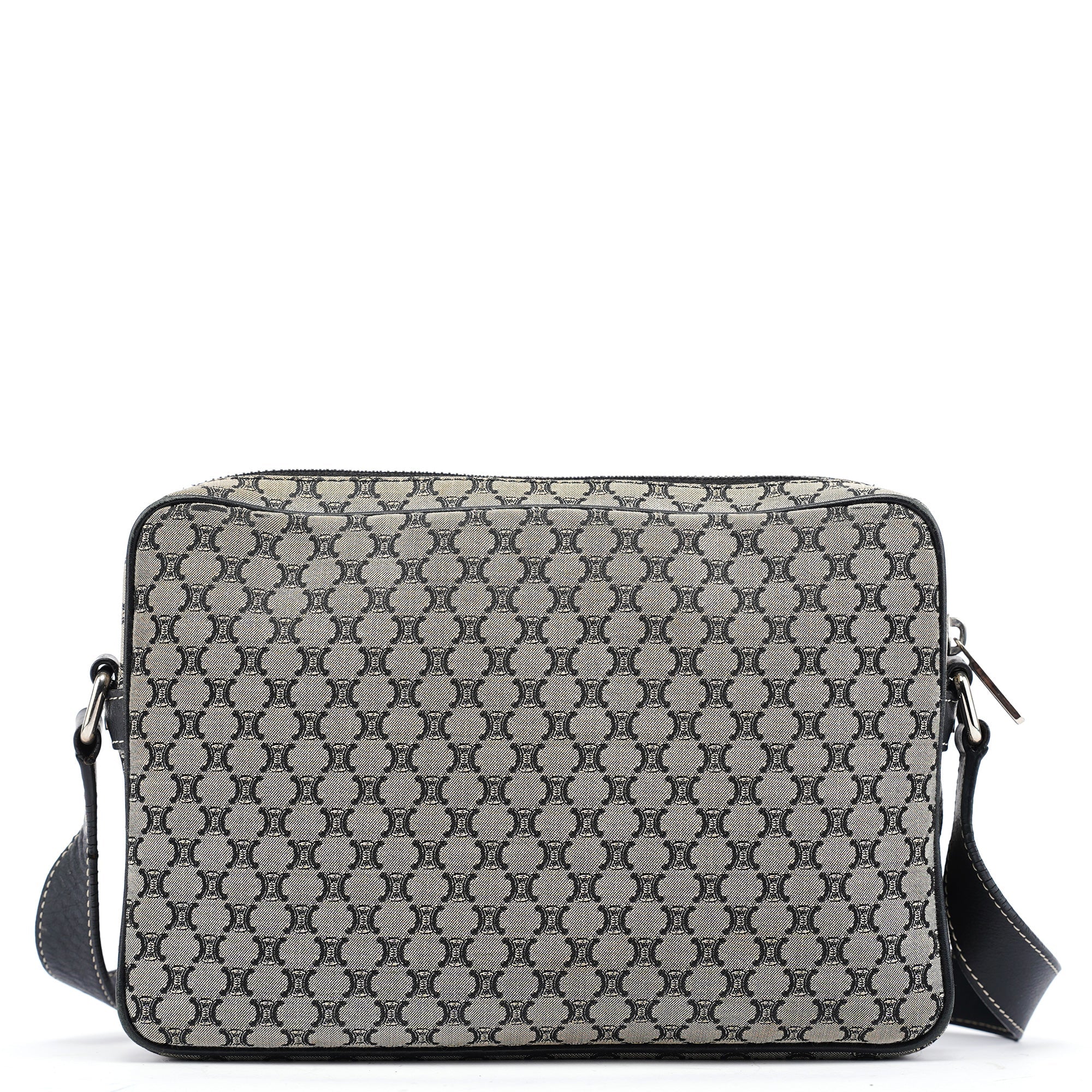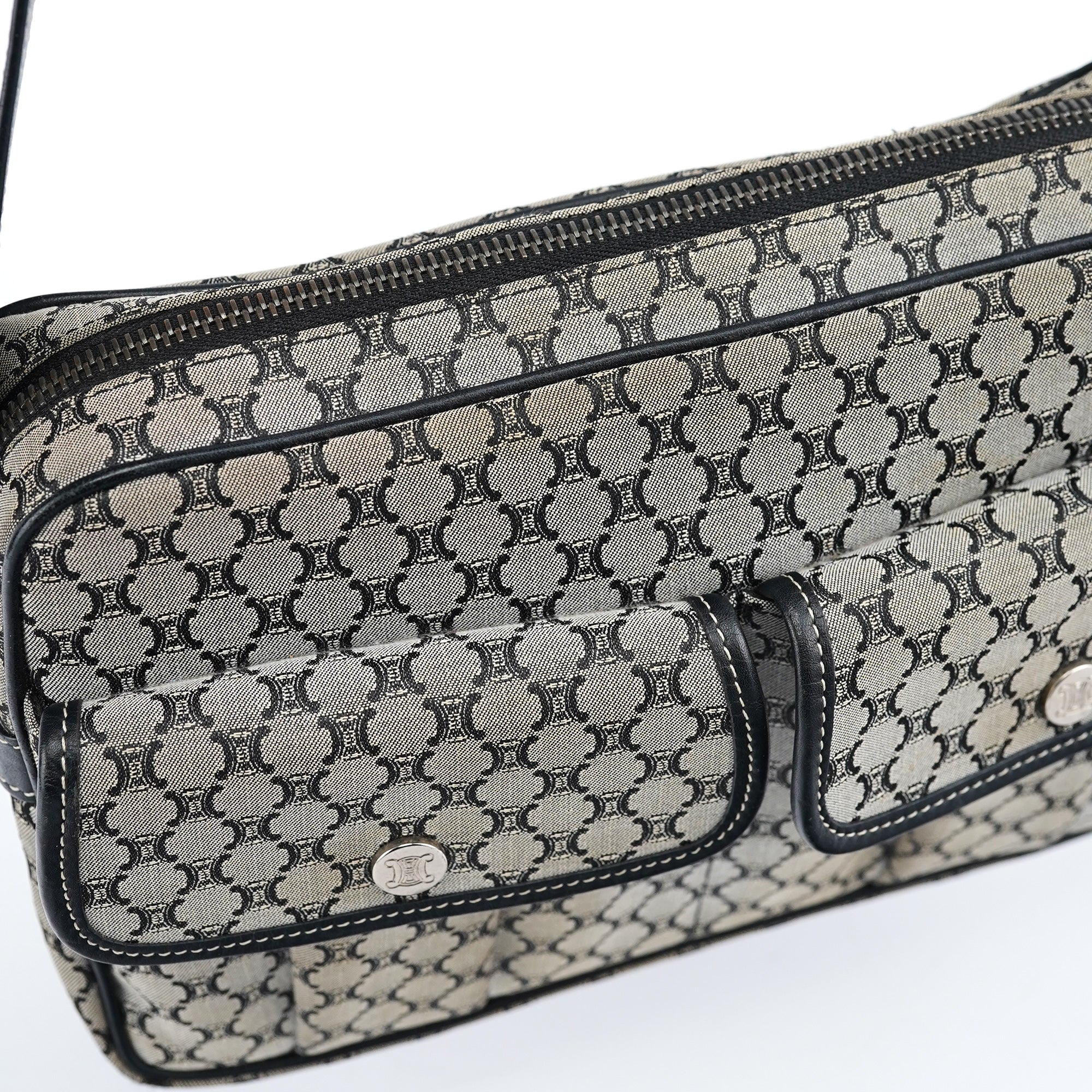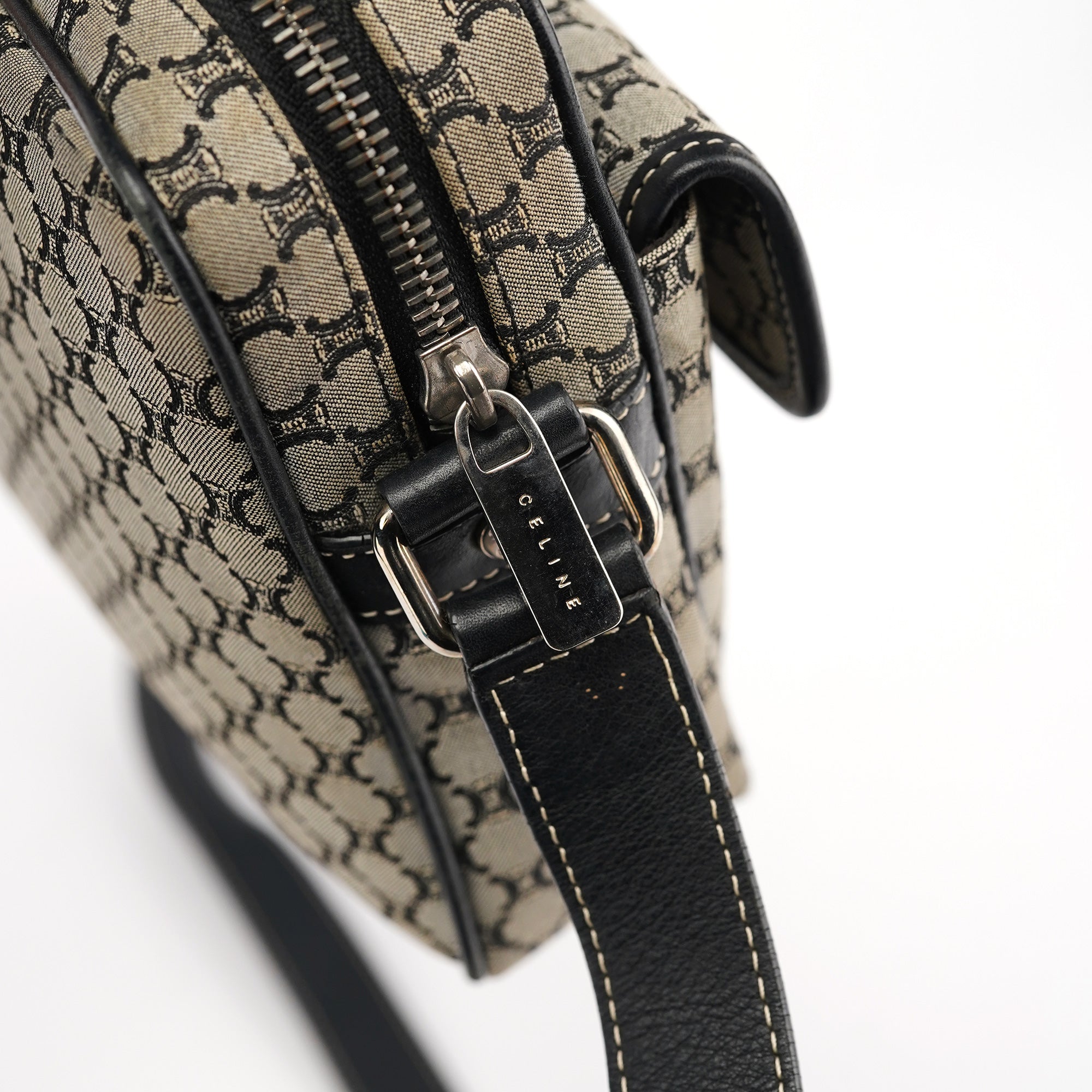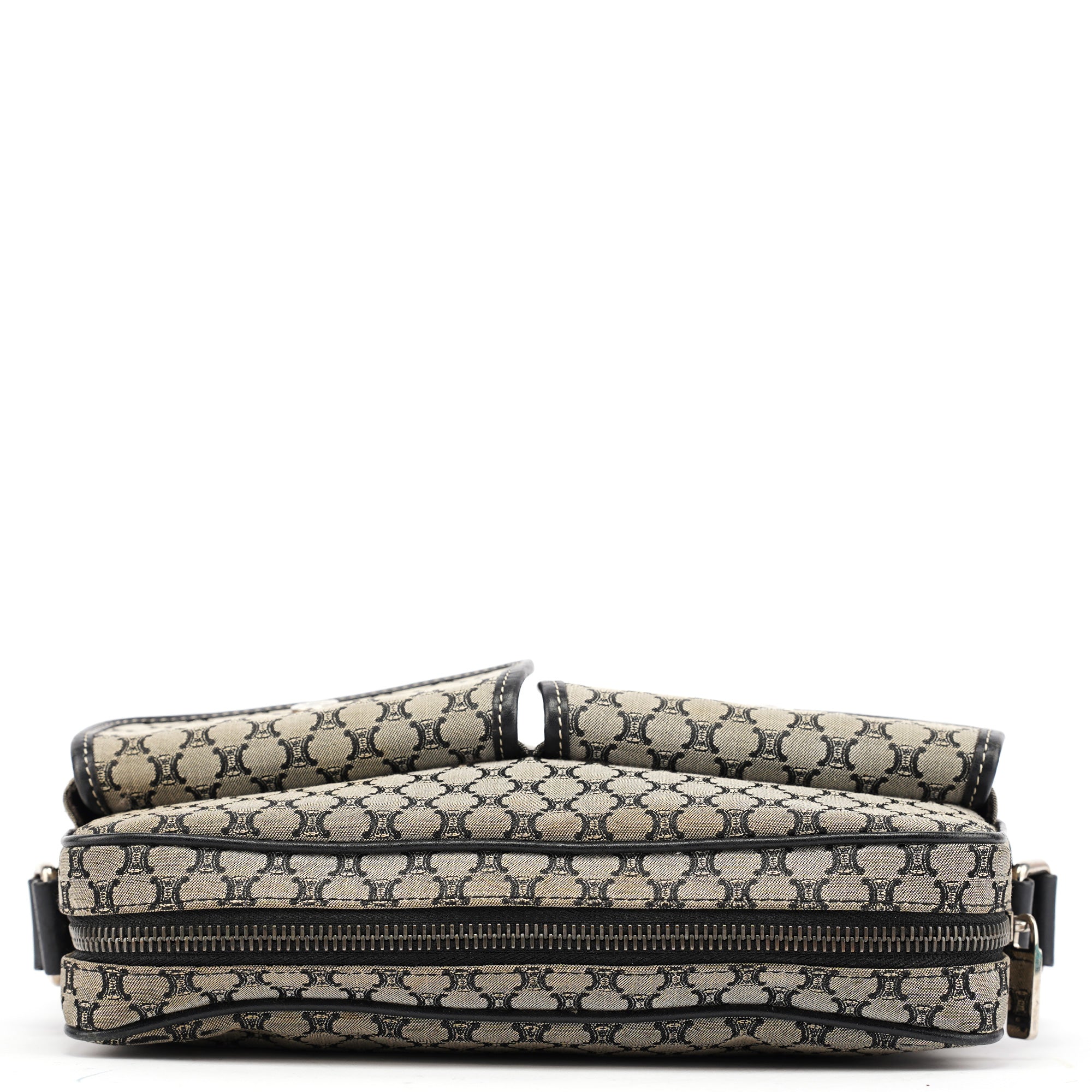 Designed in the early 2000's, this vintage Celine Macadam crossbody bag features grey Macadam monogram canvas with black leather trim. The compact rectangular silhouette includes dual front pockets with snap closures and an adjustable leather shoulder strap. The top zip closure opens to a fabric-lined interior for practical storage.