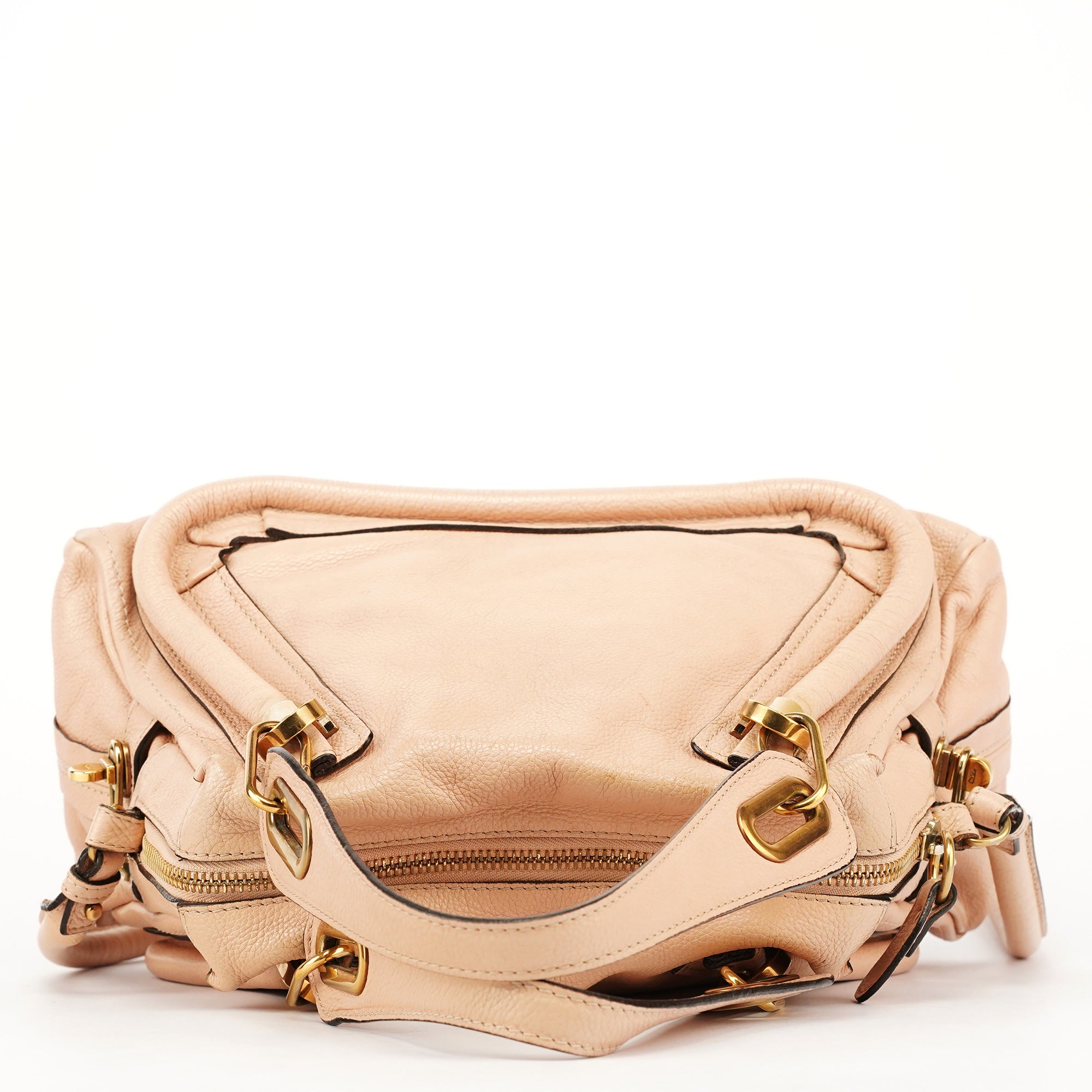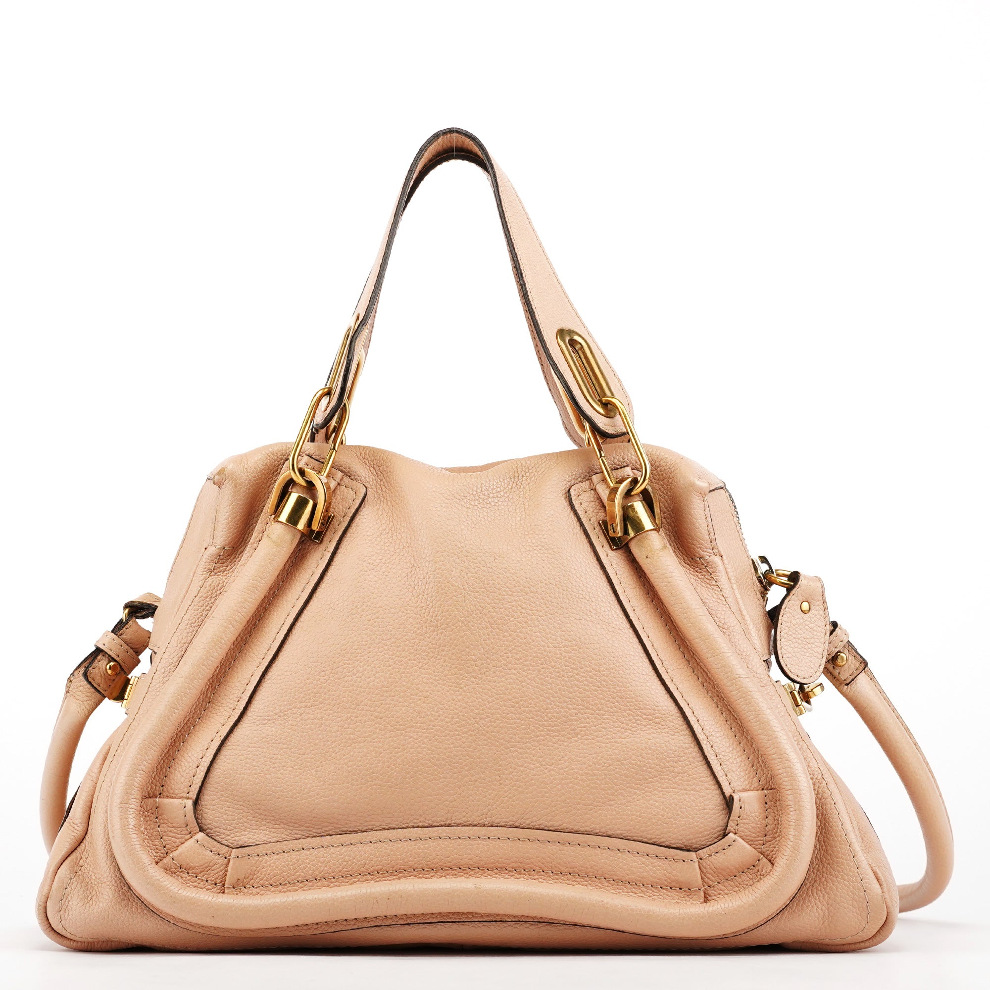 Designed in 2008 by Hannah MacGibbon, this Chloé Paraty in cream leather features the model’s signature sculpted side panels, gold-tone hardware, braided top handles, and a detachable shoulder strap. The interior is canvas lined with a zip pocket for easy organization.