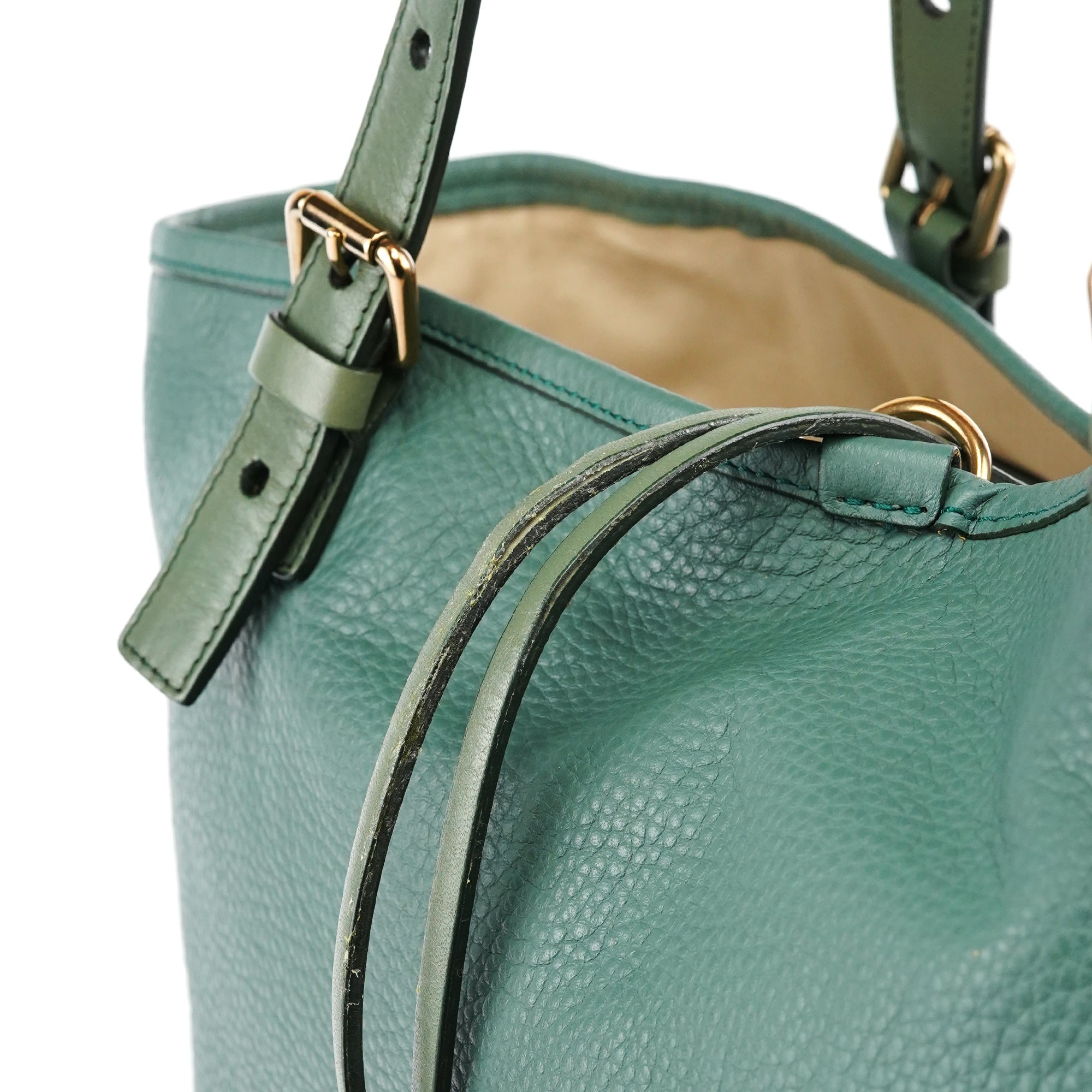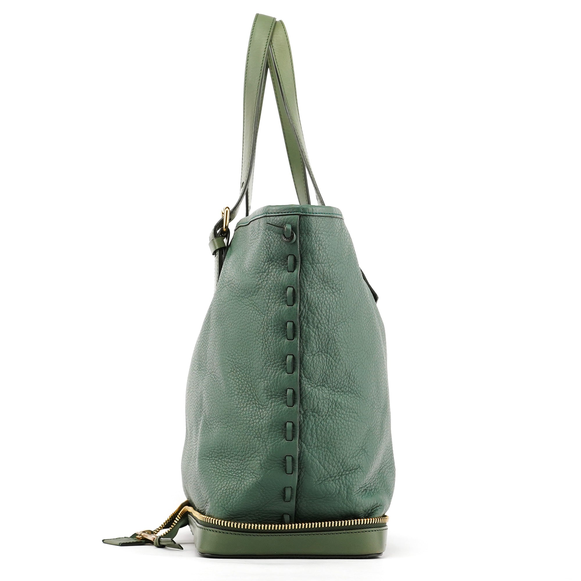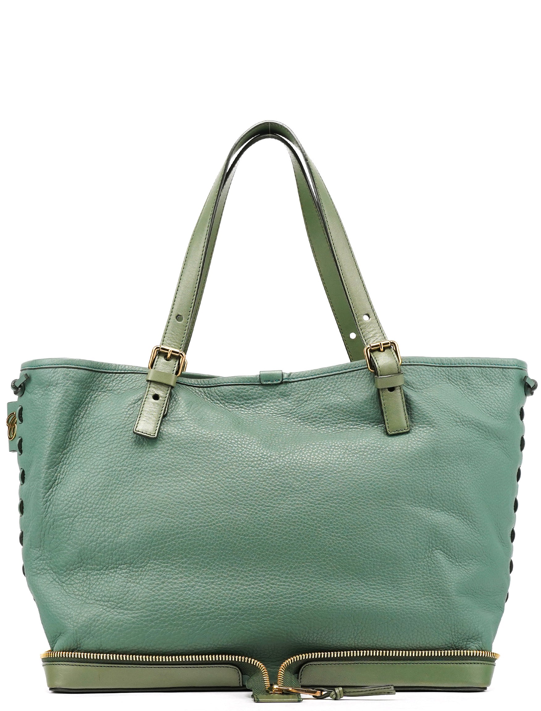 Designed in the 2010s, this Chloé zippered tote is crafted from emerald green calfskin leather with a softly structured silhouette. The design features dual adjustable shoulder straps, gold-tone hardware, a full zip closure, and a spacious fabric-lined interior for everyday use.