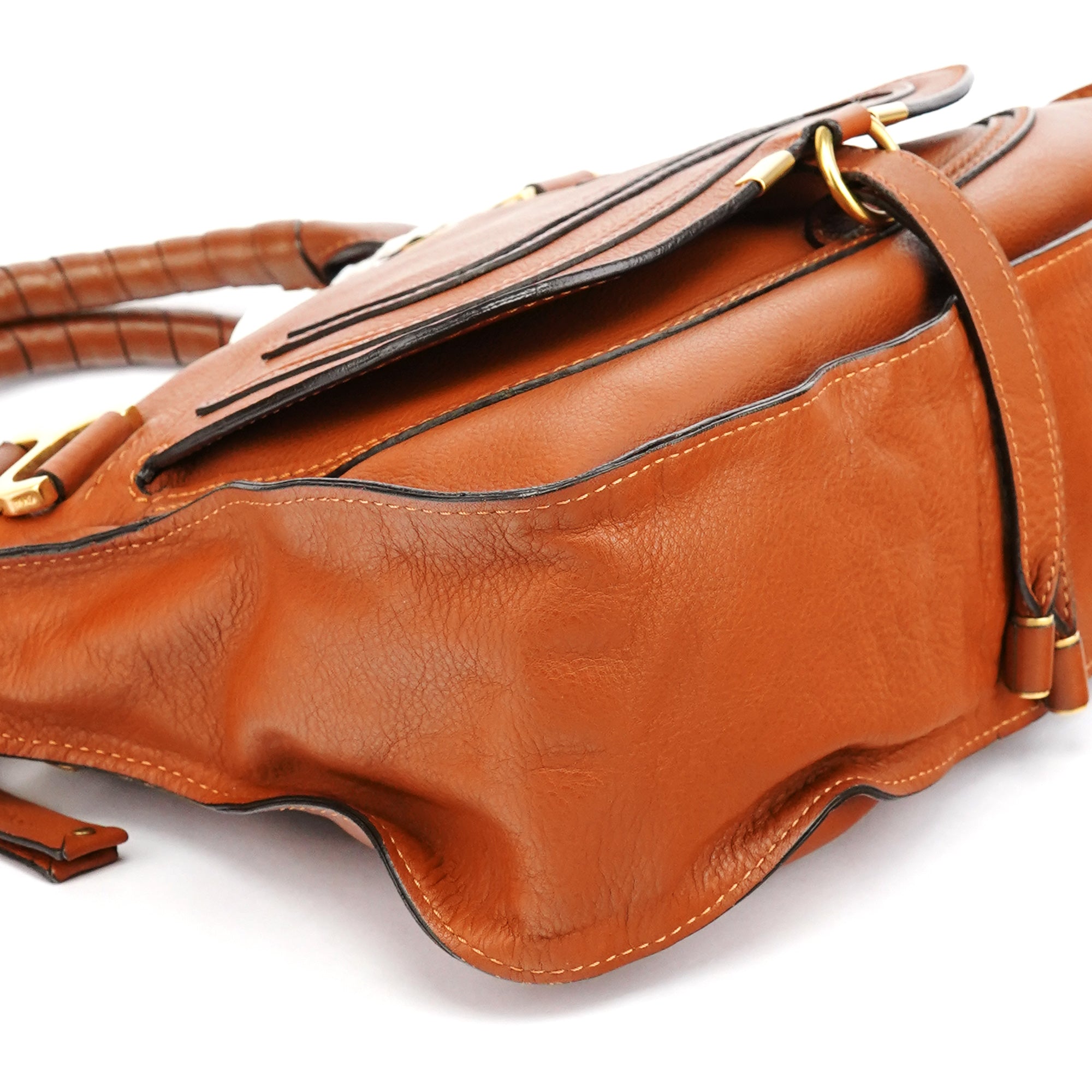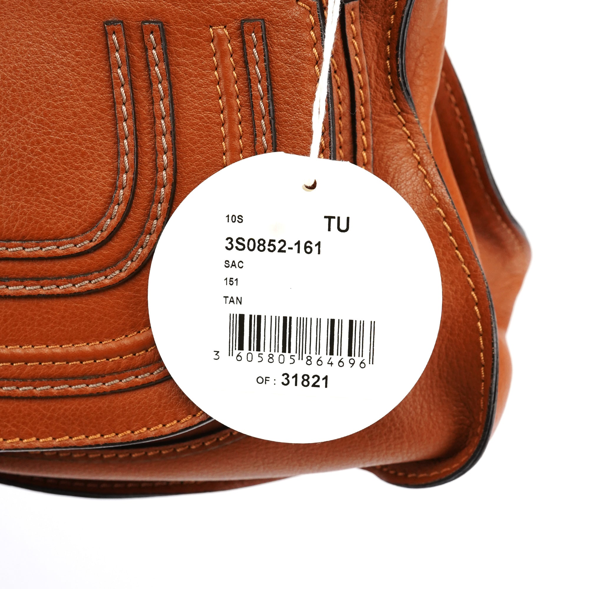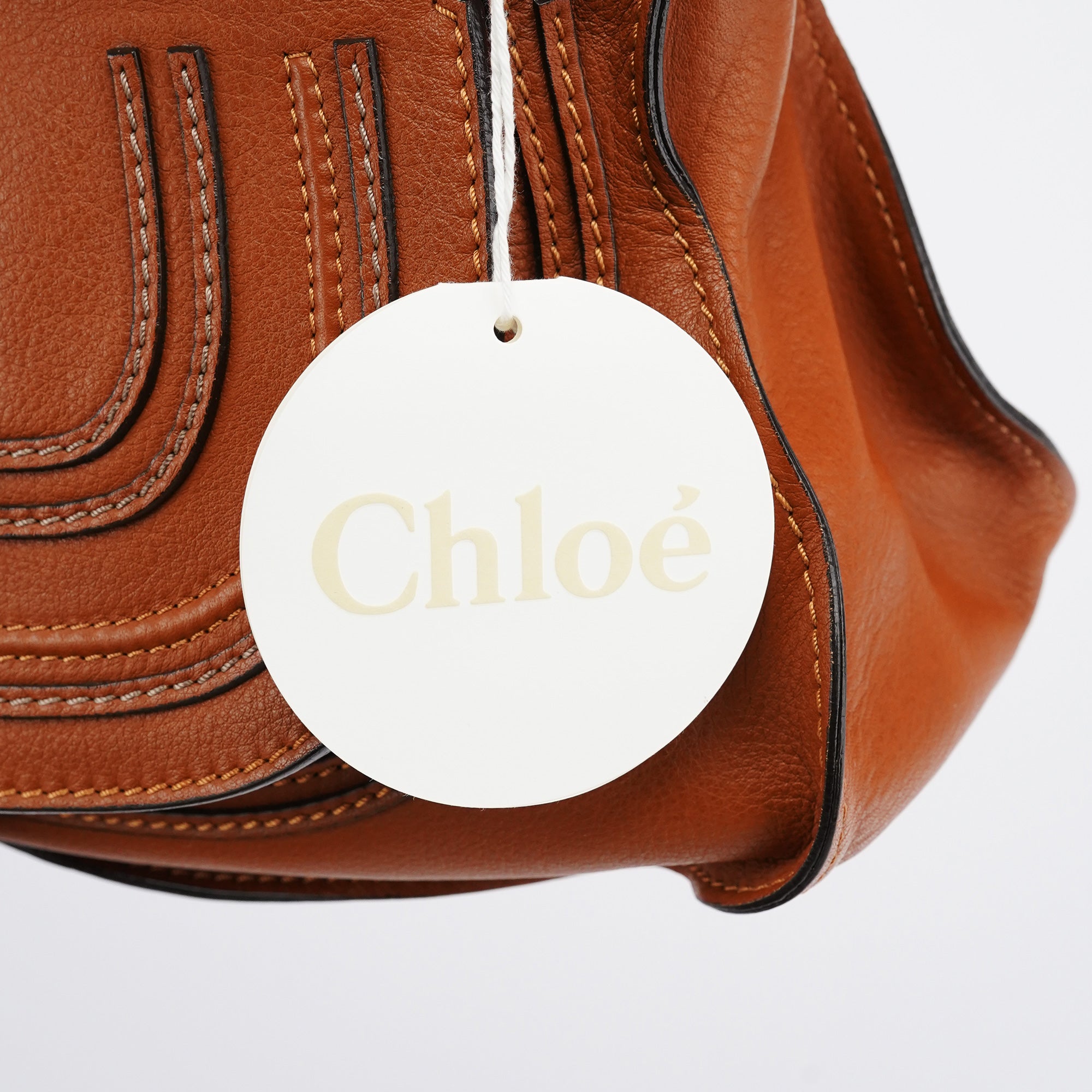 Designed in 2010 by Hannah MacGibbon, this vintage Chloé Marcie shoulder bag showcases the model's signature saddle-stitched detailing in tan pebbled leather. The distinctive curved front pocket features decorative stitching, while the spacious silhouette includes wrapped leather handles with gold-tone hardware and comfortable shoulder strap length.