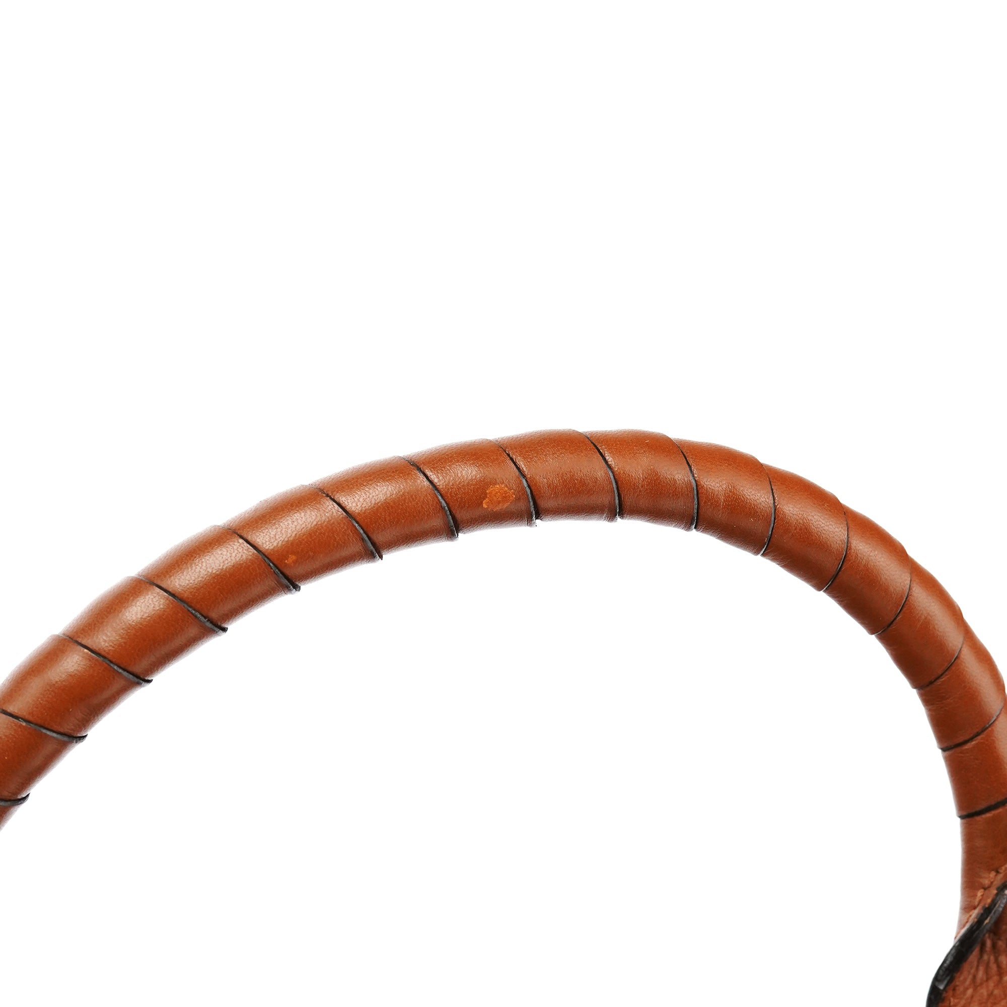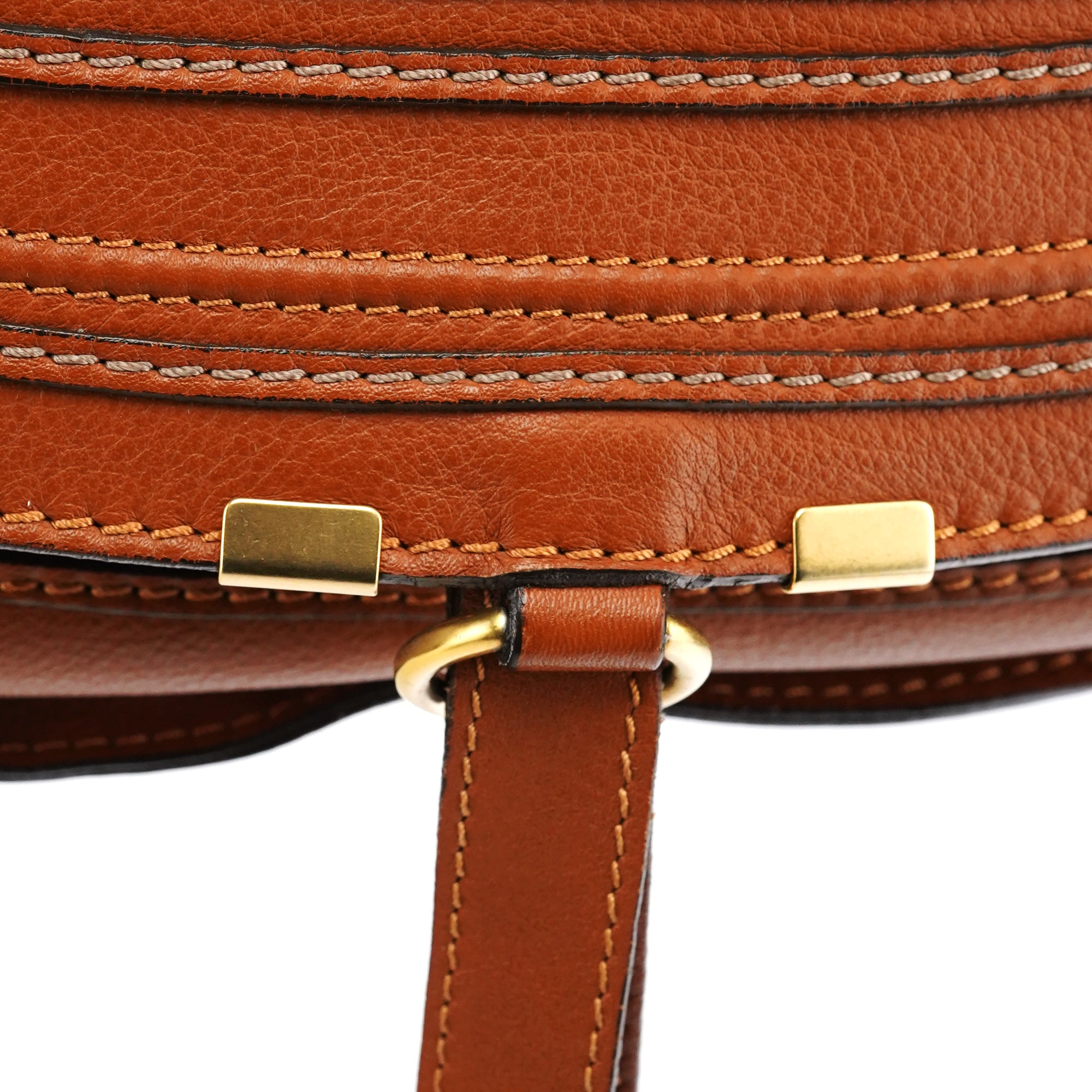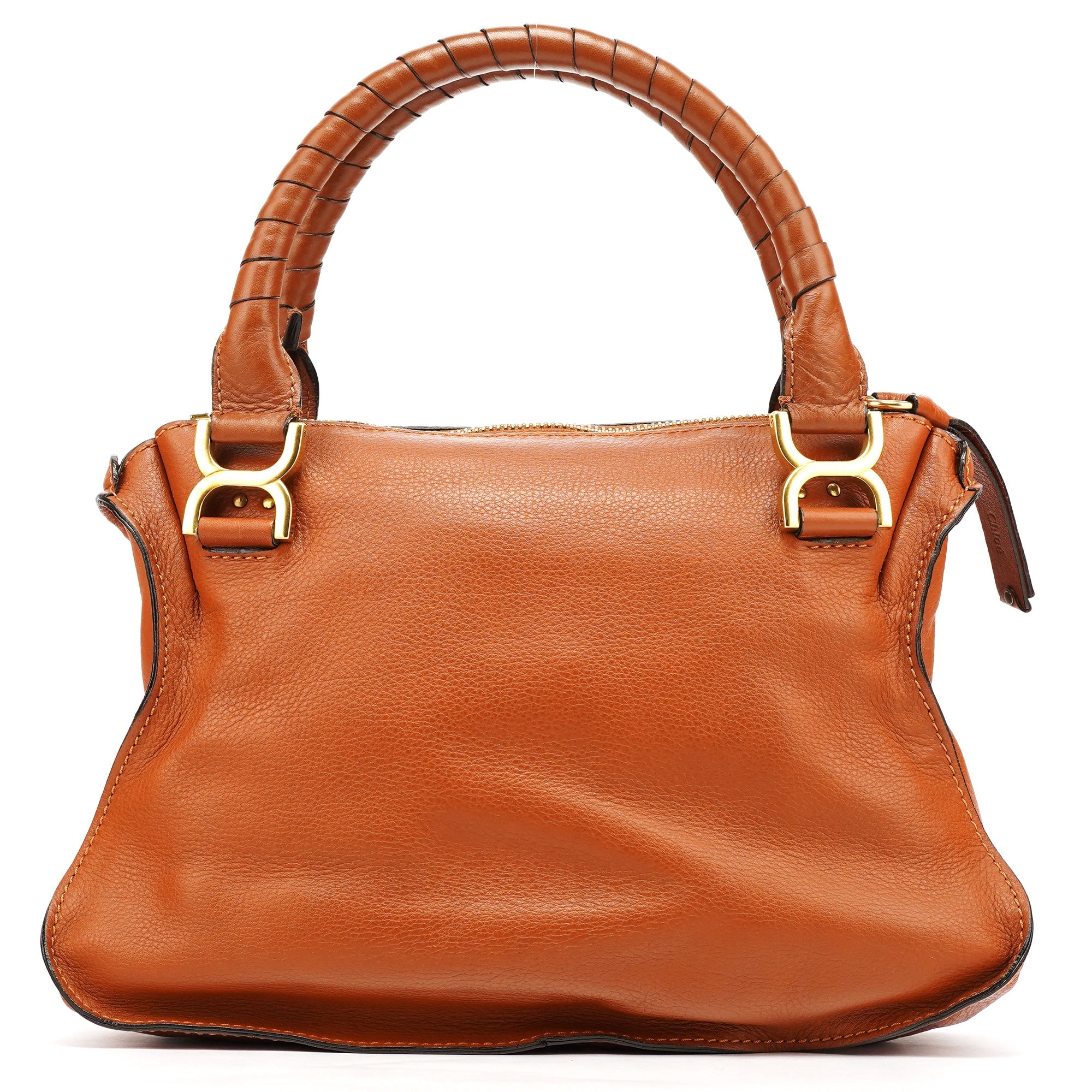 Designed in 2010 by Hannah MacGibbon, this vintage Chloé Marcie shoulder bag showcases the model's signature saddle-stitched detailing in tan pebbled leather. The distinctive curved front pocket features decorative stitching, while the spacious silhouette includes wrapped leather handles with gold-tone hardware and comfortable shoulder strap length.
