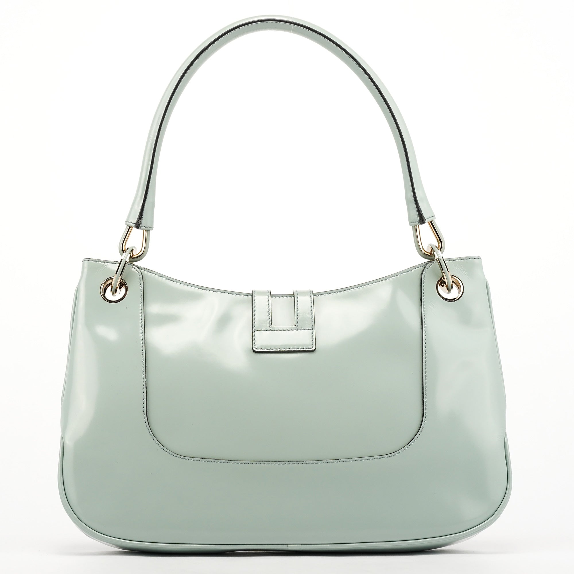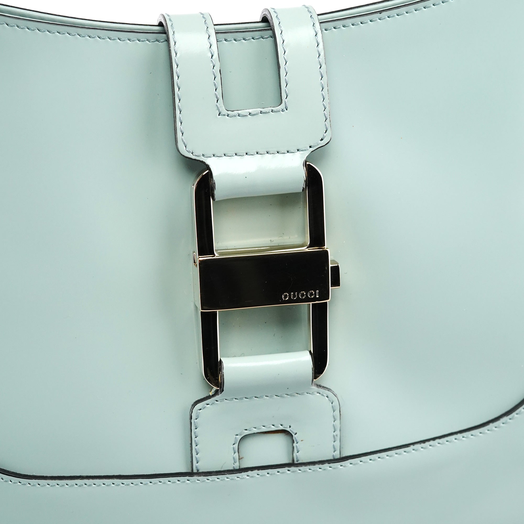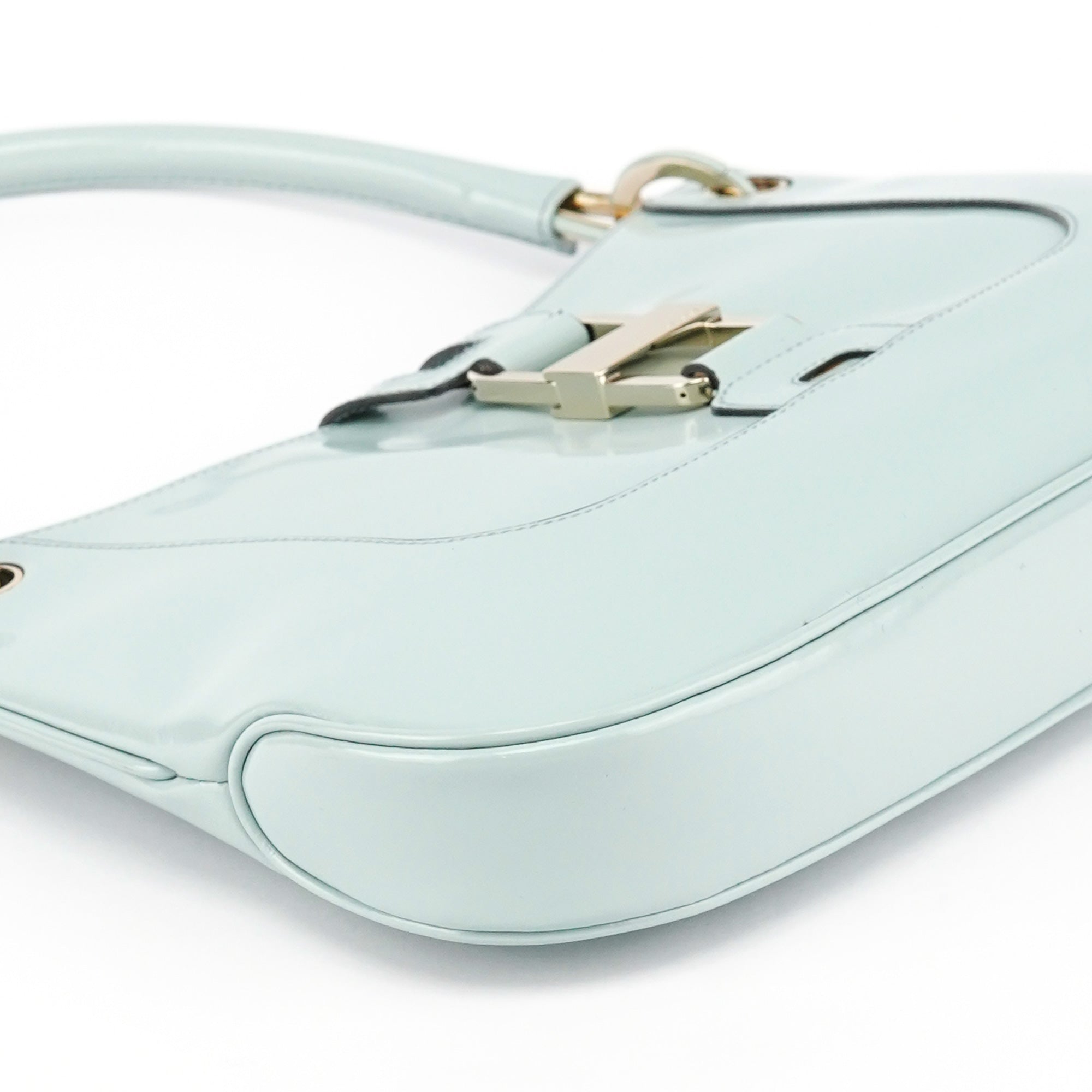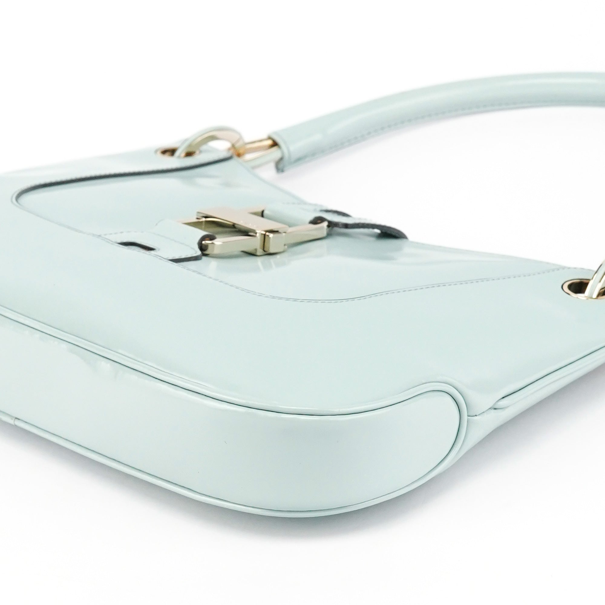 Designed in the early 2000s by Tom Ford, this vintage Gucci Jackie shoulder bag is crafted from light blue patent leather with a sleek, structured silhouette. The design features the signature piston-lock closure, a fixed shoulder strap with gold-tone hardware, and a zip-top interior finished in monogram lining.