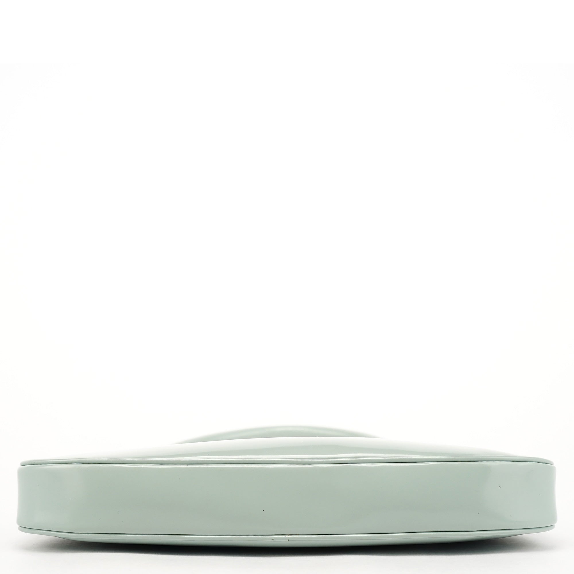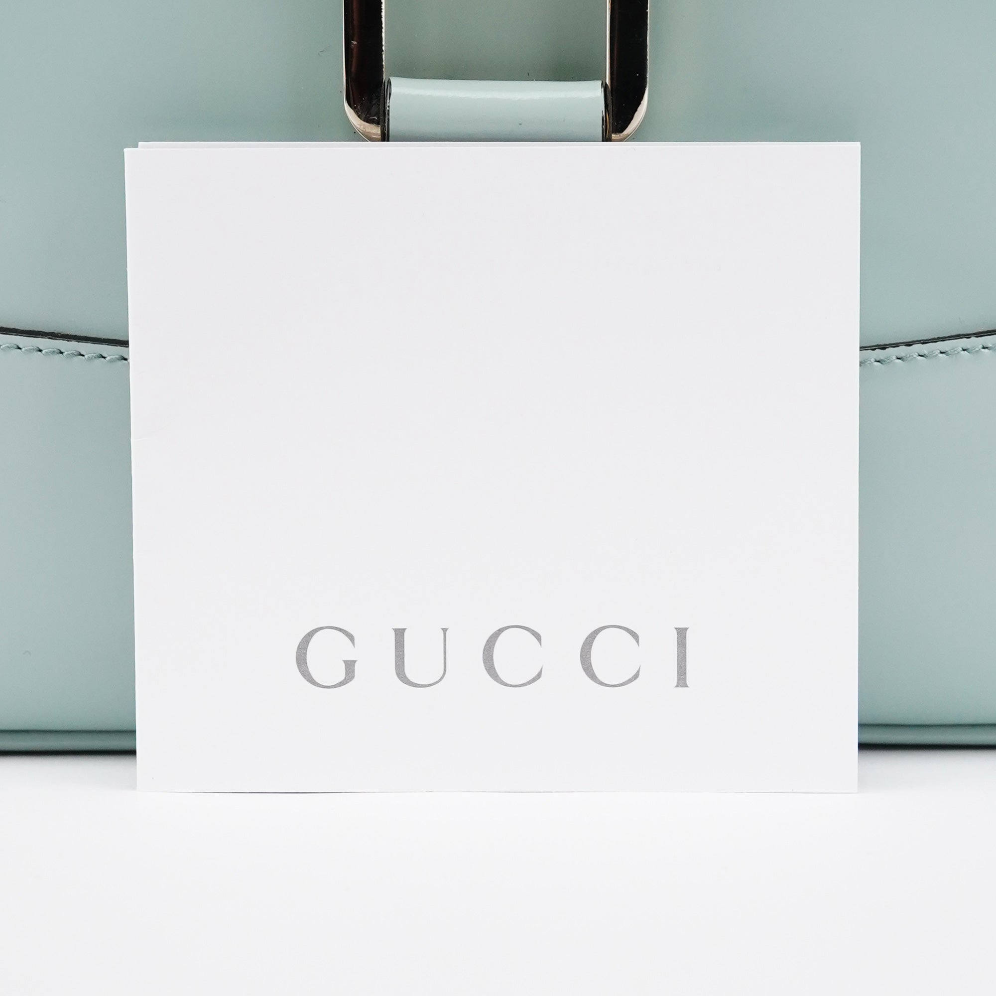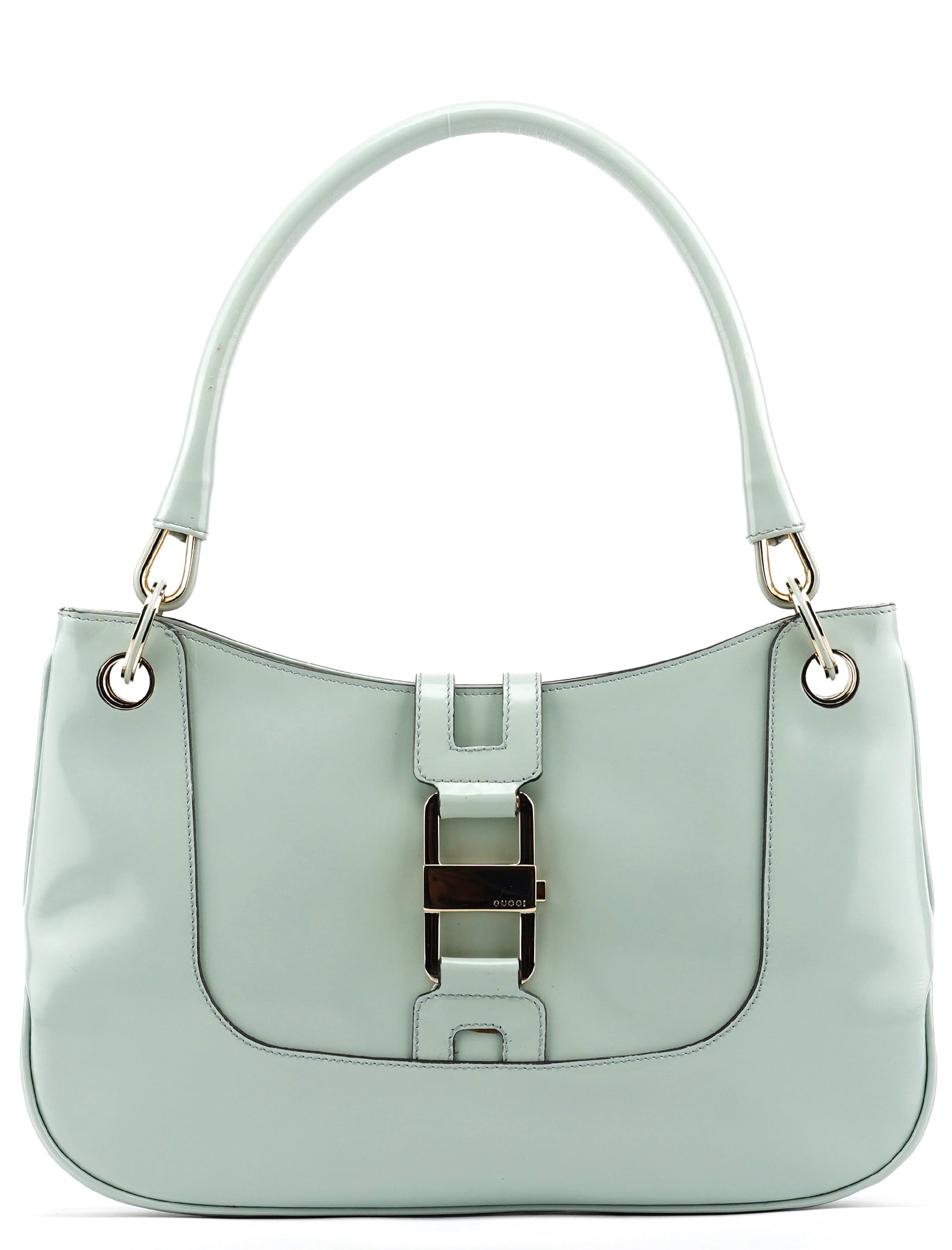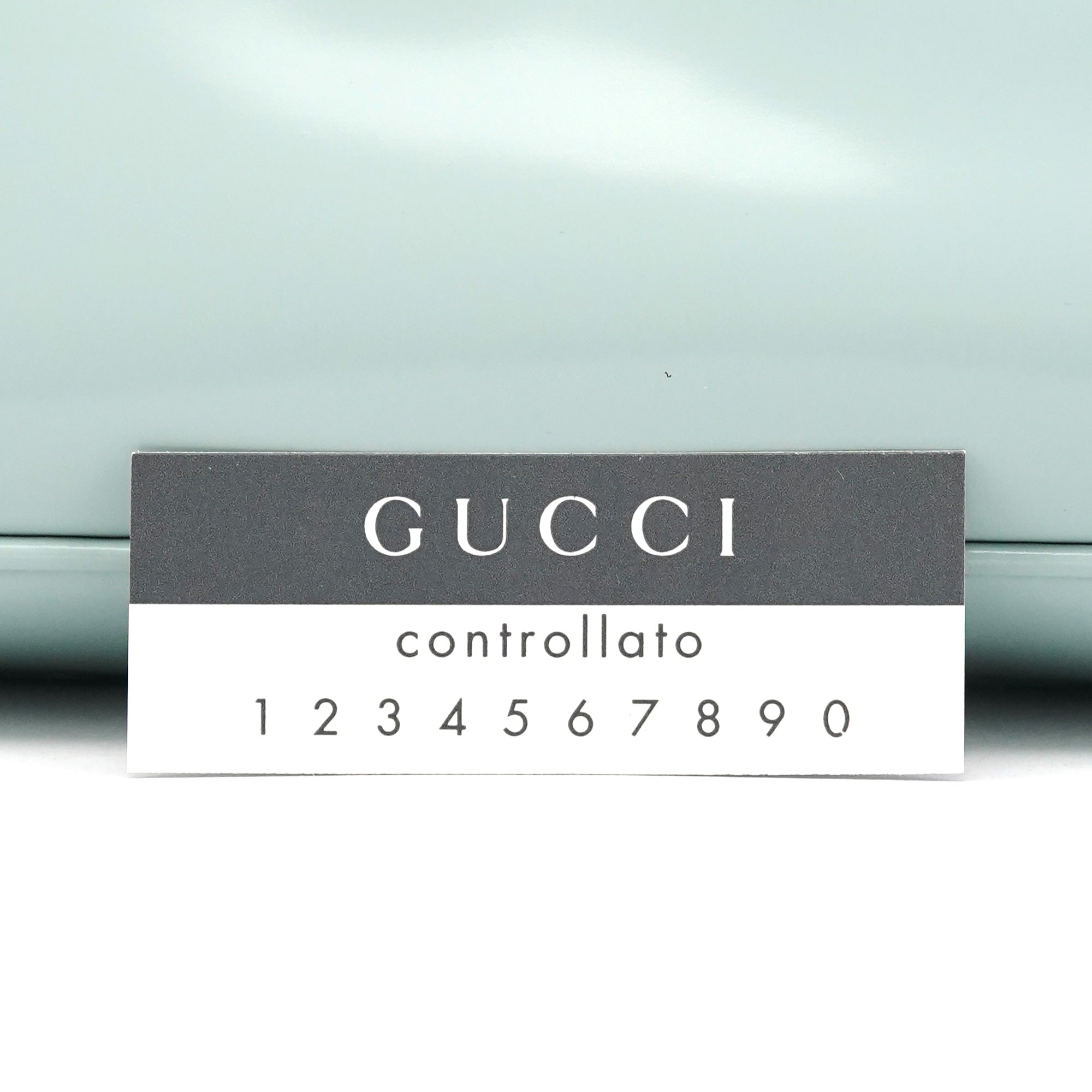 Designed in the early 2000s by Tom Ford, this vintage Gucci Jackie shoulder bag is crafted from light blue patent leather with a sleek, structured silhouette. The design features the signature piston-lock closure, a fixed shoulder strap with gold-tone hardware, and a zip-top interior finished in monogram lining.