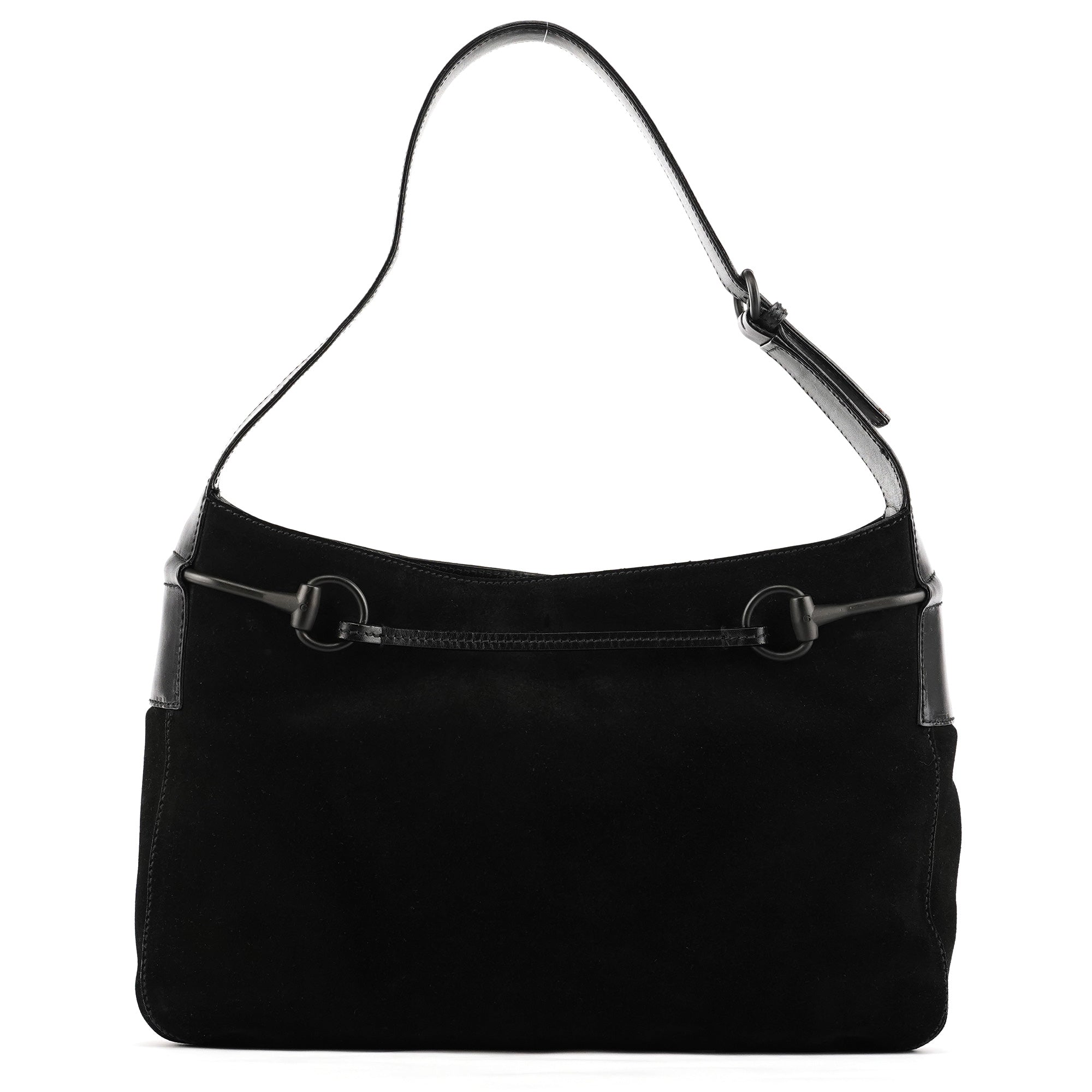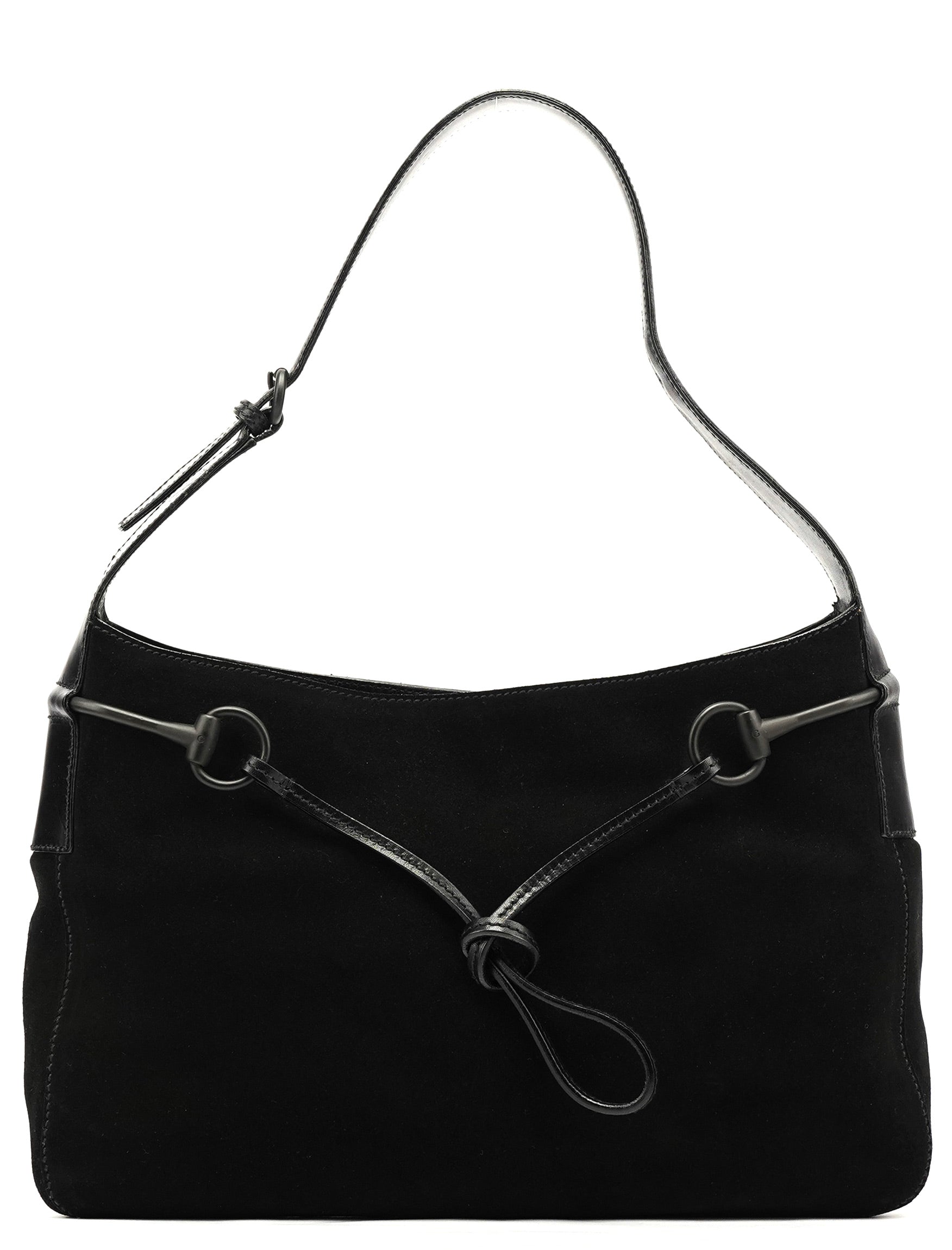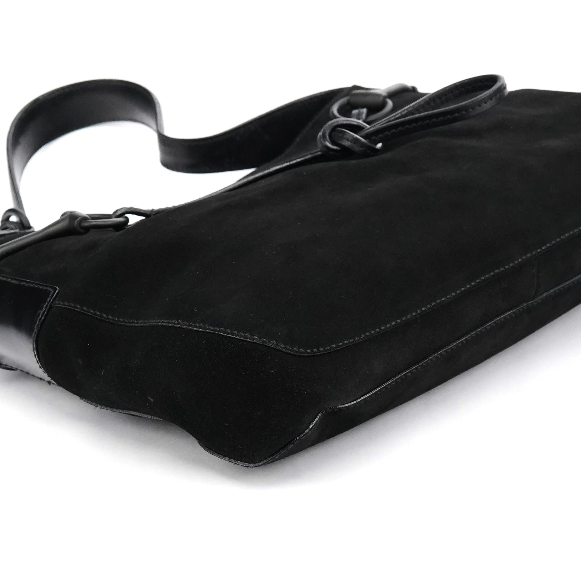 Designed in the early 2000s by Tom Ford, this Gucci Horsebit shoulder bag is crafted in black suede with smooth leather trim and finished with the iconic horsebit detailing across the front. The silhouette features a single shoulder strap, a magnetic top closure, and a GG-monogram satin interior with a zip pocket.