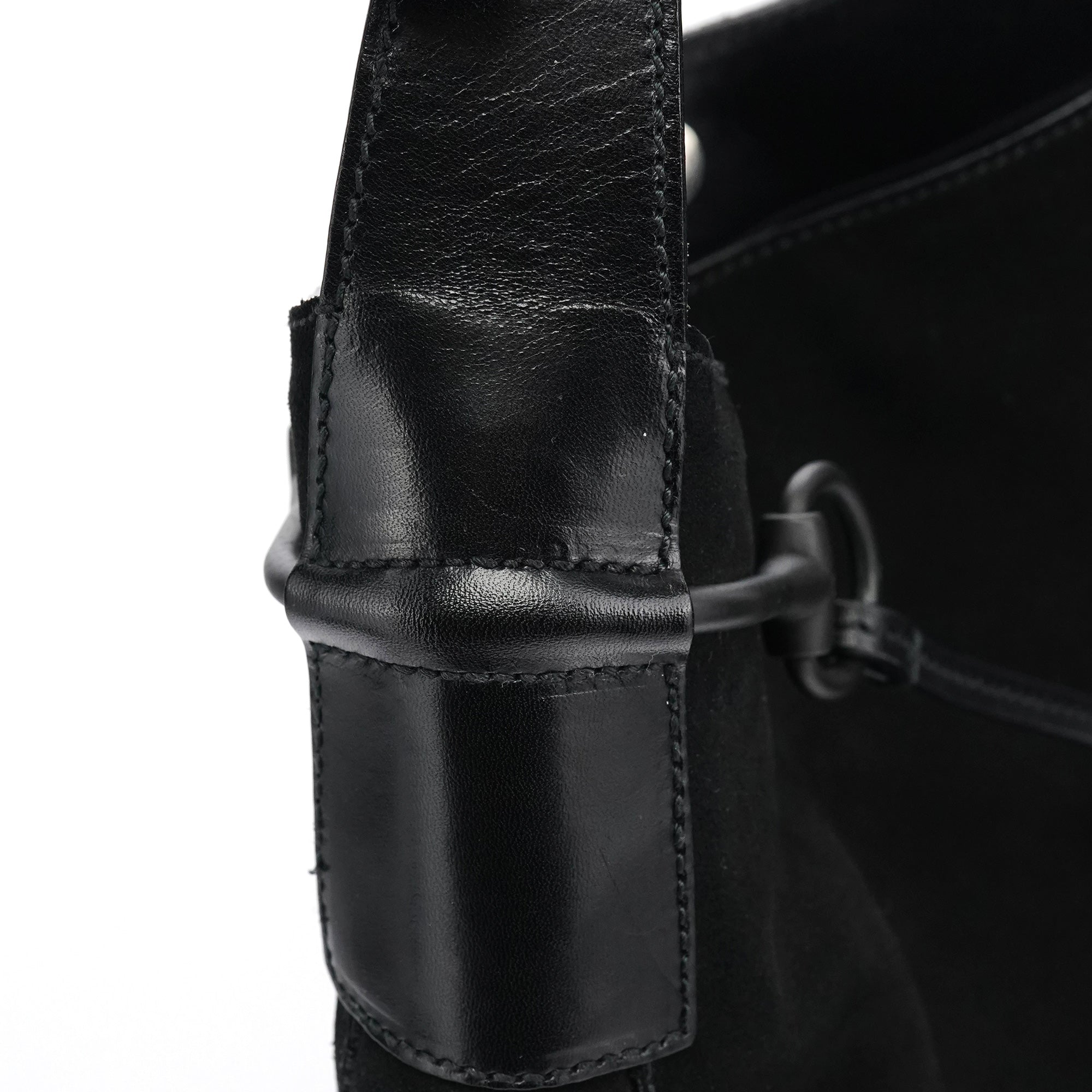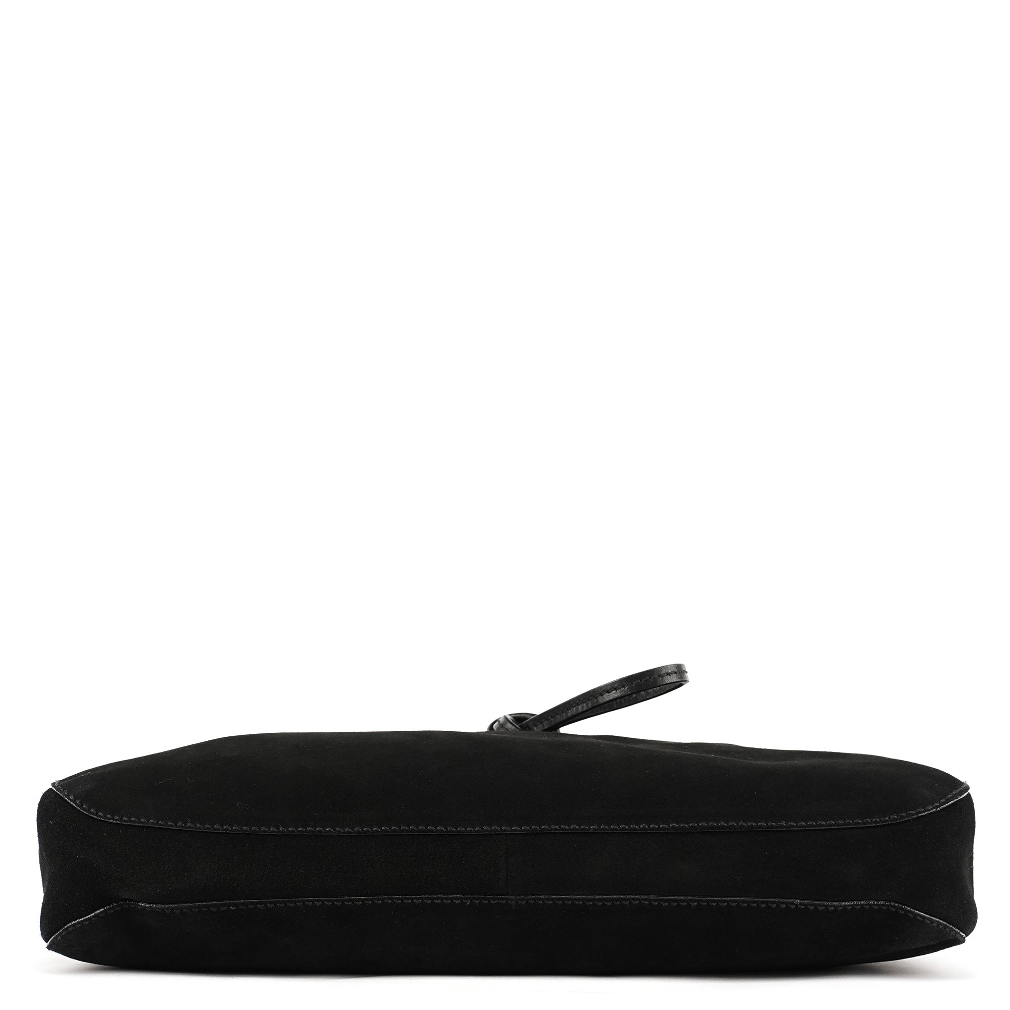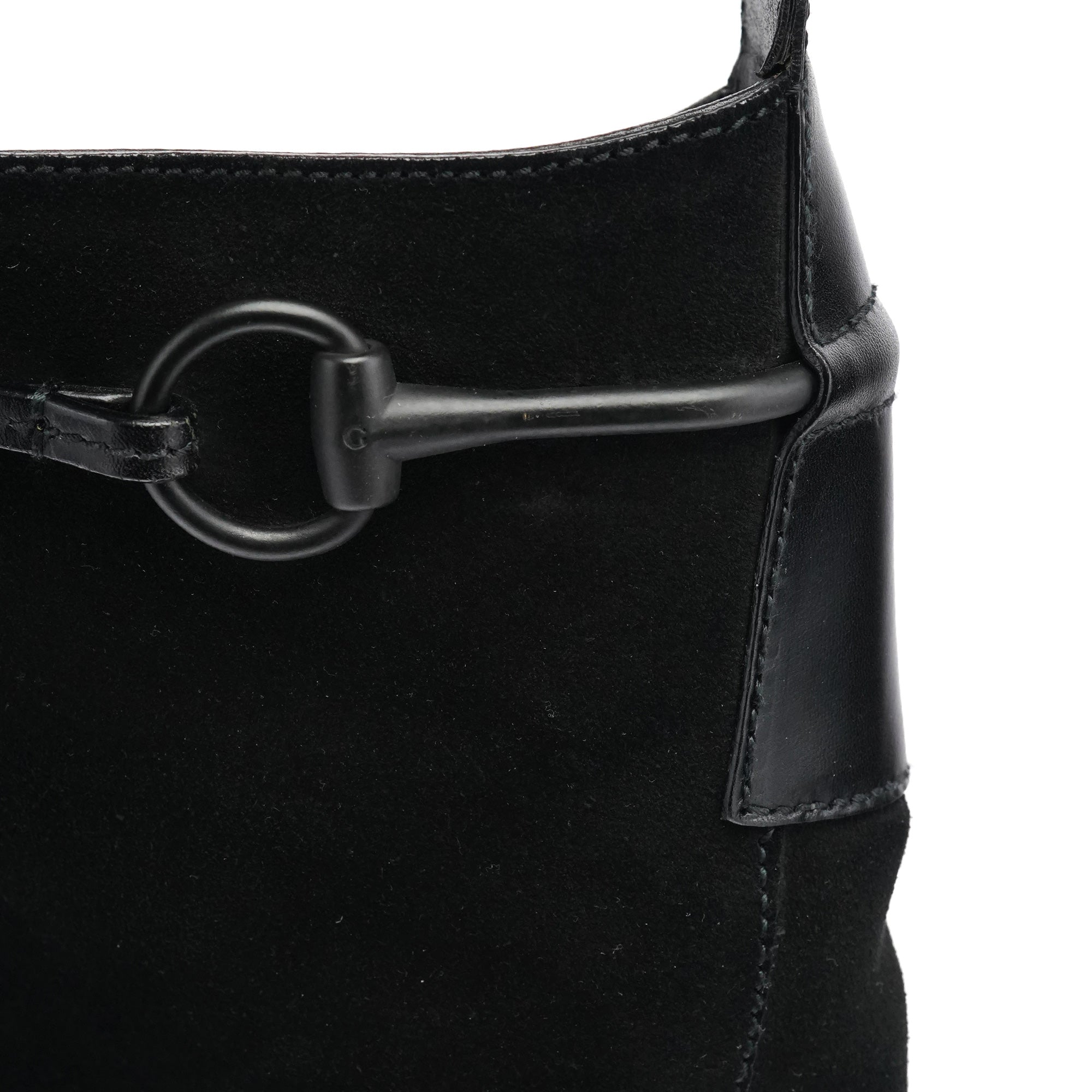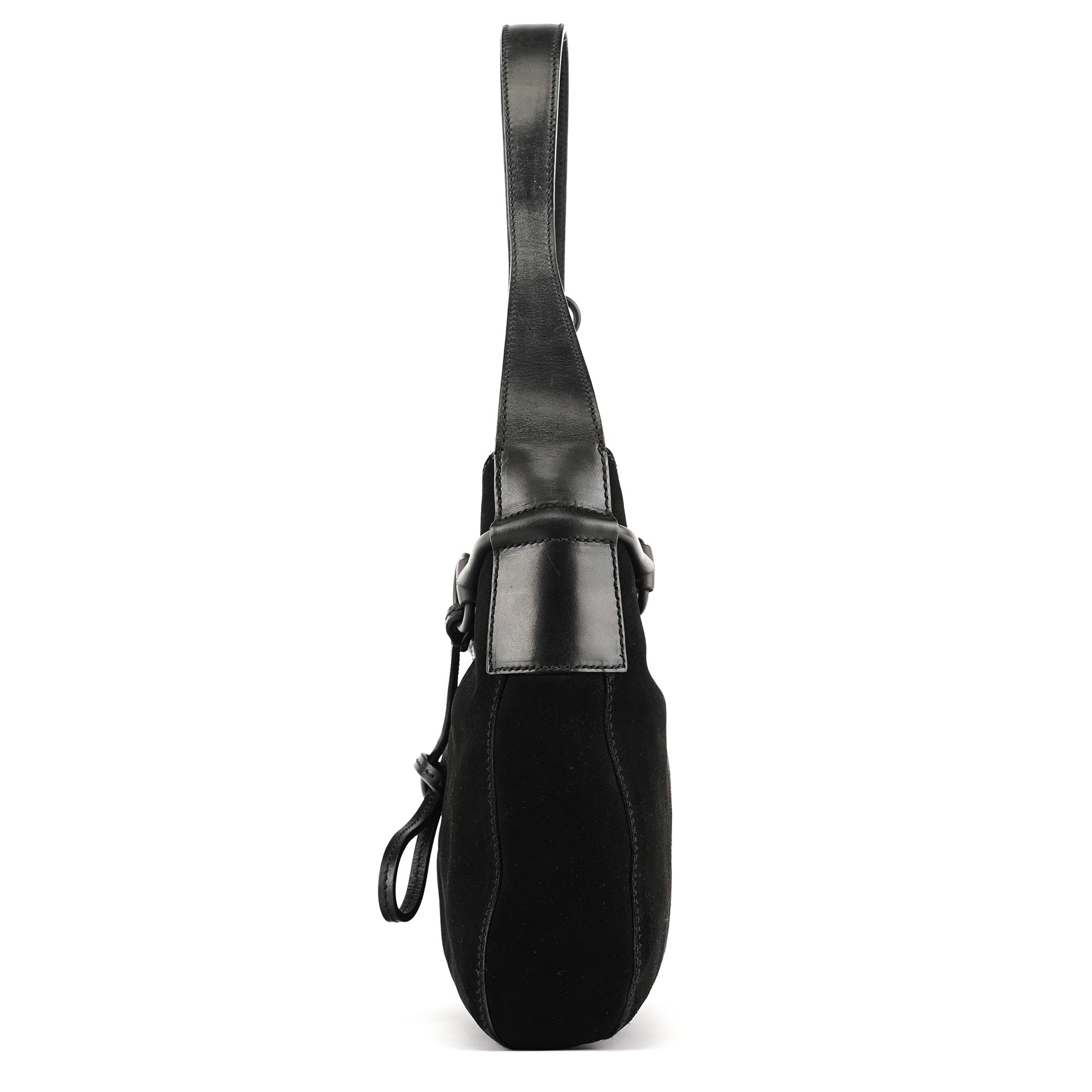 Designed in the early 2000s by Tom Ford, this Gucci Horsebit shoulder bag is crafted in black suede with smooth leather trim and finished with the iconic horsebit detailing across the front. The silhouette features a single shoulder strap, a magnetic top closure, and a GG-monogram satin interior with a zip pocket.