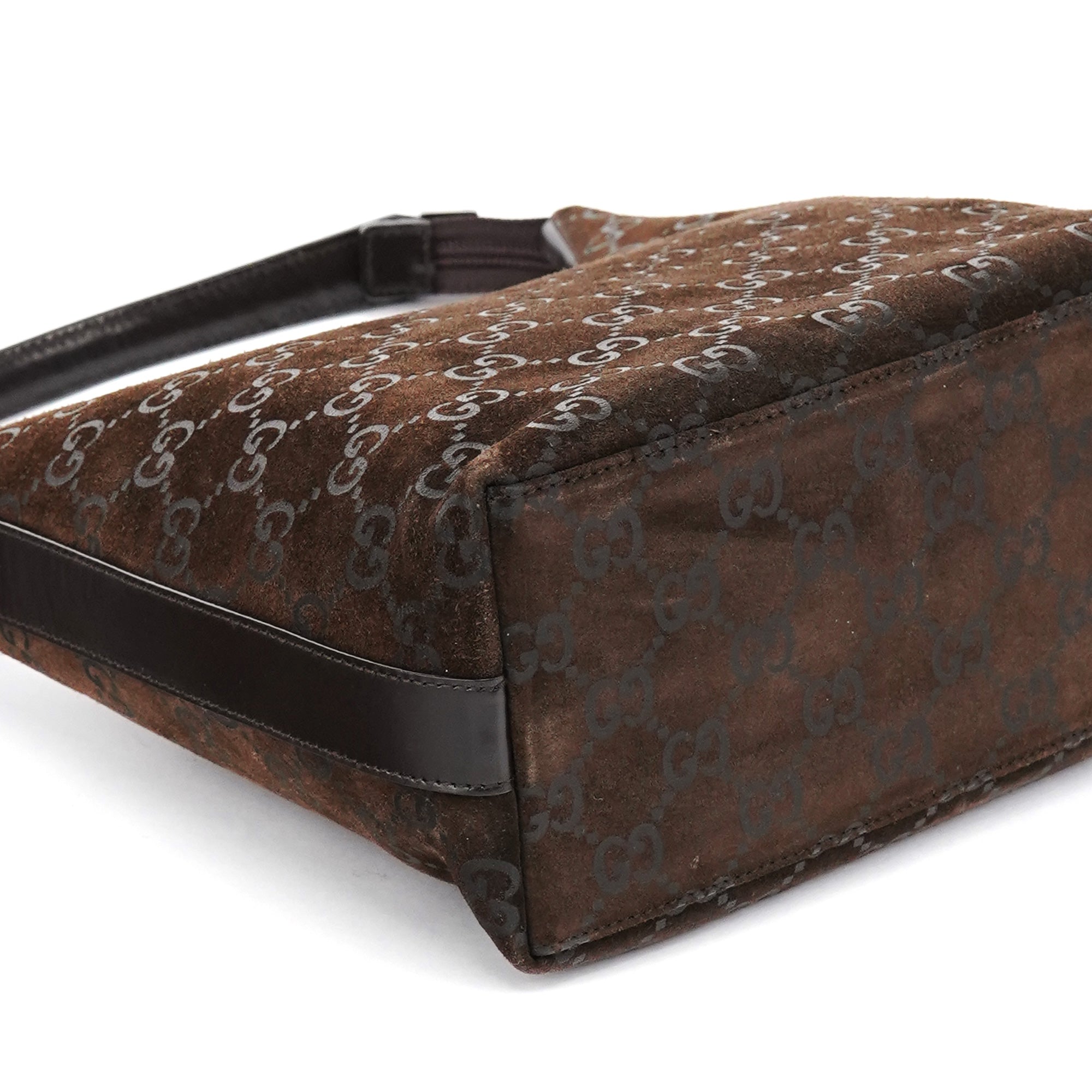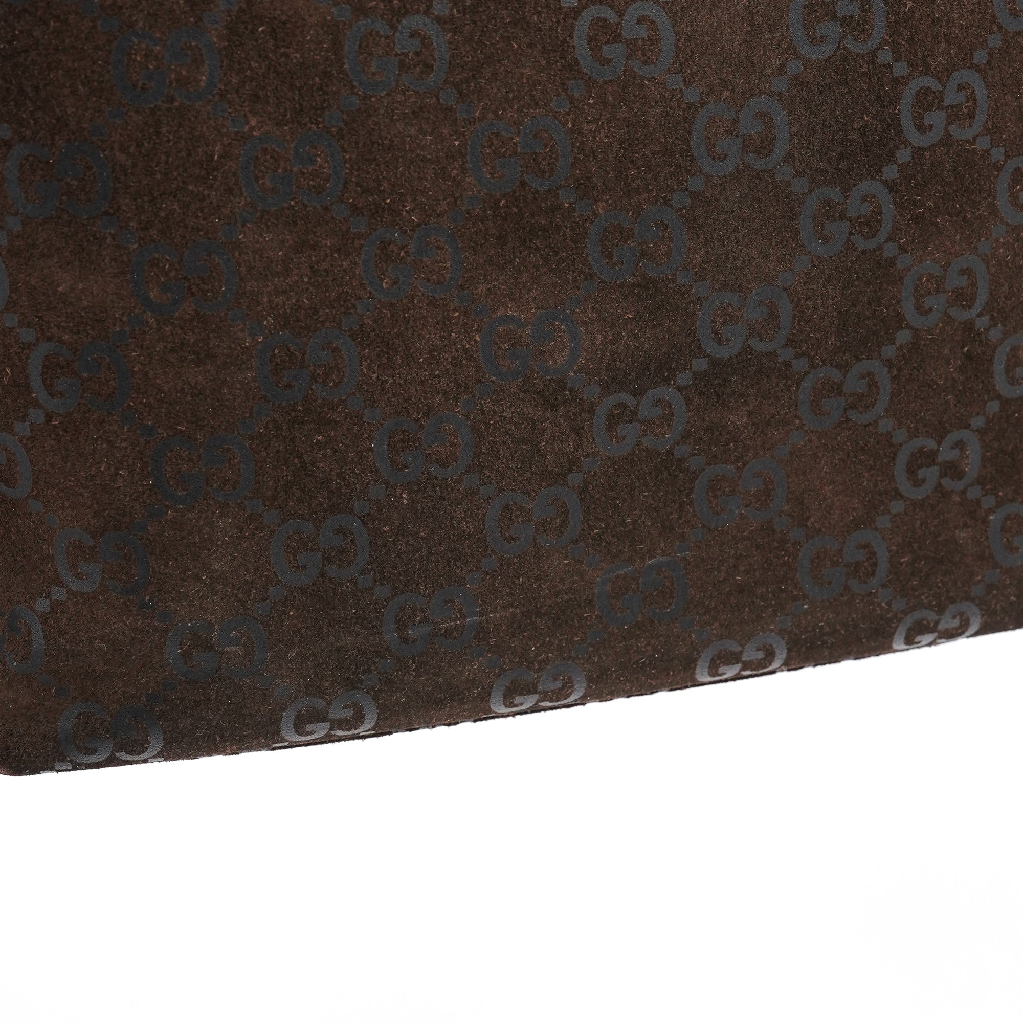 Designed in 1997 by Tom Ford, this vintage Gucci GG suede shoulder bag features brown suede with an all-over GG monogram pattern and contrasting smooth leather trim with silver-tone hardware. The hobo-style silhouette includes a single curved handle with metal attachments and a fabric-lined interior.