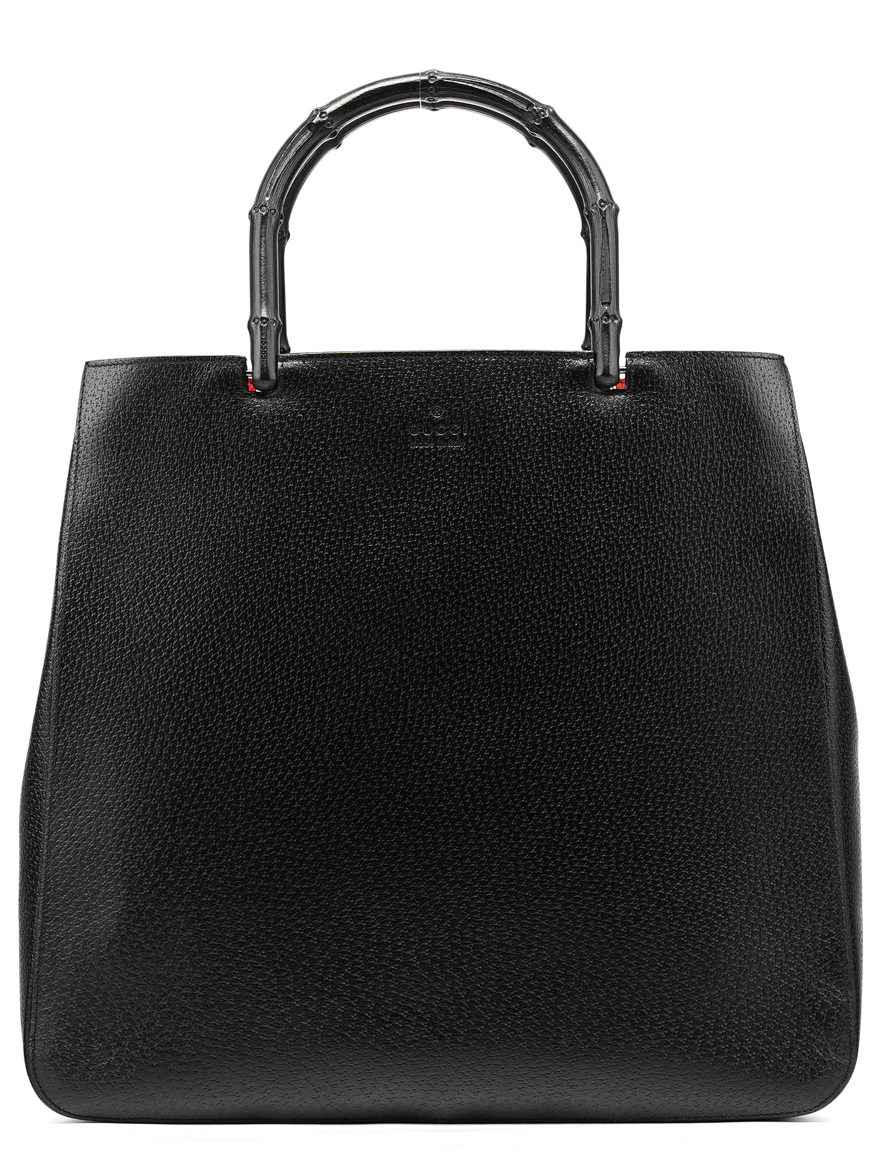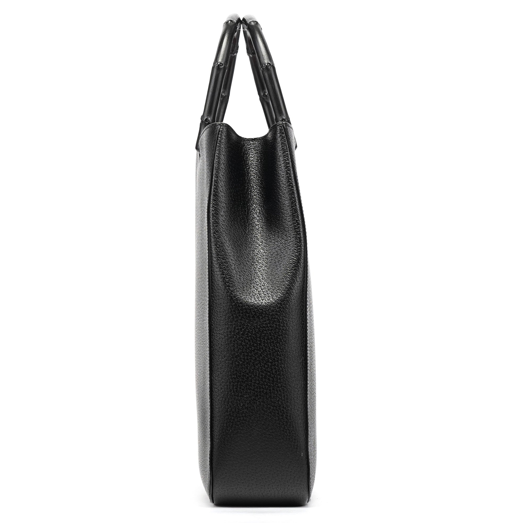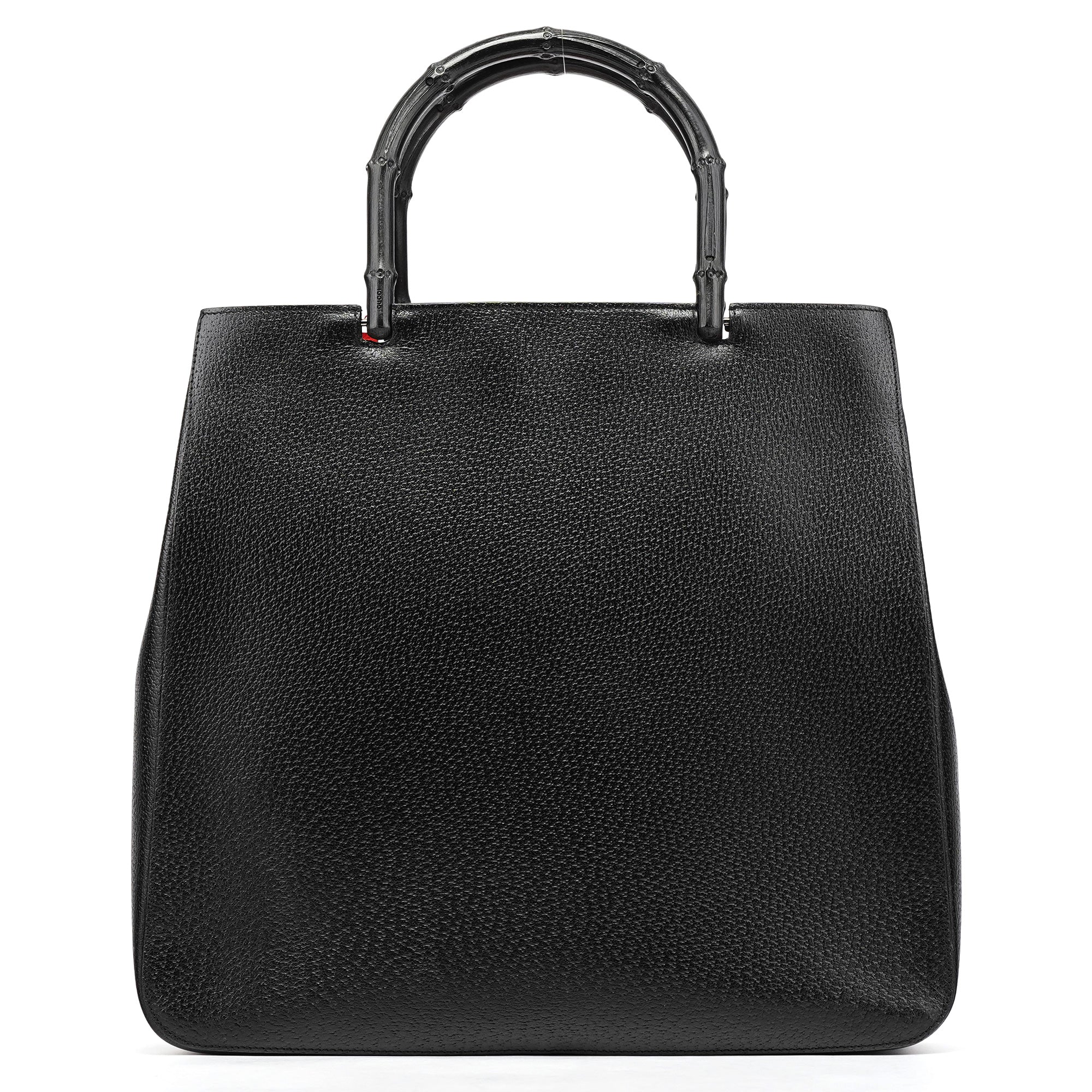 Designed in the late 1990s by Tom Ford, this large Gucci Bamboo tote bag is crafted from black textured calfskin with the house’s signature bamboo top handles. The open-top silhouette reveals a red suede-lined interior, complete with a zippered pocket attached inside for essentials, balancing sculptural presence with everyday functionality.