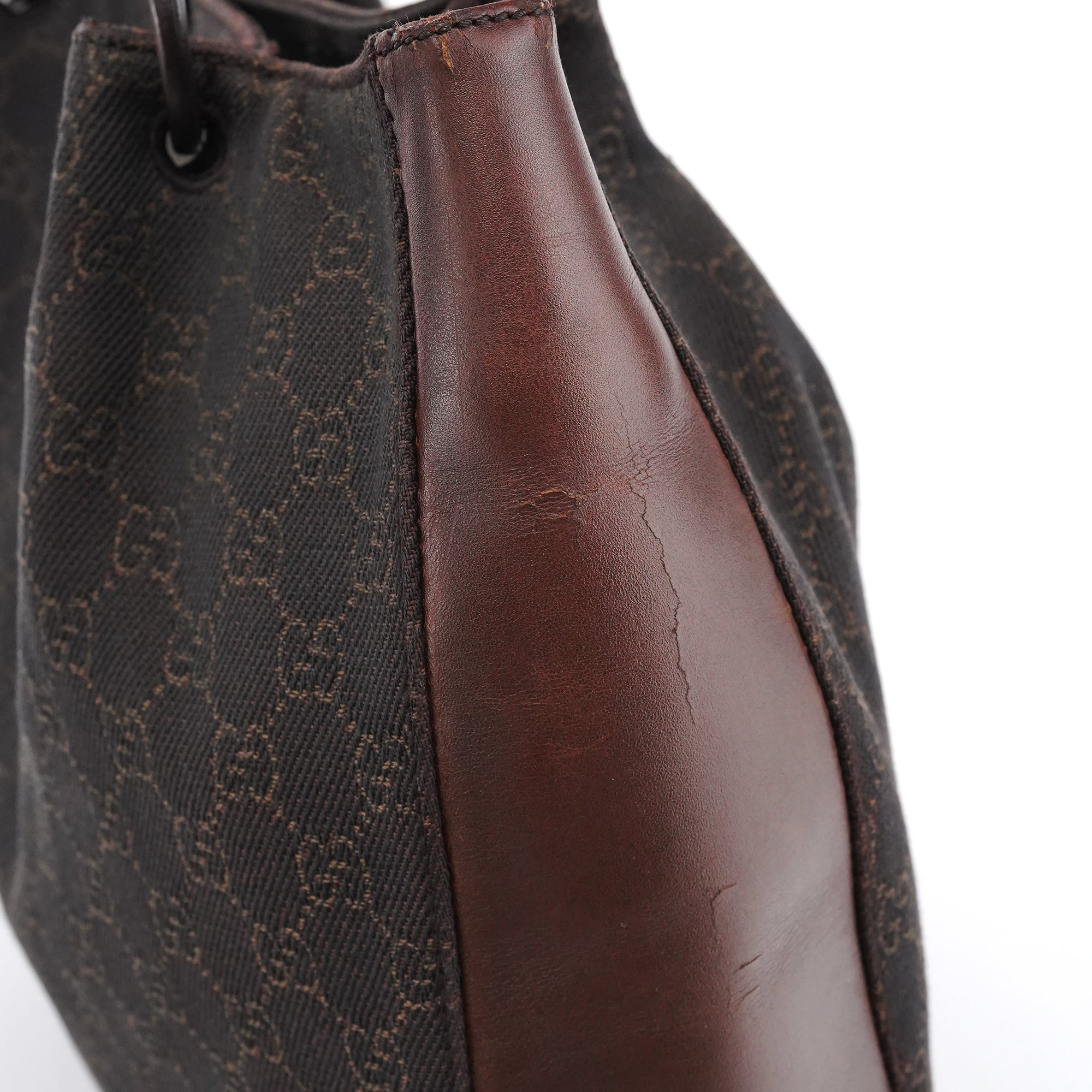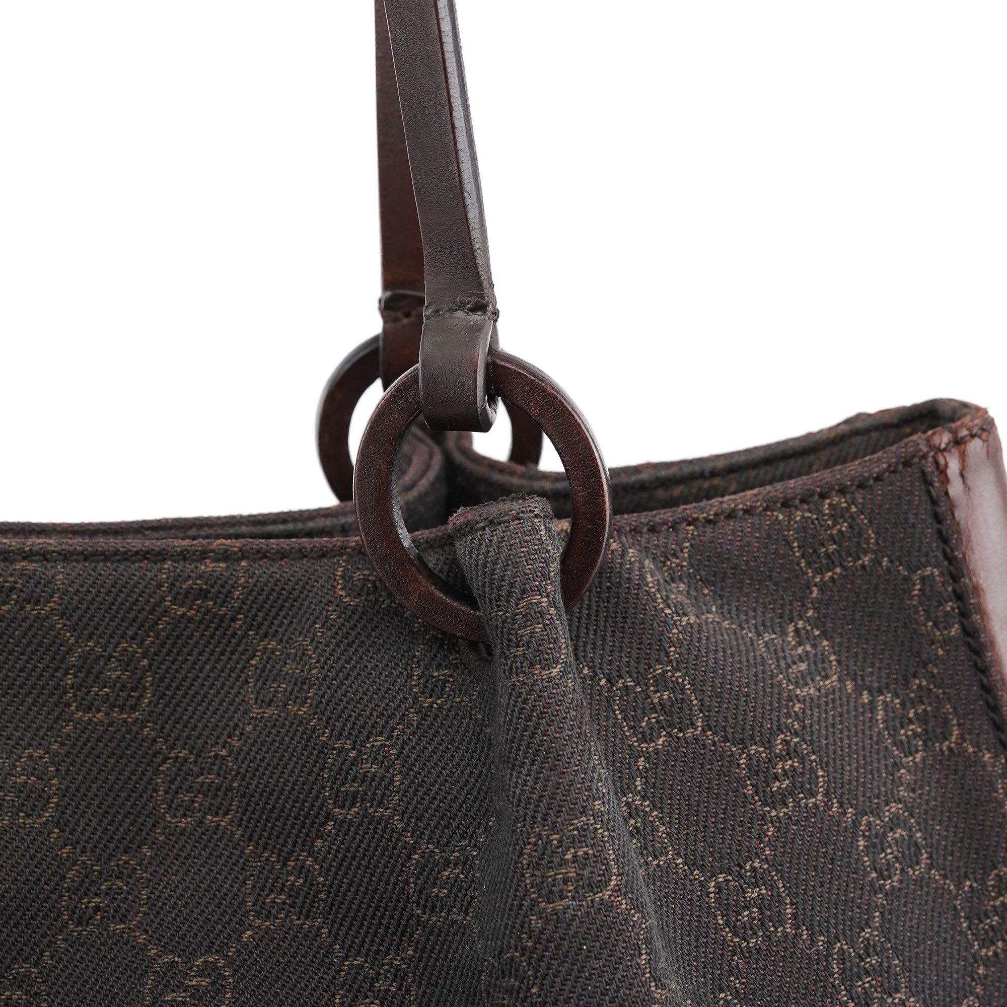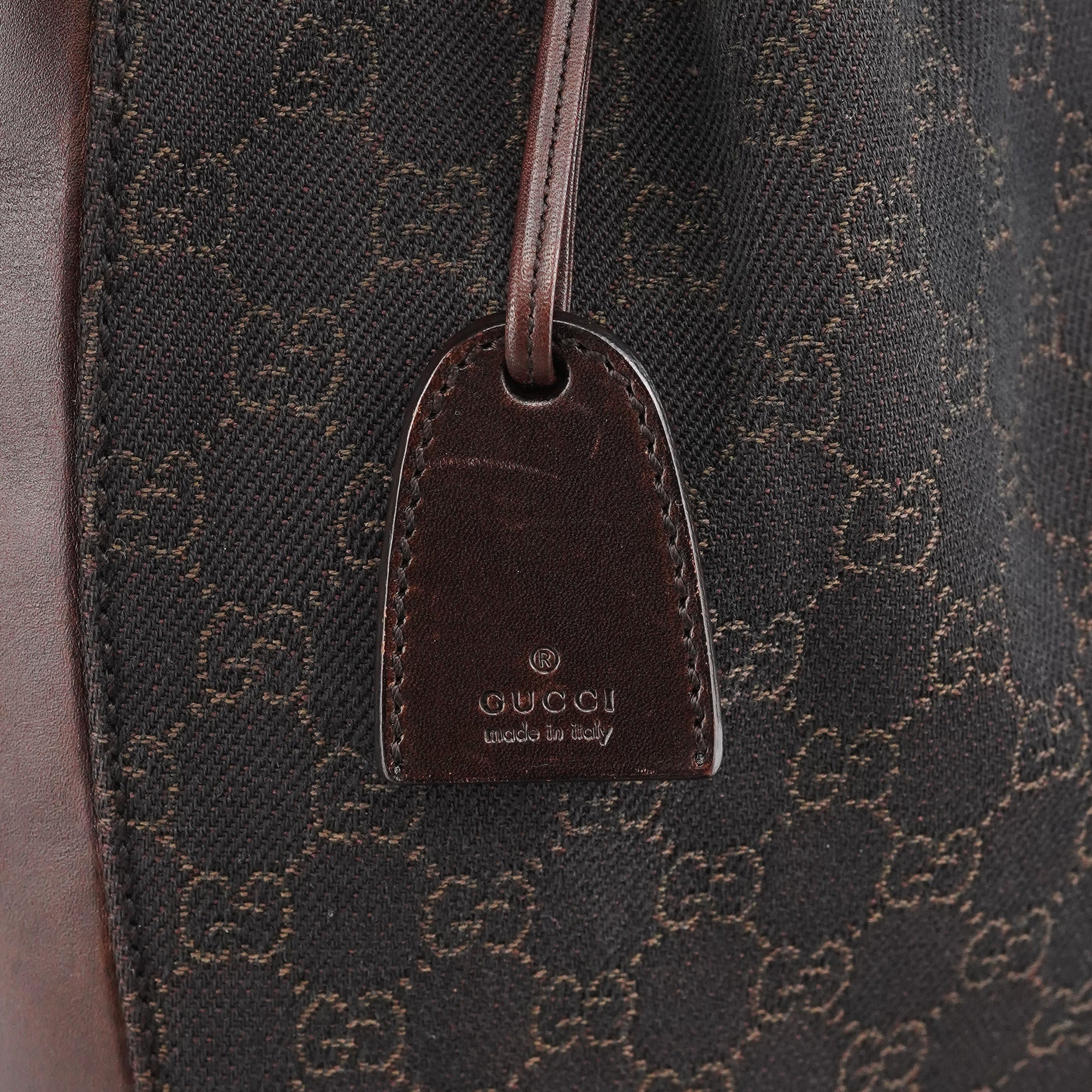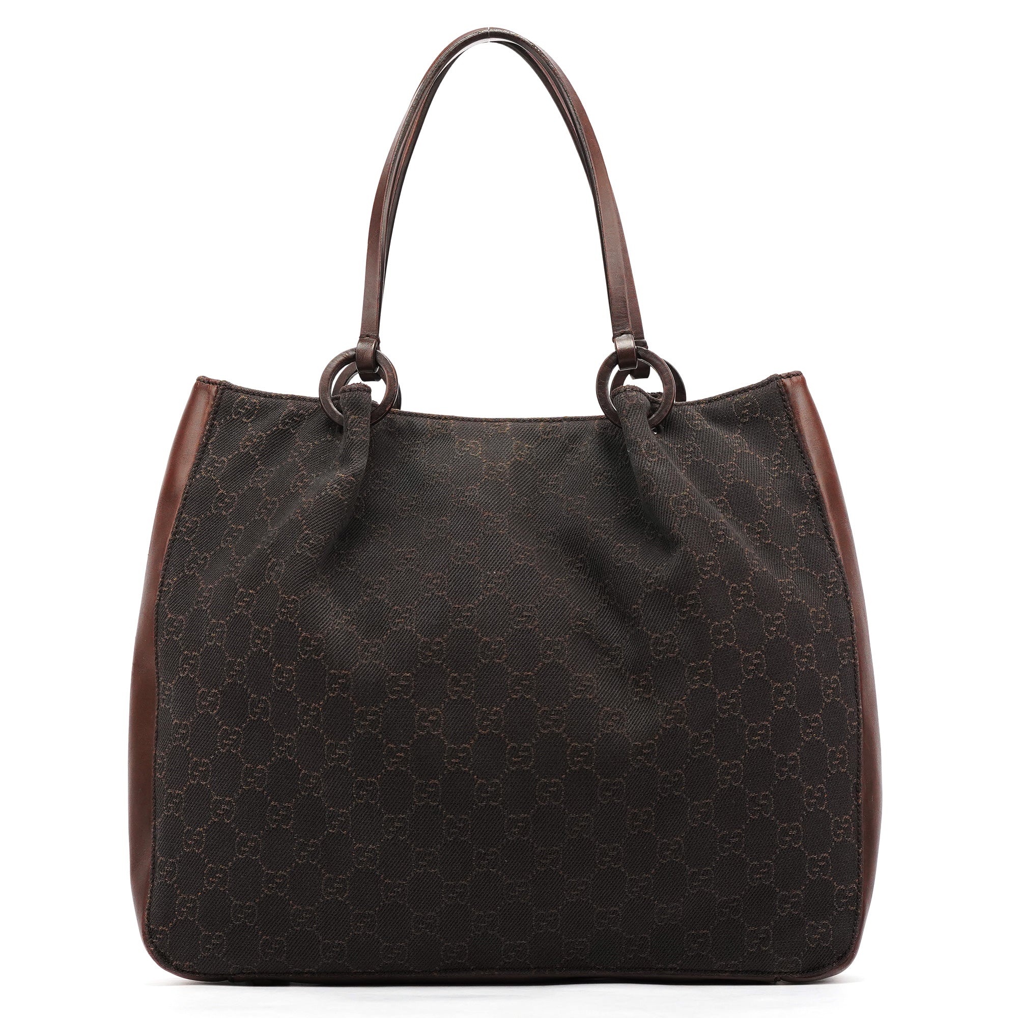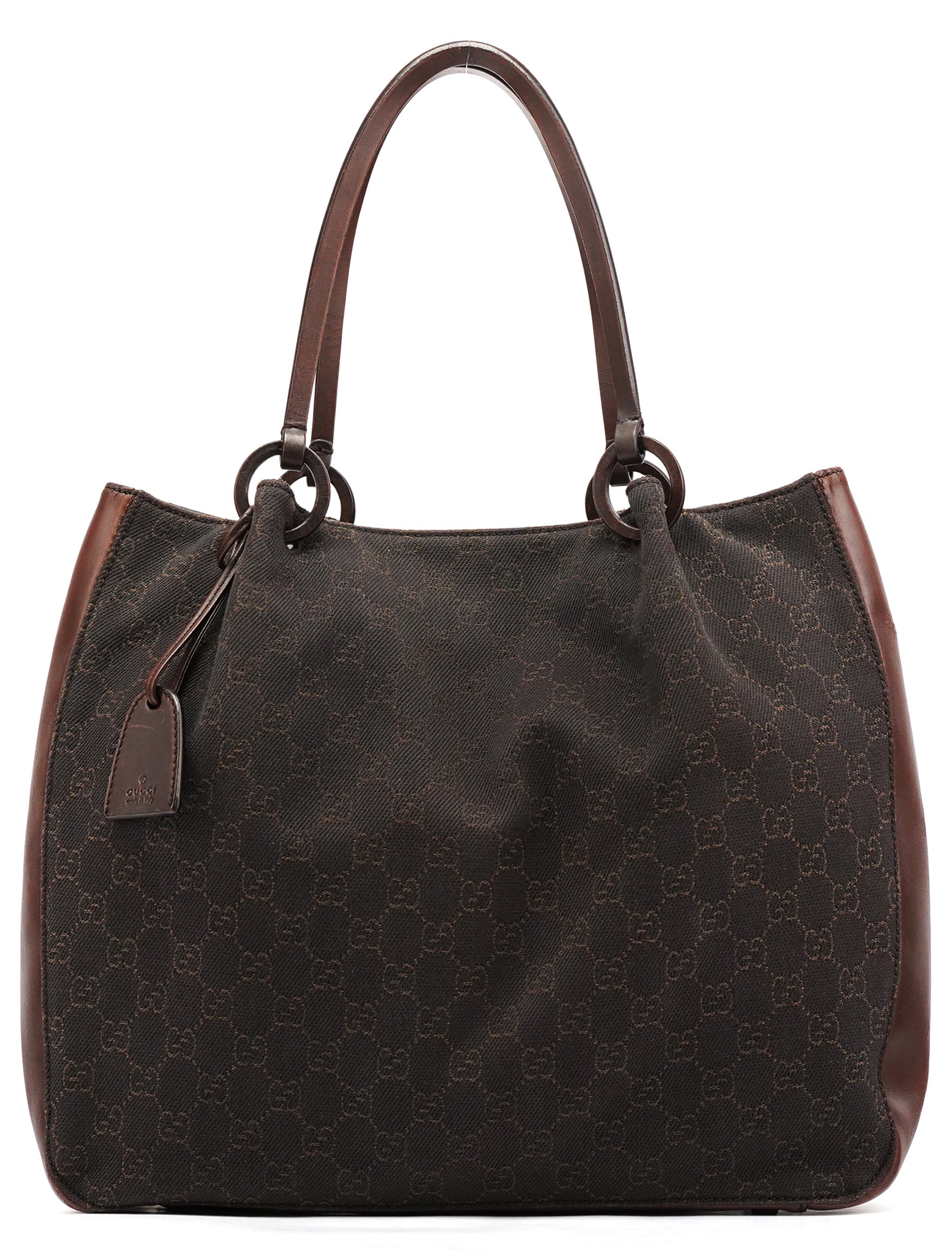 Designed in the late 1990s by Tom Ford, this vintage Gucci GG tote is crafted in dark brown GG canvas with smooth leather trim. The softly structured silhouette features slim shoulder straps, ring hardware, and an attached interior zip pouch for essentials.