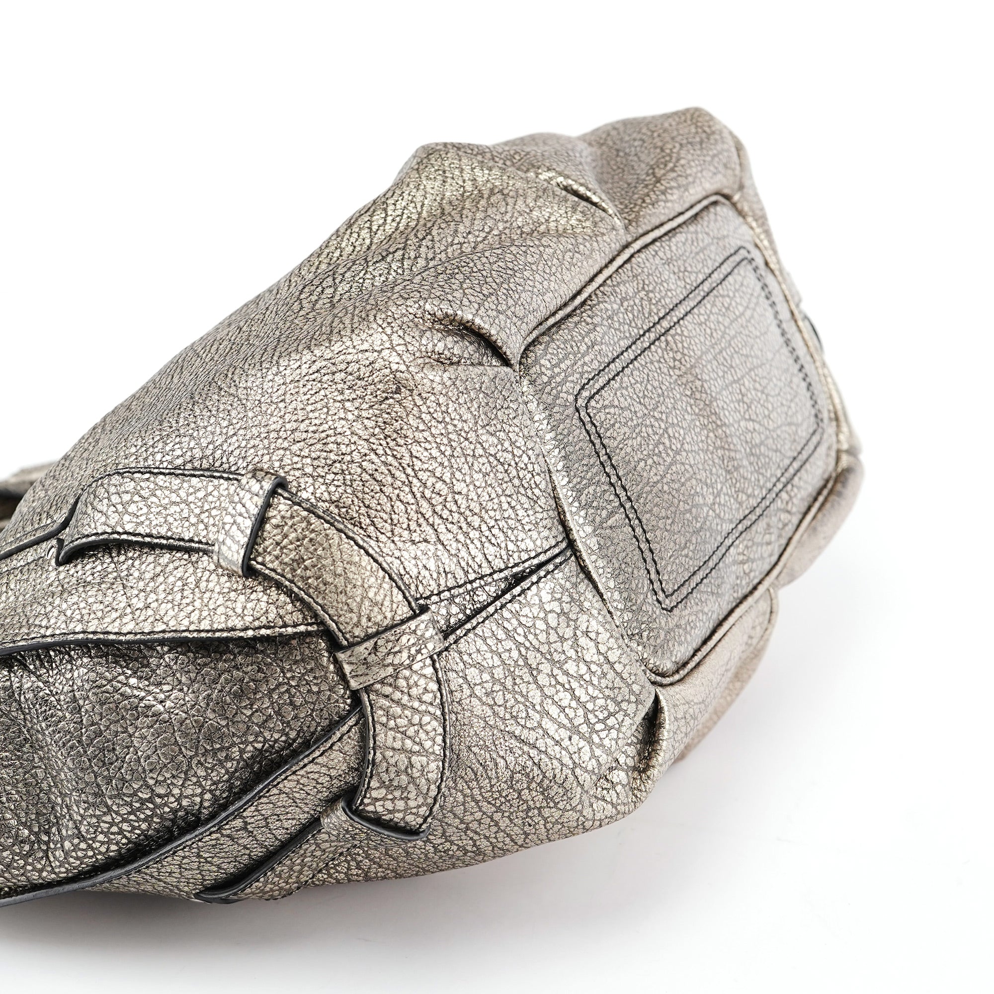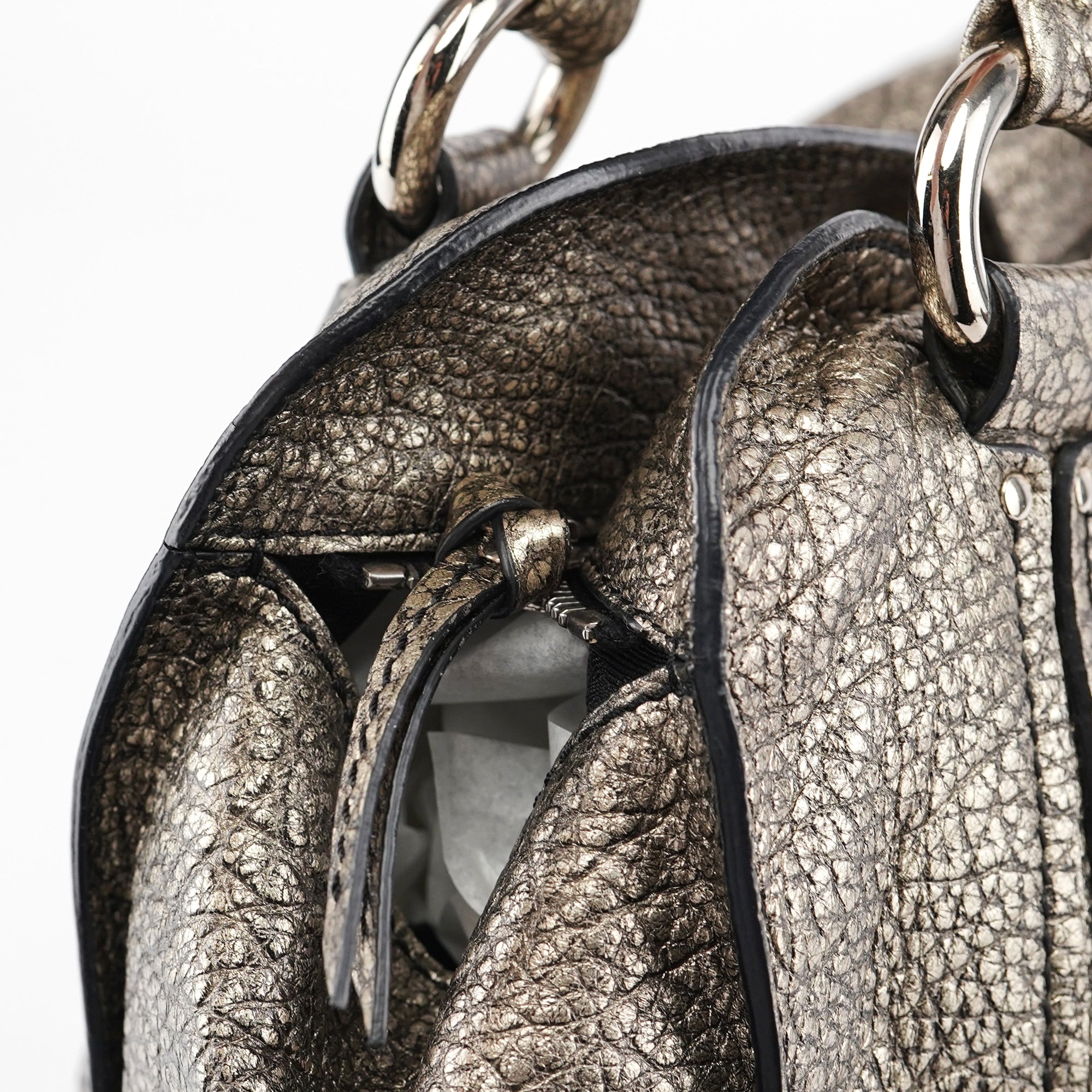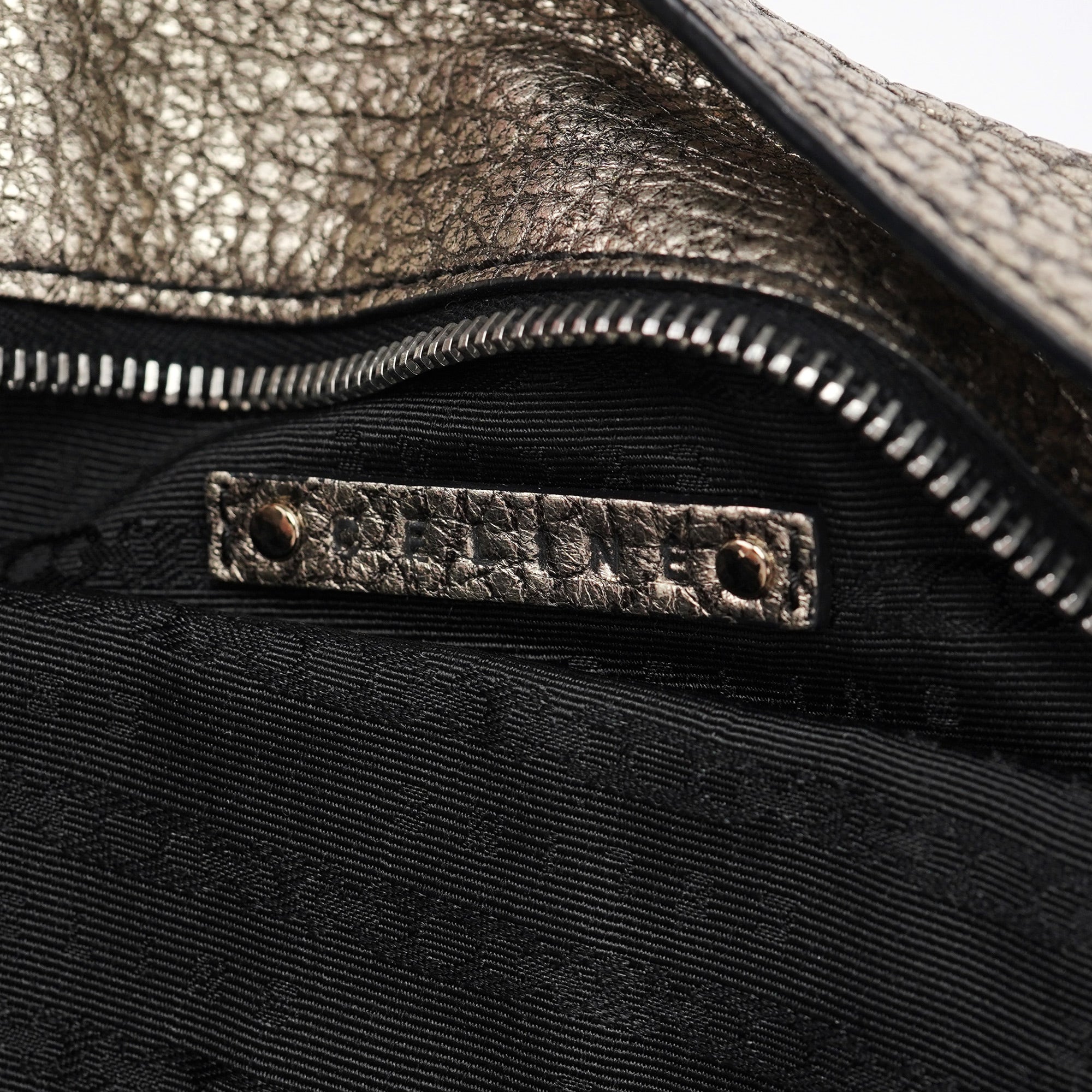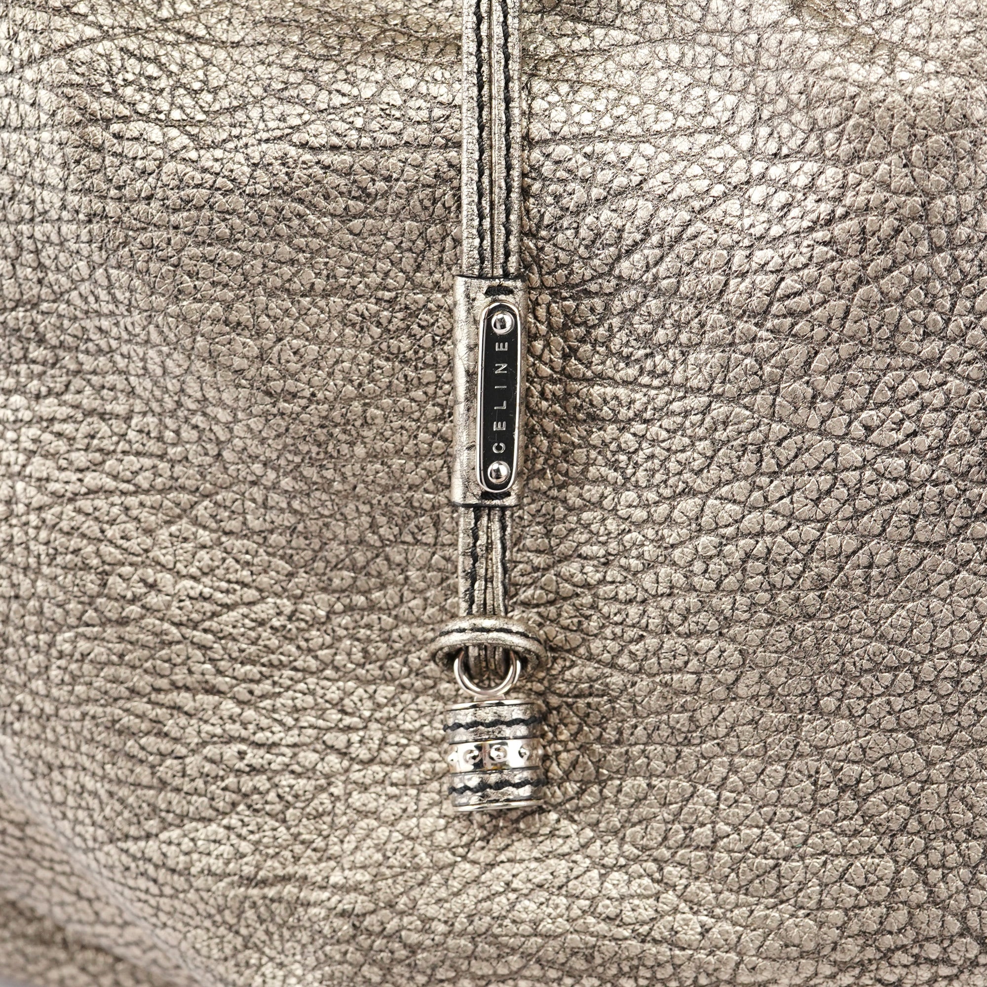 Designed in the early 2000s, this Celine Bittersweet bag is crafted from metallic silver leather with a softly structured silhouette and signature knotted leather draw cords. It features dual rolled handles, elongated zipper pulls, and tonal topstitching that enhances its slouchy yet elevated profile. The interior is lined in logo jacquard and offers multiple pockets for organized storage.
