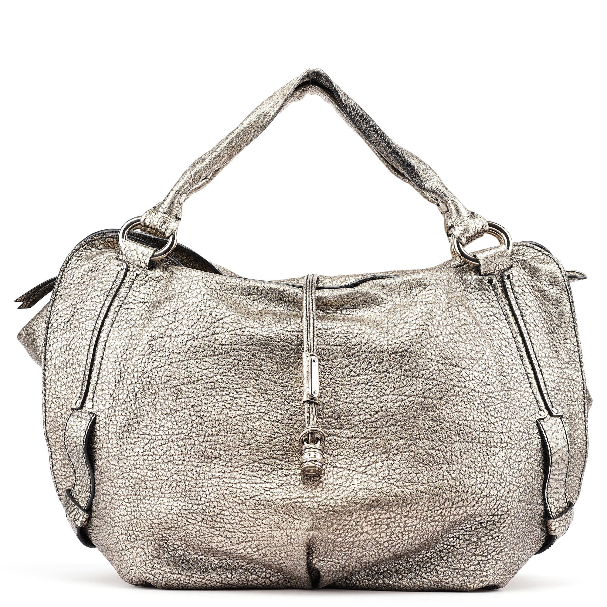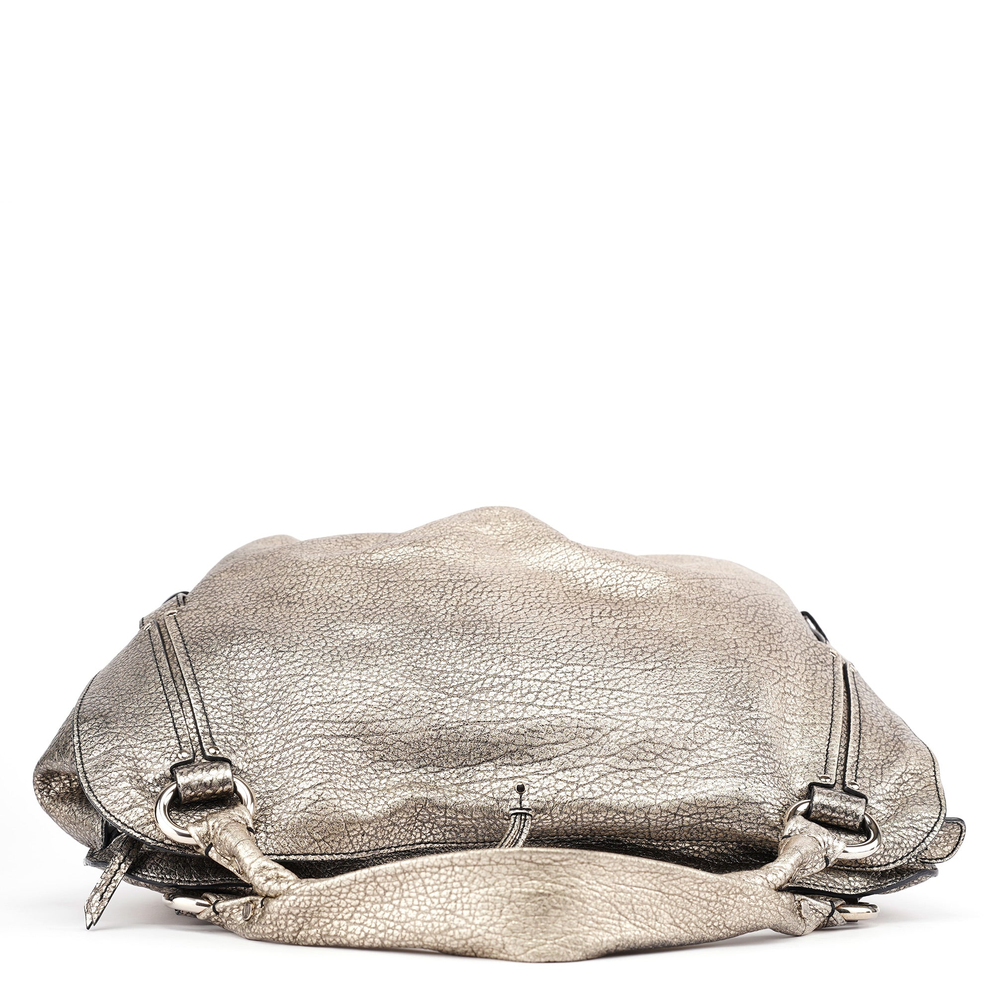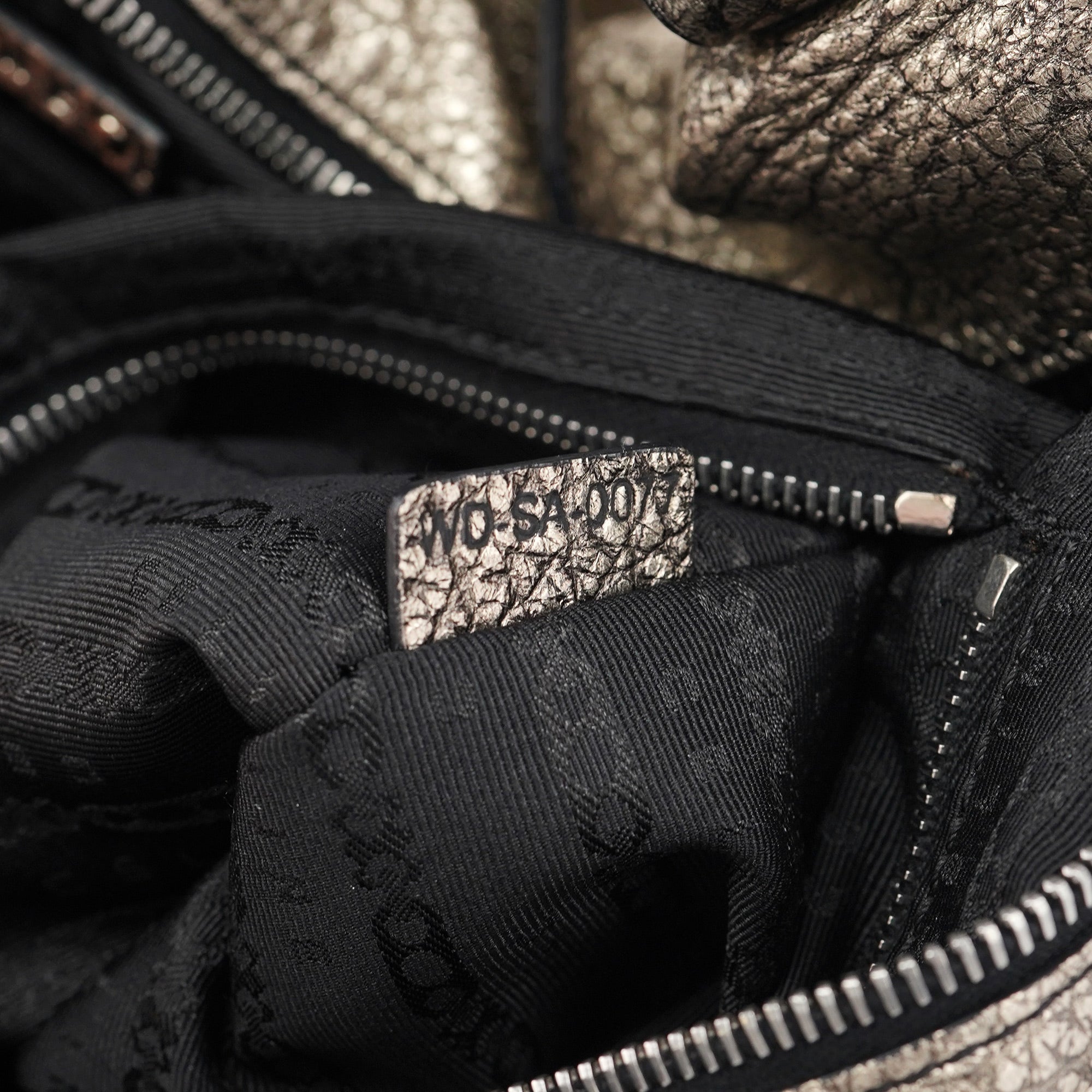Designed in the early 2000s, this Celine Bittersweet bag is crafted from metallic silver leather with a softly structured silhouette and signature knotted leather draw cords. It features dual rolled handles, elongated zipper pulls, and tonal topstitching that enhances its slouchy yet elevated profile. The interior is lined in logo jacquard and offers multiple pockets for organized storage.