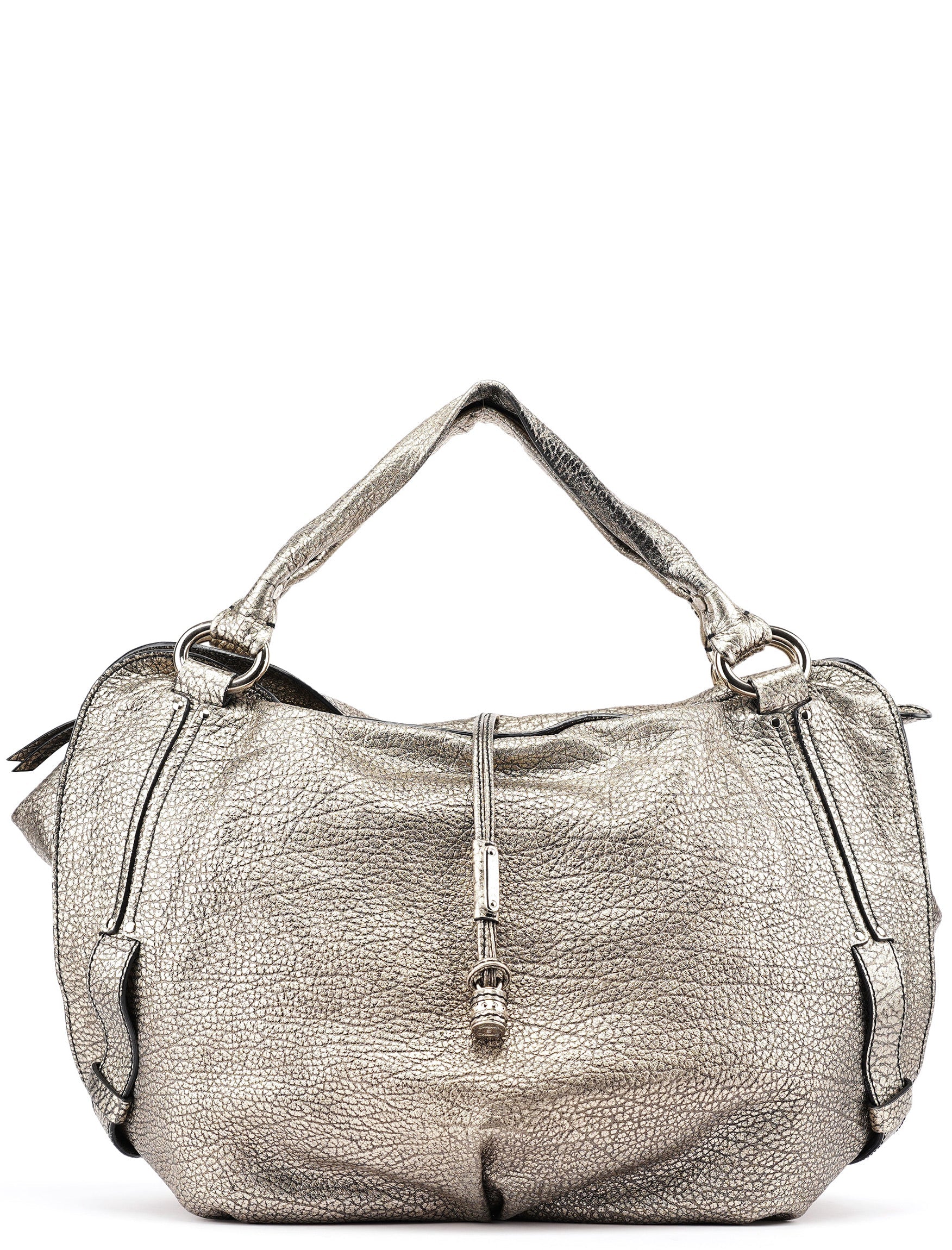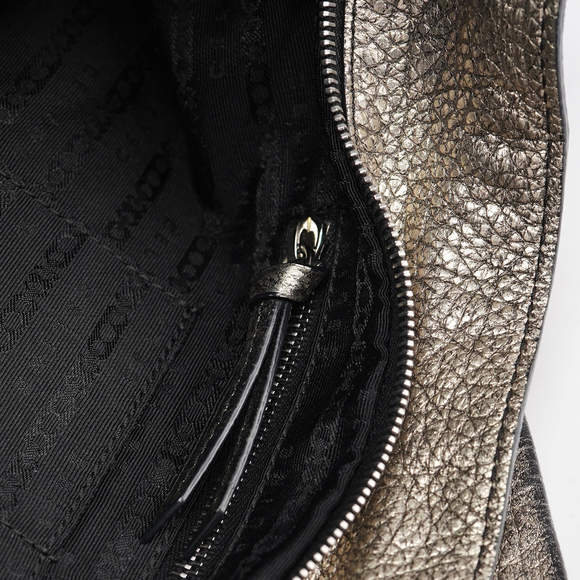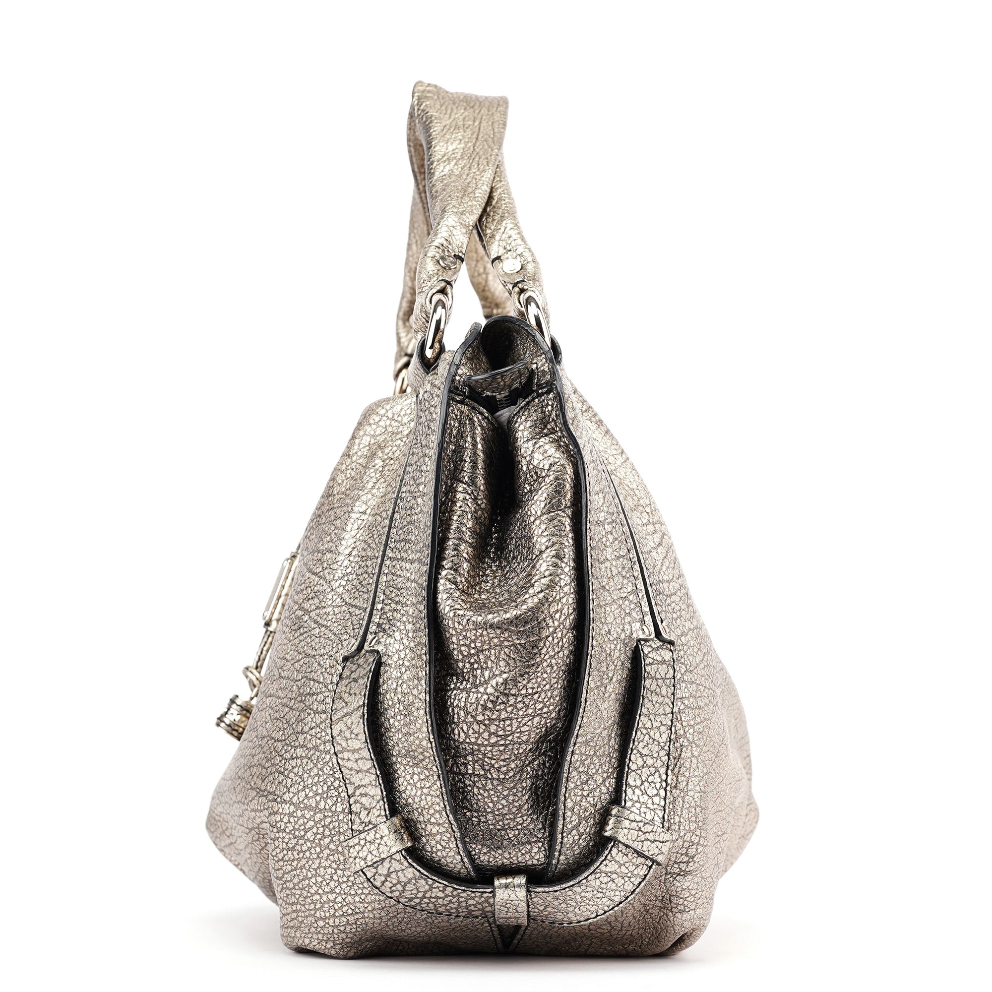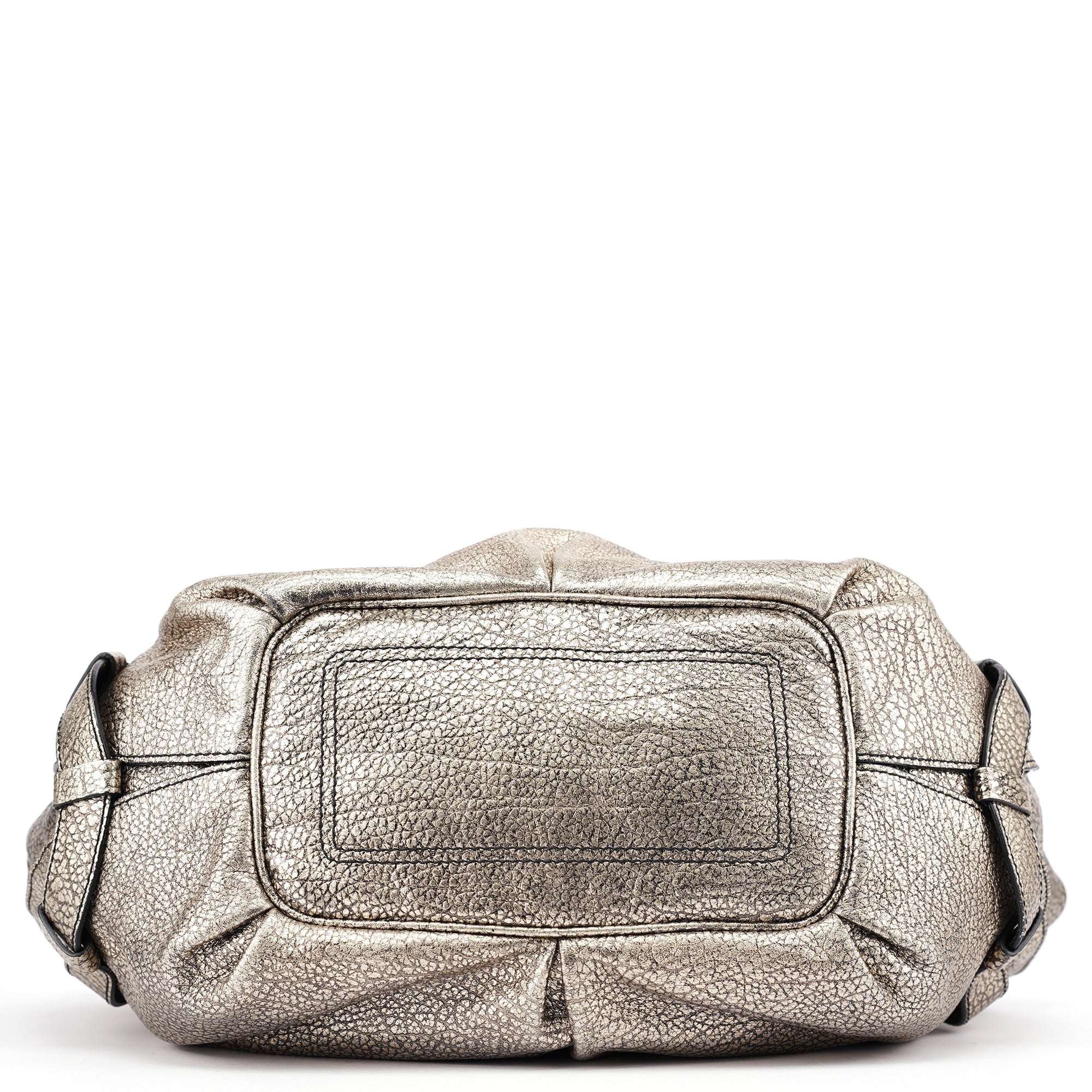 Designed in the early 2000s, this Celine Bittersweet bag is crafted from metallic silver leather with a softly structured silhouette and signature knotted leather draw cords. It features dual rolled handles, elongated zipper pulls, and tonal topstitching that enhances its slouchy yet elevated profile. The interior is lined in logo jacquard and offers multiple pockets for organized storage.