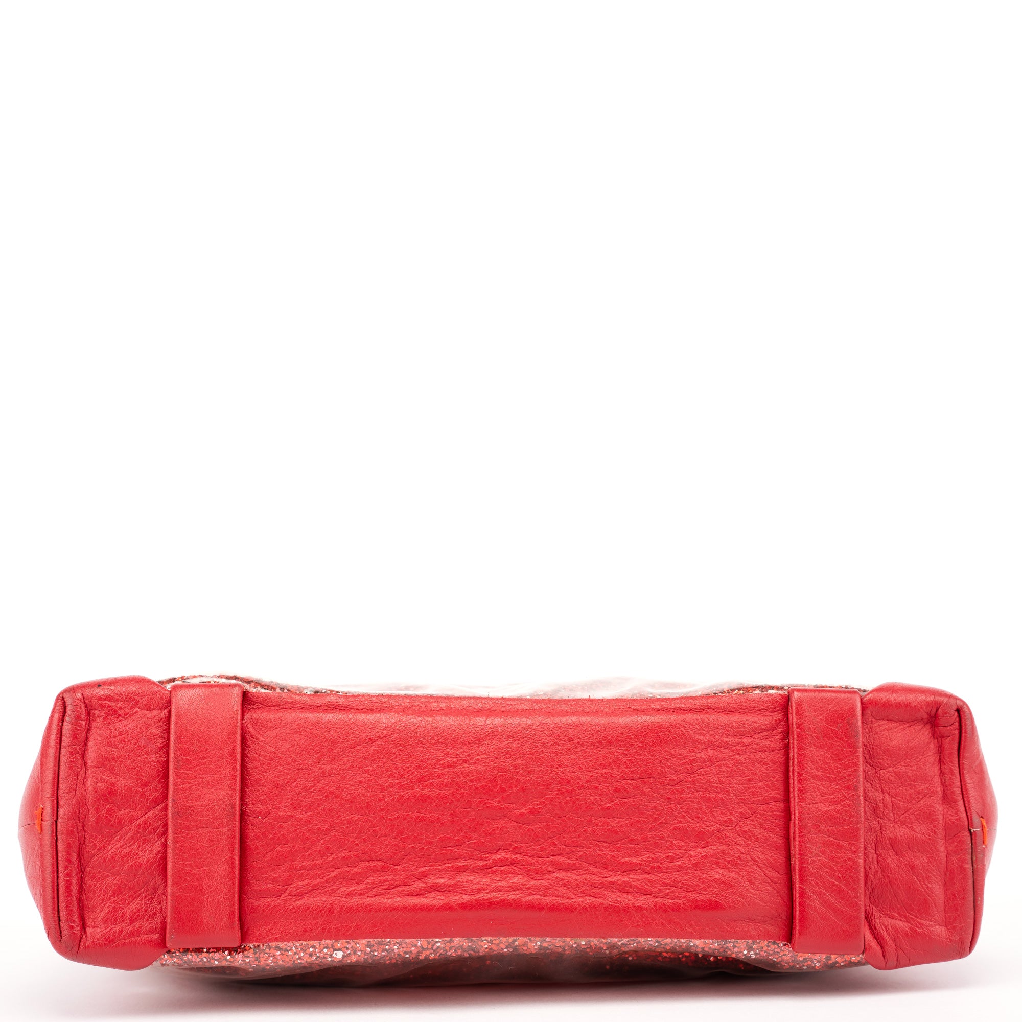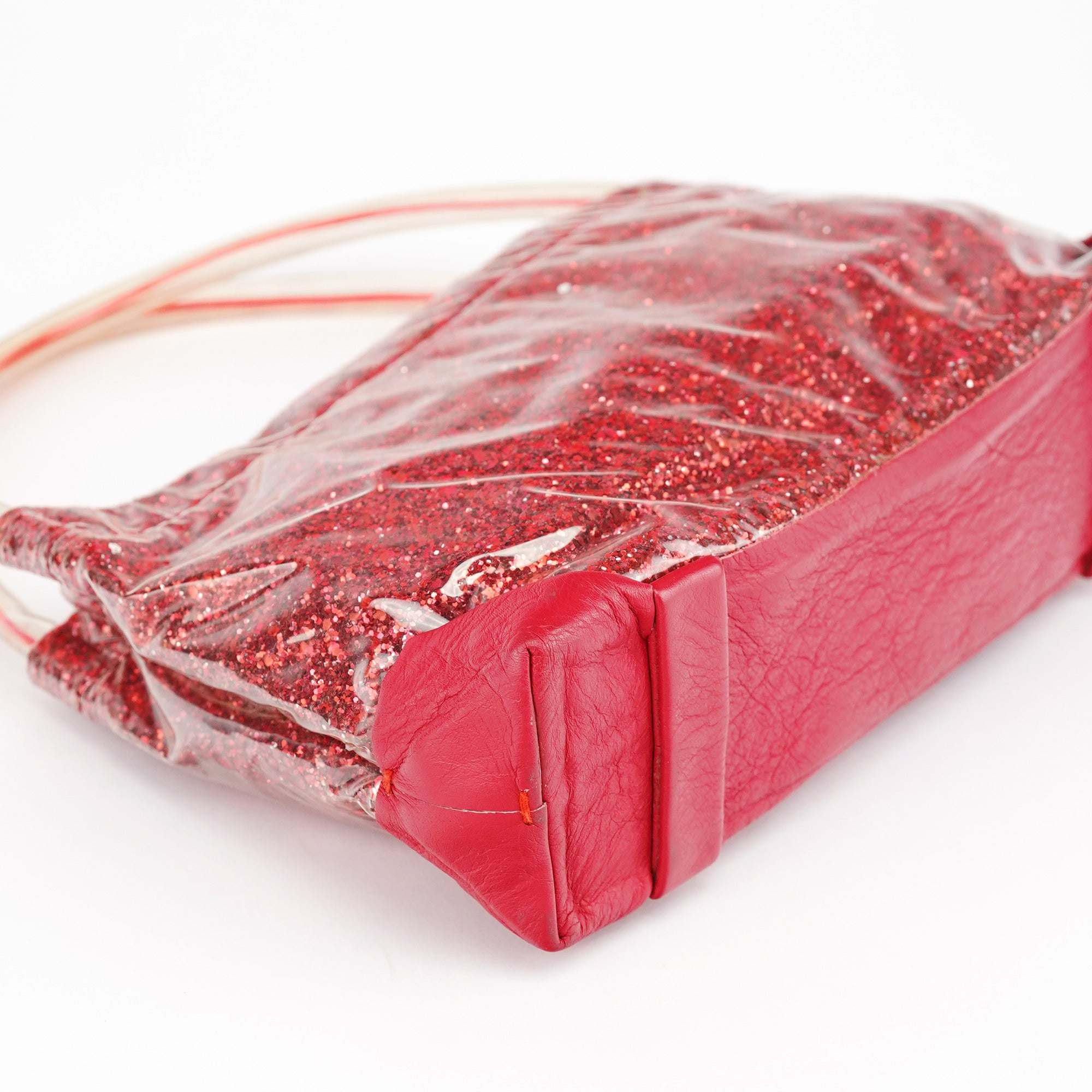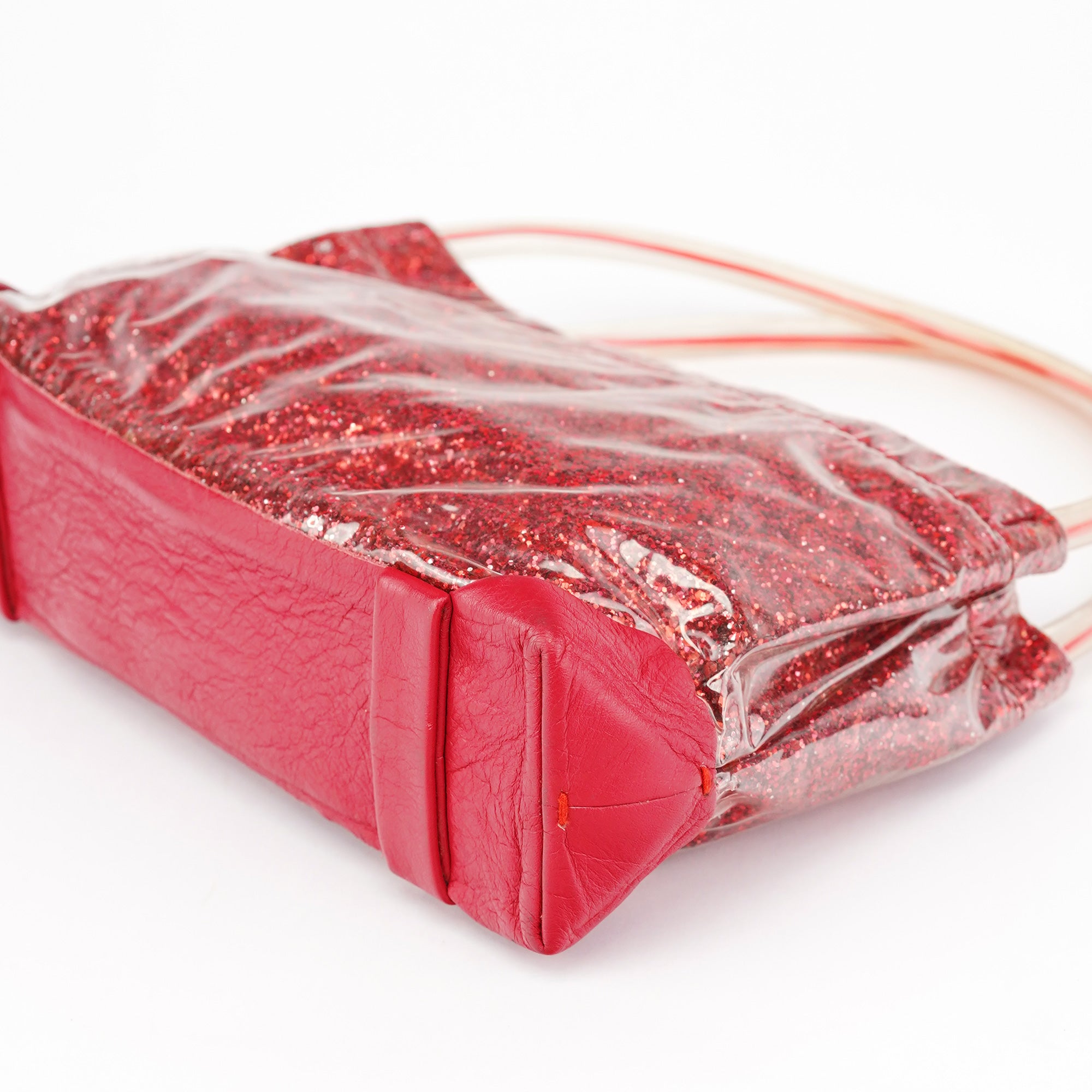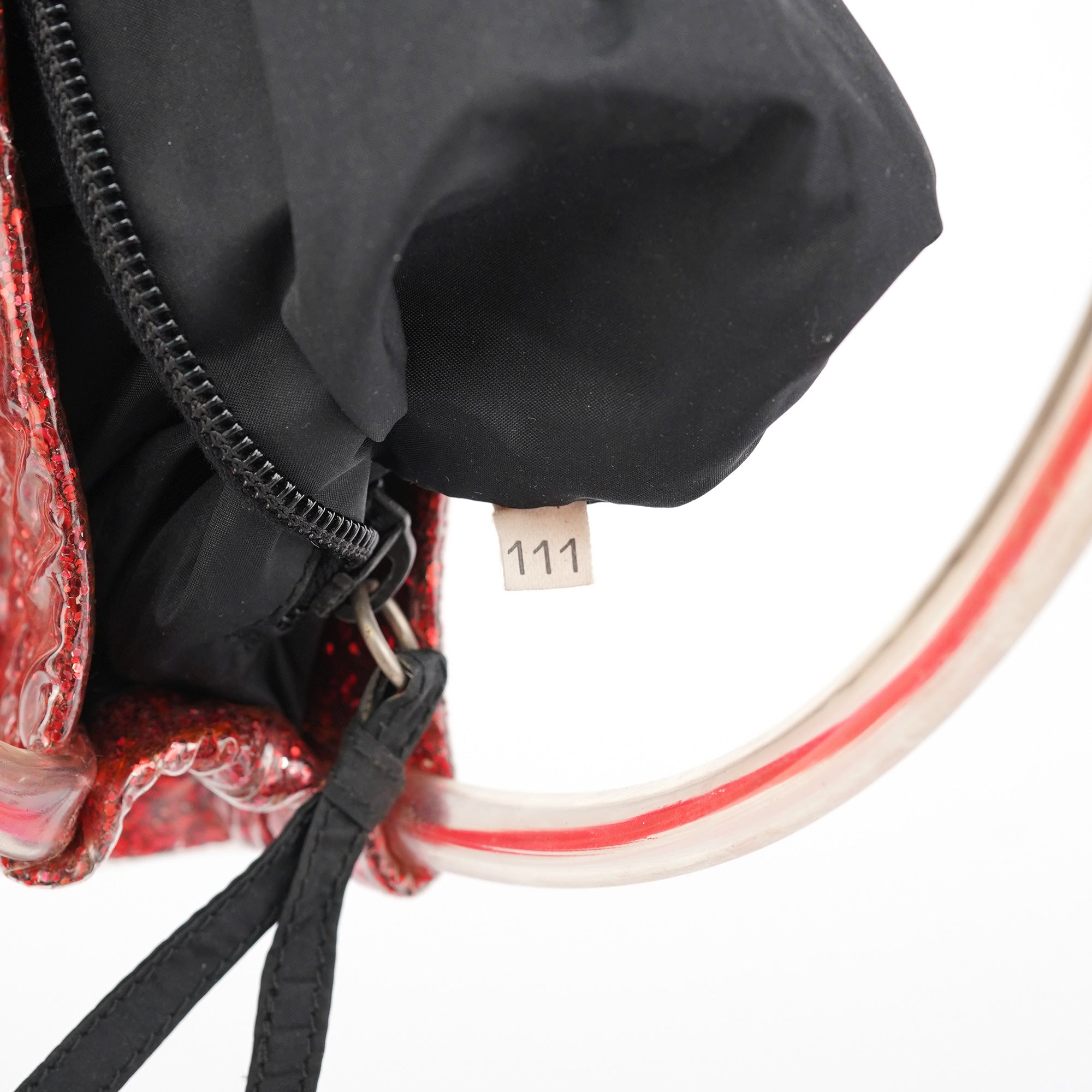 Designed in the late 1990s by Miuccia Prada, this rare Miu Miu burgundy glitter shoulder bag is crafted from red glitter-coated synthetic with matching leather trim. Featuring a structured silhouette, it is finished with double transparent tubular handles for a playful, futuristic touch. The interior is lined with fabric and offers a single zip pocket for essentials.