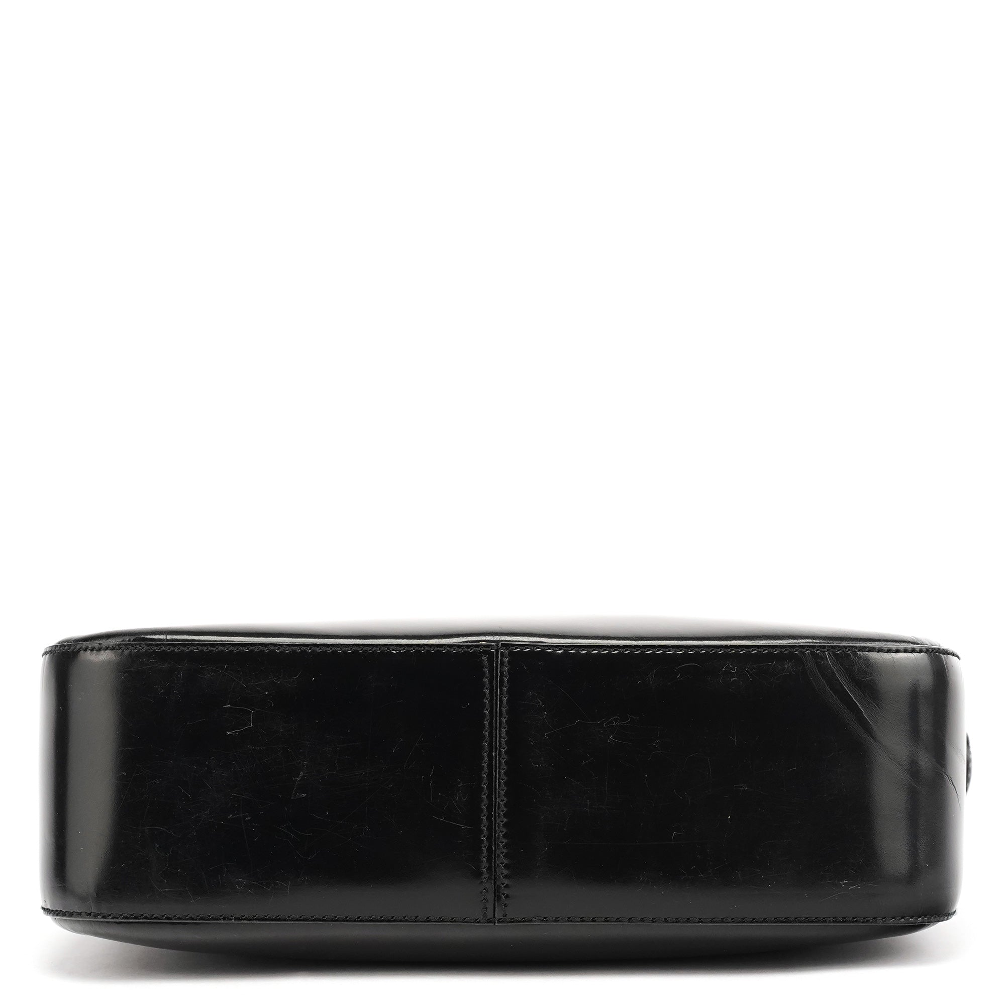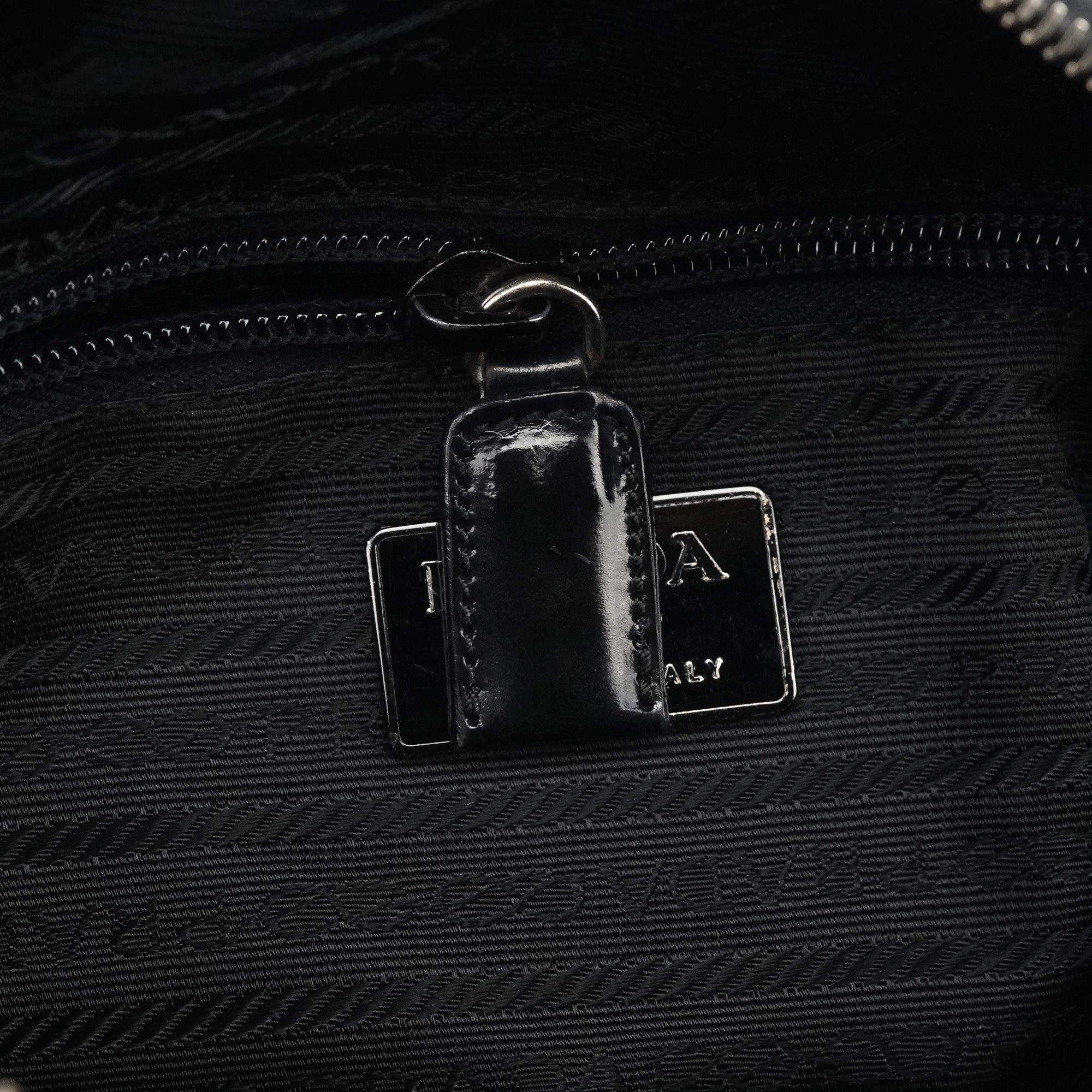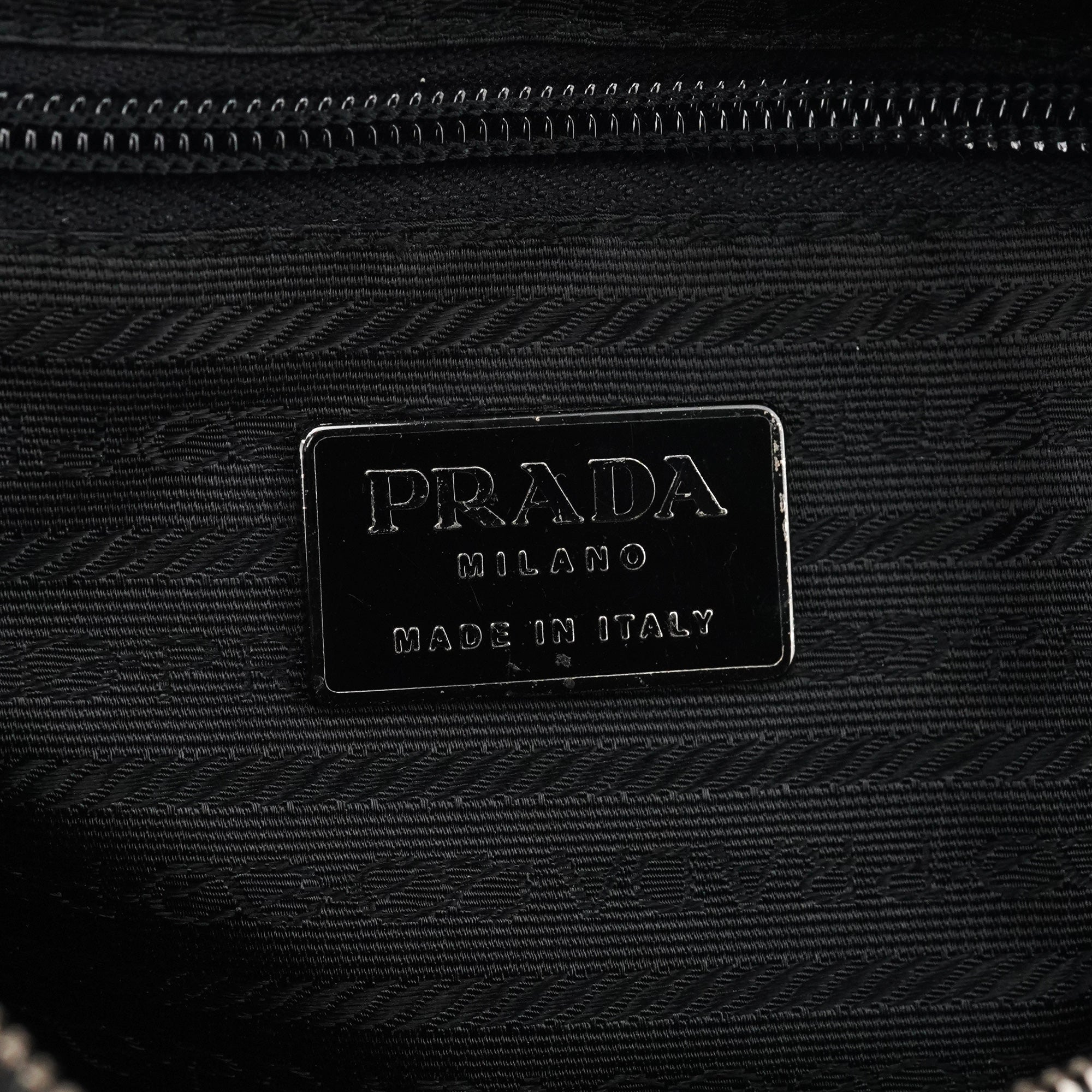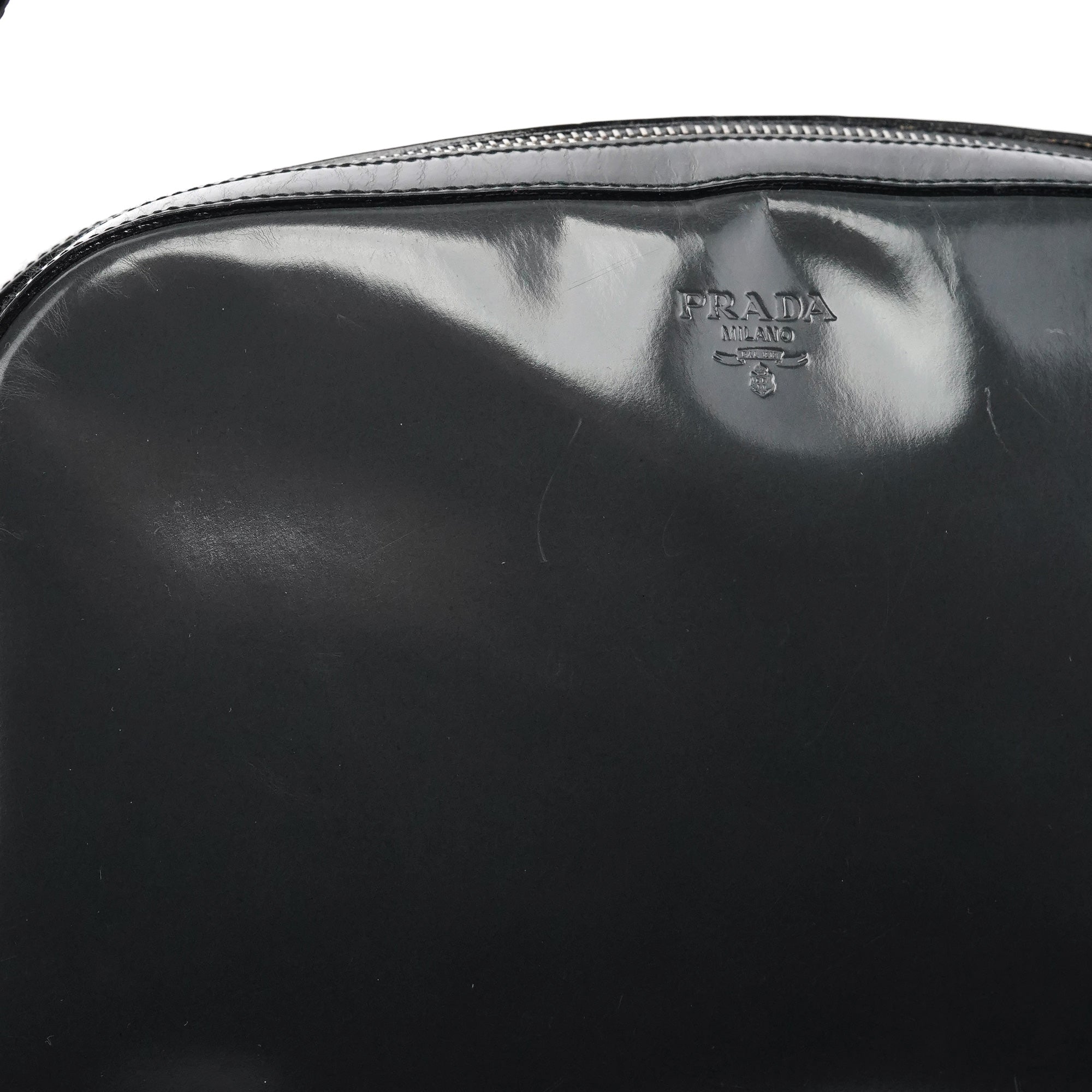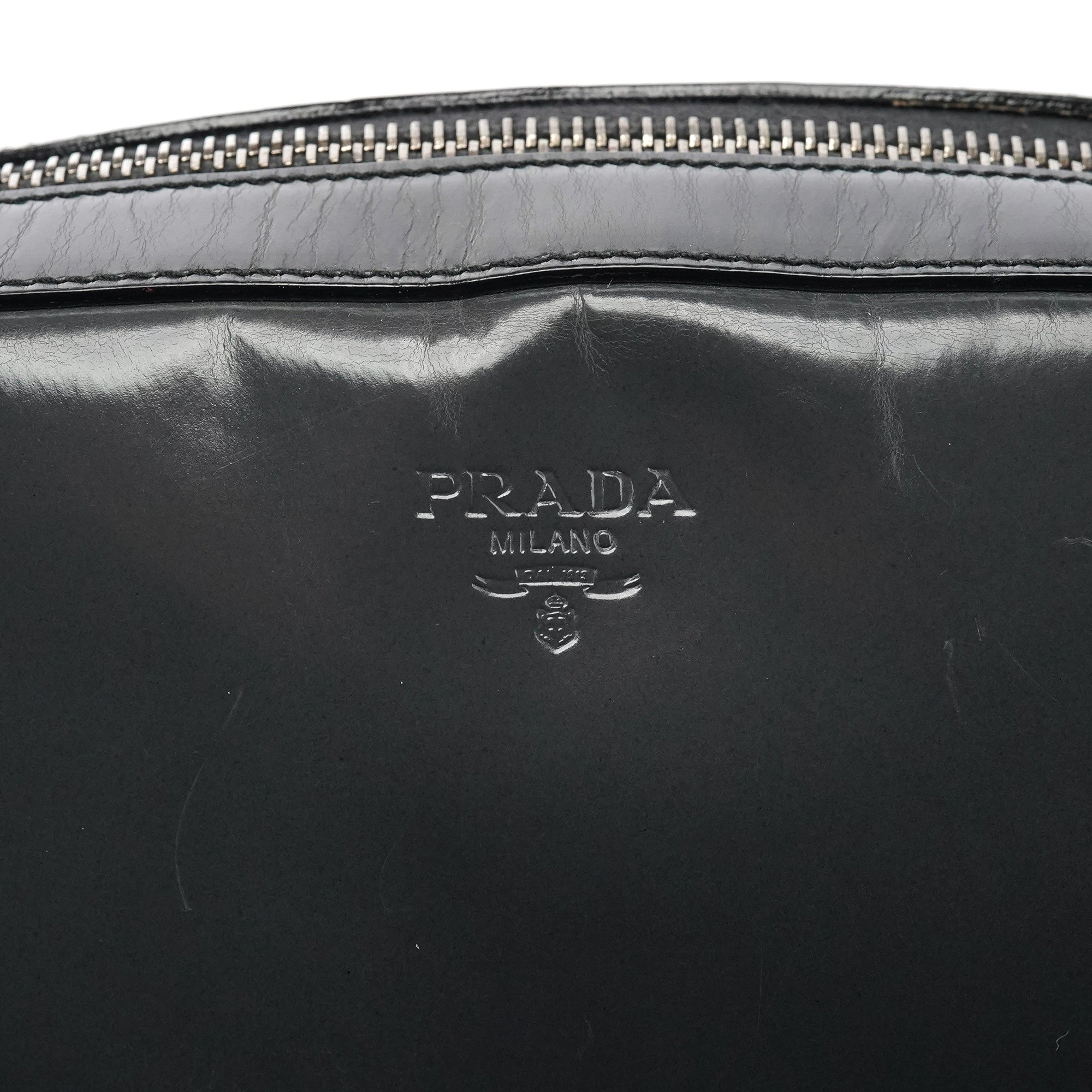 Designed in the early 2000s by Miuccia Prada, this shoulder bag is crafted from anthracite spazzolato leather with a soft gradient finish. The structured silhouette features a swivel handle, zip closure, and jacquard-lined interior with a metal Prada logo plaque—reflecting the sleek, modern minimalism that defined the era.