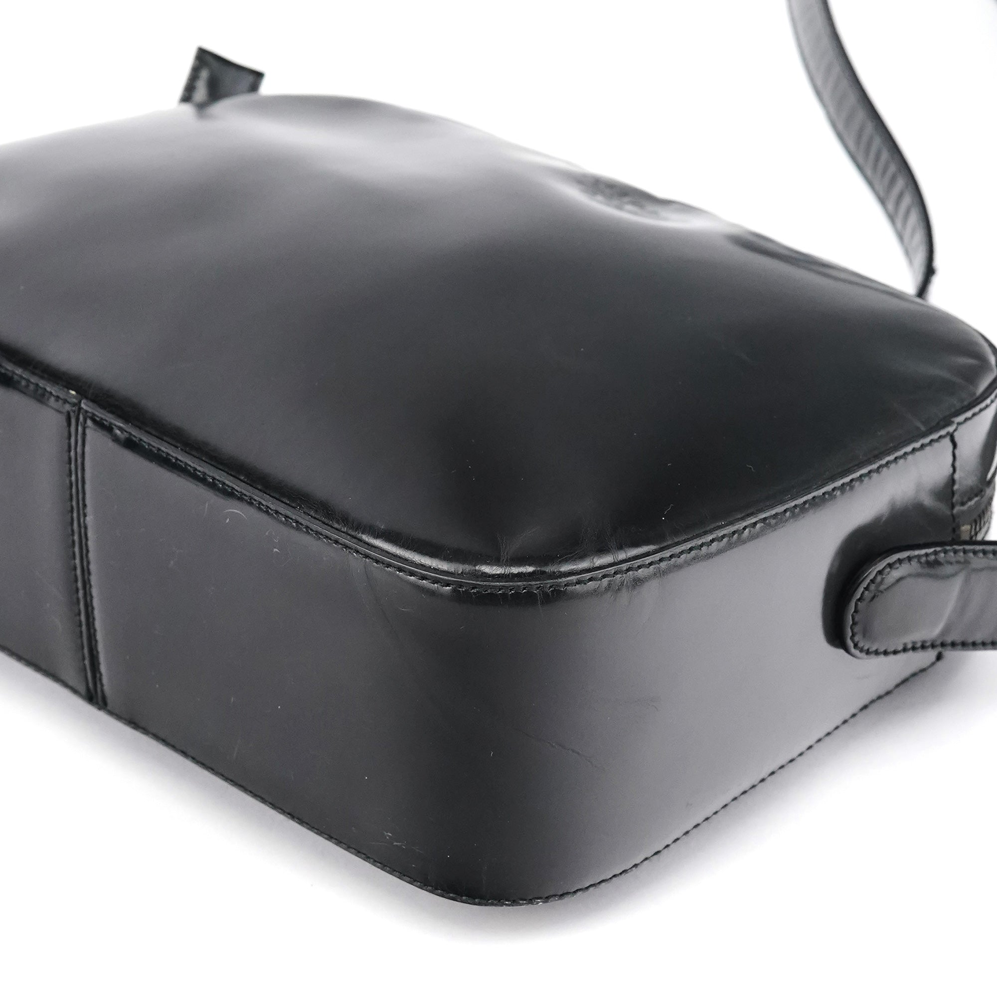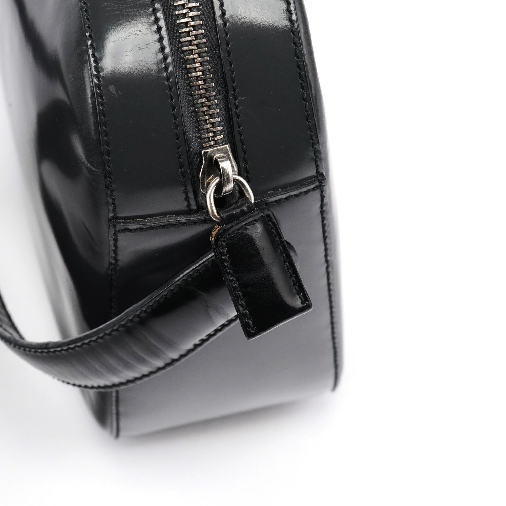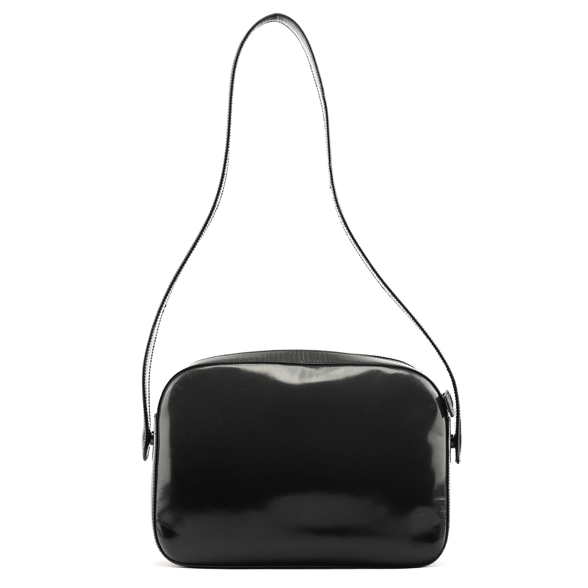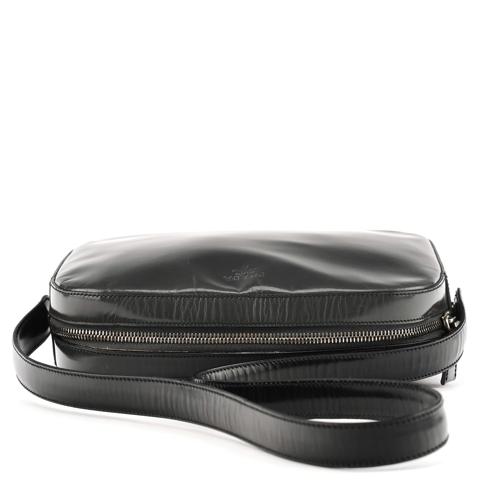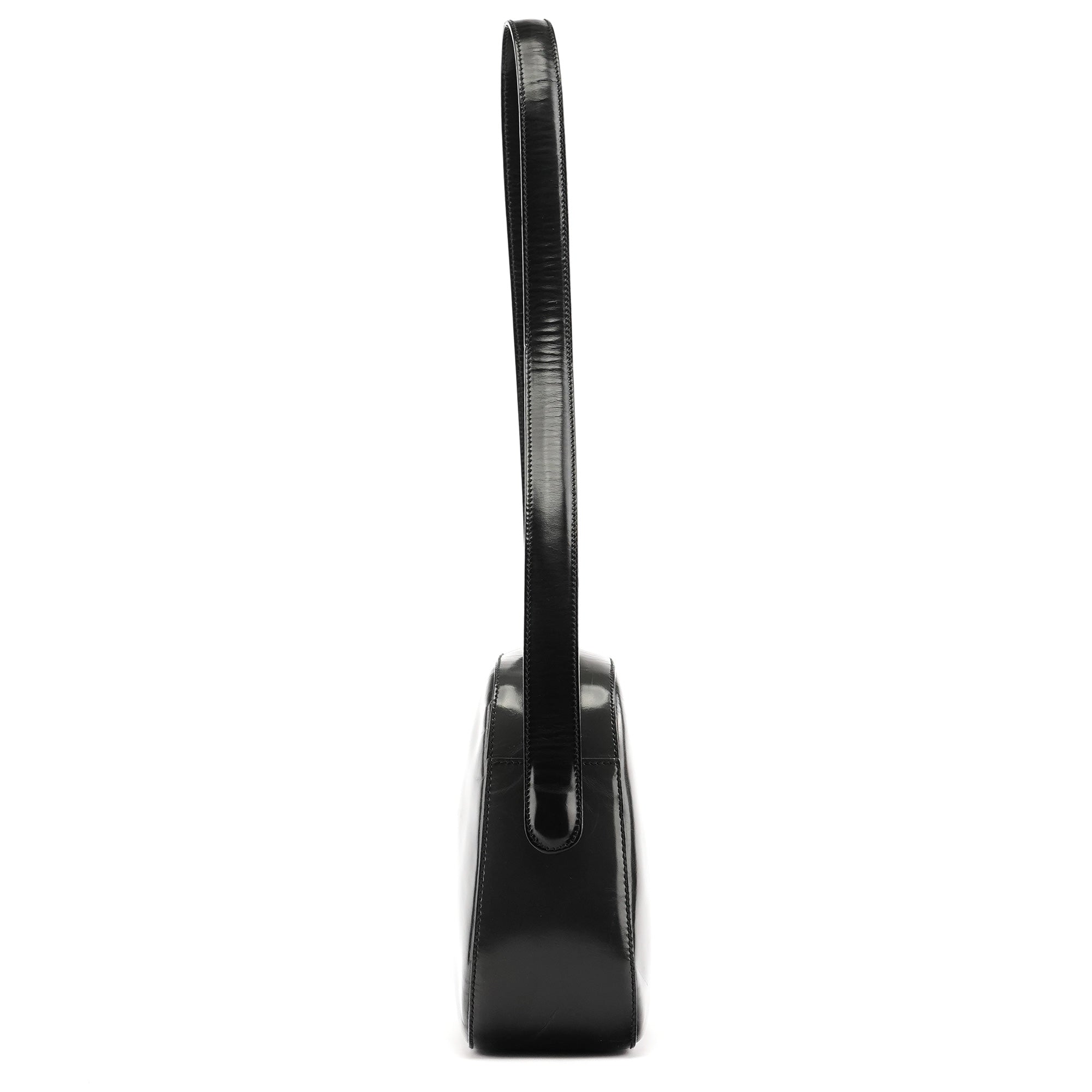 Designed in the early 2000s by Miuccia Prada, this shoulder bag is crafted from anthracite spazzolato leather with a soft gradient finish. The structured silhouette features a swivel handle, zip closure, and jacquard-lined interior with a metal Prada logo plaque—reflecting the sleek, modern minimalism that defined the era.