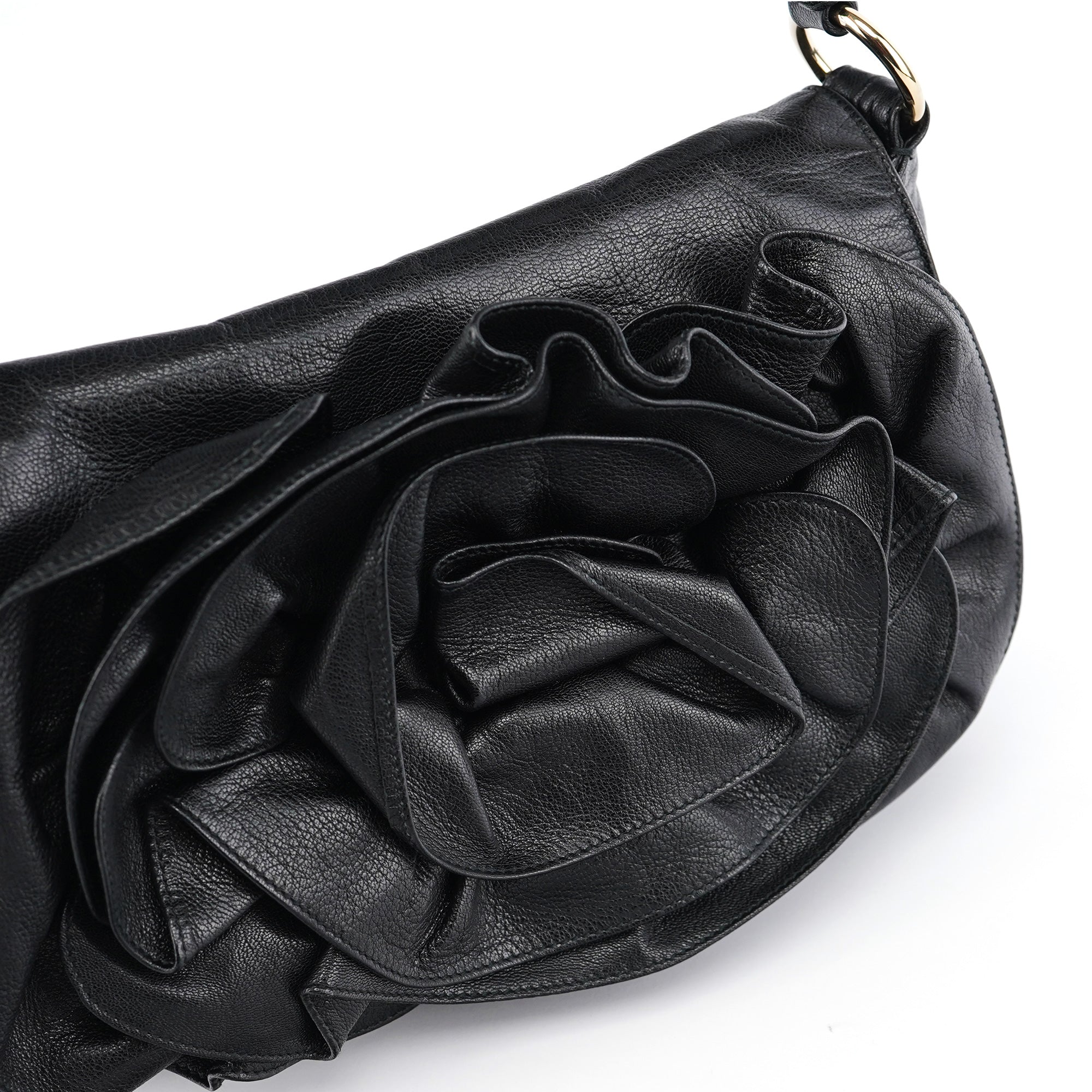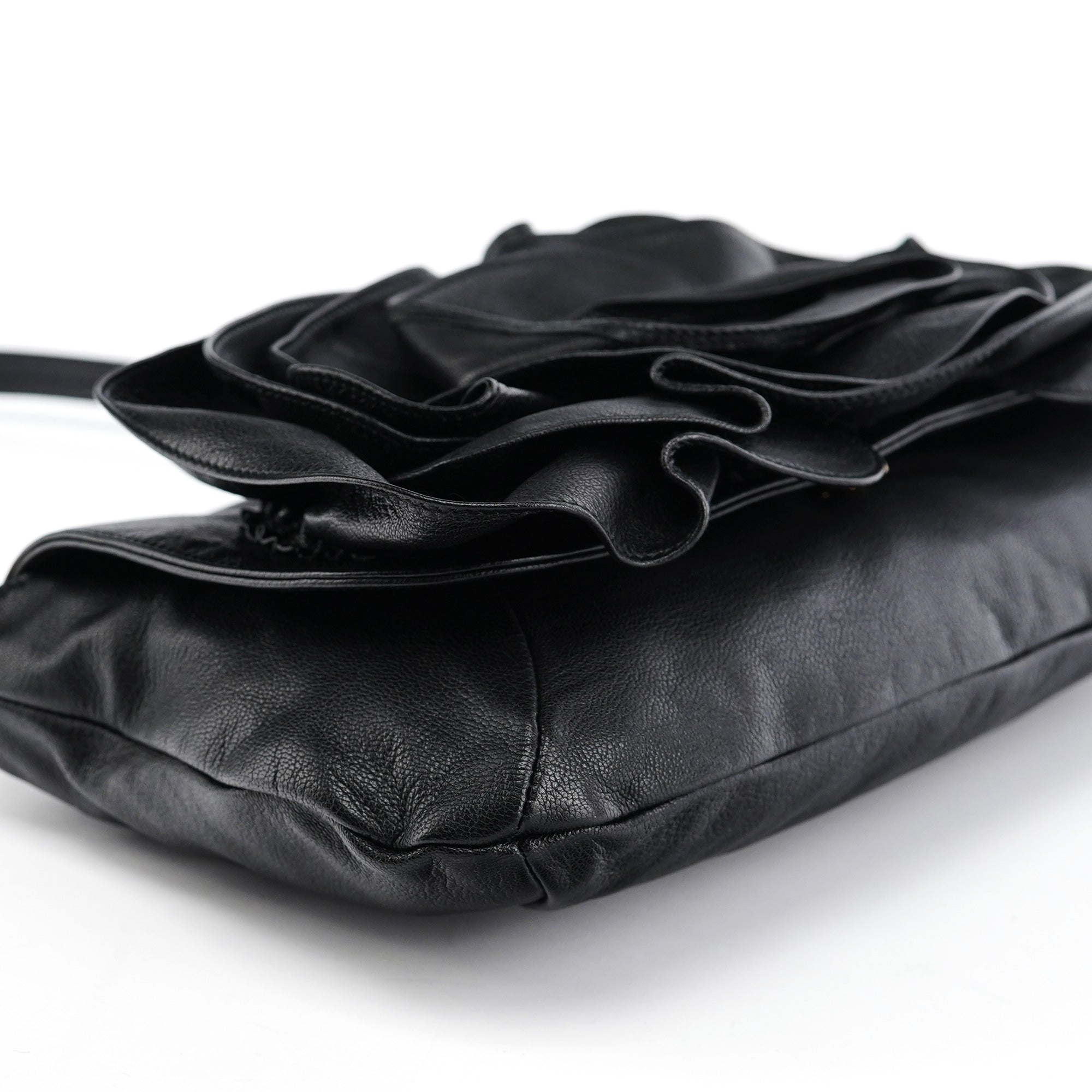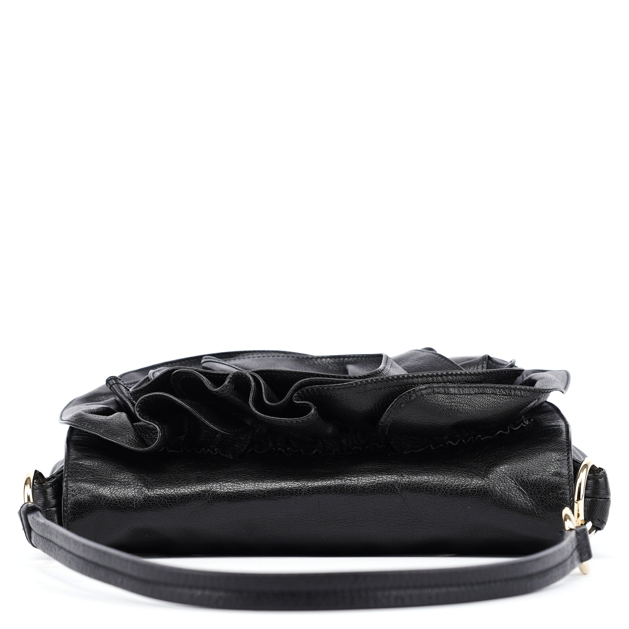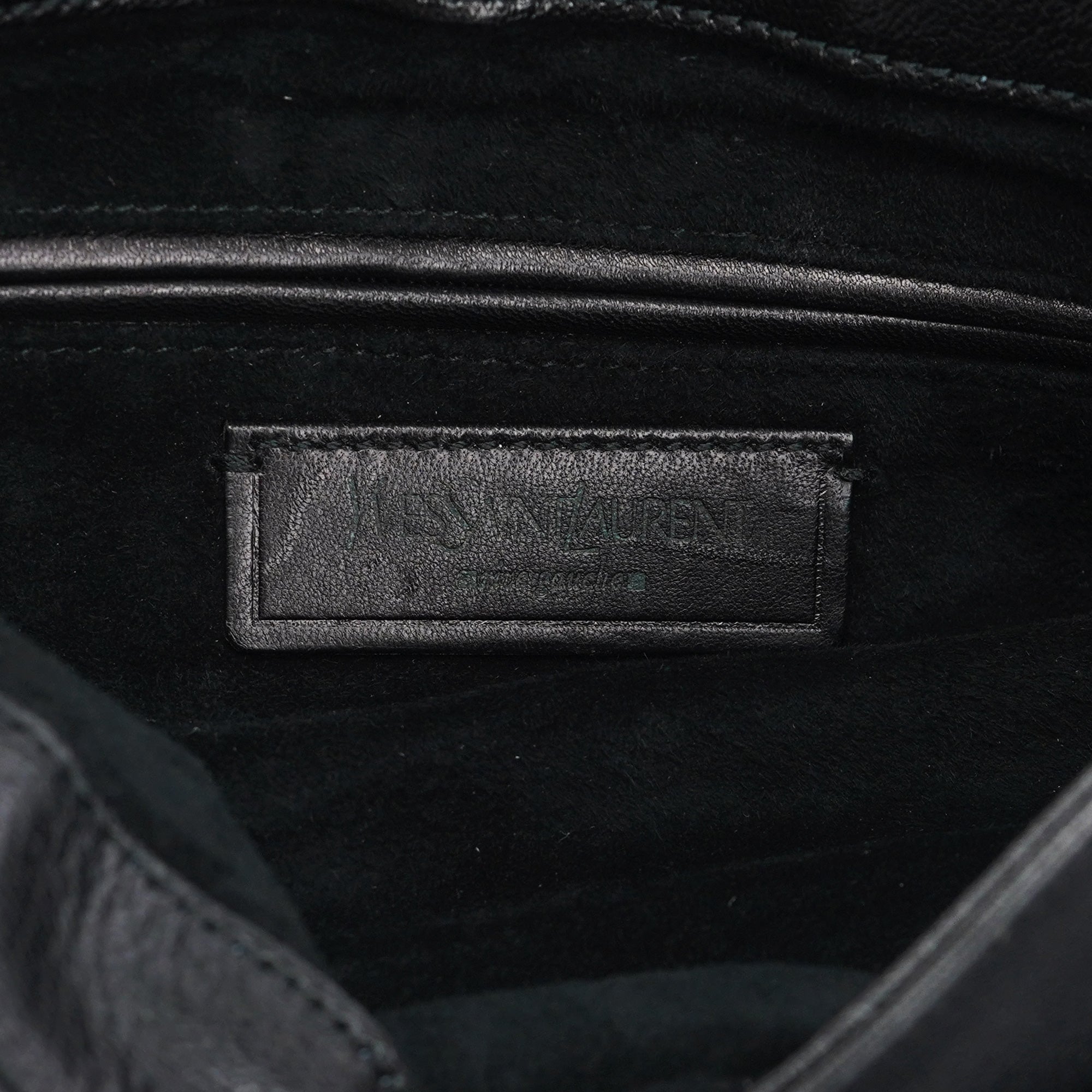 Designed for the 2003 collection by Tom Ford, this vintage Yves Saint Laurent Nadja shoulder bag was crafted from black calfskin leather. The distinctive gathered silhouette features soft ruching across the body, a single shoulder strap, top zip closure, and a suede-lined interior. The supple leather and sculptural draping create a signature look from Ford's celebrated tenure at the house.