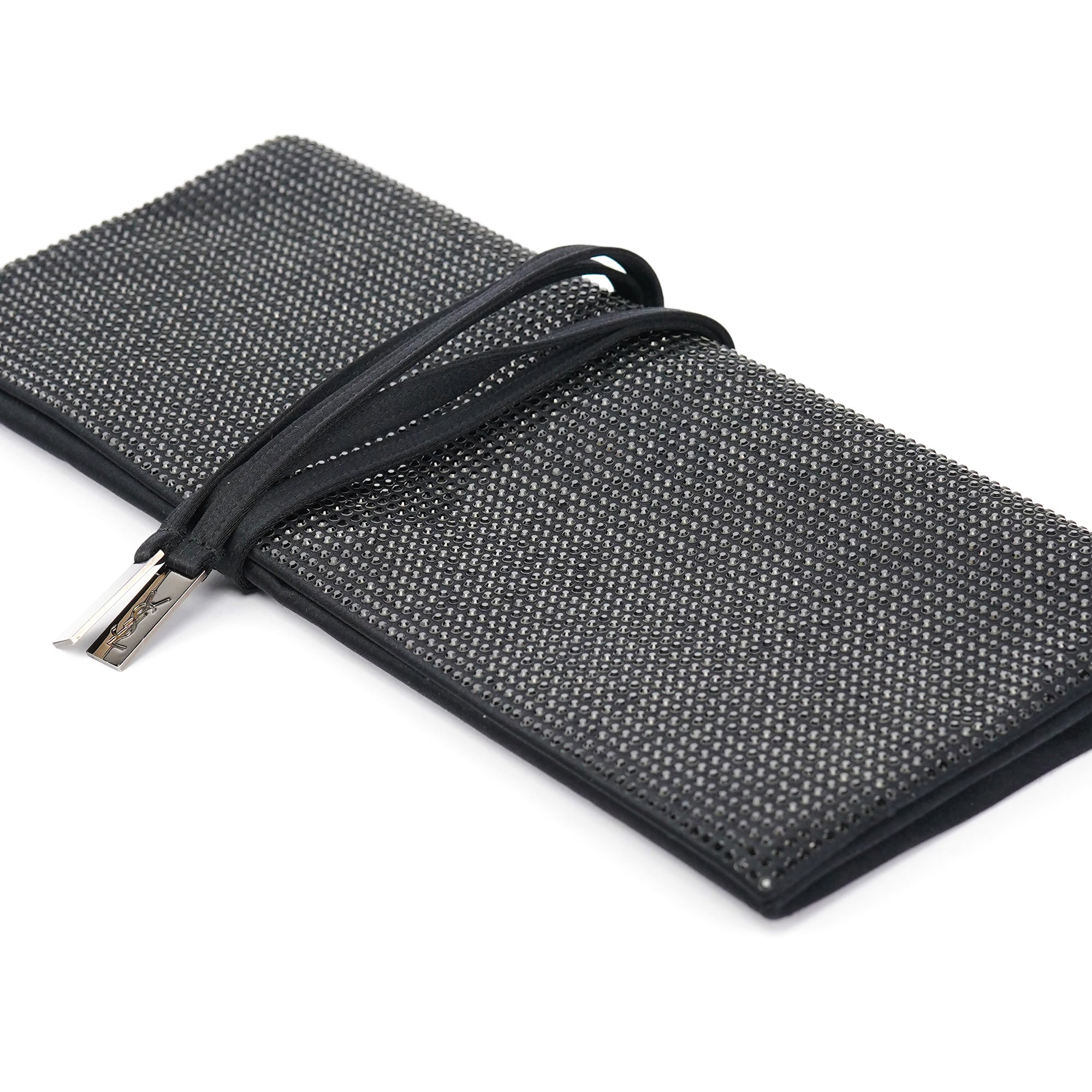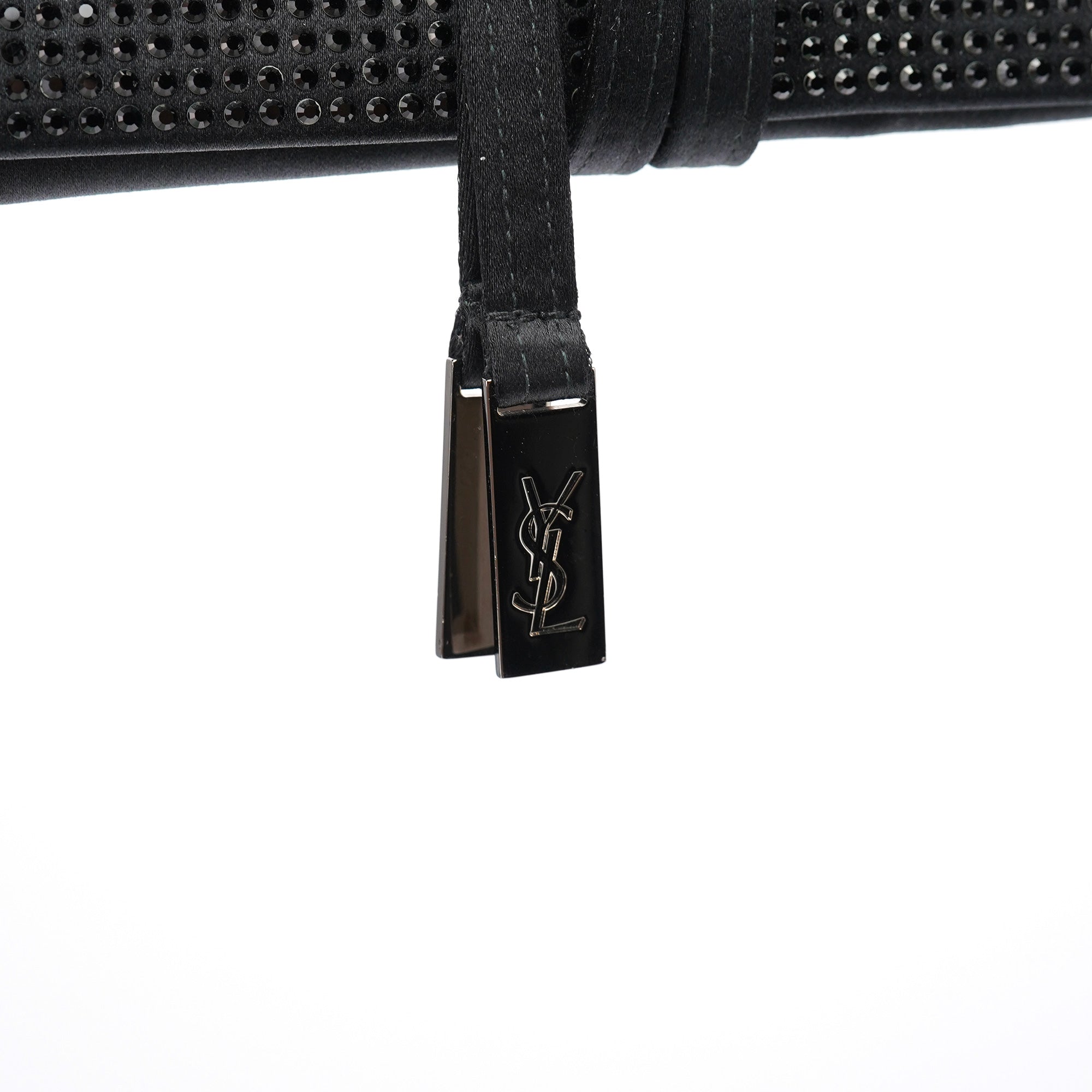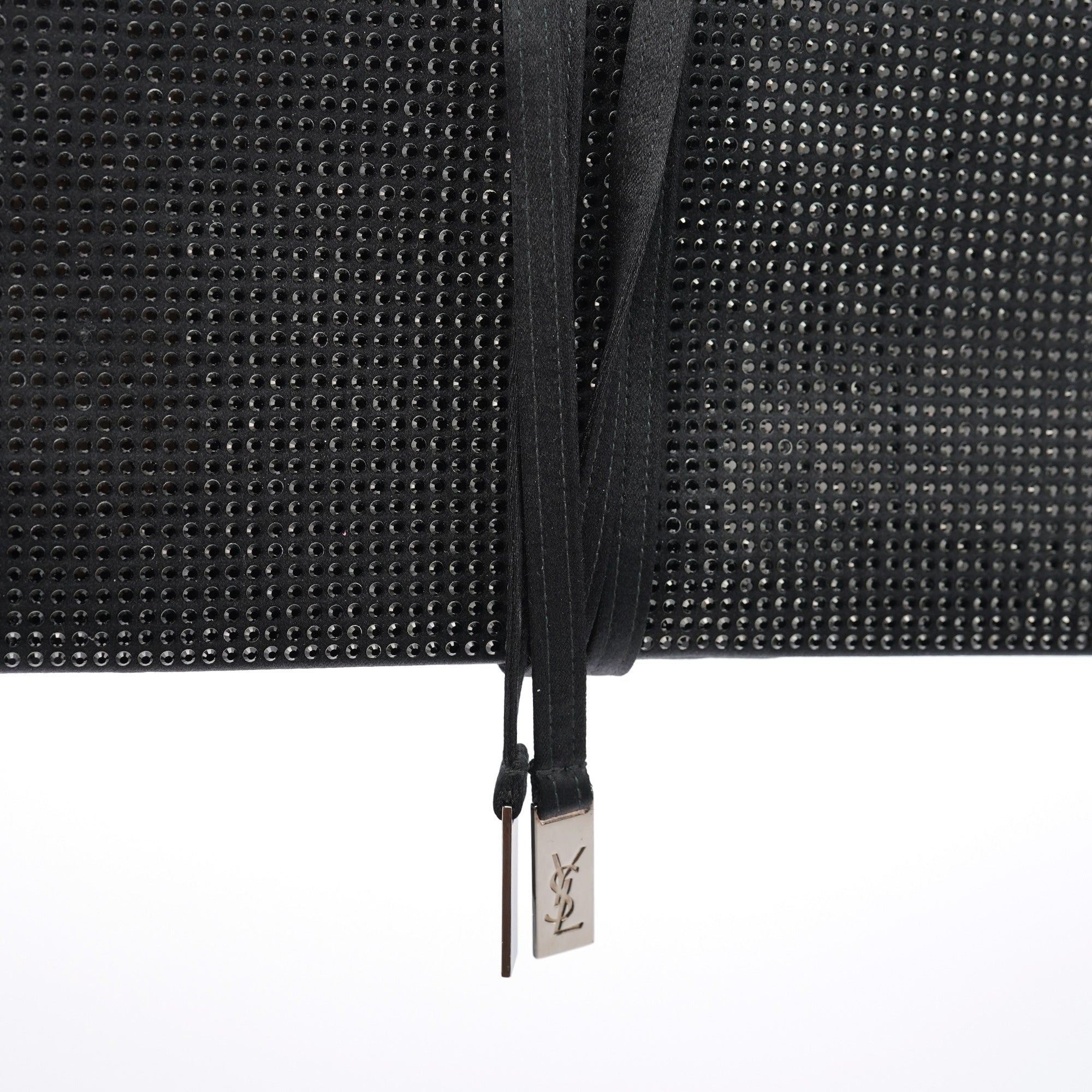 Designed by Tom Ford in the early 2000s, this Yves Saint Laurent clutch is crafted in black satin with an exterior fully encrusted in tonal crystals. The structured rectangular silhouette is wrapped with a suede tie detail ending in anthracite metal YSL tips. The magnetic flap closure opens to a satin-lined interior with a single zip pocket, finished with the Saint Laurent rive gauche logo.