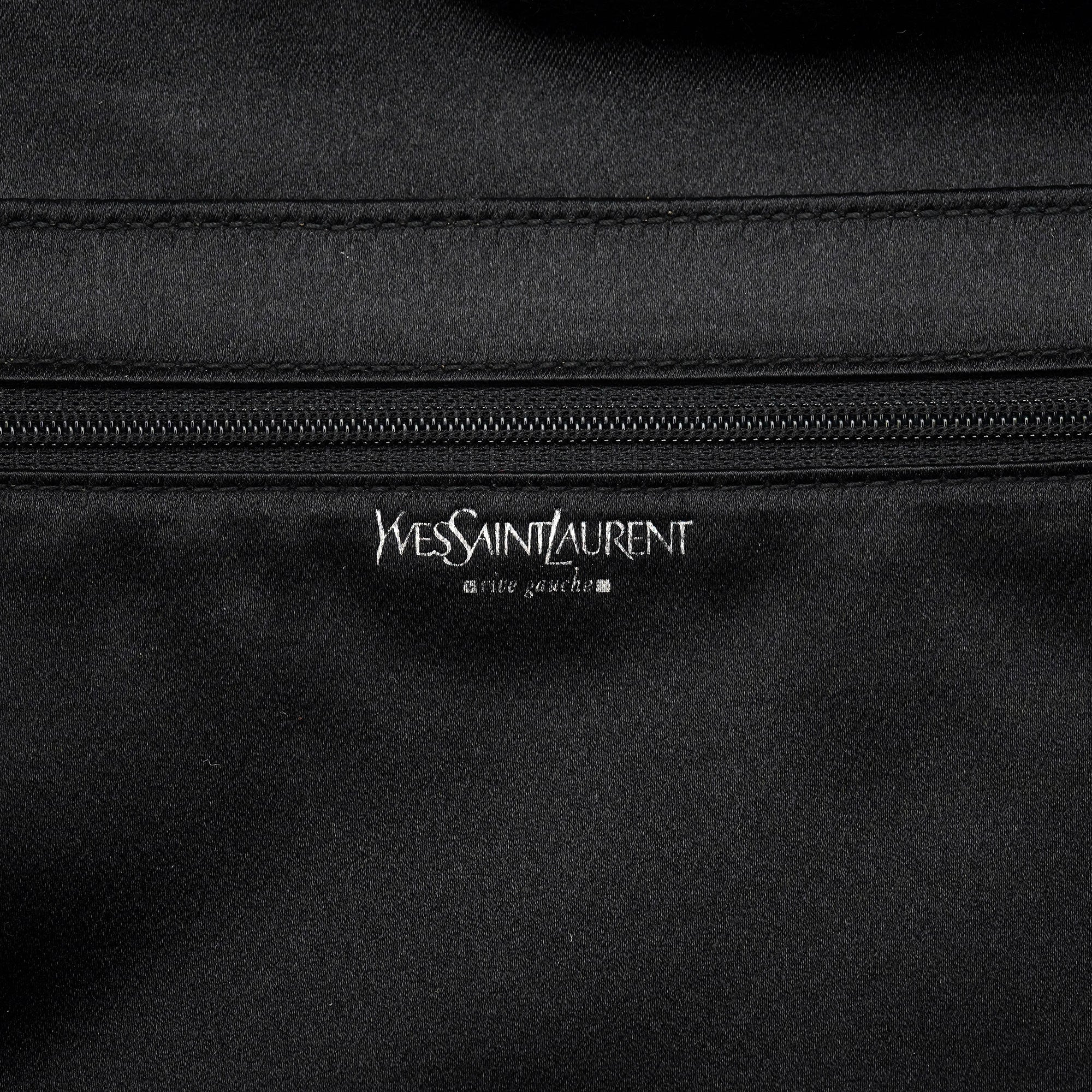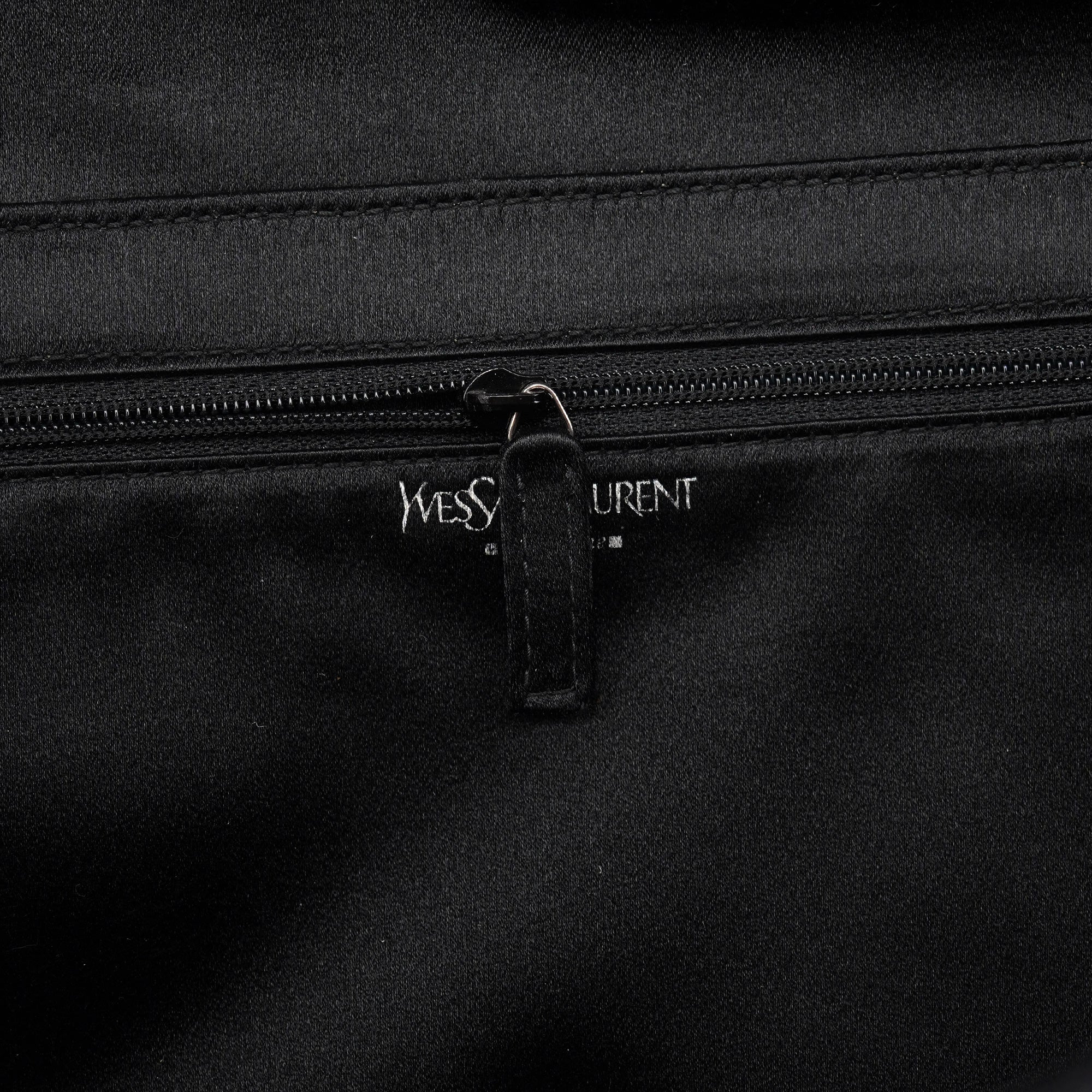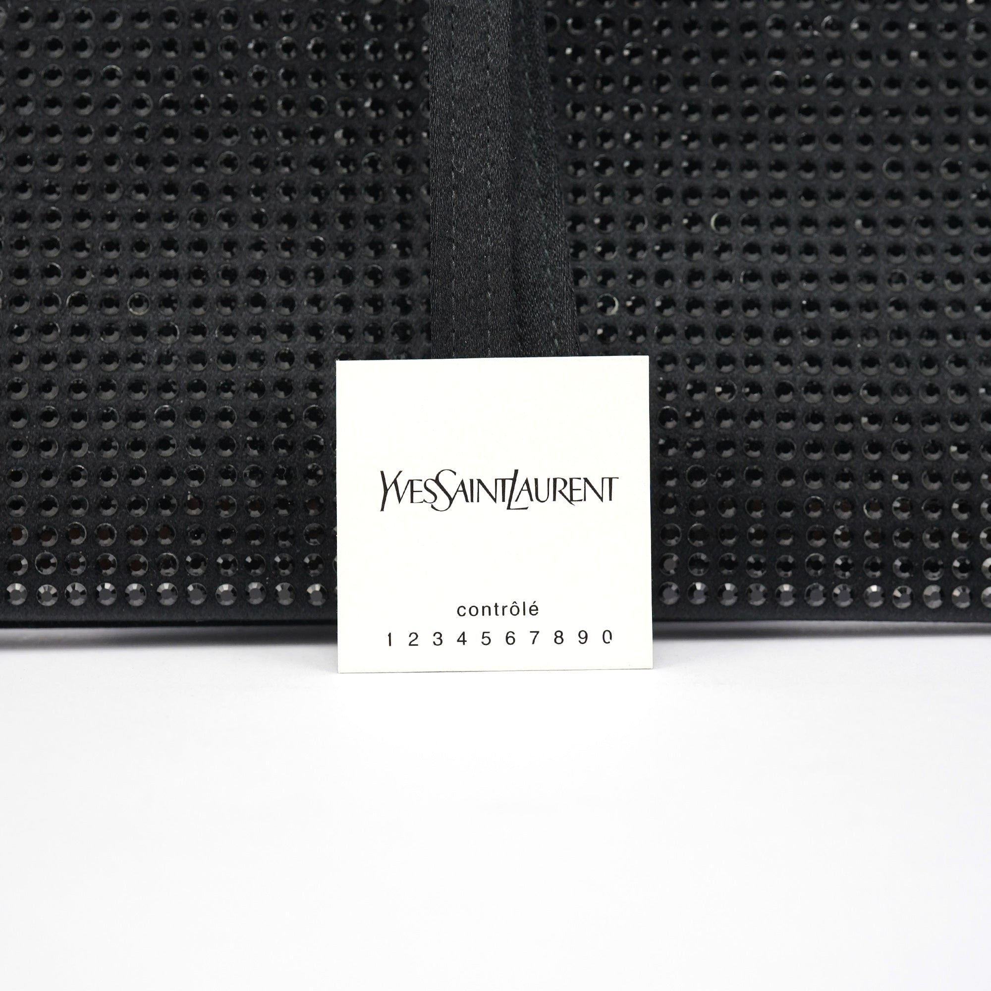 Designed by Tom Ford in the early 2000s, this Yves Saint Laurent clutch is crafted in black satin with an exterior fully encrusted in tonal crystals. The structured rectangular silhouette is wrapped with a suede tie detail ending in anthracite metal YSL tips. The magnetic flap closure opens to a satin-lined interior with a single zip pocket, finished with the Saint Laurent rive gauche logo.