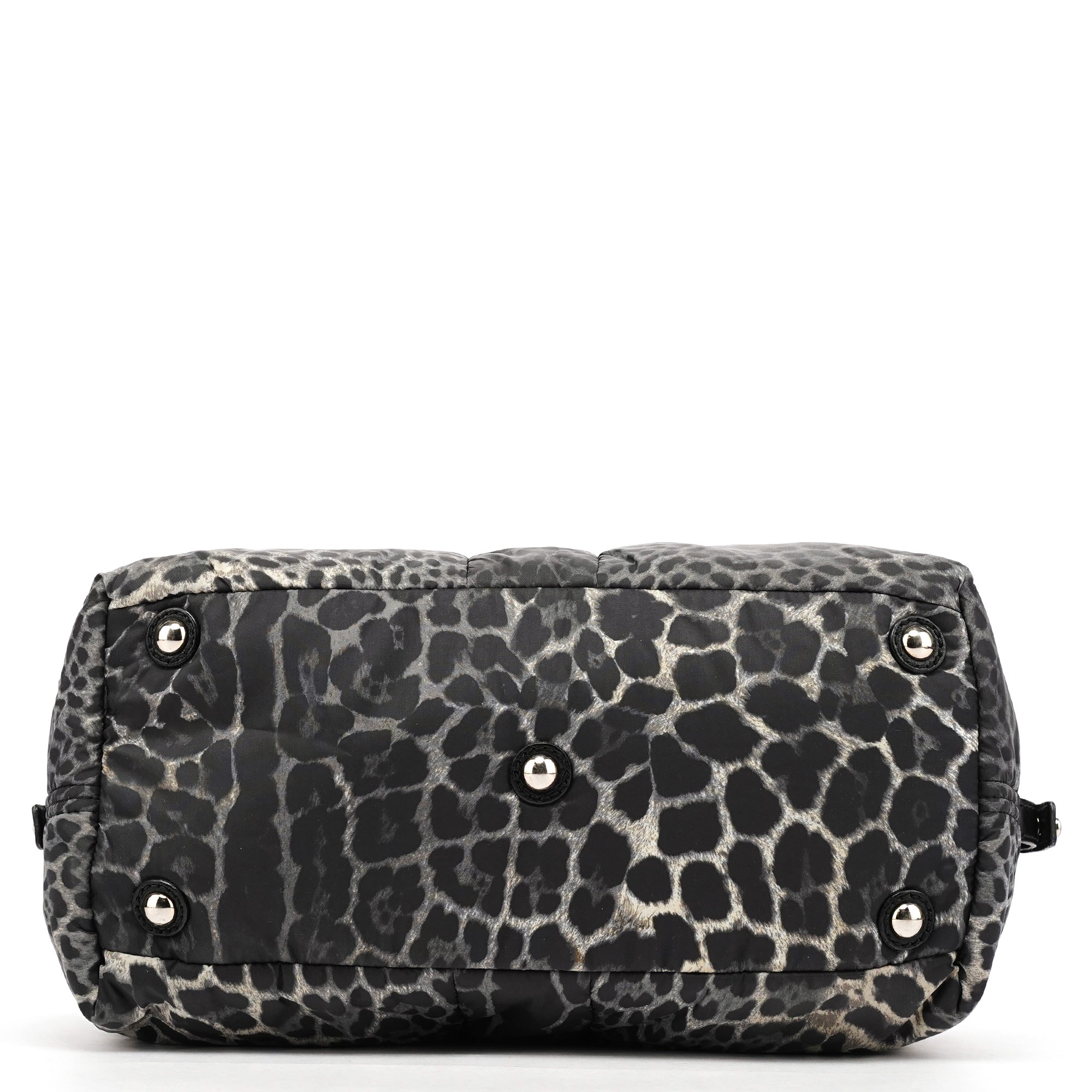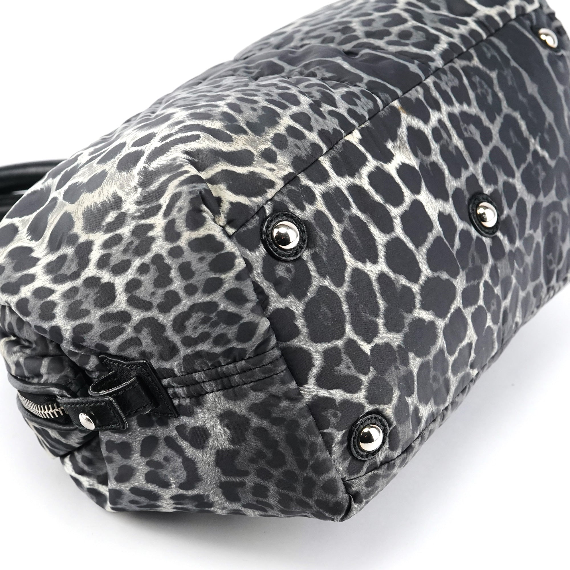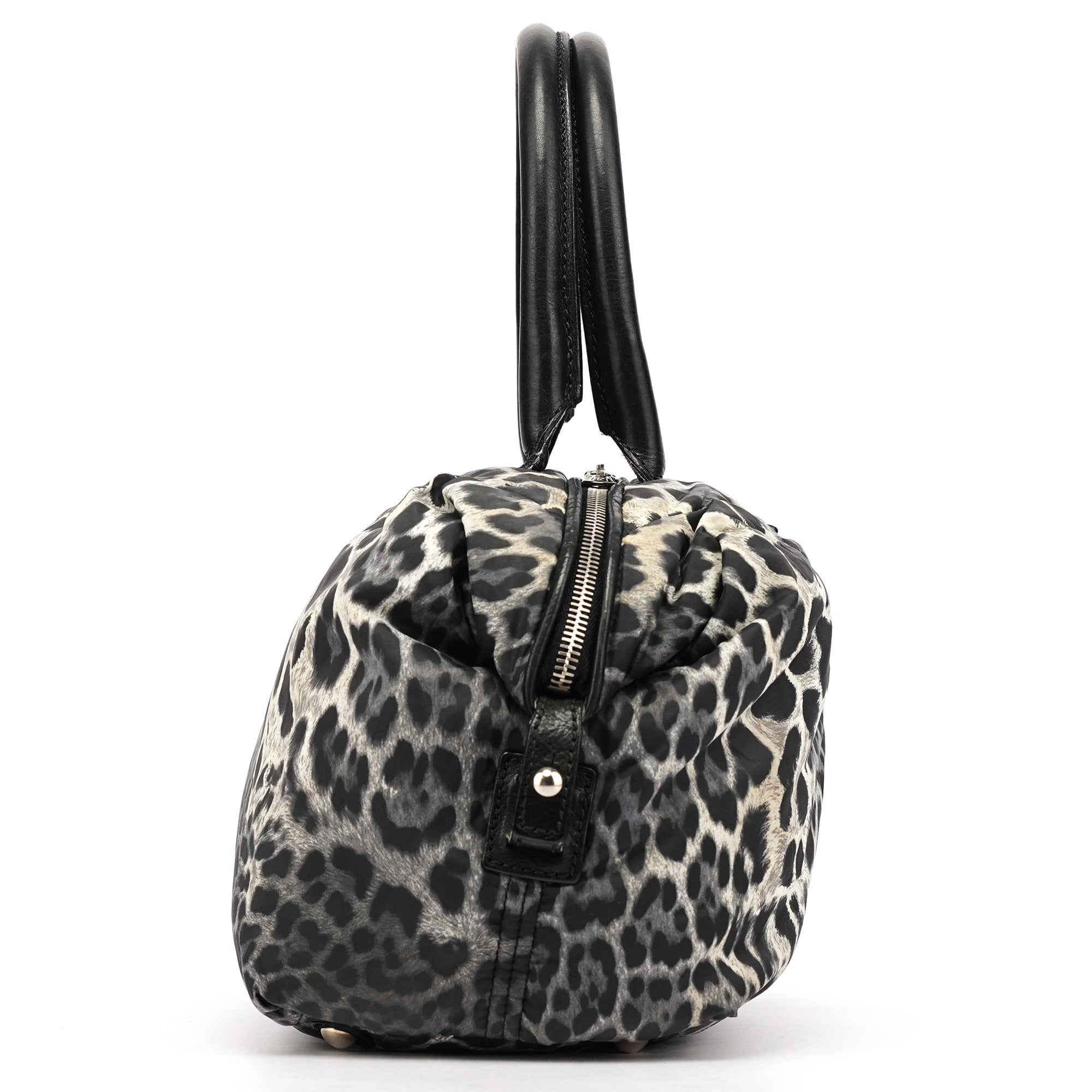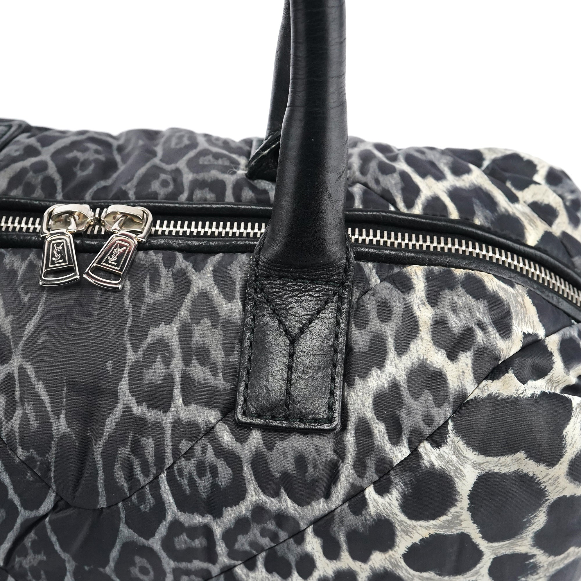 Designed in the late 2000s, this YSL Y Boston bag features padded nylon in a gray and black leopard print nylon, quilted classic Y pattern. The rounded boston silhouette is accented with black leather trim and dual rolled top handles. It includes a double zipper closure with silver-tone hardware and a spacious leopard-print nylon lining.
