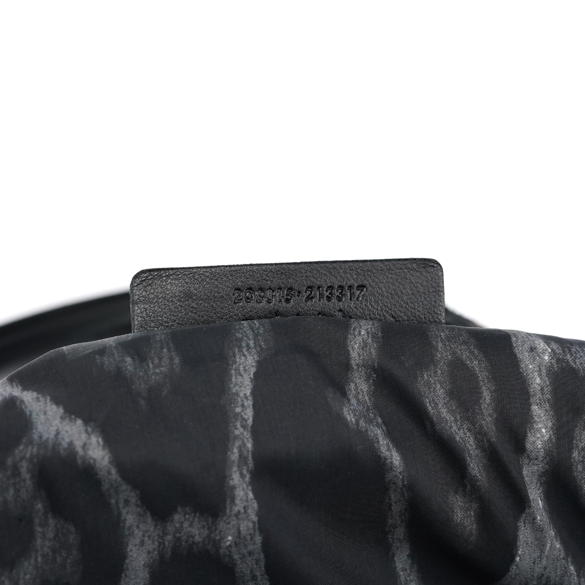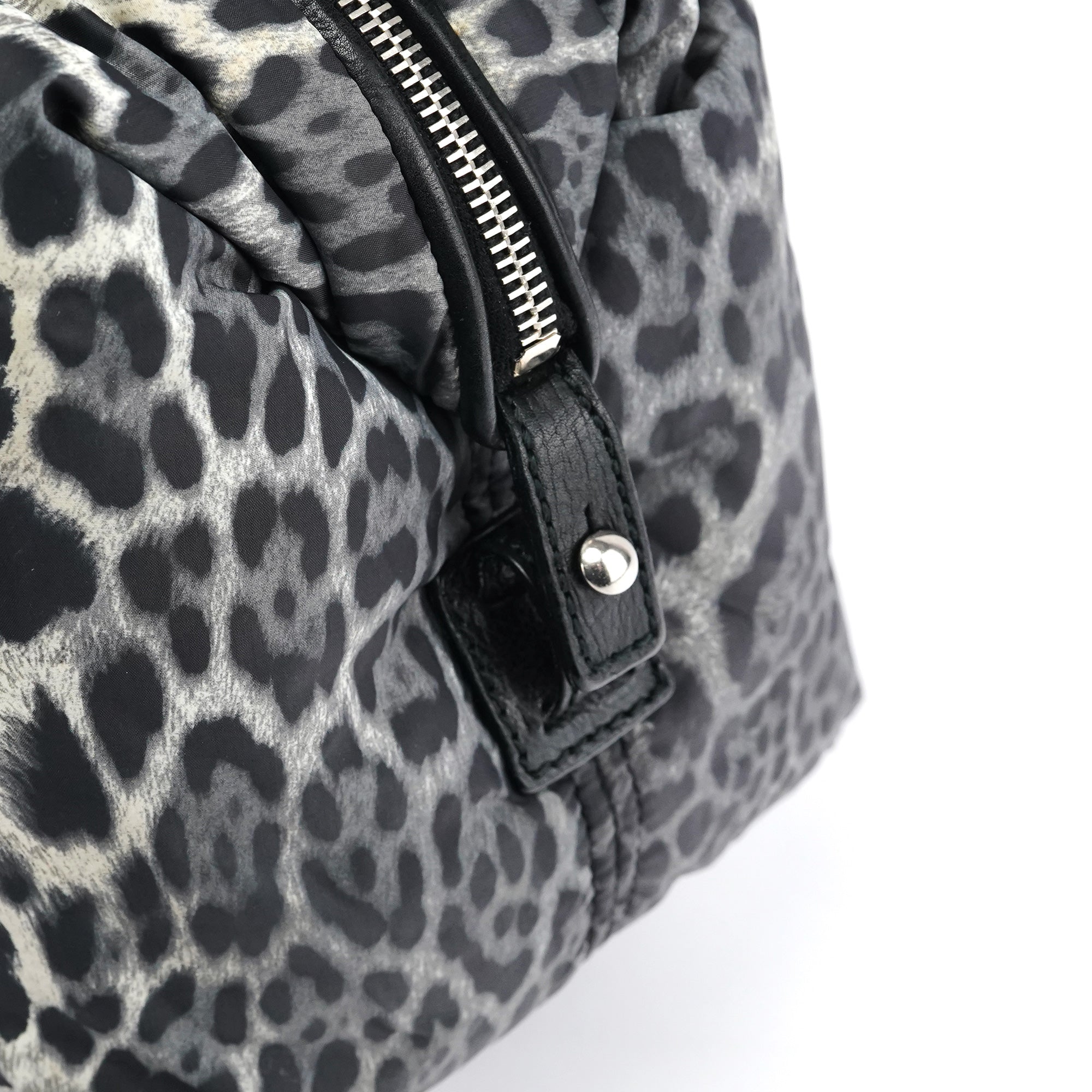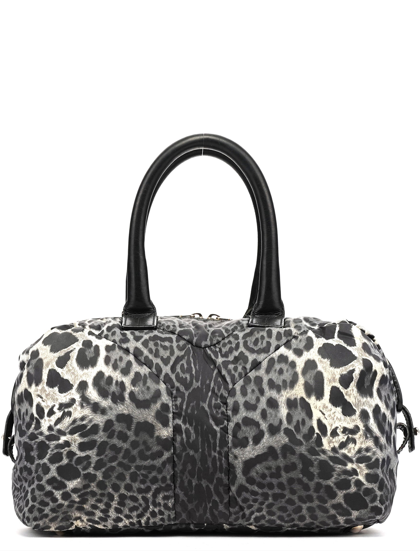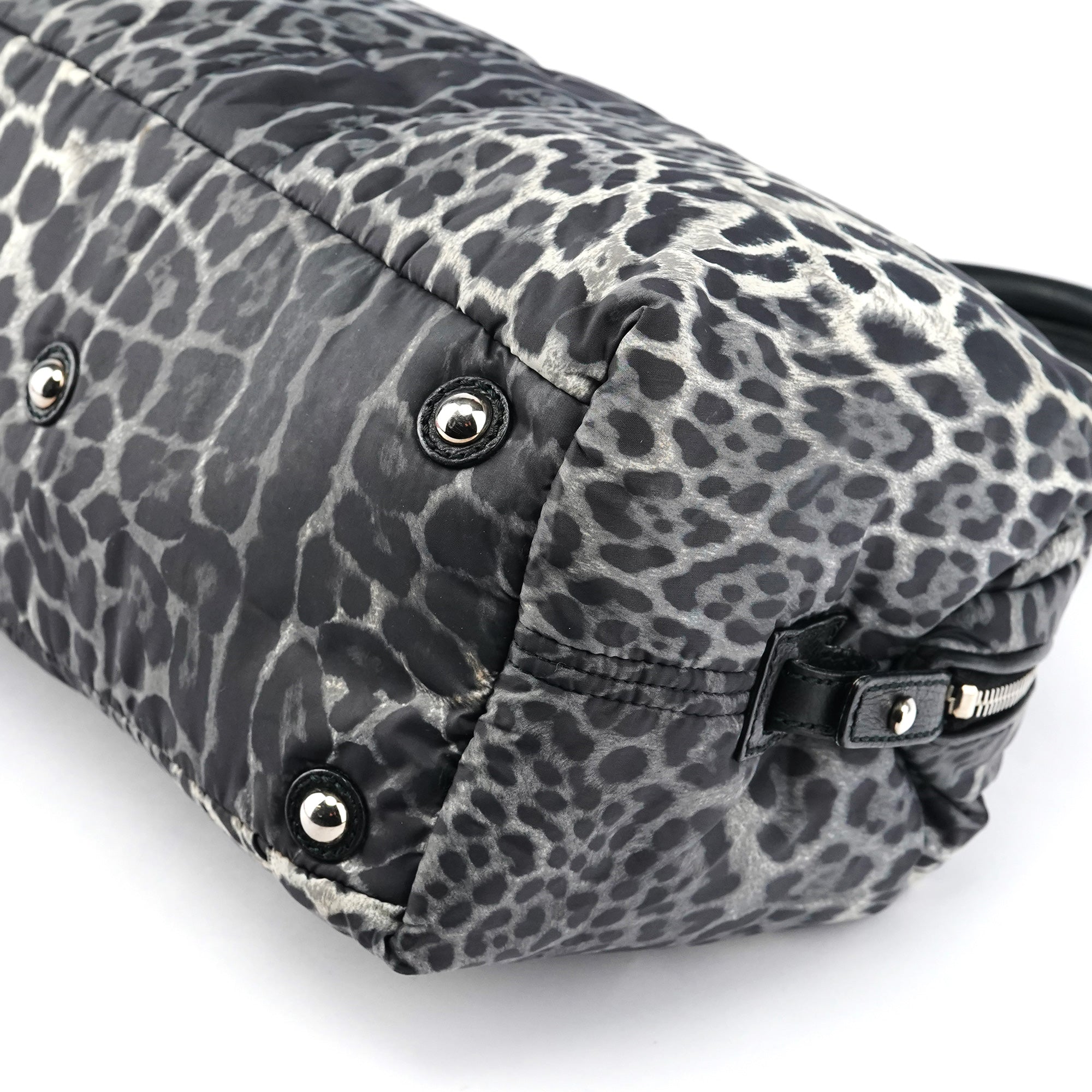 Designed in the late 2000s, this YSL Y Boston bag features padded nylon in a gray and black leopard print nylon, quilted classic Y pattern. The rounded boston silhouette is accented with black leather trim and dual rolled top handles. It includes a double zipper closure with silver-tone hardware and a spacious leopard-print nylon lining.