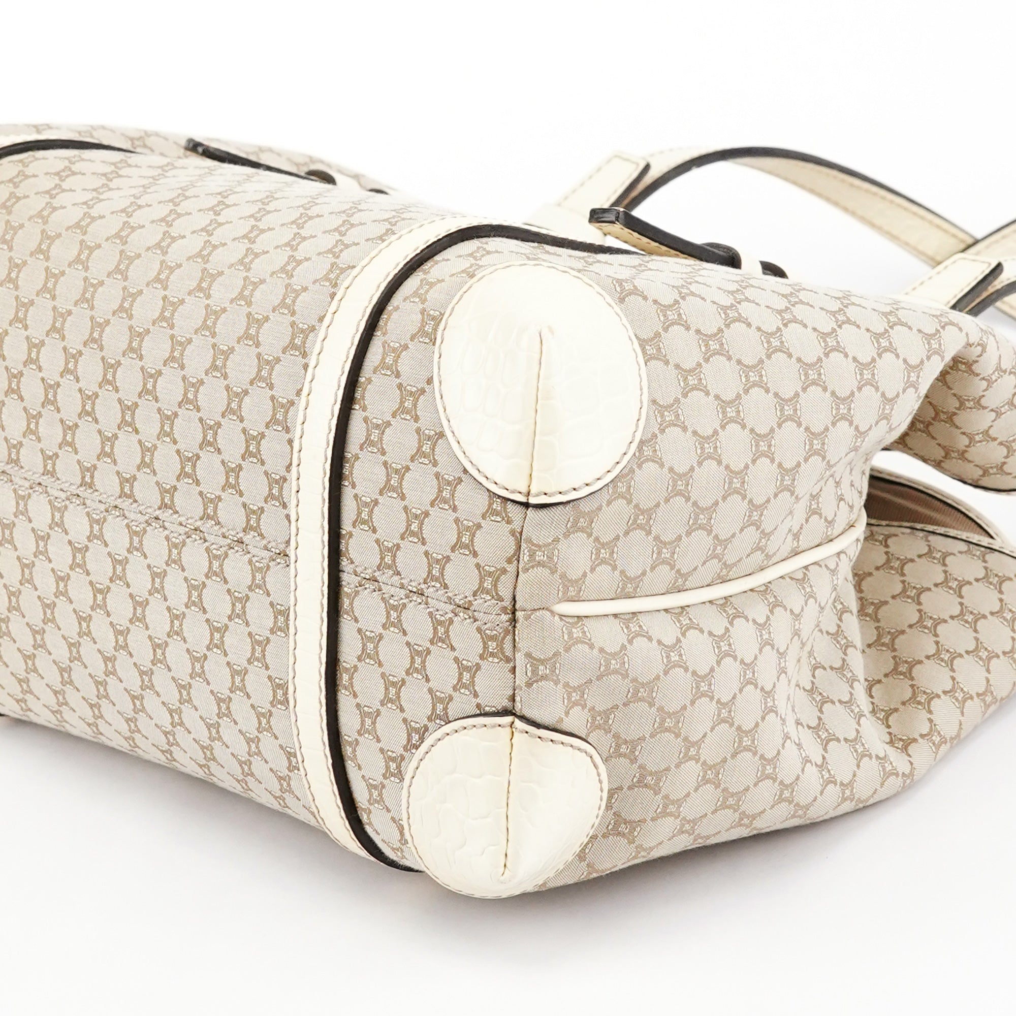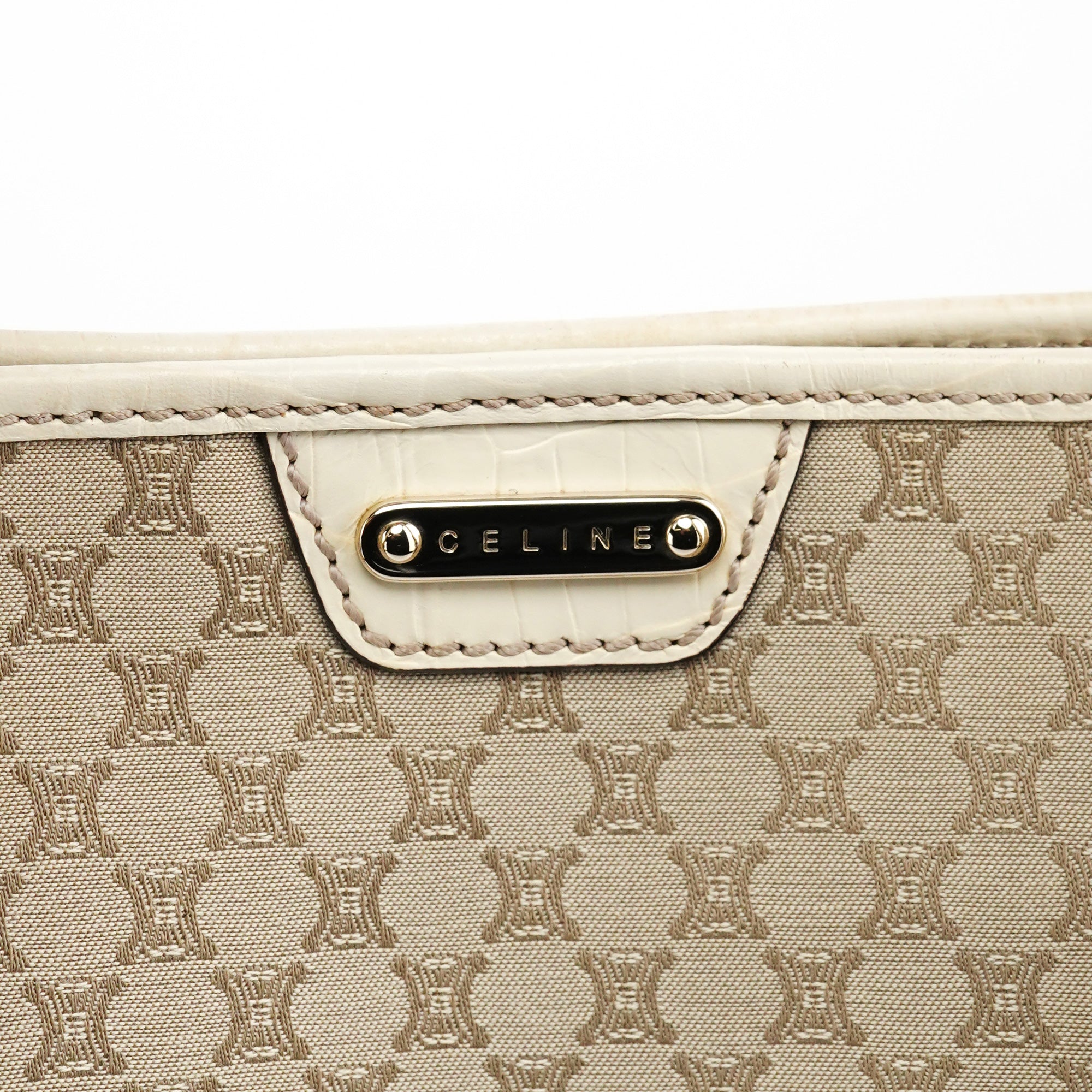 Designed in the late 1990s, this Celine tote bag is handcrafted from beige Triomphe monogram canvas with croc-embossed leather trim. Featuring silver-tone hardware, a magnetic closure, and a cotton-lined interior with a zipper pocket, it is finished with a signature Celine logo plate on the front, combining timeless style with practicality.