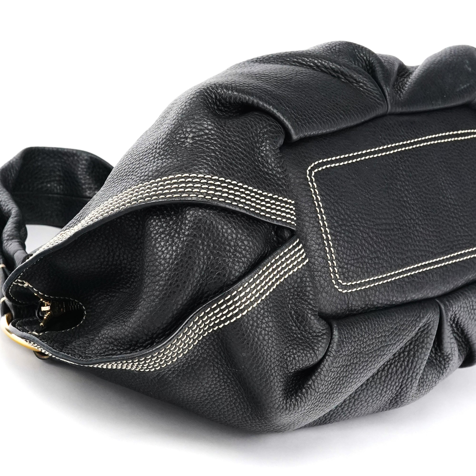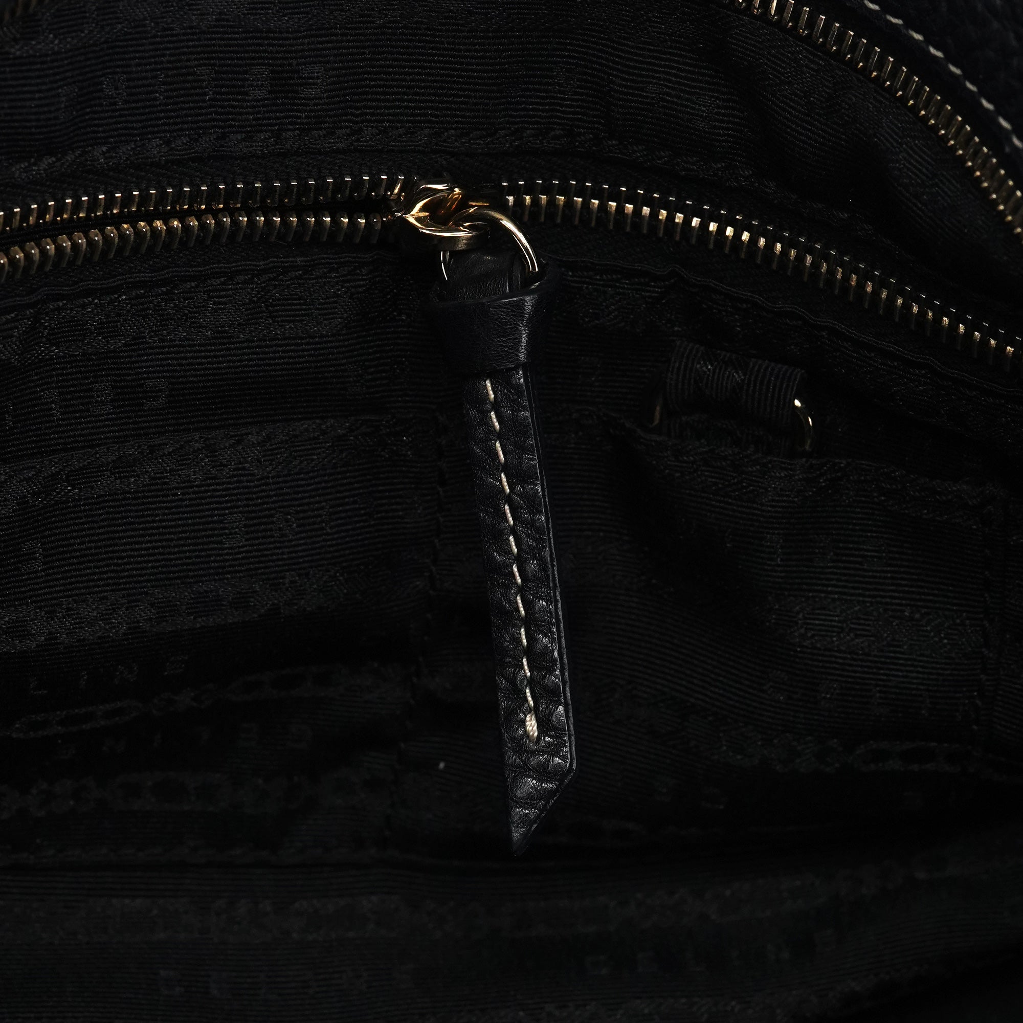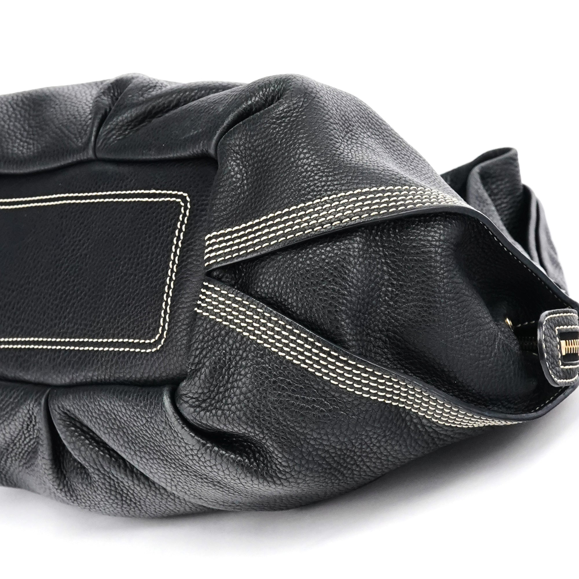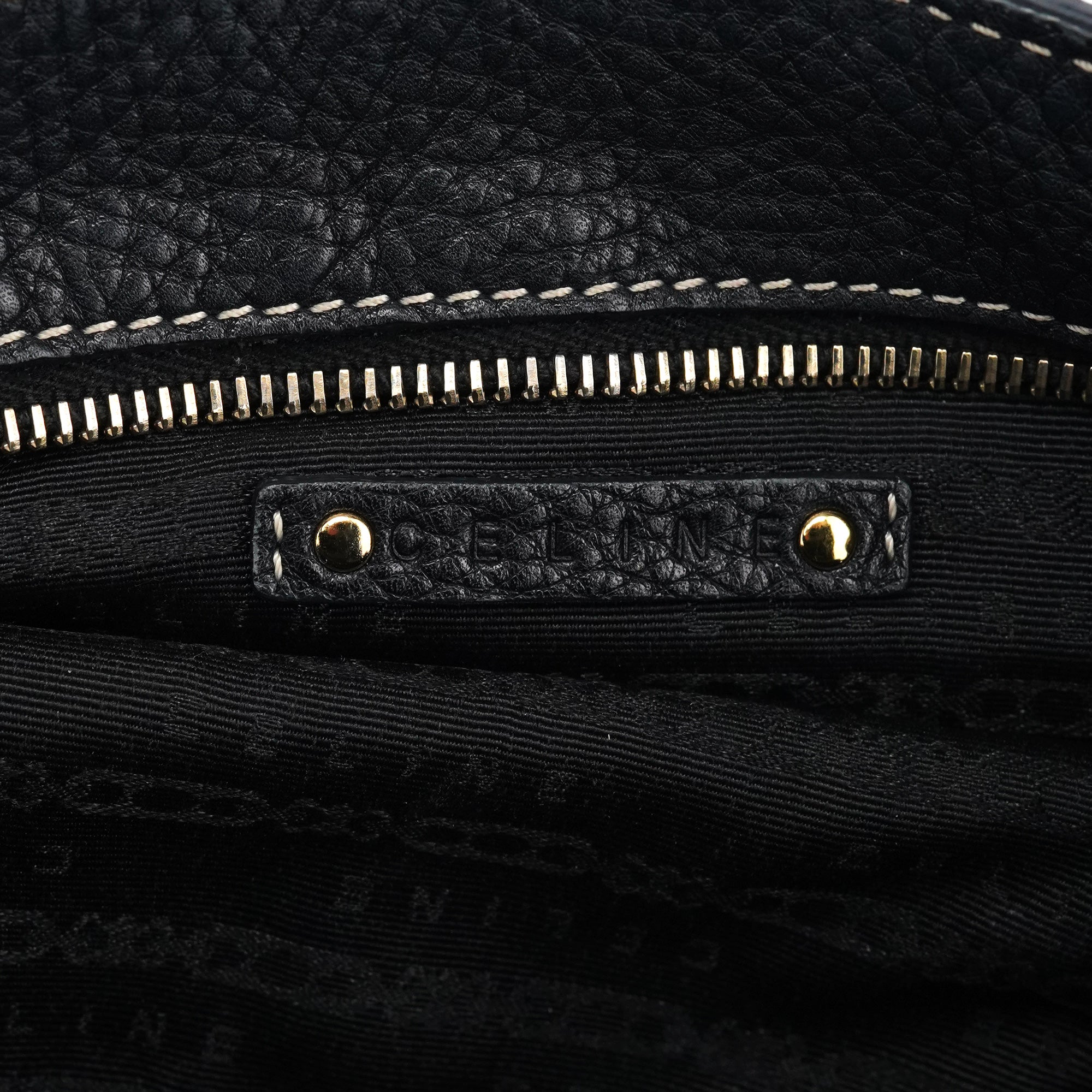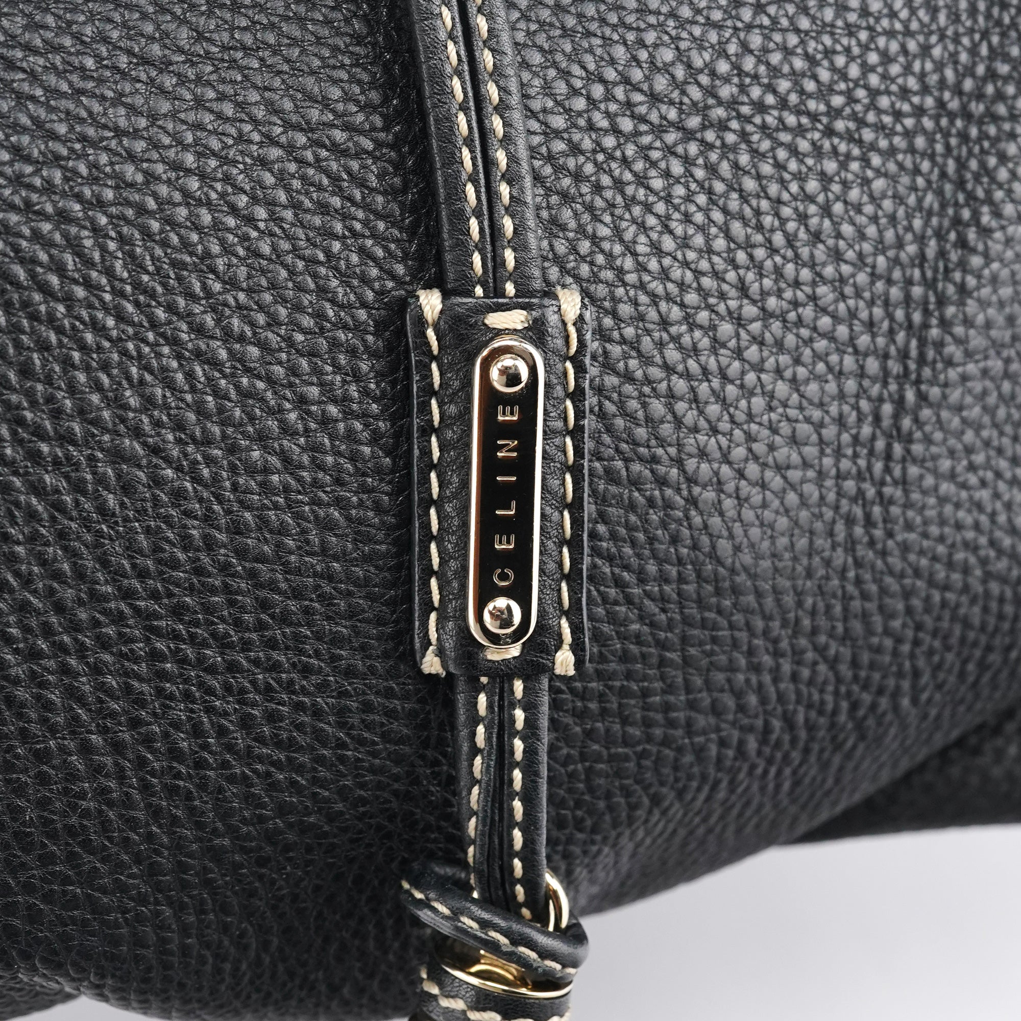 Designed in the early 2000s, this Céline Bittersweet is crafted in black pebbled leather with signature contrast stitching and a softly gathered silhouette. Gold-tone hardware, rolled handles, and the iconic leather tie detail complete the design, while the zipped opening reveals a spacious monogram-lined interior.