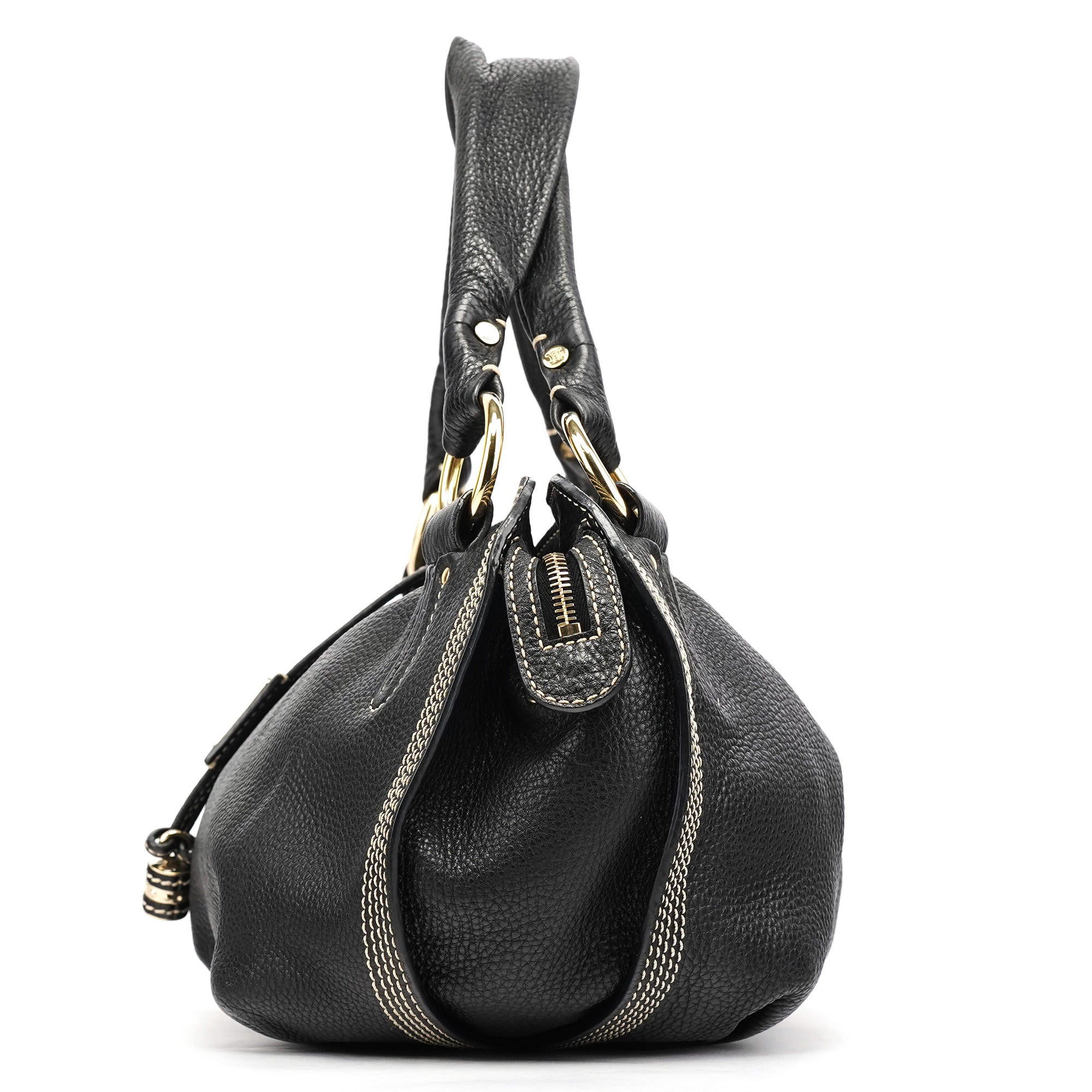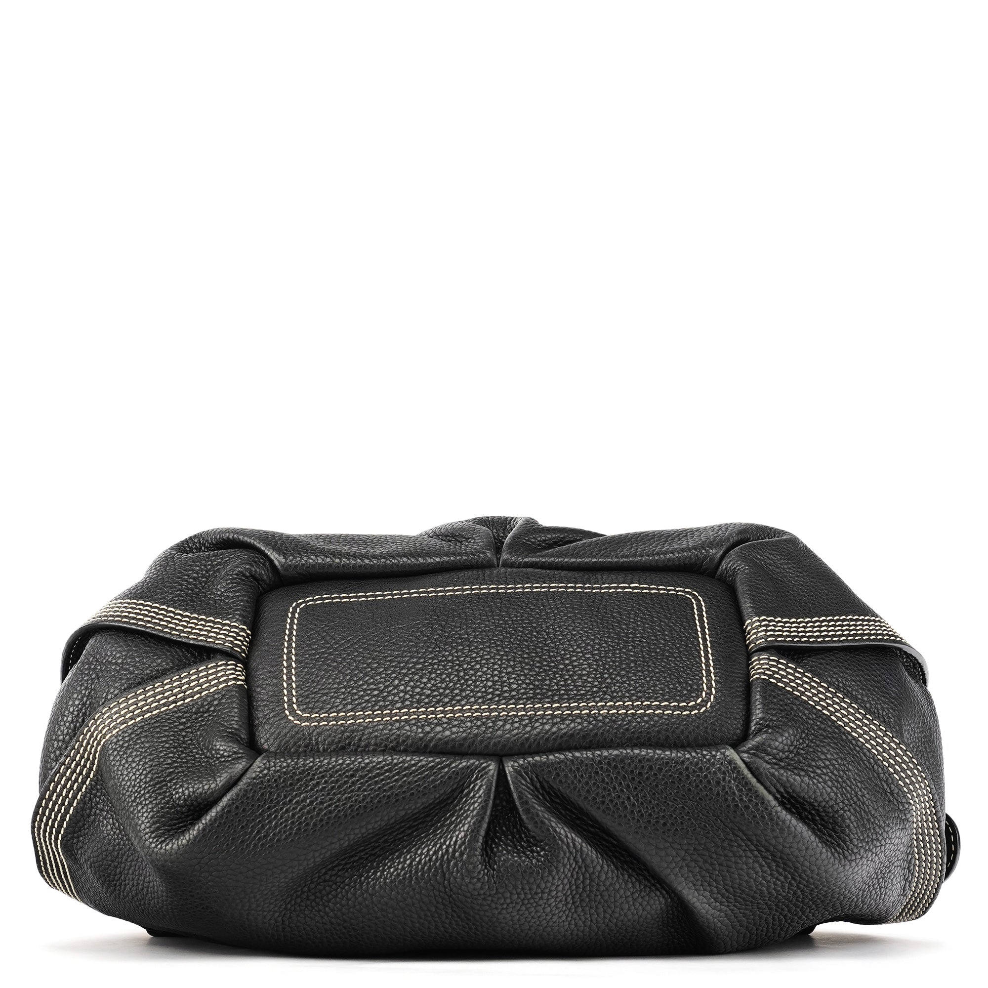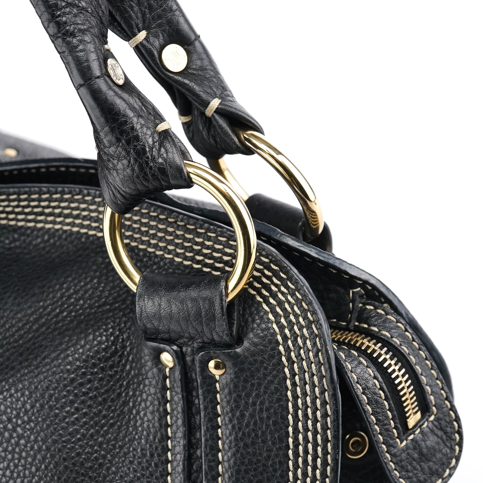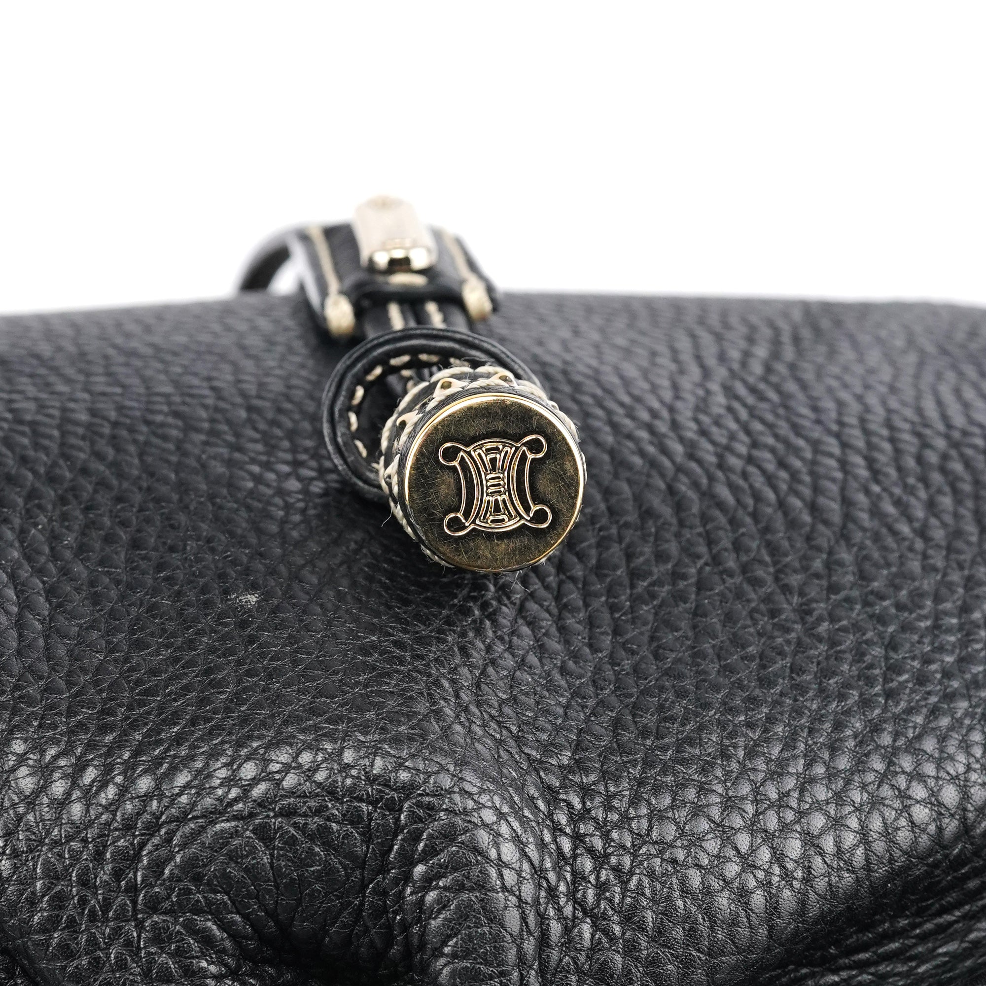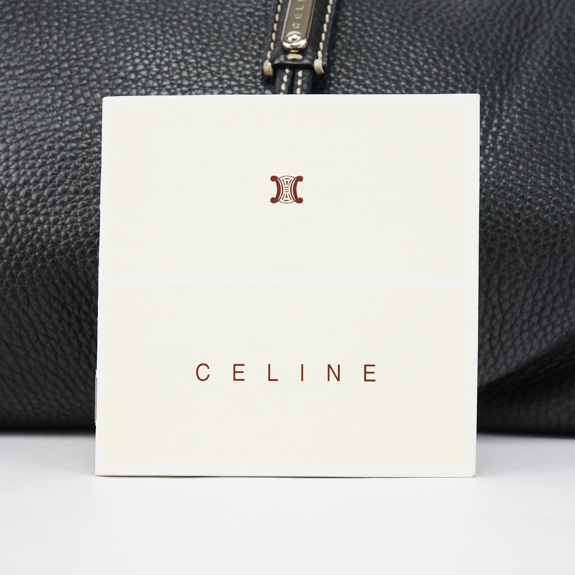 Designed in the early 2000s, this Céline Bittersweet is crafted in black pebbled leather with signature contrast stitching and a softly gathered silhouette. Gold-tone hardware, rolled handles, and the iconic leather tie detail complete the design, while the zipped opening reveals a spacious monogram-lined interior.