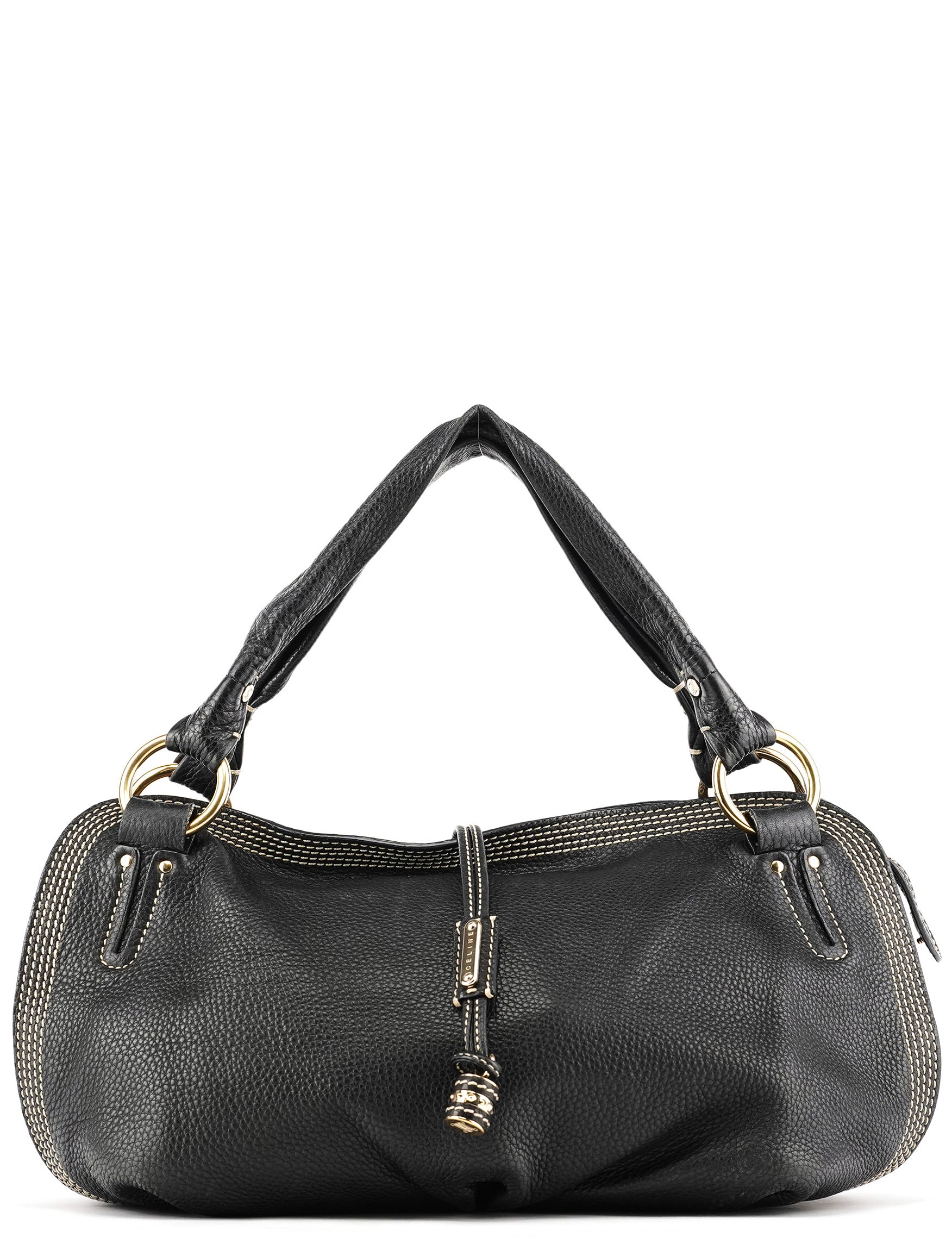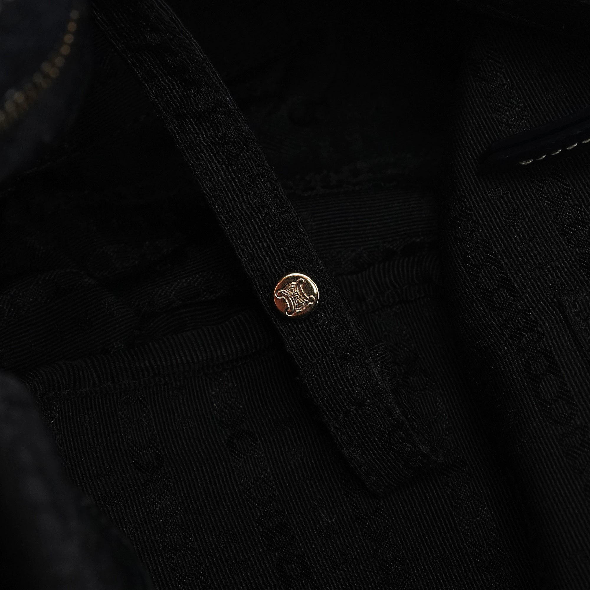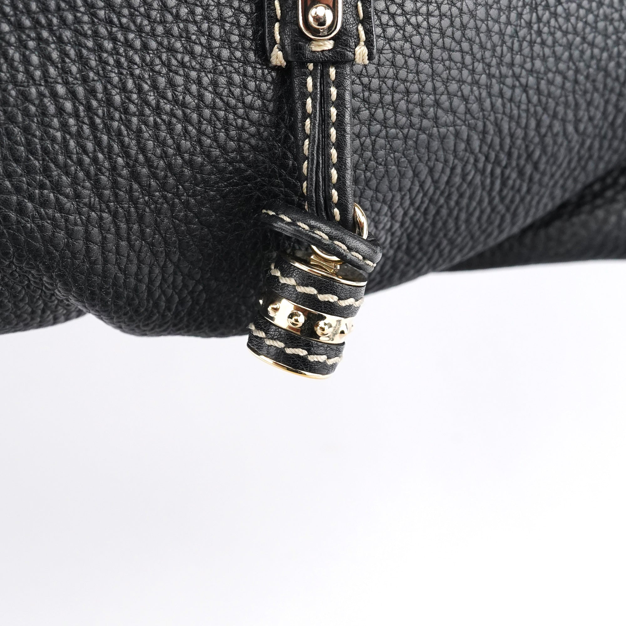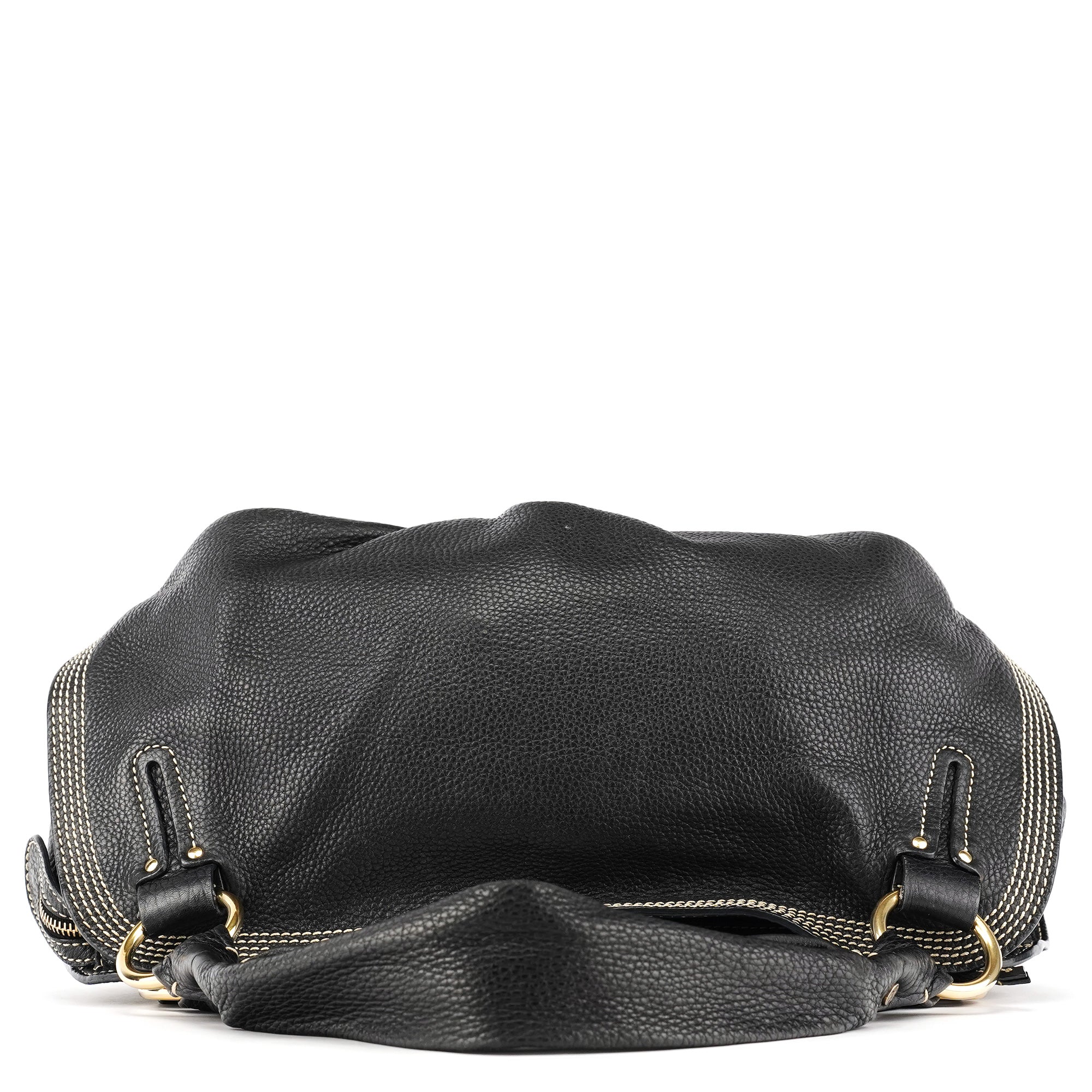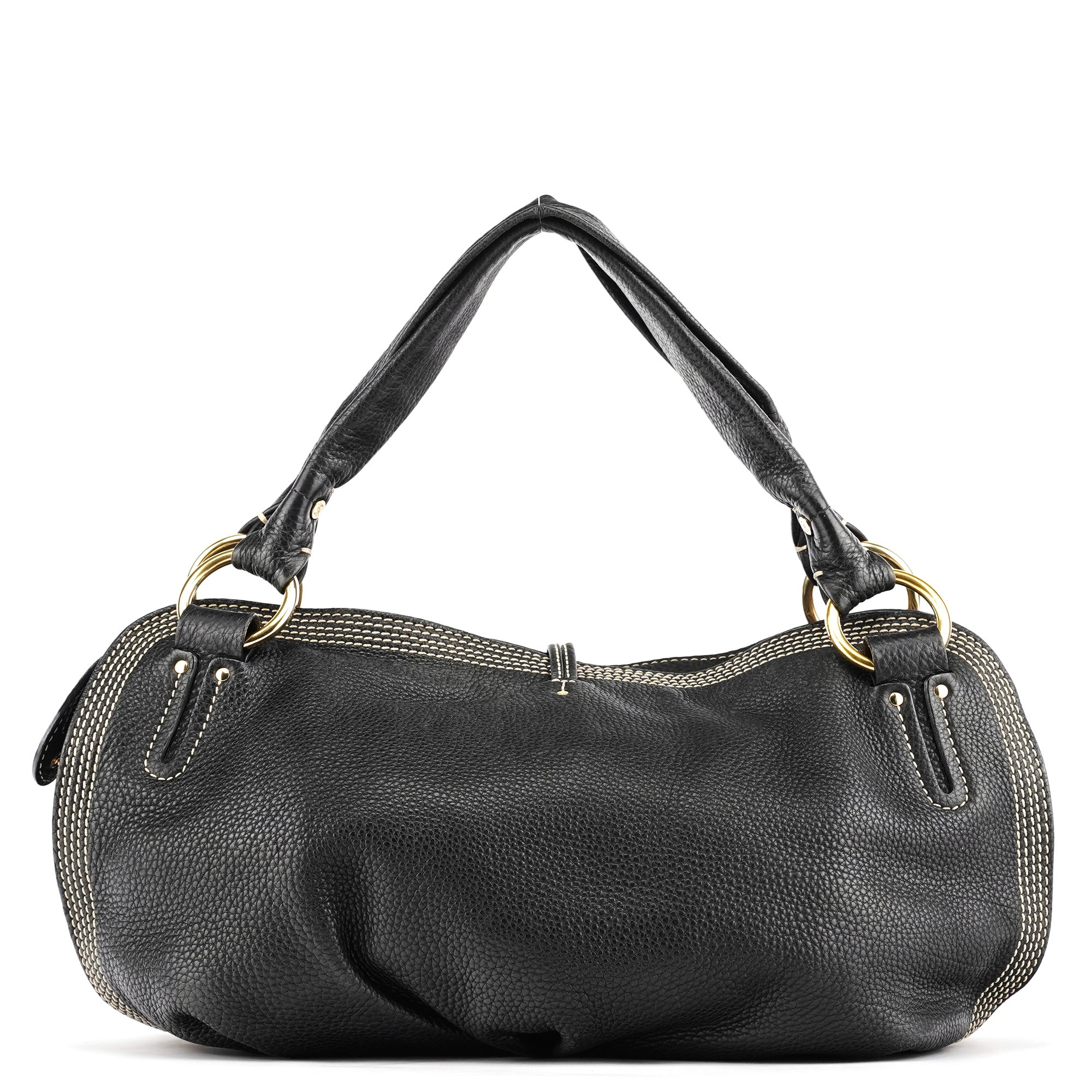 Designed in the early 2000s, this Céline Bittersweet is crafted in black pebbled leather with signature contrast stitching and a softly gathered silhouette. Gold-tone hardware, rolled handles, and the iconic leather tie detail complete the design, while the zipped opening reveals a spacious monogram-lined interior.