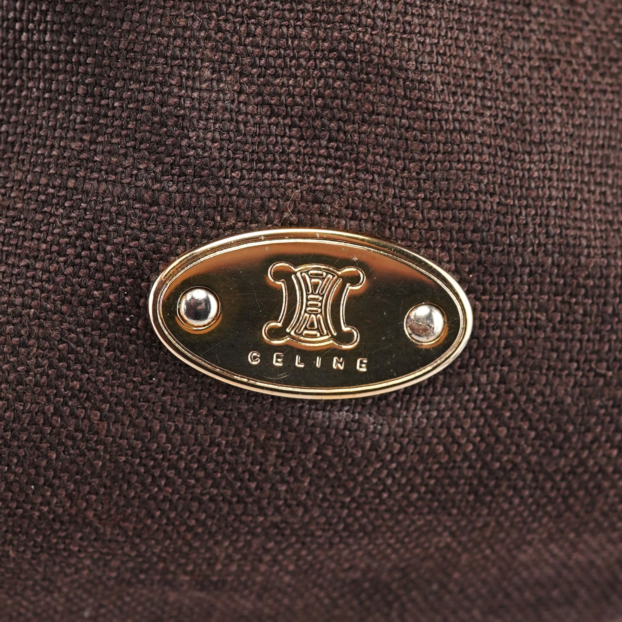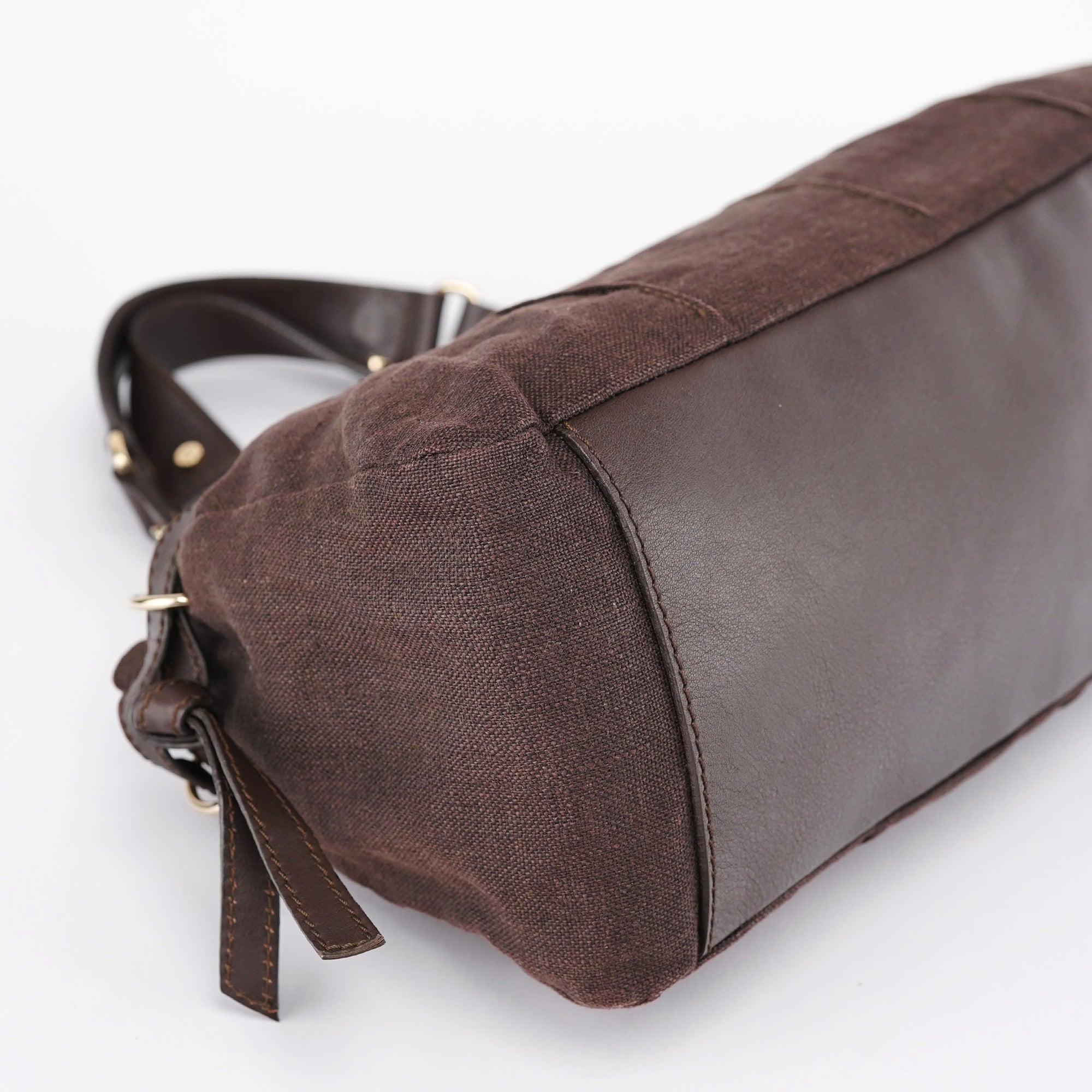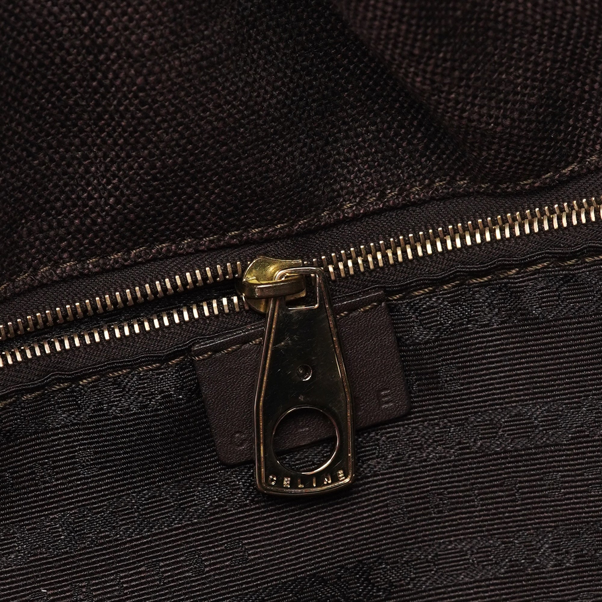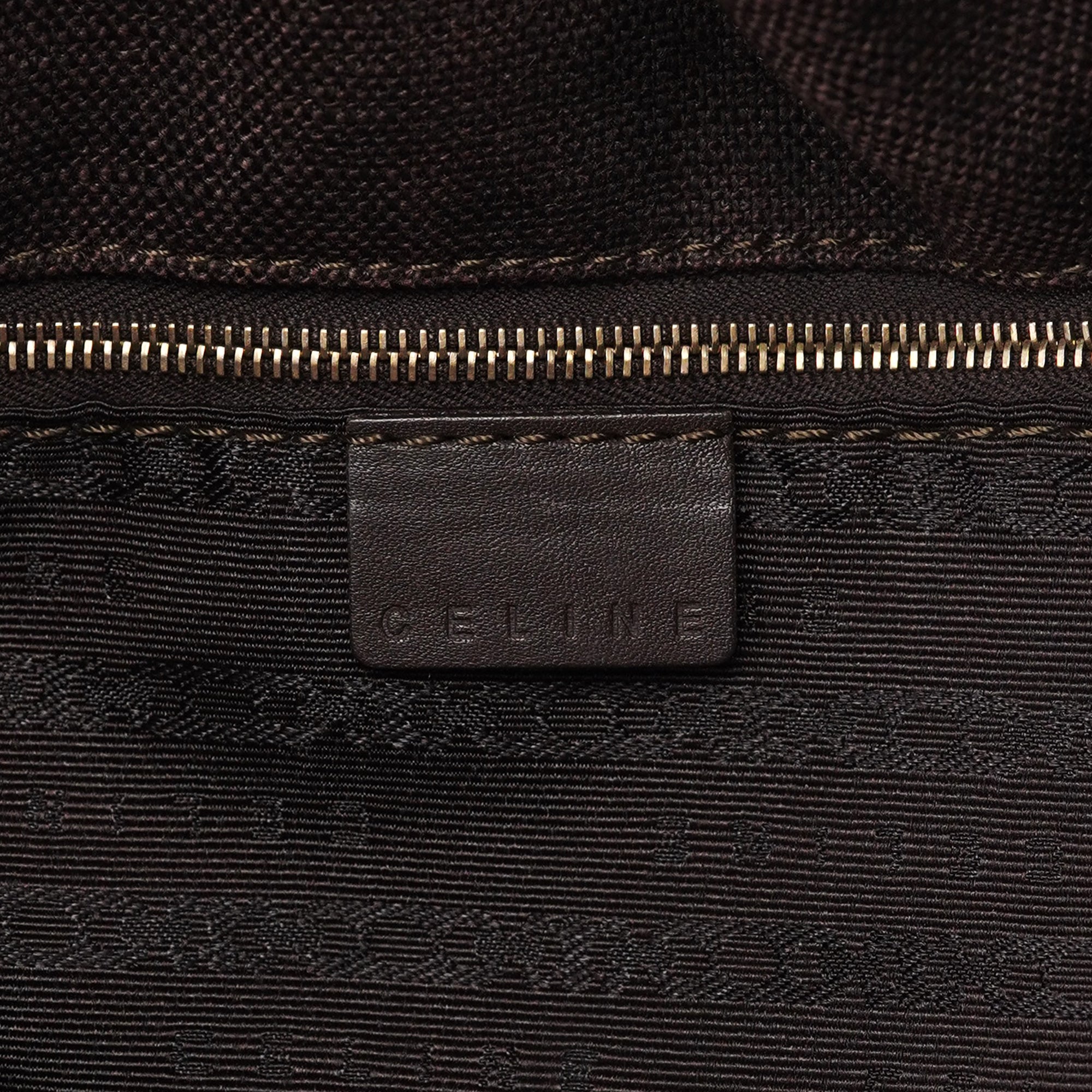 Designed in the early 2000s, this Celine tote is crafted in rich brown canvas with tonal leather trim and gold-tone Triomphe hardware. The pleated silhouette is framed by dual belted handles with rivet details and ring accents, while the open interior is lined in canvas with a zip pocket for organization. A structured yet feminine carryall with signature house codes.