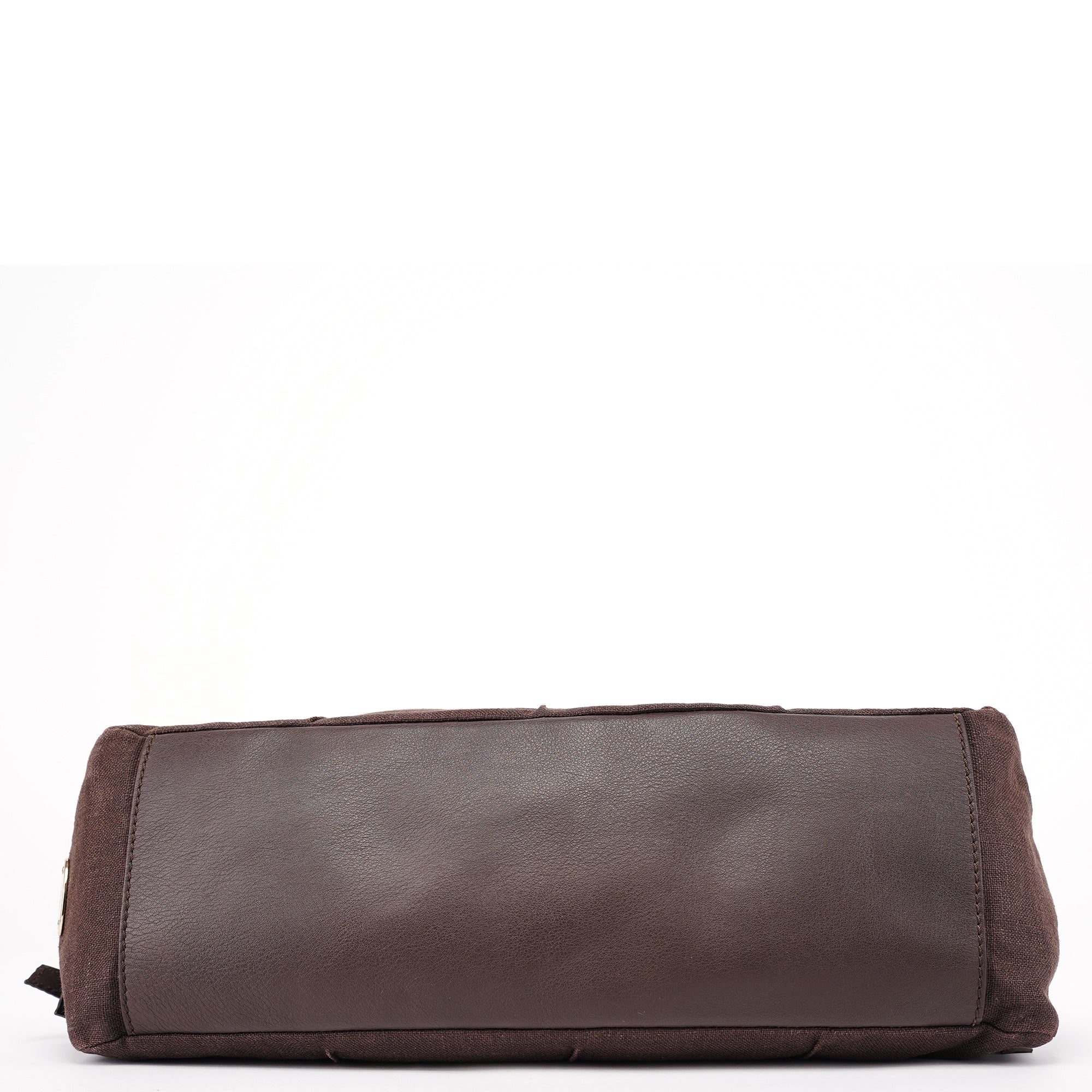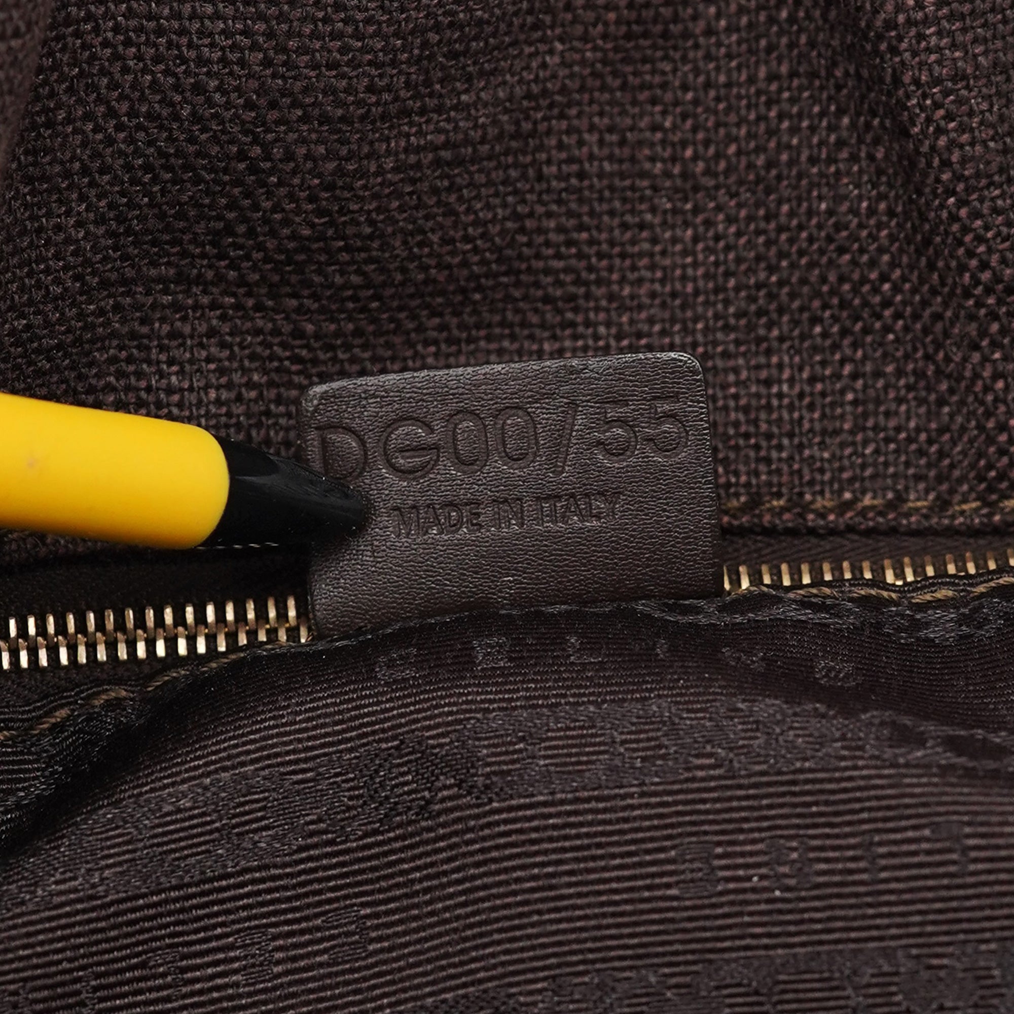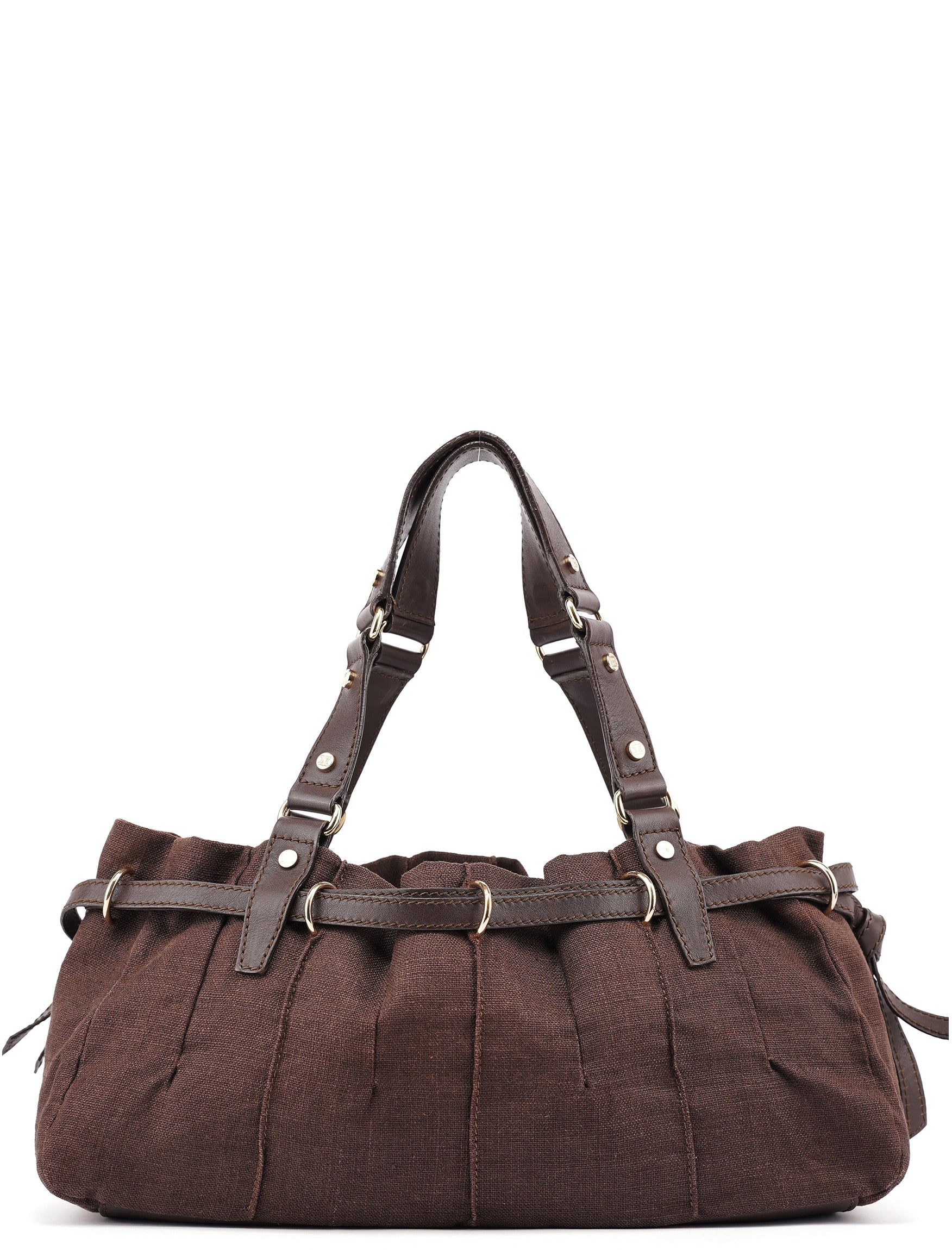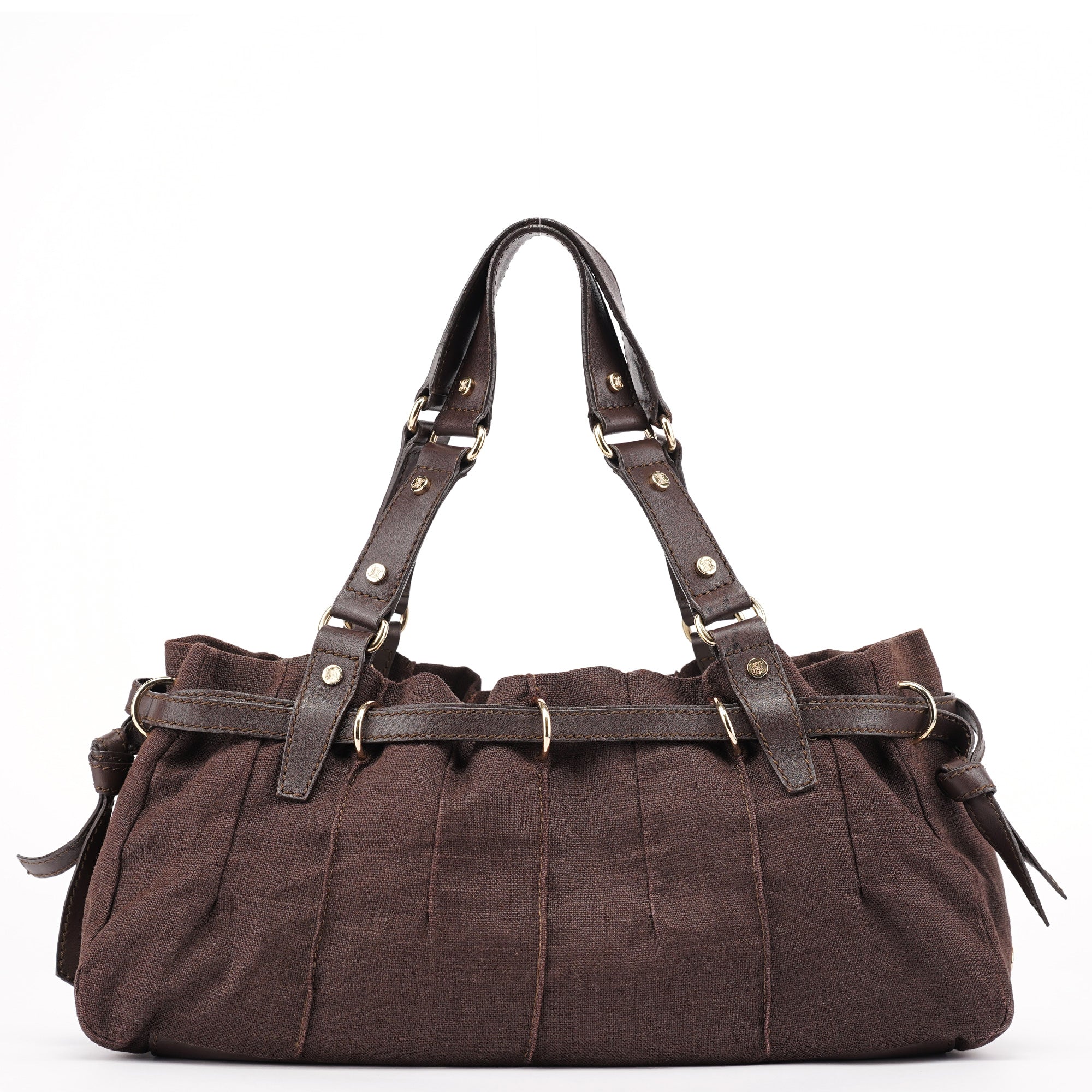 Designed in the early 2000s, this Celine tote is crafted in rich brown canvas with tonal leather trim and gold-tone Triomphe hardware. The pleated silhouette is framed by dual belted handles with rivet details and ring accents, while the open interior is lined in canvas with a zip pocket for organization. A structured yet feminine carryall with signature house codes.