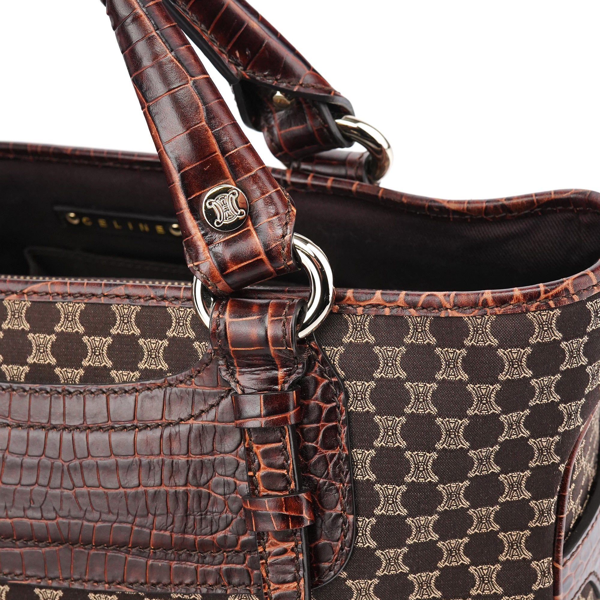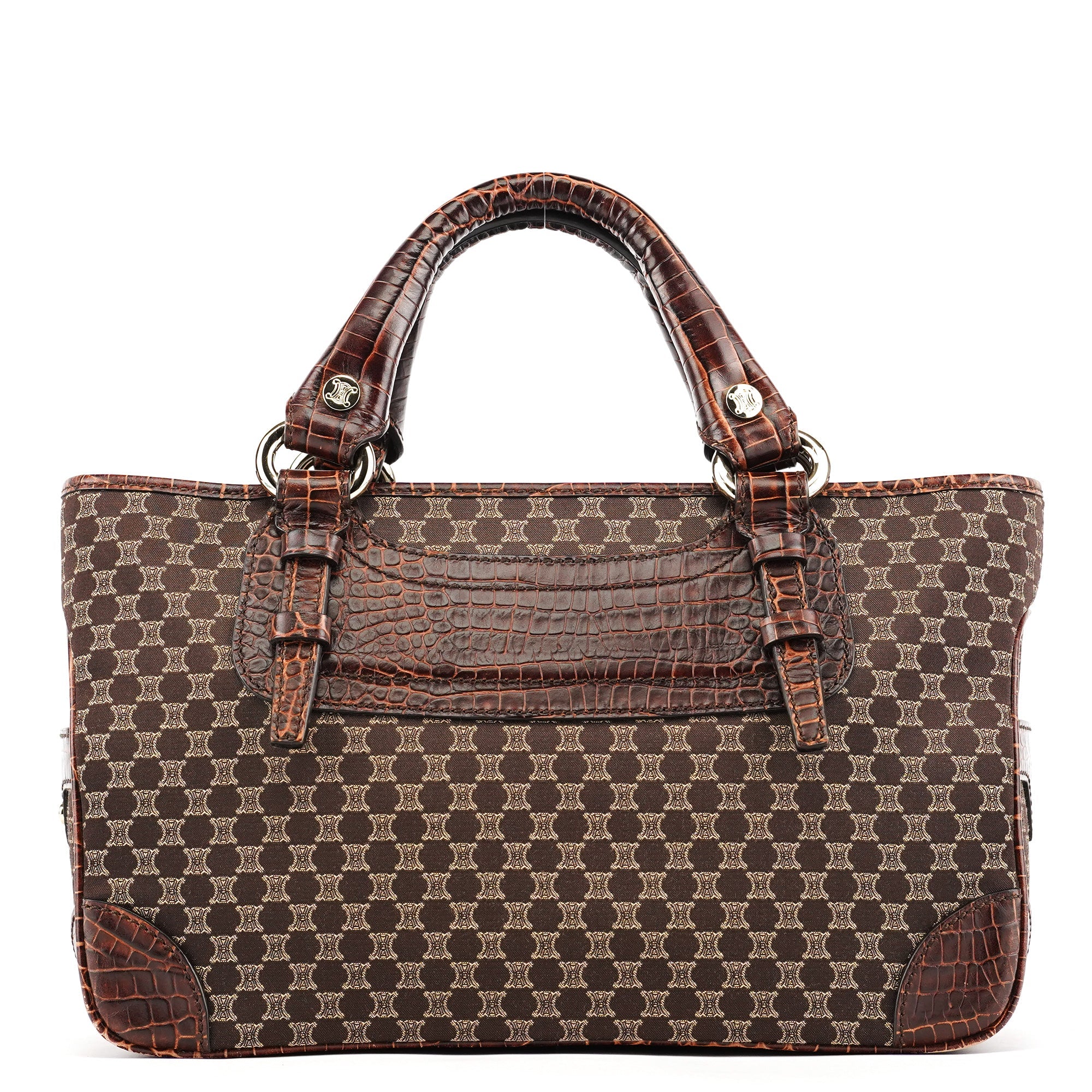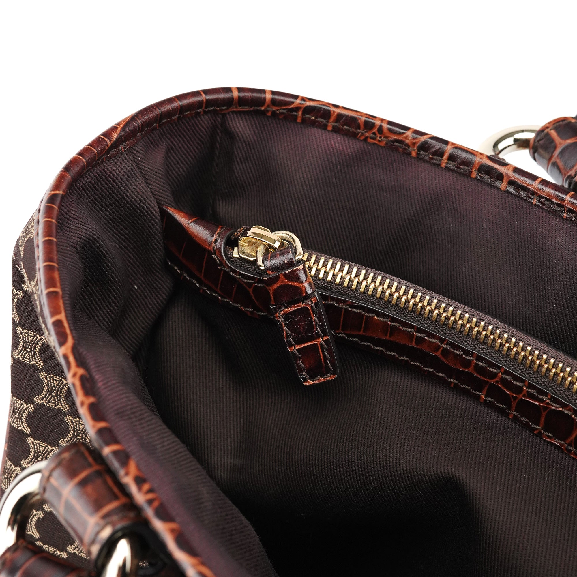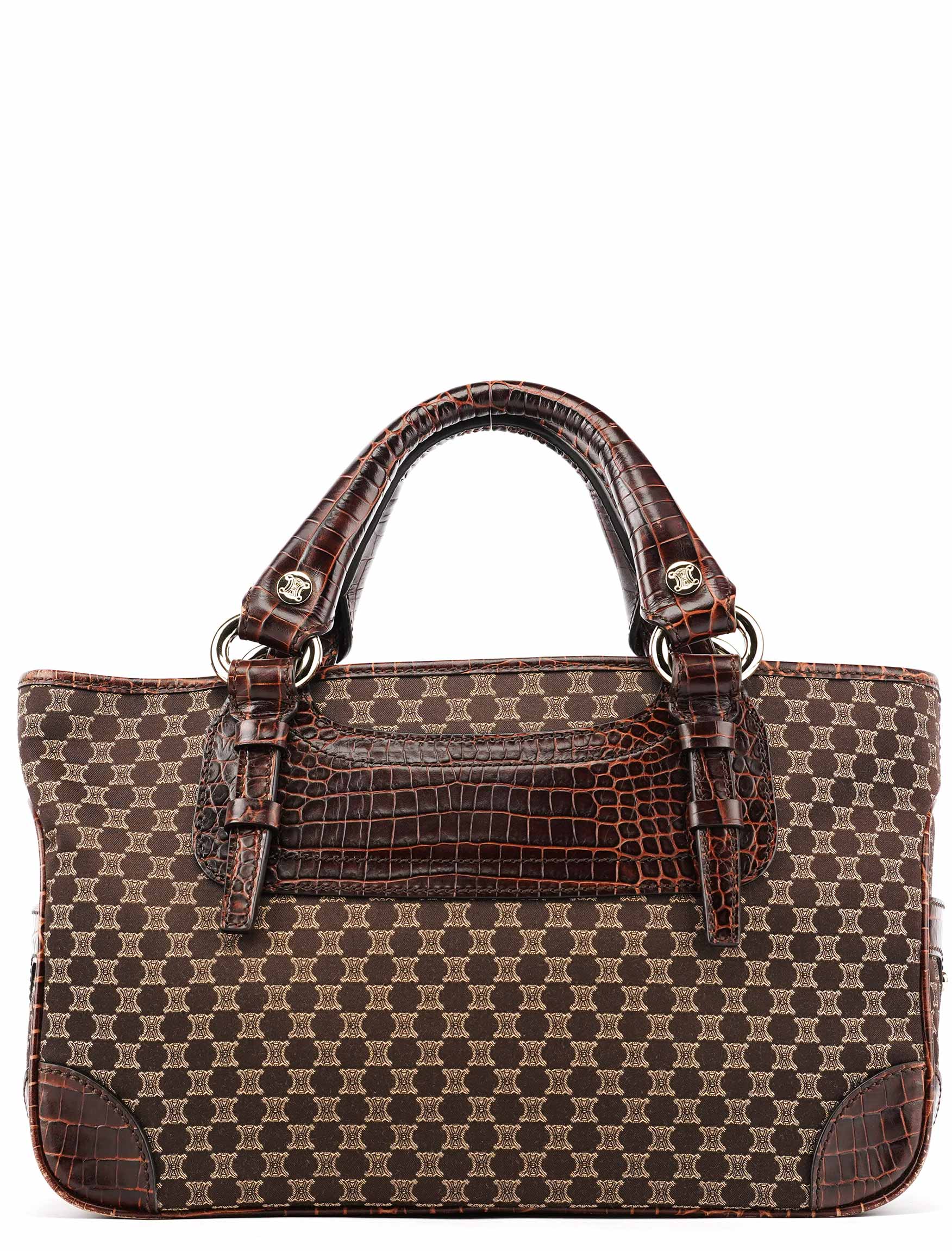 Designed in the early 2000s, this Céline Boogie tote features brown Céline monogram canvas with croc-embossed leather trim and handles. The structured silhouette is finished with silver-tone hardware, a zip-top closure, and a fabric-lined interior with a zip pocket.