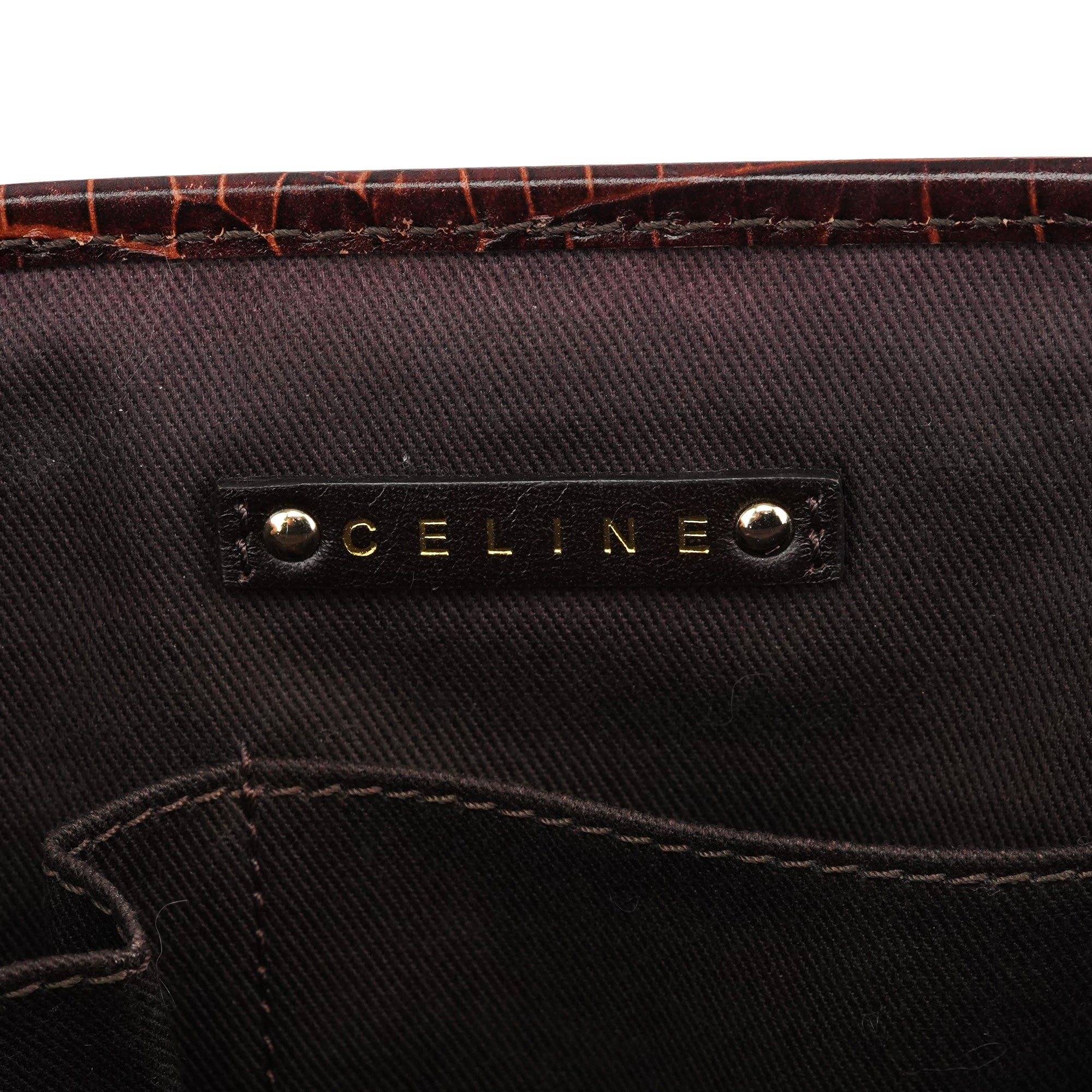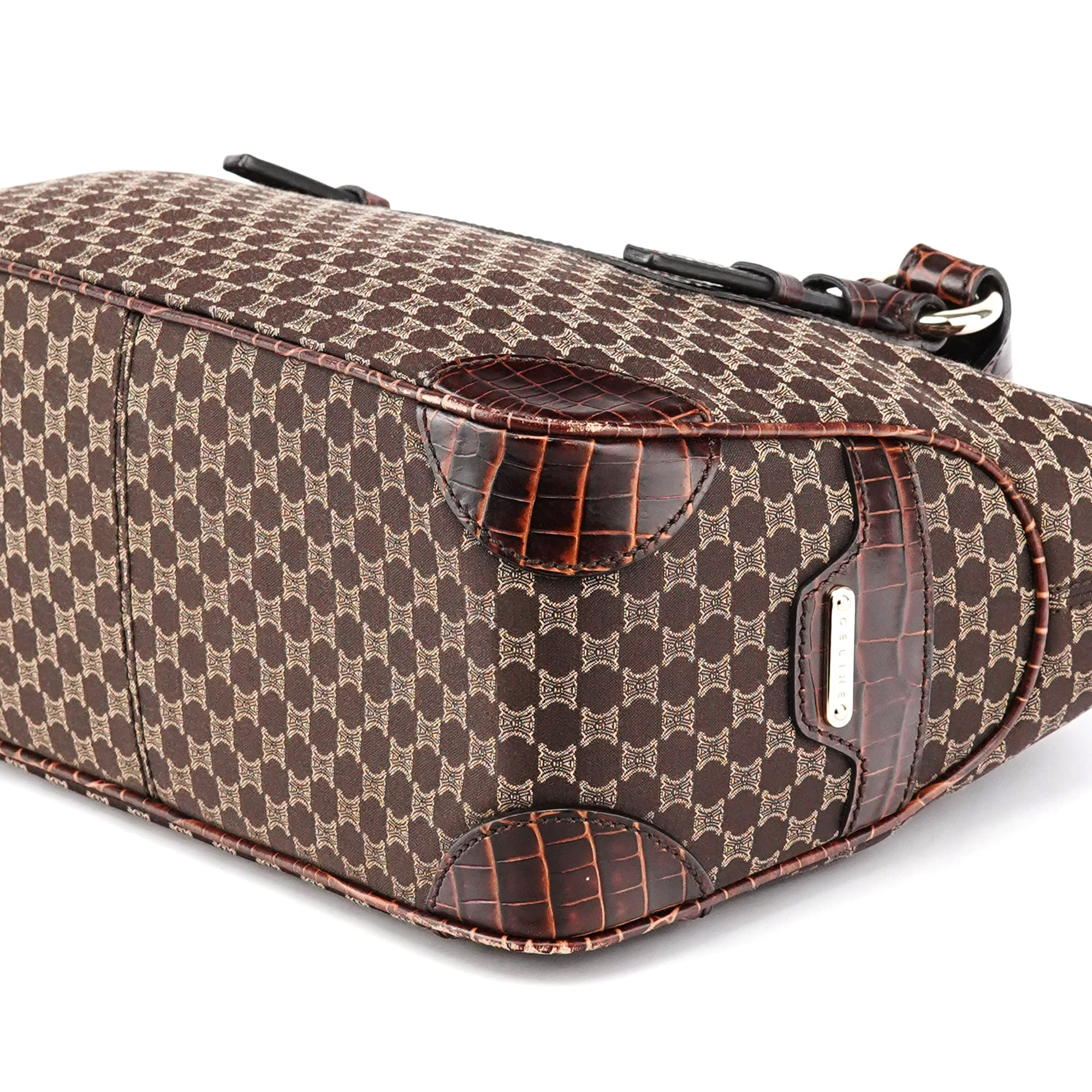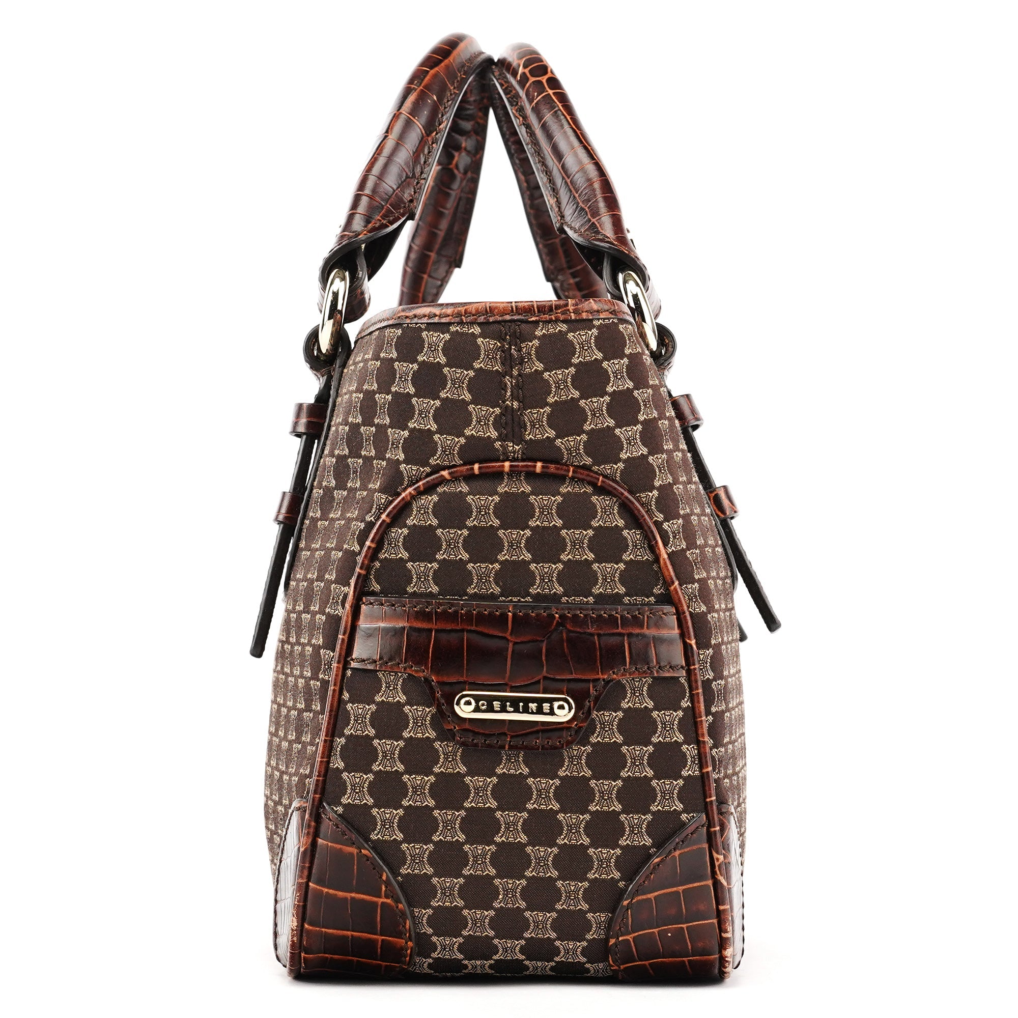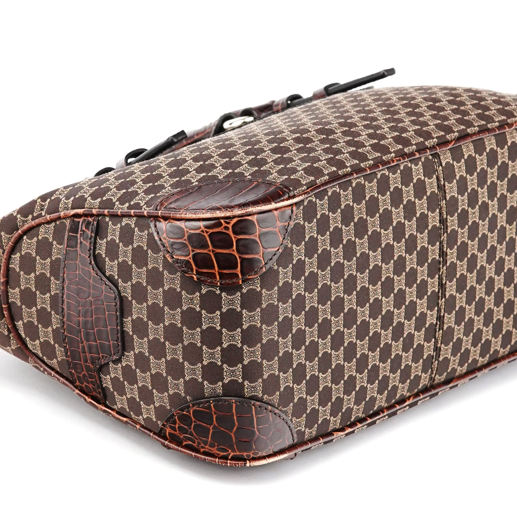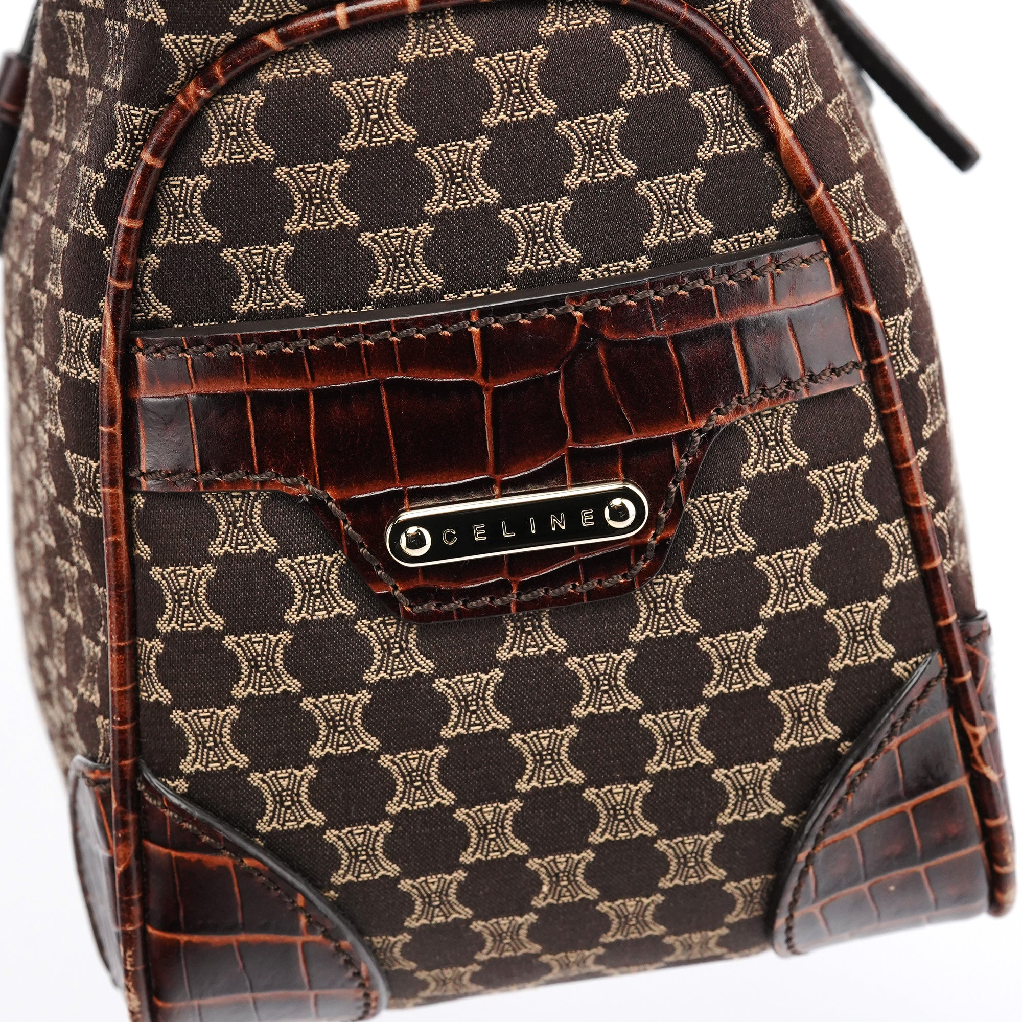 Designed in the early 2000s, this Céline Boogie tote features brown Céline monogram canvas with croc-embossed leather trim and handles. The structured silhouette is finished with silver-tone hardware, a zip-top closure, and a fabric-lined interior with a zip pocket.
