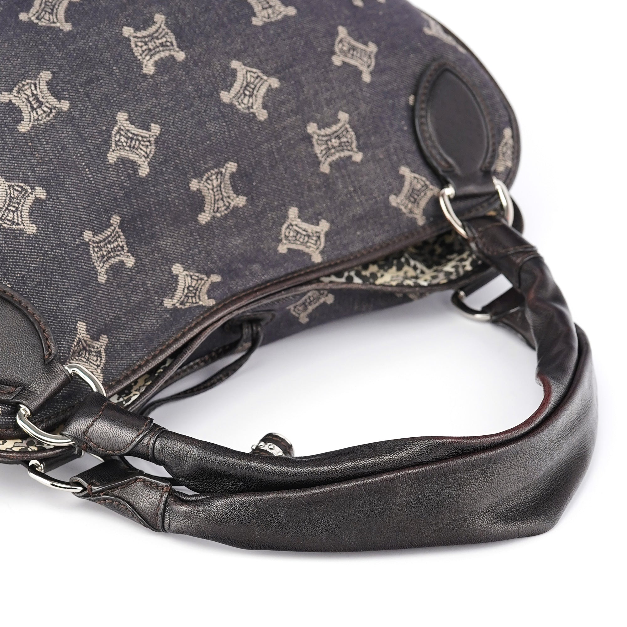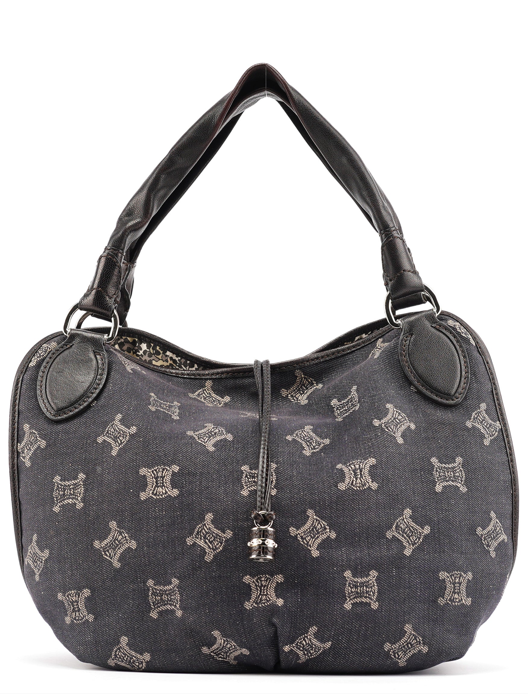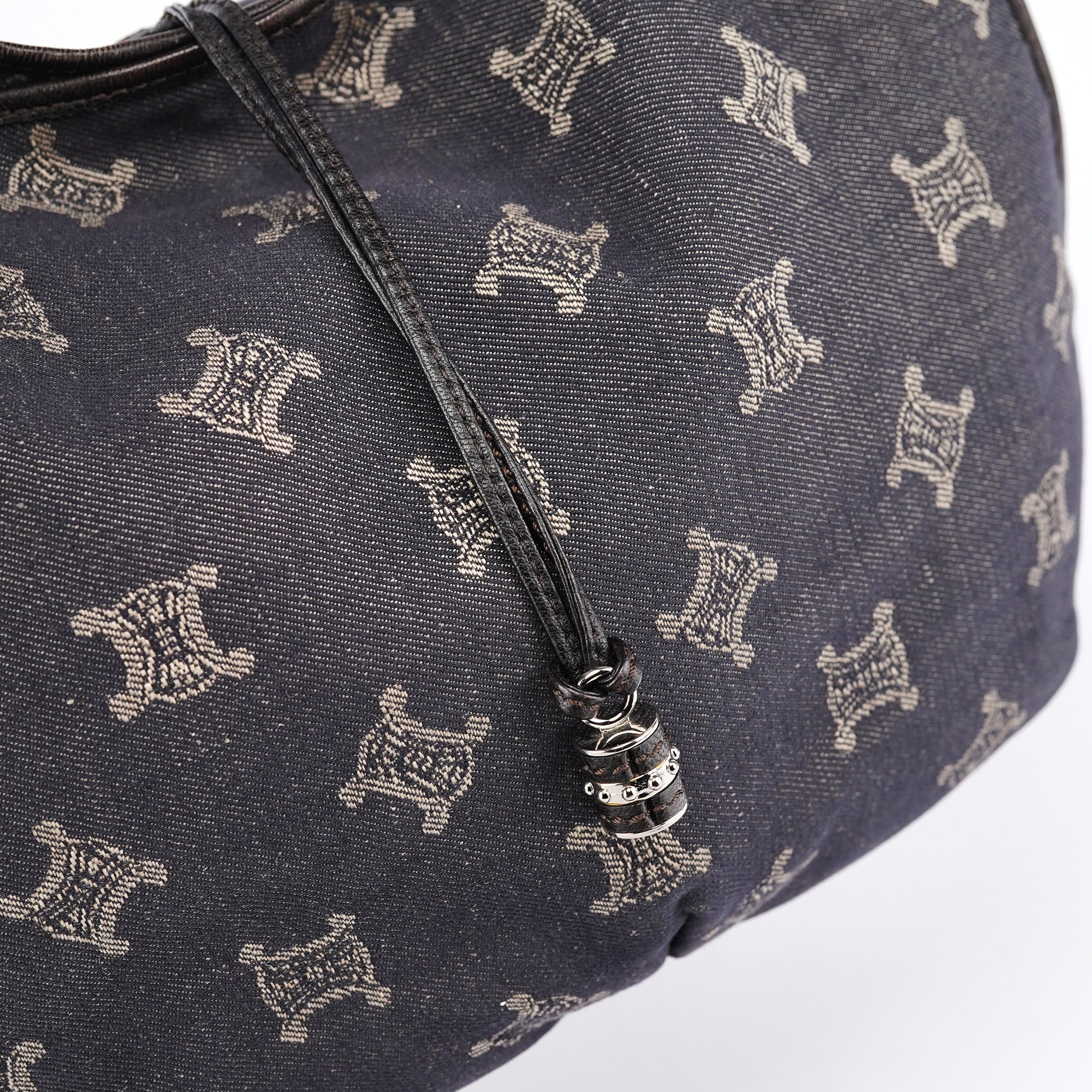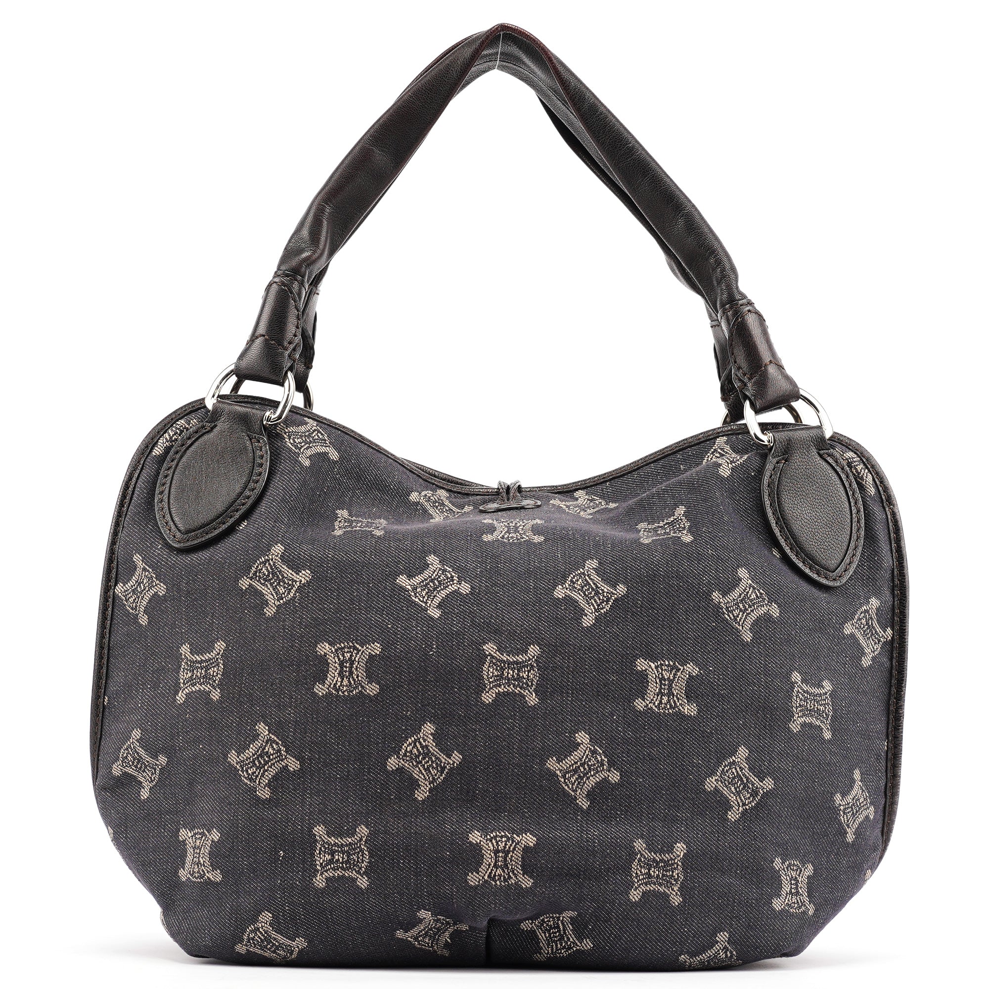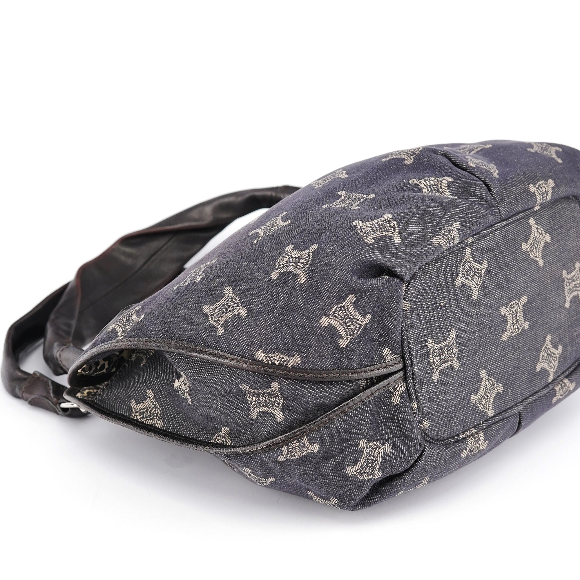 Designed in the early 2000s, this vintage Céline Bittersweet features the brand's signature Macadam monogram pattern reimagined in navy denim with beige logo print. The slouchy hobo silhouette showcases gathered leather detailing, braided handles with silver-tone hardware, and the distinctive relaxed shape that defined the Bittersweet line. This denim iteration represents Céline's playful approach to luxury accessories during the pre-Phoebe Philo era.